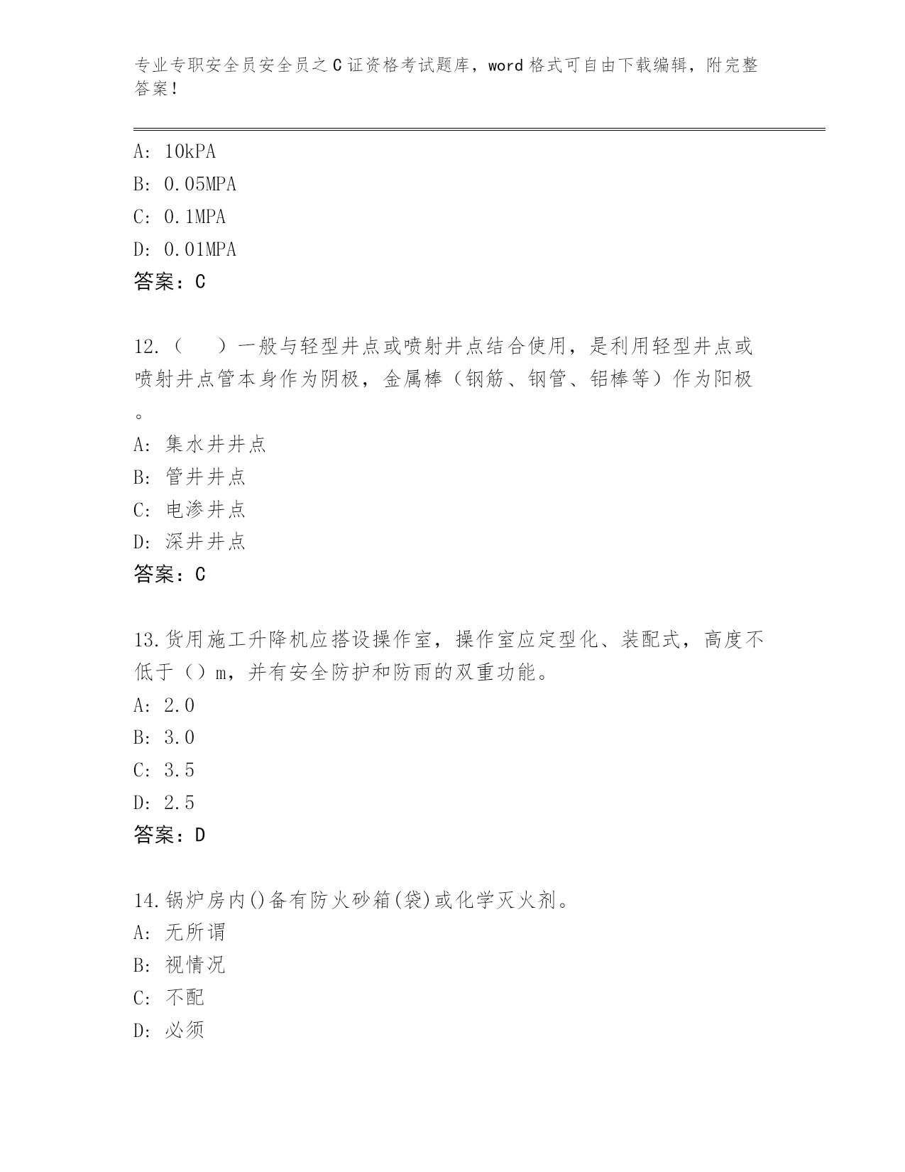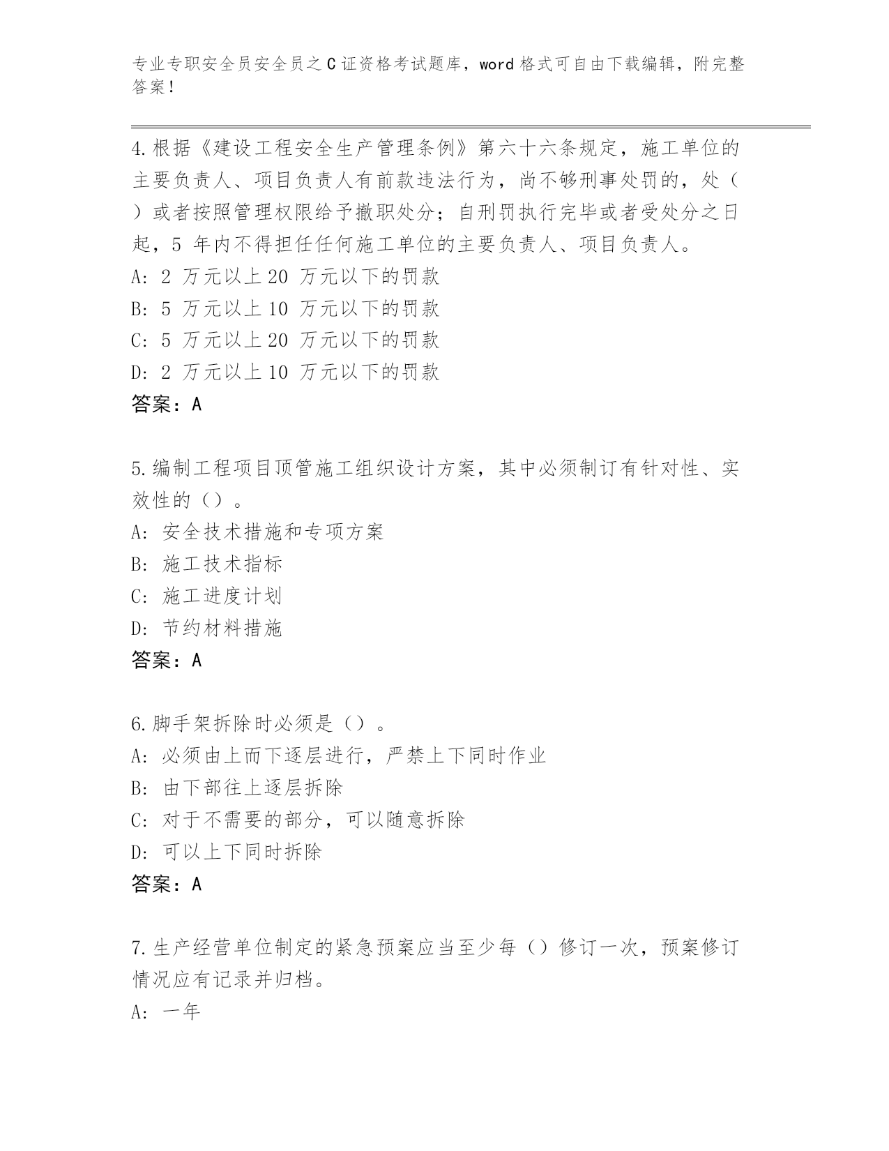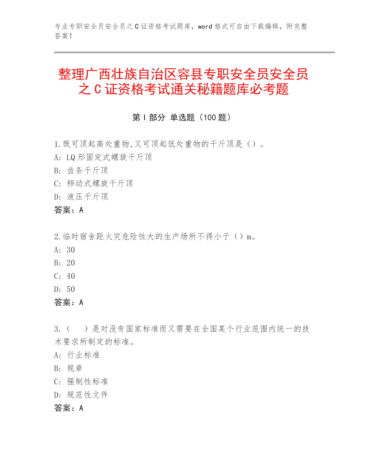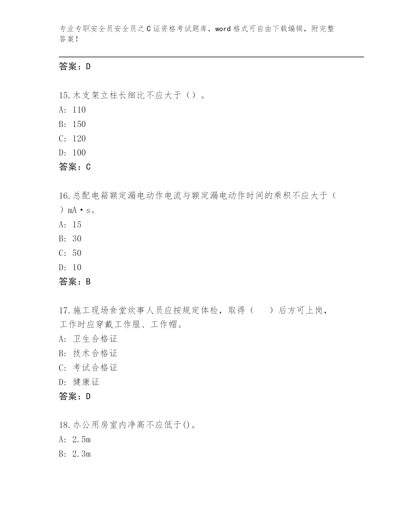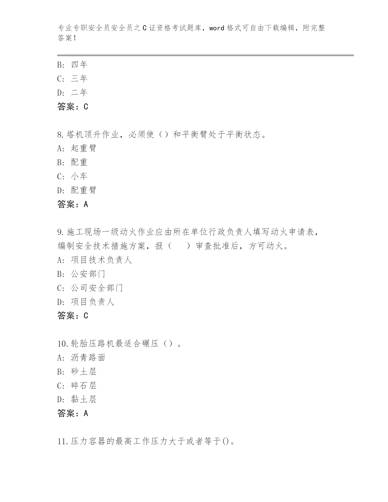 专业专职安全员安全员之C证资格考试题库,word格式可自由下载编辑,附完整答案!整理广西壮族自治区容县专职安全员安全员之C证资格考试通关秘籍题库必考题第I部分单选题(100题)1.既可顶起高处重物,又可顶起低处重物的千斤顶是()。A:LQ形固定式螺旋千斤顶B:齿条千斤顶C:移动式螺旋千斤顶D:液压千斤顶答案:A2.临时宿舍距火灾危险性大的生产场所不得小于()m。A:30B:20C:40D:50答案:A3.()是对没有国家标准而又需要在全国某个行业范围内统一的技术要求所制定的标准。A:行业标准B:规章C:强制性标准D:规范性文件答案:A4.根据《建设工程安全生产管理条例》第六十六条规定,施工单位的主要负责人、项目负责人有前款违法行为,尚不够刑事处罚的,处()或者按照管理权限给予撤职处分;自刑罚执行完毕或者受处分之日起,5年内不得担任任何施工单位的主要负责人、项目负责人。A:2万元以上20万元以下的罚款B:5万元以上10万元以下的罚款C:5万元以上20万元以下的罚款D:2万元以上10万元以下的罚款答案:A5.编制工程项目顶管施工组织设计方案,其中必须制订有针对性、实效性的()。A:安全技术措施和专项方案B:施工技术指标C:施工进度计划D:节约材料措施答案:A6.脚手架拆除时必须是()。A:必须由上而下逐层进行,严禁上下同时作业B:由下部往上逐层拆除C:对于不需要的部分,可以随意拆除D:可以上下同时拆除答案:A7.生产经营单位制定的紧急预案应当至少每()修订一次,预案修订情况应有记录并归档。A:一年B:四年C:三年D:二年答案:C8.塔机顶升作业,必须使()和平衡臂处于平衡状态。A:起重臂B:配重C:小车D:配重臂答案:A9.施工现场一级动火作业应由所在单位行政负责人填写动火申请表,编制安全技术措施方案,报()审查批准后,方可动火。A:项目技术负责人B:公安部门C:公司安全部门D:项目负责人答案:C10.轮胎压路机最适合碾压()。A:沥青路面B:砂土层C:碎石层D:黏土层答案:A11.压力容器的最高工作压力大于或者等于()。A:10kPAB:0.05MPAC:0.1MPAD:0.01MPA答案:C12.()一般与轻型井点或喷射井点结合使用,是利用轻型井点或喷射井点管本身作为阴极,金属棒(钢筋、钢管、铝棒等)作为阳极。A:集水井井点B:管井井点C:电渗井点D:深井井点答案:C13.货用施工升降机应搭设操作室,操作室应定型化、装配式,高度不低于()m,并有安全防护和防雨的双重功能。A:2.0B:3.0C:3.5D:2.5答案:D14.锅炉房内()备有防火砂箱(袋)或化学灭火剂。A:无所谓B:视情况C:不配D:必须答案:D15.木支架立柱长细比不应大于()。A:110B:150C:120D:100答案:C16.总配电箱额定漏电动作电流与额定漏电动作时间的乘积不应大于()mA·s。A:15B:30C:50D:10答案:B17.施工现场食堂炊事人员应按规定体检,取得()后方可上岗,工作时应穿戴工作服、工作帽。A:卫生合格证B:技术合格证C:考试合格证D:健康证答案:D18.办公用房室内净高不应低于()。A:2.5mB:2.3mC:2.0mD:2.8m答案:A19.根据《建设工程安全生产管理条例》规定,施工现场临时搭建的建筑物应当符合安全使用要求。施工现场使用的装配式活动房屋应当具有()。A:产品装箱单B:安装验收单C:使用说明书D:产品合格证答案:D20.根据《建筑施工企业主要负责人、项目负责人和专职安全生产管理人员安全生产管理规定》规定,工程项目实行总承包的,总承包企业应当与分包企业签订(),明确双方的安全生产责任。A:安全管理合同B:安全管理协议C:安全生产协议D:责任分担协议答案:C21.瓶帽上开有对称的排气孔的目的是()。A:为了视觉上的美观B:避免当瓶阀损坏时,气体由瓶帽一侧排出产生反作用力推倒气瓶C:没有具体作用D:旋转方便答案:B22.以下不属于废气控制规定的是()。A:不应在现场燃烧木质下脚料B:出场车辆及机械设备废气排放应符合国家年检要求C:建筑垃圾应分类收集,集中堆放D:不应使用煤作为现场生活的燃料答案:C23.对于超过一定规模的危大工程,施工单位应当()。A:附安全预算B:重新测算安全验算结果C:监理工程师名单D:组织专家论证答案:D24.()是指造成3人以下死亡,或者10人以下重伤,或者1000万元以下直接经济损失的事故。上述所称的“以上”包括本数,所称的“以下”不包括本数。A:一般事故B:重大事故C:特别重大事故D:较大事故答案:A25.企业应针对承建工程所在地区的气候与环境特点,组织()的安全检查。A:专业性B:季节性C:不定期D:节假日前后答案:B26.施工现场用电工程应建立()种档案。A:6B:2C:4D:8答