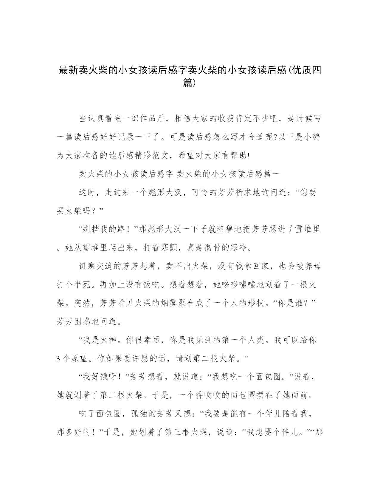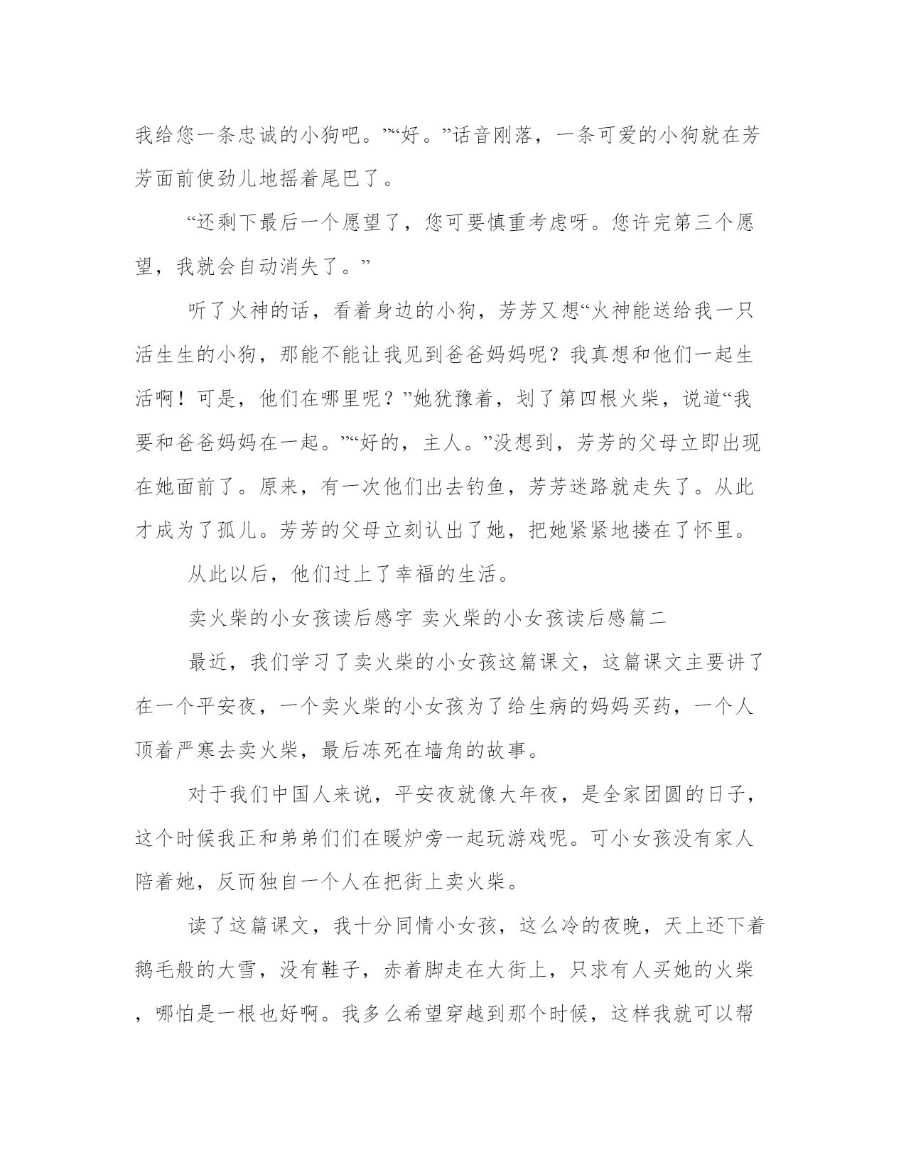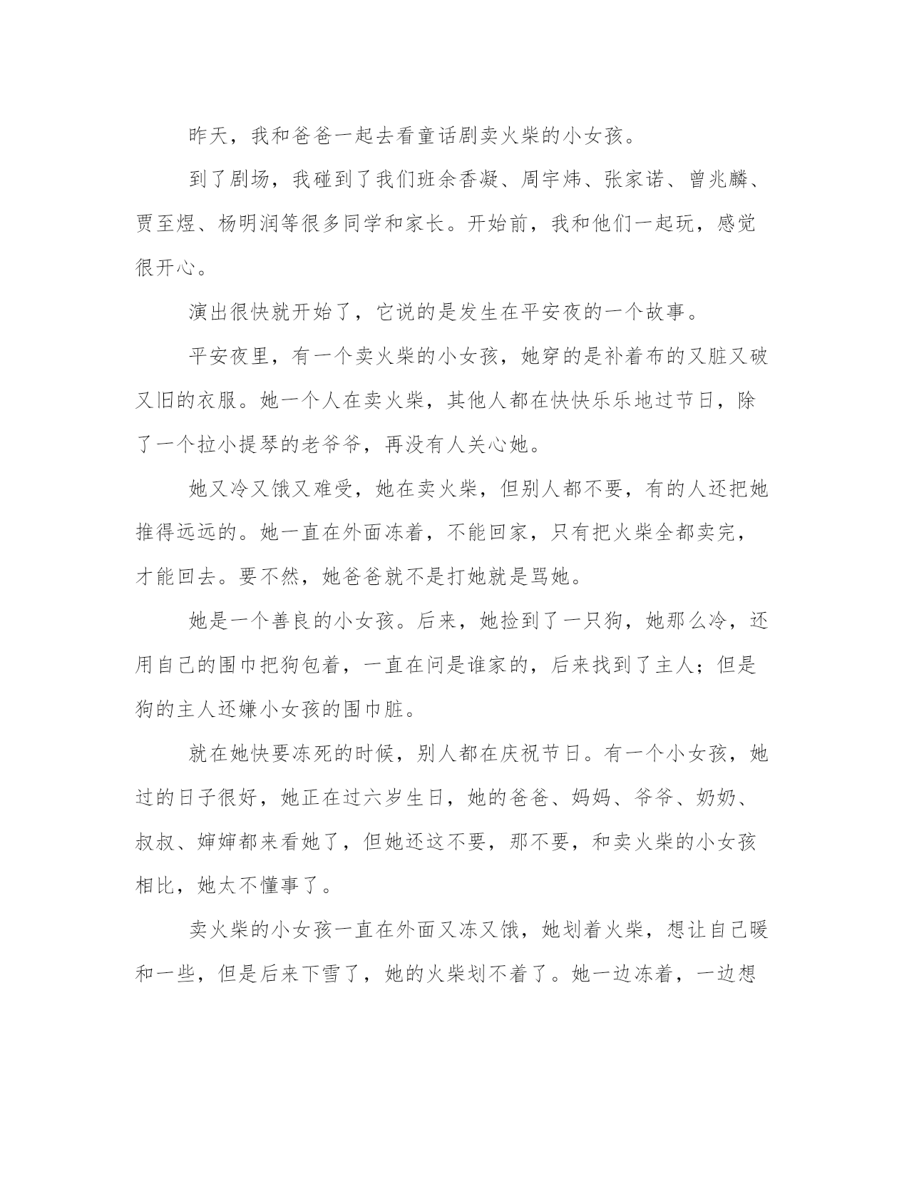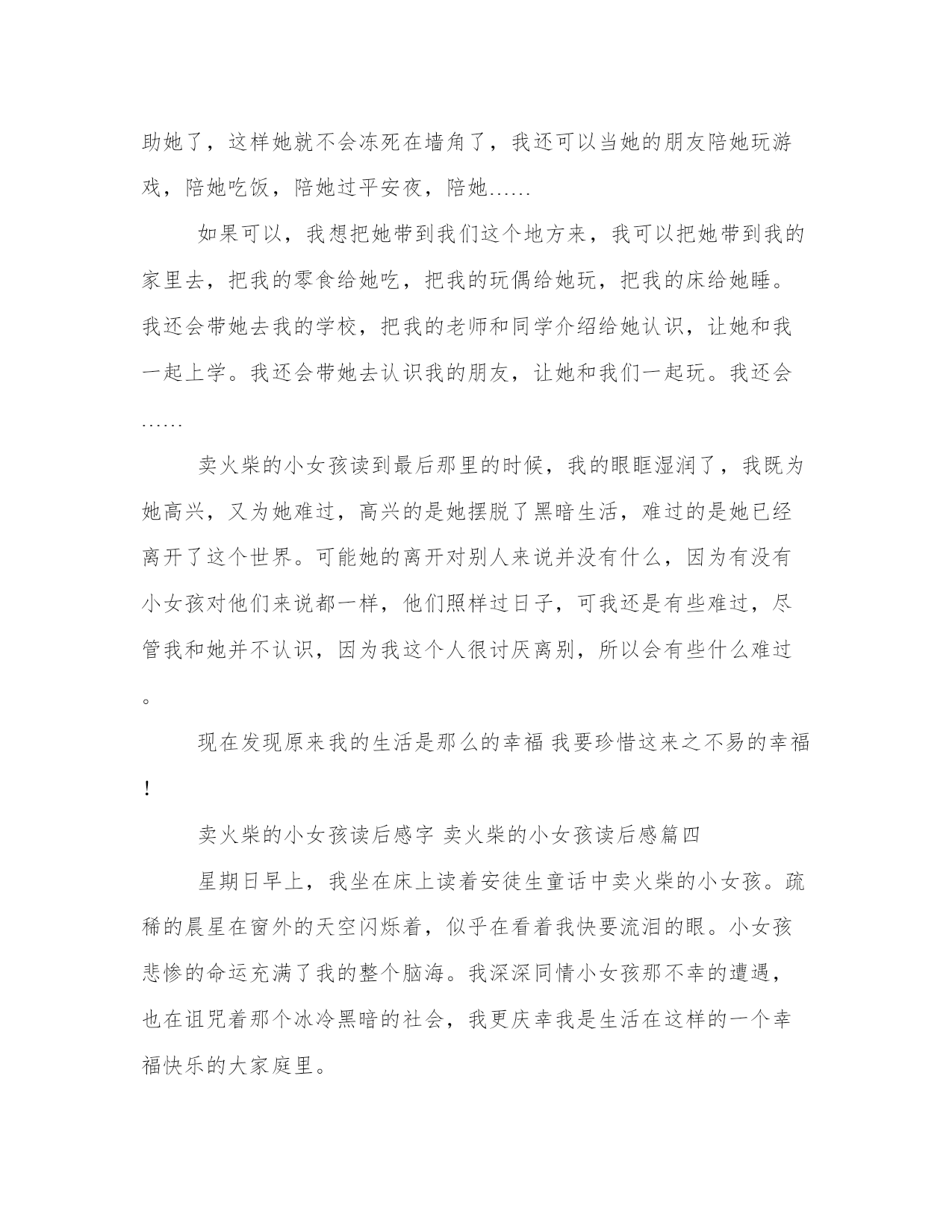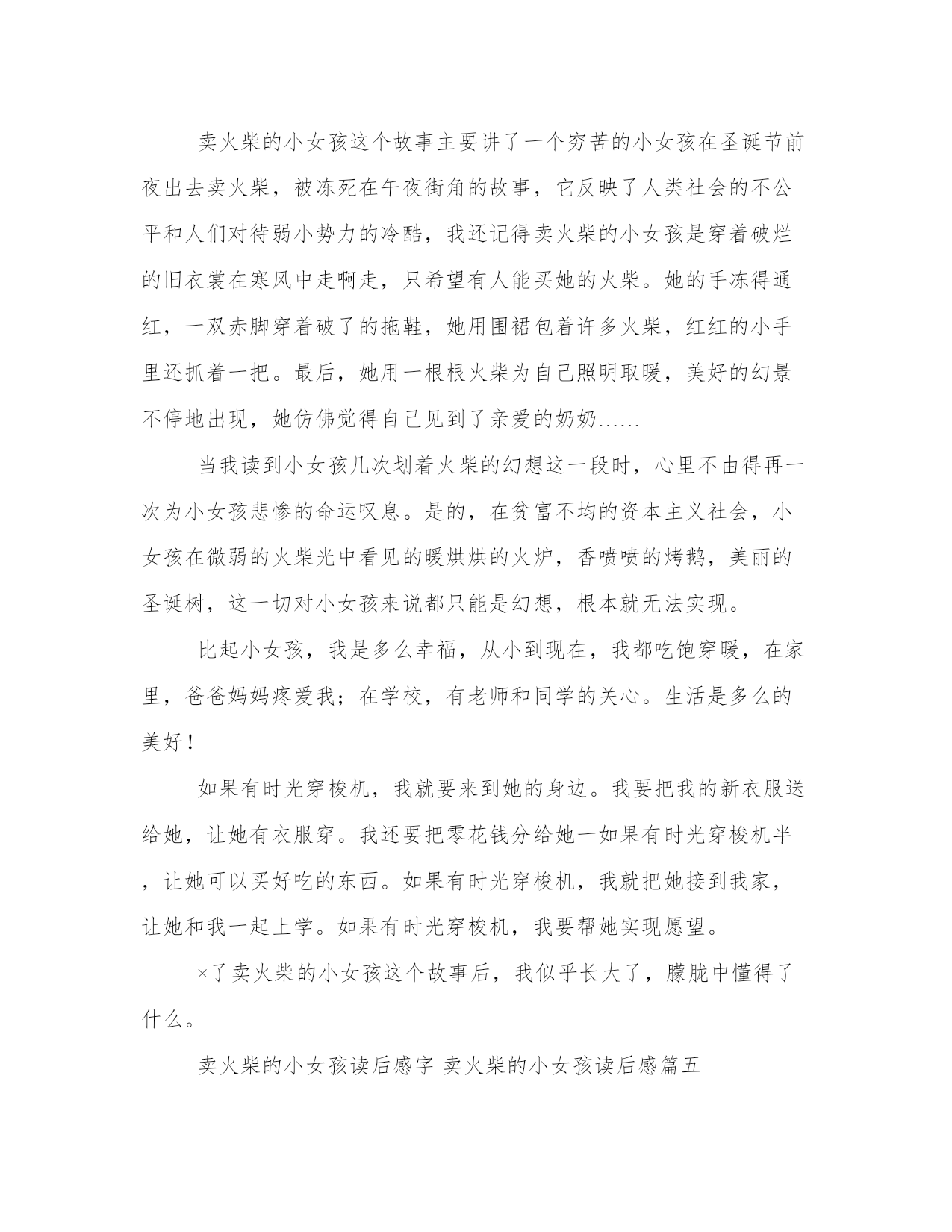 最新卖火柴的小女孩读后感字卖火柴的小女孩读后感(优质四篇)当认真看完一部作品后,相信大家的收获肯定不少吧,是时候写一篇读后感好好记录一下了。可是读后感怎么写才合适呢?以下是小编为大家准备的读后感精彩范文,希望对大家有帮助!卖火柴的小女孩读后感字卖火柴的小女孩读后感篇一这时,走过来一个彪形大汉,可怜的芳芳祈求地询问道:“您要买火柴吗?”“别挡我的路!”那彪形大汉一下子就粗鲁地把芳芳踢进了雪堆里。她从雪堆里爬出来,打着寒颤,真是彻骨的寒冷。饥寒交迫的芳芳想着,卖不出火柴,没有钱拿回家,也会被养母打个半死。再加上没有饭吃。想着想着,她哆哆嗦嗦地划着了一根火柴。突然,芳芳看见火柴的烟雾聚合成了一个人的形状。“你是谁?”芳芳困惑地问道。“我是火神。你很幸运,你是我见到的第一个人类。我可以给你3个愿望。你如果要许愿的话,请划第二根火柴。”“我好饿呀!”芳芳想着,就说道:“我想吃一个面包圈。”说着,她就划着了第二根火柴。于是,一个香喷喷的面包圈摆在了她面前。吃了面包圈,孤独的芳芳又想:“我要是能有一个伴儿陪着我,那多好啊!”于是,她划着了第三根火柴,说道:“我想要个伴儿。”“那我给您一条忠诚的小狗吧。”“好。”话音刚落,一条可爱的小狗就在芳芳面前使劲儿地摇着尾巴了。“还剩下最后一个愿望了,您可要慎重考虑呀。您许完第三个愿望,我就会自动消失了。”听了火神的话,看着身边的小狗,芳芳又想“火神能送给我一只活生生的小狗,那能不能让我见到爸爸妈妈呢?我真想和他们一起生活啊!可是,他们在哪里呢?”她犹豫着,划了第四根火柴,说道“我要和爸爸妈妈在一起。”“好的,主人。”没想到,芳芳的父母立即出现在她面前了。原来,有一次他们出去钓鱼,芳芳迷路就走失了。从此才成为了孤儿。芳芳的父母立刻认出了她,把她紧紧地搂在了怀里。从此以后,他们过上了幸福的生活。卖火柴的小女孩读后感字卖火柴的小女孩读后感篇二最近,我们学习了卖火柴的小女孩这篇课文,这篇课文主要讲了在一个平安夜,一个卖火柴的小女孩为了给生病的妈妈买药,一个人顶着严寒去卖火柴,最后冻死在墙角的故事。对于我们中国人来说,平安夜就像大年夜,是全家团圆的日子,这个时候我正和弟弟们们在暖炉旁一起玩游戏呢。可小女孩没有家人陪着她,反而独自一个人在把街上卖火柴。读了这篇课文,我十分同情小女孩,这么冷的夜晚,天上还下着鹅毛般的大雪,没有鞋子,赤着脚走在大街上,只求有人买她的火柴,哪怕是一根也好啊。我多么希望穿越到那个时候,这样我就可以帮助她了,这样她就不会冻死在墙角了,我还可以当她的朋友陪她玩游戏,陪她吃饭,陪她过平安夜,陪她……如果可以,我想把她带到我们这个地方来,我可以把她带到我的家里去,把我的零食给她吃,把我的玩偶给她玩,把我的床给她睡。我还会带她去我的学校,把我的老师和同学介绍给她认识,让她和我一起上学。我还会带她去认识我的朋友,让她和我们一起玩。我还会……卖火柴的小女孩读到最后那里的时候,我的眼眶湿润了,我既为她高兴,又为她难过,高兴的是她摆脱了黑暗生活,难过的是她已经离开了这个世界。可能她的离开对别人来说并没有什么,因为有没有小女孩对他们来说都一样,他们照样过日子,可我还是有些难过,尽管我和她并不认识,因为我这个人很讨厌离别,所以会有些什么难过。现在发现原来我的生活是那么的幸福我要珍惜这来之不易的幸福!卖火柴的小女孩读后感字卖火柴的小女孩读后感篇四星期日早上,我坐在床上读着安徒生童话中卖火柴的小女孩。疏稀的晨星在窗外的天空闪烁着,似乎在看着我快要流泪的眼。小女孩悲惨的命运充满了我的整个脑海。我深深同情小女孩那不幸的遭遇,也在诅咒着那个冰冷黑暗的社会,我更庆幸我是生活在这样的一个幸福快乐的大家庭里。卖火柴的小女孩这个故事主要讲了一个穷苦的小女孩在圣诞节前夜出去卖火柴,被冻死在午夜街角的故事,它反映了人类社会的不公平和人们对待弱小势力的冷酷,我还记得卖火柴的小女孩是穿着破烂的旧衣裳在寒风中走啊走,只希望有人能买她的火柴。她的手冻得通红,一双赤脚穿着破了的拖鞋,她用围裙包着许多火柴,红红的小手里还抓着一把。最后,她用一根根火柴为自己照明取暖,美好的幻景不停地出现,她仿佛觉得自己见到了亲爱的奶奶……当我读到小女孩几次划着火柴的幻想这一段时,心里不由得再一次为小女孩悲惨的命运叹息。是的,在贫富不均的资本主义社会,小女孩在微弱的火柴光中看见的暖烘烘的火炉,香喷喷的烤鹅,美丽的圣诞树,这一切对小女孩来说都只能是幻想,根本就无法实现。比起小女孩,我是多么幸福,从小到现在,我都吃饱穿暖,在家里,爸爸妈妈疼爱我;在学校,有老师和同学的关心。生活是多么的美好!如果有时光穿梭机,我就要来到她的身边。我要把我的新衣服送给她,让她有衣服穿。我还要把零花钱分给她一如果有时光穿梭机半,让她可以买好吃的东西。如果有时光穿梭机,我就把她接到我家,让