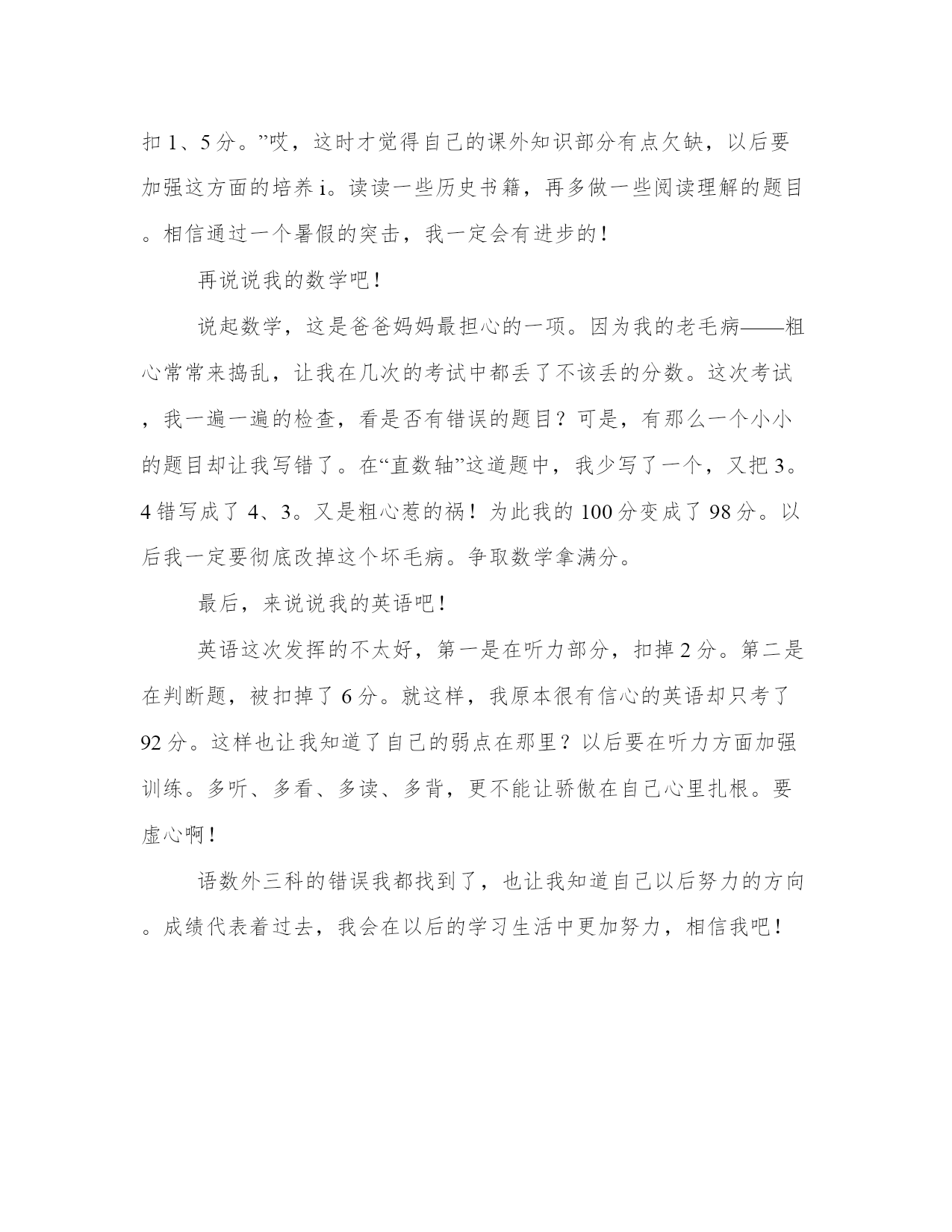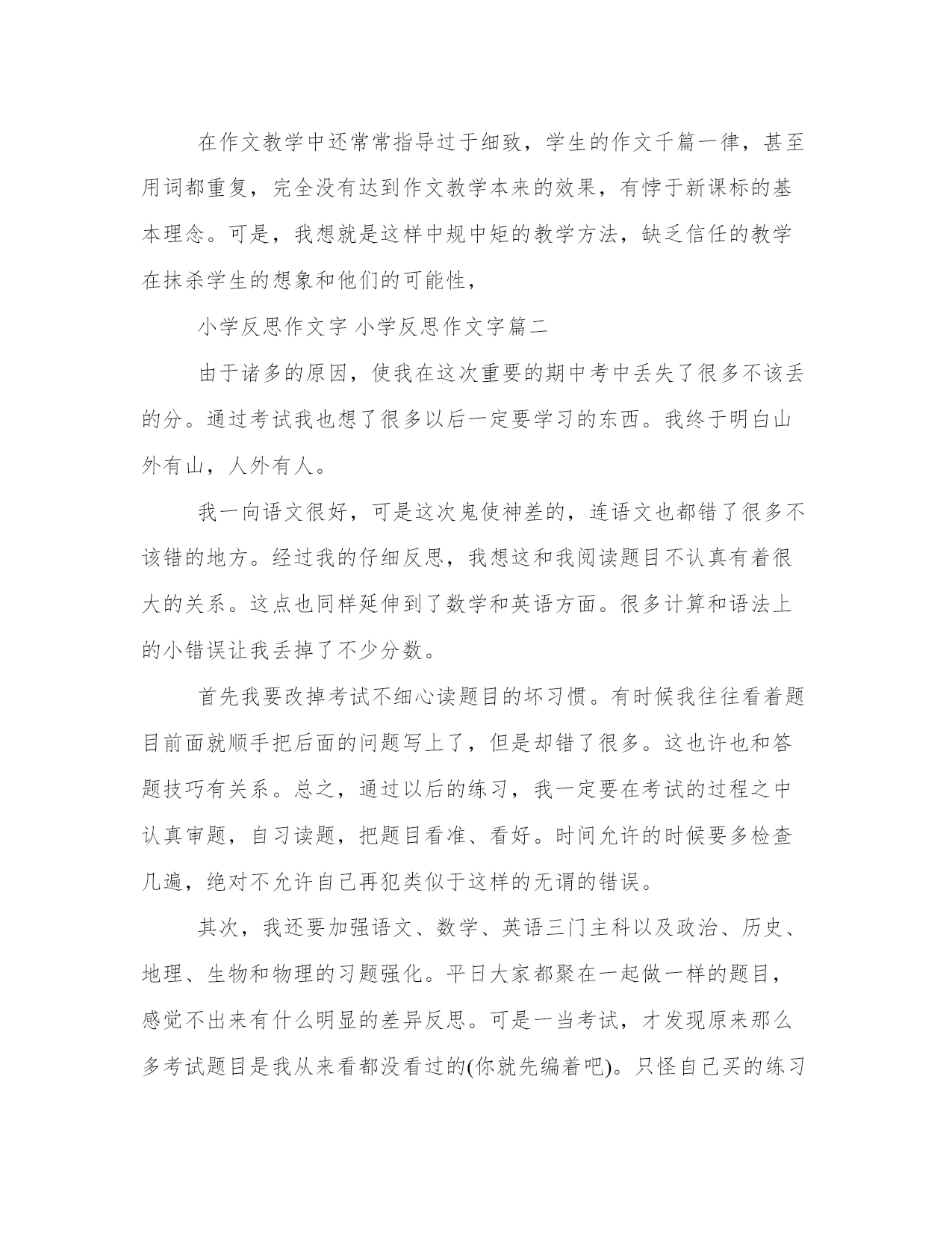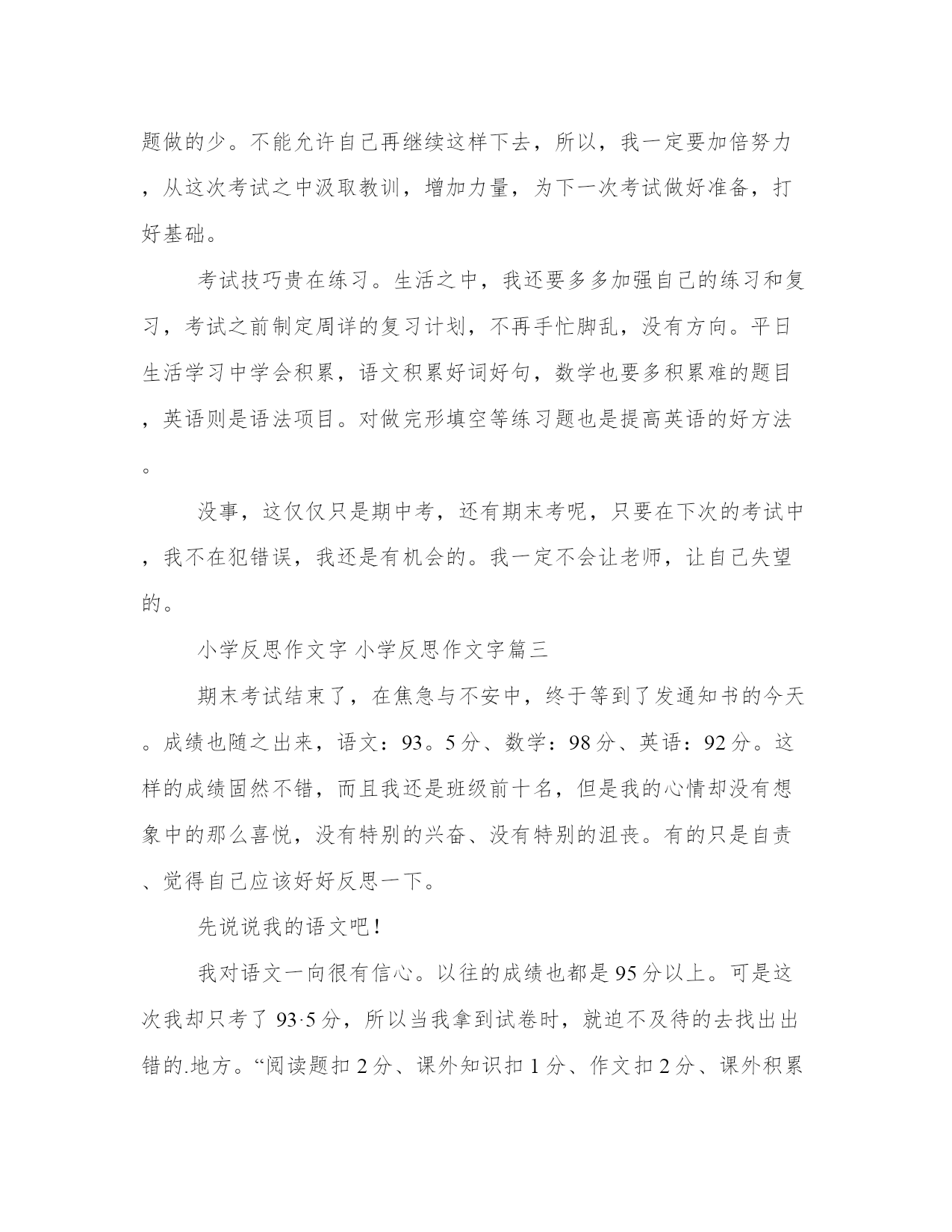 最新小学反思作文字小学反思作文字三篇(优秀)人的记忆力会随着岁月的流逝而衰退,写作可以弥补记忆的不足,将曾经的人生经历和感悟记录下来,也便于保存一份美好的回忆。大家想知道怎么样才能写一篇比较优质的范文吗?以下是我为大家搜集的优质范文,仅供参考,一起来看看吧小学反思作文字小学反思作文字篇一1.趋于教师的主导型,每到作文教学备课时,头脑中首先出现的想法是我要如何让学生快速的学会写这篇作文,忽视了对学生表达能力,以及语文素养的培养。2.对作文教学的方法掌握不够,应用不够灵活,过于程式化在作文教学的过程中,我们一贯用的方法便是教授学生模板,例如,三年级上册第二单元的写作是以写人为主题,为了让能够让学生写出一篇完整的作文,我采用的方法便是直接的把模板亮出来,第一段该写什么,第二段该写什么,第三段……甚至还告诉学生在外貌描写的时候应该是以一个什么样的顺序来写,文章共几段,缺一不可。因为在我自己看来,如果不这样做,那么刚刚学习作文的三年级学生是写不出来一篇作文的,对学生缺乏信任。3.忽视了学生积累素材的重要性4.过分的干预学生的表达,学生缺乏自我发挥的空间在作文教学中还常常指导过于细致,学生的作文千篇一律,甚至用词都重复,完全没有达到作文教学本来的效果,有悖于新课标的基本理念。可是,我想就是这样中规中矩的教学方法,缺乏信任的教学在抹杀学生的想象和他们的可能性,小学反思作文字小学反思作文字篇二由于诸多的原因,使我在这次重要的期中考中丢失了很多不该丢的分。通过考试我也想了很多以后一定要学习的东西。我终于明白山外有山,人外有人。我一向语文很好,可是这次鬼使神差的,连语文也都错了很多不该错的地方。经过我的仔细反思,我想这和我阅读题目不认真有着很大的关系。这点也同样延伸到了数学和英语方面。很多计算和语法上的小错误让我丢掉了不少分数。首先我要改掉考试不细心读题目的坏习惯。有时候我往往看着题目前面就顺手把后面的问题写上了,但是却错了很多。这也许也和答题技巧有关系。总之,通过以后的练习,我一定要在考试的过程之中认真审题,自习读题,把题目看准、看好。时间允许的时候要多检查几遍,绝对不允许自己再犯类似于这样的无谓的错误。其次,我还要加强语文、数学、英语三门主科以及政治、历史、地理、生物和物理的习题强化。平日大家都聚在一起做一样的题目,感觉不出来有什么明显的差异反思。可是一当考试,才发现原来那么多考试题目是我从来看都没看过的(你就先编着吧)。只怪自己买的练习题做的少。不能允许自己再继续这样下去,所以,我一定要加倍努力,从这次考试之中汲取教训,增加力量,为下一次考试做好准备,打好基础。考试技巧贵在练习。生活之中,我还要多多加强自己的练习和复习,考试之前制定周详的复习计划,不再手忙脚乱,没有方向。平日生活学习中学会积累,语文积累好词好句,数学也要多积累难的题目,英语则是语法项目。对做完形填空等练习题也是提高英语的好方法。没事,这仅仅只是期中考,还有期末考呢,只要在下次的考试中,我不在犯错误,我还是有机会的。我一定不会让老师,让自己失望的。小学反思作文字小学反思作文字篇三期末考试结束了,在焦急与不安中,终于等到了发通知书的今天。成绩也随之出来,语文:93。5分、数学:98分、英语:92分。这样的成绩固然不错,而且我还是班级前十名,但是我的心情却没有想象中的那么喜悦,没有特别的兴奋、没有特别的沮丧。有的只是自责、觉得自己应该好好反思一下。先说说我的语文吧!我对语文一向很有信心。以往的成绩也都是95分以上。可是这次我却只考了93·5分,所以当我拿到试卷时,就迫不及待的去找出出错的.地方。“阅读题扣2分、课外知识扣1分、作文扣2分、课外积累扣1、5分。”哎,这时才觉得自己的课外知识部分有点欠缺,以后要加强这方面的培养i。读读一些历史书籍,再多做一些阅读理解的题目。相信通过一个暑假的突击,我一定会有进步的!再说说我的数学吧!说起数学,这是爸爸妈妈最担心的一项。因为我的老毛病——粗心常常来捣乱,让我在几次的考试中都丢了不该丢的分数。这次考试,我一遍一遍的检查,看是否有错误的题目?可是,有那么一个小小的题目却让我写错了。在“直数轴”这道题中,我少写了一个,又把3。4错写成了4、3。又是粗心惹的祸!为此我的100分变成了98分。以后我一定要彻底改掉这个坏毛病。争取数学拿满分。最后,来说说我的英语吧!英语这次发挥的不太好,第一是在听力部分,扣掉2分。第二是在判断题,被扣掉了6分。就这样,我原本很有信心的英语却只考了92分。这样也让我知道了自己的弱点在那里?以后要在听力方面加强训练。多听、多看、多读、多背,更不能让骄傲在自己心里扎根。要虚心啊!语数外三科的错误我都找到了,也让我知道自己以后努力的方向。成绩代表着过去,我会在以后的学习生活中更加努力,相信我吧!