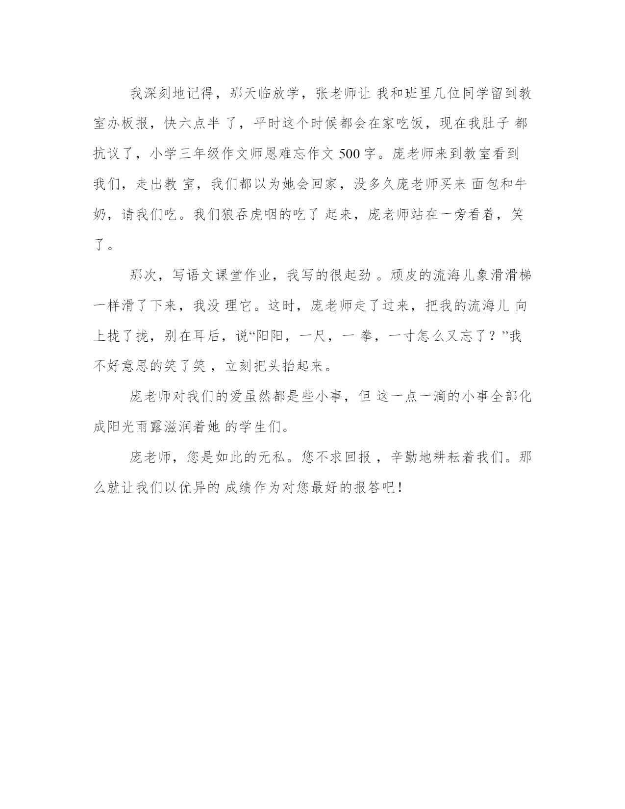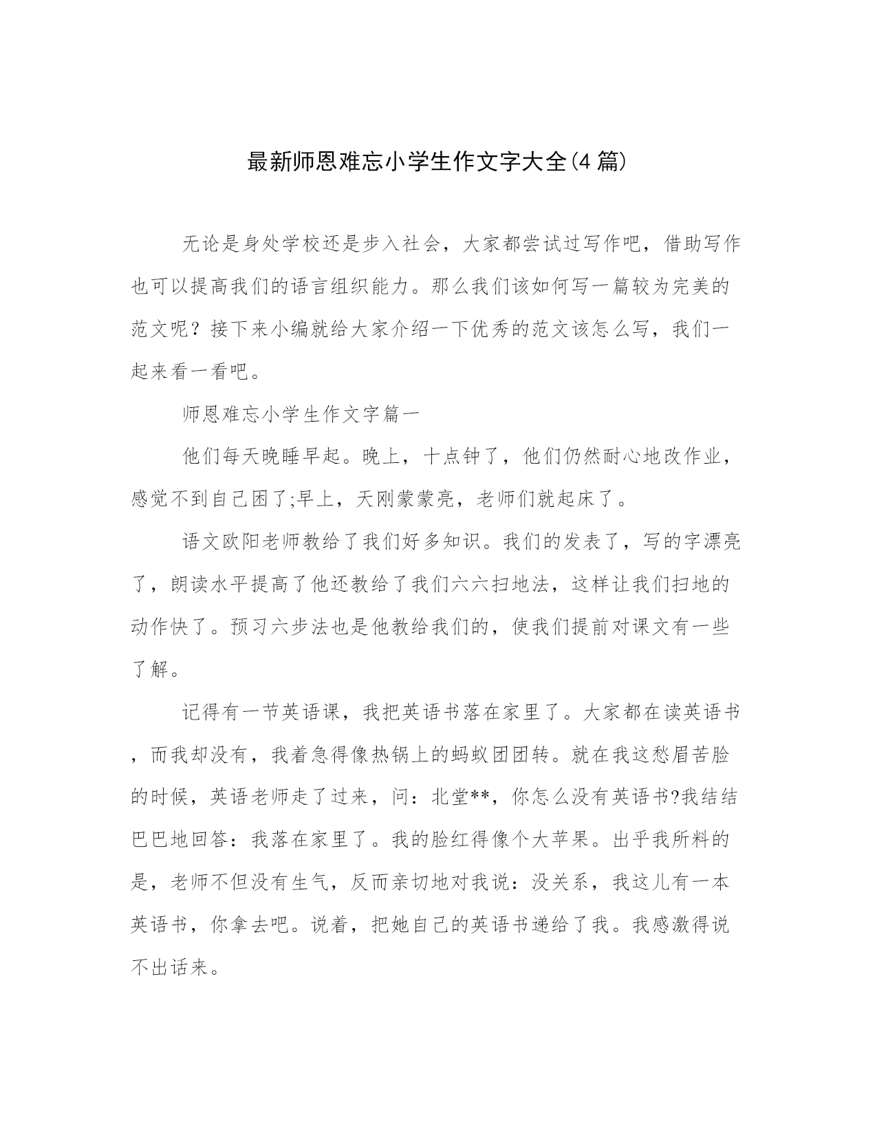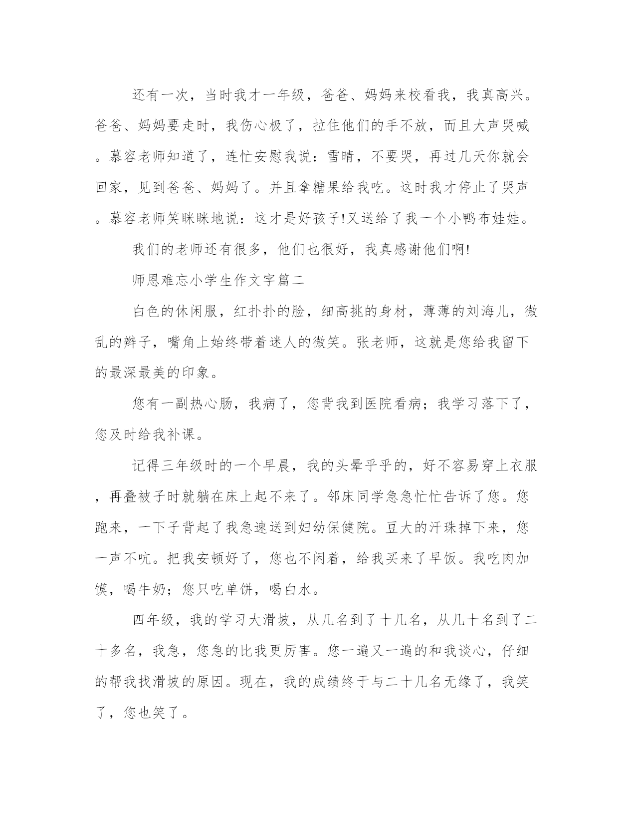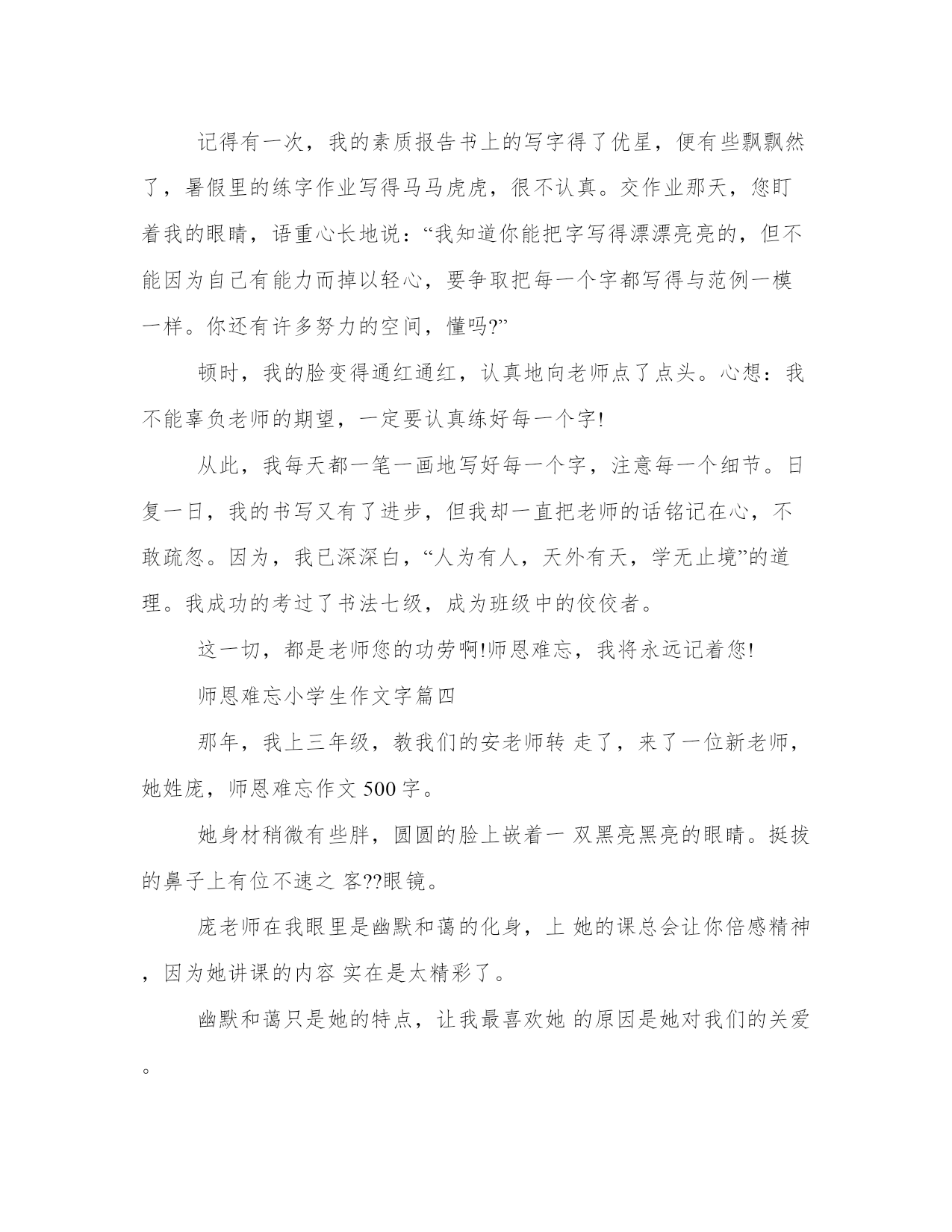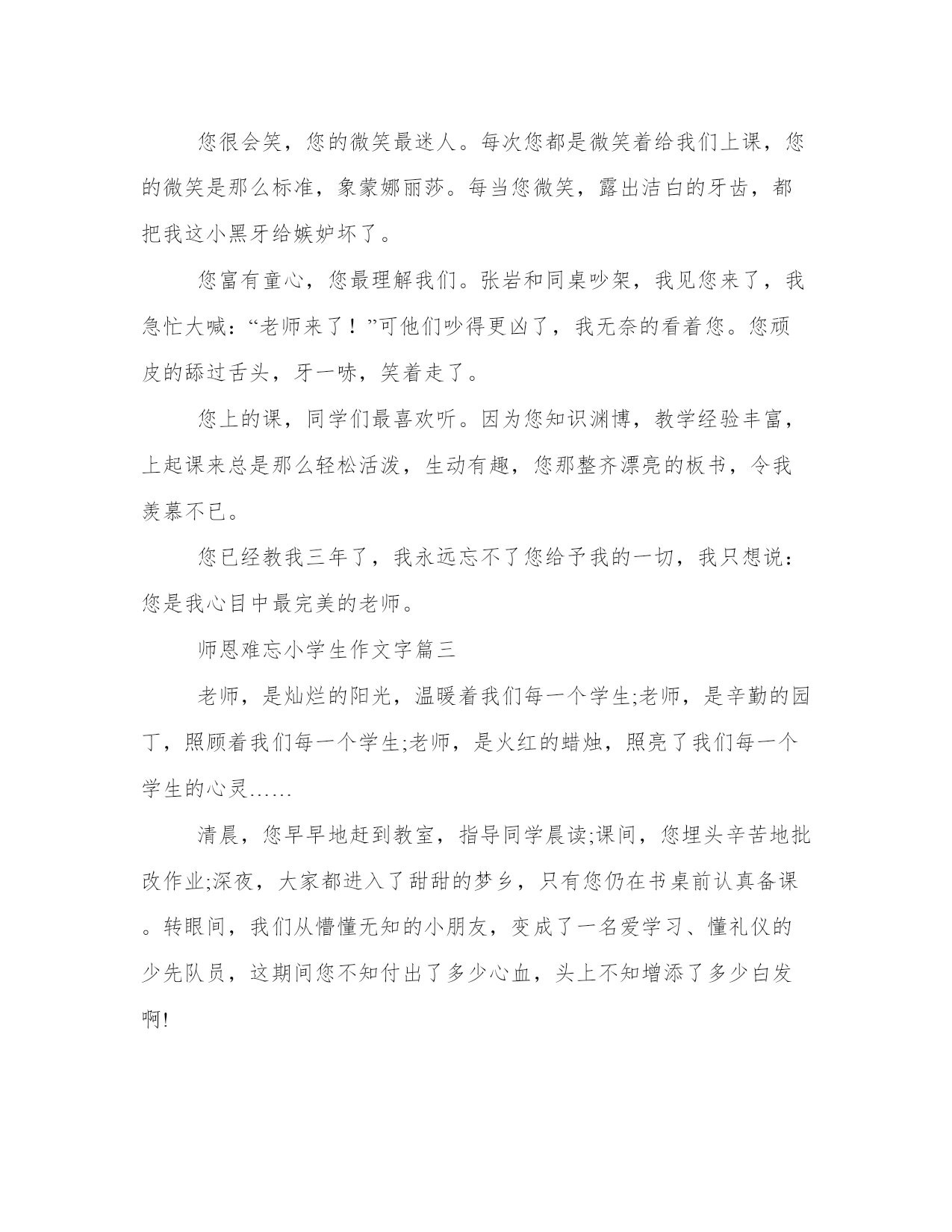 最新师恩难忘小学生作文字大全(4篇)无论是身处学校还是步入社会,大家都尝试过写作吧,借助写作也可以提高我们的语言组织能力。那么我们该如何写一篇较为完美的范文呢?接下来小编就给大家介绍一下优秀的范文该怎么写,我们一起来看一看吧。师恩难忘小学生作文字篇一他们每天晚睡早起。晚上,十点钟了,他们仍然耐心地改作业,感觉不到自己困了;早上,天刚蒙蒙亮,老师们就起床了。语文欧阳老师教给了我们好多知识。我们的发表了,写的字漂亮了,朗读水平提高了他还教给了我们六六扫地法,这样让我们扫地的动作快了。预习六步法也是他教给我们的,使我们提前对课文有一些了解。记得有一节英语课,我把英语书落在家里了。大家都在读英语书,而我却没有,我着急得像热锅上的蚂蚁团团转。就在我这愁眉苦脸的时候,英语老师走了过来,问:北堂**,你怎么没有英语书?我结结巴巴地回答:我落在家里了。我的脸红得像个大苹果。出乎我所料的是,老师不但没有生气,反而亲切地对我说:没关系,我这儿有一本英语书,你拿去吧。说着,把她自己的英语书递给了我。我感激得说不出话来。还有一次,当时我才一年级,爸爸、妈妈来校看我,我真高兴。爸爸、妈妈要走时,我伤心极了,拉住他们的手不放,而且大声哭喊。慕容老师知道了,连忙安慰我说:雪晴,不要哭,再过几天你就会回家,见到爸爸、妈妈了。并且拿糖果给我吃。这时我才停止了哭声。慕容老师笑眯眯地说:这才是好孩子!又送给了我一个小鸭布娃娃。我们的老师还有很多,他们也很好,我真感谢他们啊!师恩难忘小学生作文字篇二白色的休闲服,红扑扑的脸,细高挑的身材,薄薄的刘海儿,微乱的辫子,嘴角上始终带着迷人的微笑。张老师,这就是您给我留下的最深最美的印象。您有一副热心肠,我病了,您背我到医院看病;我学习落下了,您及时给我补课。记得三年级时的一个早晨,我的头晕乎乎的,好不容易穿上衣服,再叠被子时就躺在床上起不来了。邻床同学急急忙忙告诉了您。您跑来,一下子背起了我急速送到妇幼保健院。豆大的汗珠掉下来,您一声不吭。把我安顿好了,您也不闲着,给我买来了早饭。我吃肉加馍,喝牛奶;您只吃单饼,喝白水。四年级,我的学习大滑坡,从几名到了十几名,从几十名到了二十多名,我急,您急的比我更厉害。您一遍又一遍的和我谈心,仔细的帮我找滑坡的原因。现在,我的成绩终于与二十几名无缘了,我笑了,您也笑了。您很会笑,您的微笑最迷人。每次您都是微笑着给我们上课,您的微笑是那么标准,象蒙娜丽莎。每当您微笑,露出洁白的牙齿,都把我这小黑牙给嫉妒坏了。您富有童心,您最理解我们。张岩和同桌吵架,我见您来了,我急忙大喊:“老师来了!”可他们吵得更凶了,我无奈的看着您。您顽皮的舔过舌头,牙一哧,笑着走了。您上的课,同学们最喜欢听。因为您知识渊博,教学经验丰富,上起课来总是那么轻松活泼,生动有趣,您那整齐漂亮的板书,令我羡慕不已。您已经教我三年了,我永远忘不了您给予我的一切,我只想说:您是我心目中最完美的老师。师恩难忘小学生作文字篇三老师,是灿烂的阳光,温暖着我们每一个学生;老师,是辛勤的园丁,照顾着我们每一个学生;老师,是火红的蜡烛,照亮了我们每一个学生的心灵……清晨,您早早地赶到教室,指导同学晨读;课间,您埋头辛苦地批改作业;深夜,大家都进入了甜甜的梦乡,只有您仍在书桌前认真备课。转眼间,我们从懵懂无知的小朋友,变成了一名爱学习、懂礼仪的少先队员,这期间您不知付出了多少心血,头上不知增添了多少白发啊!记得有一次,我的素质报告书上的写字得了优星,便有些飘飘然了,暑假里的练字作业写得马马虎虎,很不认真。交作业那天,您盯着我的眼睛,语重心长地说:“我知道你能把字写得漂漂亮亮的,但不能因为自己有能力而掉以轻心,要争取把每一个字都写得与范例一模一样。你还有许多努力的空间,懂吗?”顿时,我的脸变得通红通红,认真地向老师点了点头。心想:我不能辜负老师的期望,一定要认真练好每一个字!从此,我每天都一笔一画地写好每一个字,注意每一个细节。日复一日,我的书写又有了进步,但我却一直把老师的话铭记在心,不敢疏忽。因为,我已深深白,“人为有人,天外有天,学无止境”的道理。我成功的考过了书法七级,成为班级中的佼佼者。这一切,都是老师您的功劳啊!师恩难忘,我将永远记着您!师恩难忘小学生作文字篇四那年,我上三年级,教我们的安老师转走了,来了一位新老师,她姓庞,师恩难忘作文500字。她身材稍微有些胖,圆圆的脸上嵌着一双黑亮黑亮的眼睛。挺拔的鼻子上有位不速之客??眼镜。庞老师在我眼里是幽默和蔼的化身,上她的课总会让你倍感精神,因为她讲课的内容实在是太精彩了。幽默和蔼只是她的特点,让我最喜欢她的原因是她对我们的关爱。我深刻地记得,那天临放学,张老师让我和班里几位同学留到教室办板报,快六点半了,平时这个时候都会在家吃饭,现在我肚子都抗议了,小学三年级作文师恩难忘作文500字