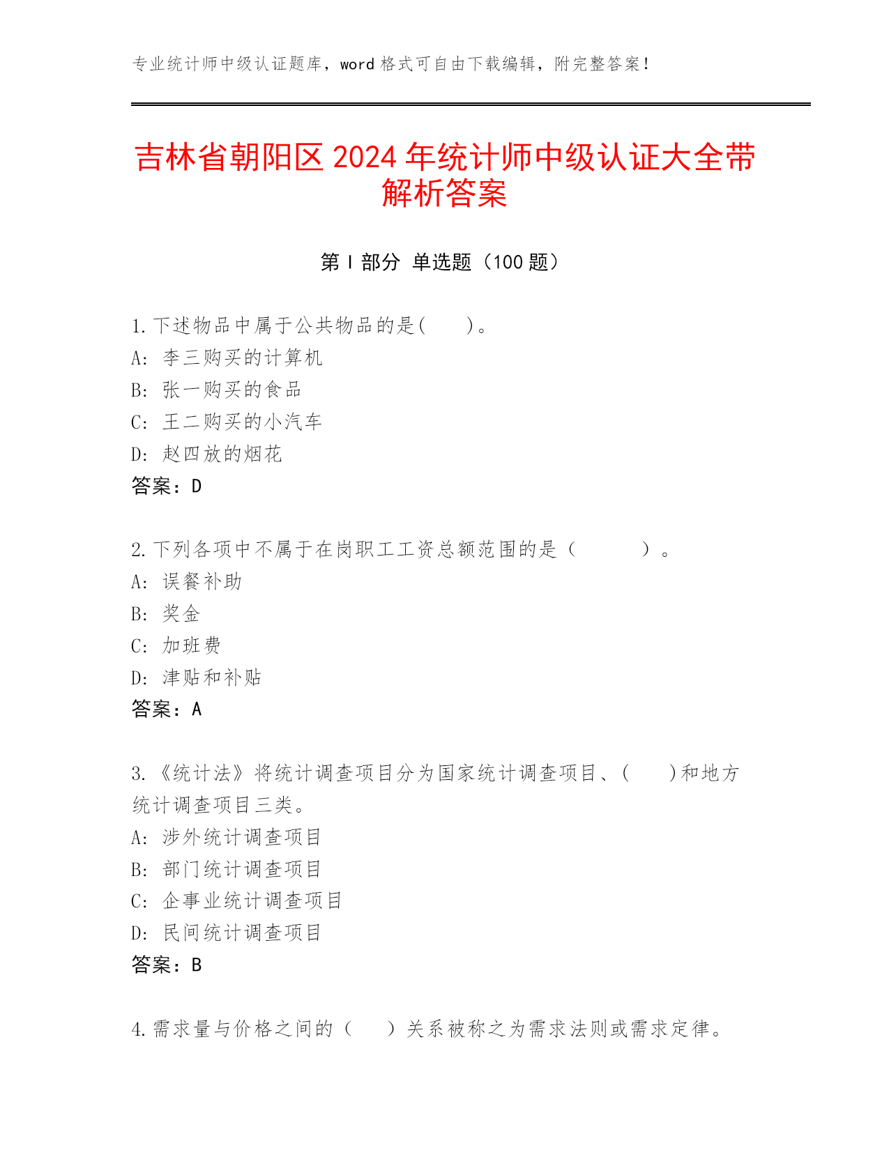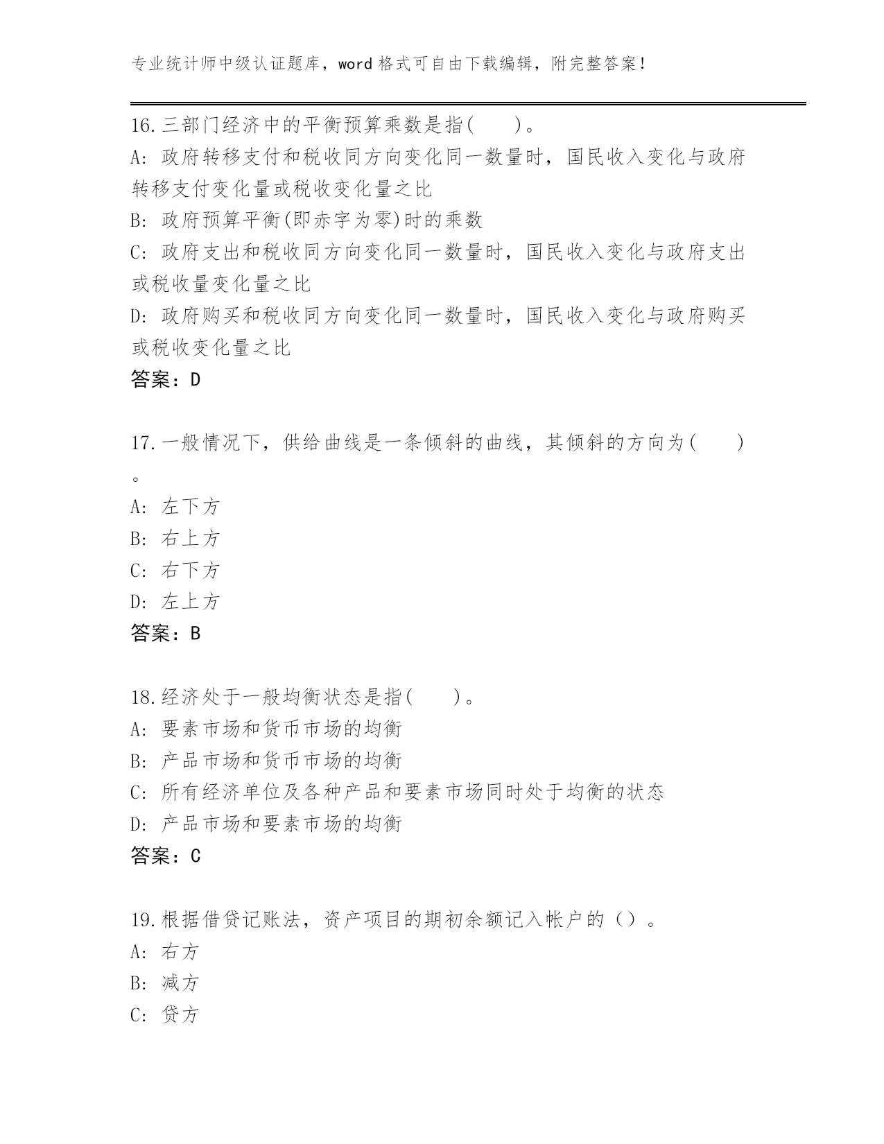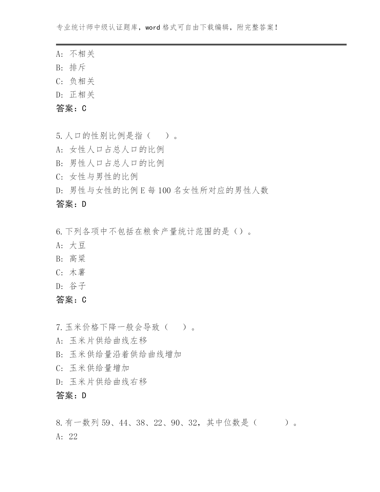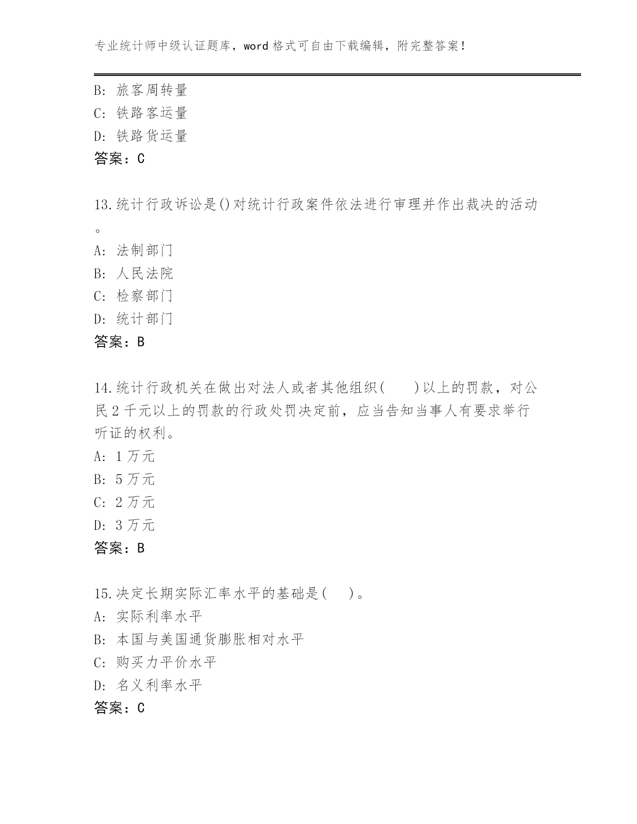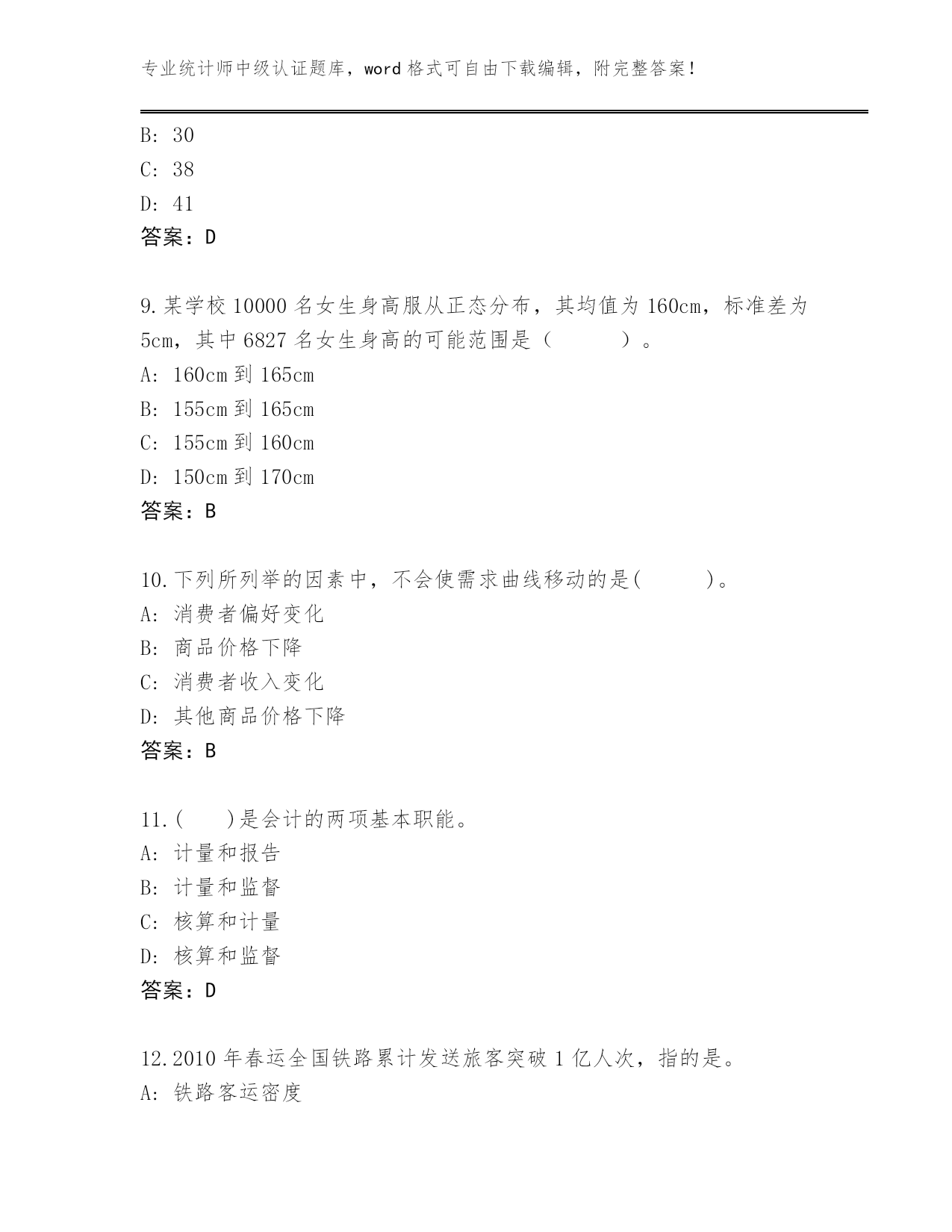 专业统计师中级认证题库,word格式可自由下载编辑,附完整答案!吉林省朝阳区2024年统计师中级认证大全带解析答案第I部分单选题(100题)1.下述物品中属于公共物品的是()。A:李三购买的计算机B:张一购买的食品C:王二购买的小汽车D:赵四放的烟花答案:D2.下列各项中不属于在岗职工工资总额范围的是()。A:误餐补助B:奖金C:加班费D:津贴和补贴答案:A3.《统计法》将统计调查项目分为国家统计调查项目、()和地方统计调查项目三类。A:涉外统计调查项目B:部门统计调查项目C:企事业统计调查项目D:民间统计调查项目答案:B4.需求量与价格之间的()关系被称之为需求法则或需求定律。A:不相关B:排斥C:负相关D:正相关答案:C5.人口的性别比例是指()。A:女性人口占总人口的比例B:男性人口占总人口的比例C:女性与男性的比例D:男性与女性的比例E每100名女性所对应的男性人数答案:D6.下列各项中不包括在粮食产量统计范围的是()。A:大豆B:高粱C:木薯D:谷子答案:C7.玉米价格下降一般会导致()。A:玉米片供给曲线左移B:玉米供给量沿着供给曲线增加C:玉米供给量增加D:玉米片供给曲线右移答案:D8.有一数列59、44、38、22、90、32,其中位数是()。A:22B:30C:38D:41答案:D9.某学校10000名女生身高服从正态分布,其均值为160cm,标准差为5cm,其中6827名女生身高的可能范围是()。A:160cm到165cmB:155cm到165cmC:155cm到160cmD:150cm到170cm答案:B10.下列所列举的因素中,不会使需求曲线移动的是()。A:消费者偏好变化B:商品价格下降C:消费者收入变化D:其他商品价格下降答案:B11.()是会计的两项基本职能。A:计量和报告B:计量和监督C:核算和计量D:核算和监督答案:D12.2010年春运全国铁路累计发送旅客突破1亿人次,指的是。A:铁路客运密度B:旅客周转量C:铁路客运量D:铁路货运量答案:C13.统计行政诉讼是()对统计行政案件依法进行审理并作出裁决的活动。A:法制部门B:人民法院C:检察部门D:统计部门答案:B14.统计行政机关在做出对法人或者其他组织()以上的罚款,对公民2千元以上的罚款的行政处罚决定前,应当告知当事人有要求举行听证的权利。A:1万元B:5万元C:2万元D:3万元答案:B15.决定长期实际汇率水平的基础是()。A:实际利率水平B:本国与美国通货膨胀相对水平C:购买力平价水平D:名义利率水平答案:C16.三部门经济中的平衡预算乘数是指()。A:政府转移支付和税收同方向变化同一数量时,国民收入变化与政府转移支付变化量或税收变化量之比B:政府预算平衡(即赤字为零)时的乘数C:政府支出和税收同方向变化同一数量时,国民收入变化与政府支出或税收量变化量之比D:政府购买和税收同方向变化同一数量时,国民收入变化与政府购买或税收变化量之比答案:D17.一般情况下,供给曲线是一条倾斜的曲线,其倾斜的方向为()。A:左下方B:右上方C:右下方D:左上方答案:B18.经济处于一般均衡状态是指()。A:要素市场和货币市场的均衡B:产品市场和货币市场的均衡C:所有经济单位及各种产品和要素市场同时处于均衡的状态D:产品市场和要素市场的均衡答案:C19.根据借贷记账法,资产项目的期初余额记入帐户的()。A:右方B:减方C:贷方D:借方答案:D20.若各年环比增长速度保持不变,则各年增长量()。A:保持不变B:逐年减少C:不能确定D:逐年增加答案:D21.根据投入产出简表,下列表述正确的是()。A:306亿元表示第一产业生产的货物提供给第二产业使用的价值量B:306亿元表示第二产业生产的货物提供给第一产业使用的价值量C:306亿元表示第一、第三产业生产的货物和服务提供给第二产业使用的价值量D:306亿元表示第二产业生产的货物和服务提供给第一、第三产业使用的价值量答案:A22.某种商品的价格提高2%,供给增加1.5%,则该商品的供给价格弹性属于()。A:供给弹性一般B:供给弹性充足C:供给弹性不充足D:供给完全无弹性答案:C23.在财务统计中,企业主营业务收入是指企业从事主要生产经营活动所取得的营业收入,对于不同行业的企业,其具体内容有所不同。其中餐饮企业的主营业务收入是()。A:营运业务收入B:产品销售收入C:营业收入D:工程结算收入答案:C24.一般情况下,粮食的恩格尔曲线的斜率和珠宝的恩格尔曲线的斜率呈现如下特点()。A:两者都是递增B:两者都是递减C:前者递增,后者递减D:前者递减,后者递增答案:D25.会计报告是指根据会计信息使用者的要求,按照一定的格式,把账簿记录加工成(),提供给信息使用者,据以进行分析、预测和决策。A:财务说明B:会计凭证C