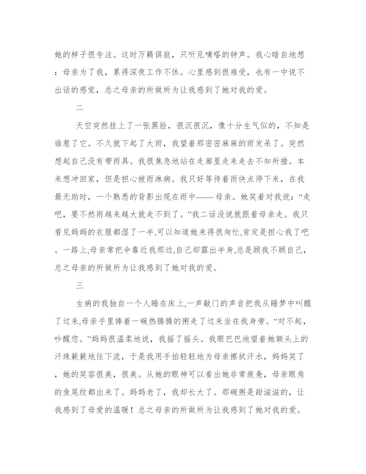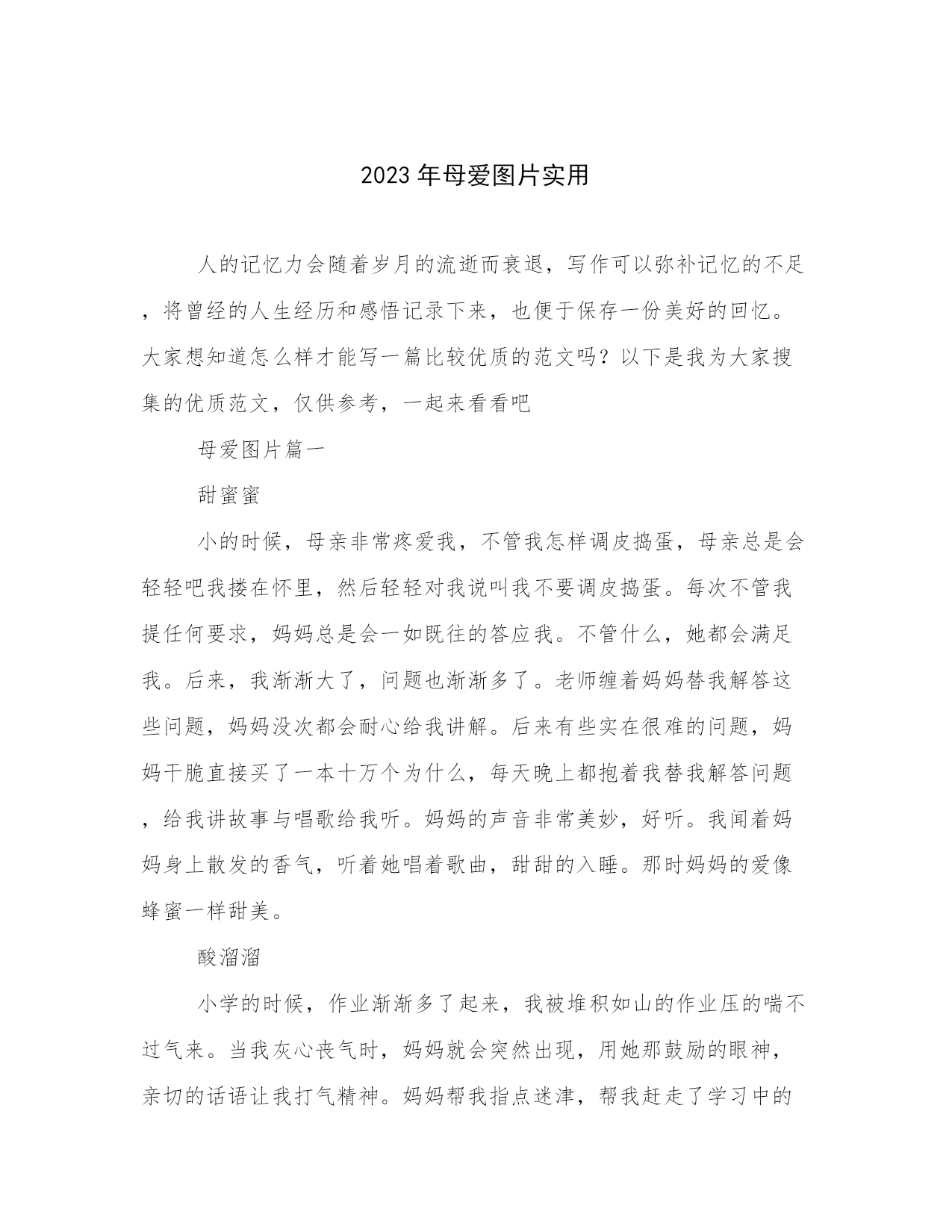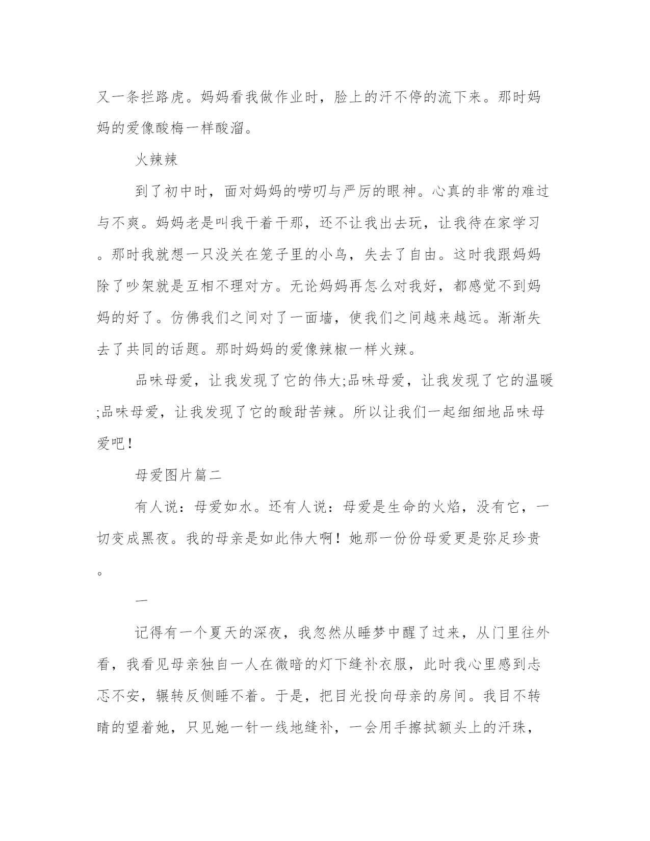 2023年母爱图片实用人的记忆力会随着岁月的流逝而衰退,写作可以弥补记忆的不足,将曾经的人生经历和感悟记录下来,也便于保存一份美好的回忆。大家想知道怎么样才能写一篇比较优质的范文吗?以下是我为大家搜集的优质范文,仅供参考,一起来看看吧母爱图片篇一甜蜜蜜小的时候,母亲非常疼爱我,不管我怎样调皮捣蛋,母亲总是会轻轻吧我搂在怀里,然后轻轻对我说叫我不要调皮捣蛋。每次不管我提任何要求,妈妈总是会一如既往的答应我。不管什么,她都会满足我。后来,我渐渐大了,问题也渐渐多了。老师缠着妈妈替我解答这些问题,妈妈没次都会耐心给我讲解。后来有些实在很难的问题,妈妈干脆直接买了一本十万个为什么,每天晚上都抱着我替我解答问题,给我讲故事与唱歌给我听。妈妈的声音非常美妙,好听。我闻着妈妈身上散发的香气,听着她唱着歌曲,甜甜的入睡。那时妈妈的爱像蜂蜜一样甜美。酸溜溜小学的时候,作业渐渐多了起来,我被堆积如山的作业压的喘不过气来。当我灰心丧气时,妈妈就会突然出现,用她那鼓励的眼神,亲切的话语让我打气精神。妈妈帮我指点迷津,帮我赶走了学习中的又一条拦路虎。妈妈看我做作业时,脸上的汗不停的流下来。那时妈妈的爱像酸梅一样酸溜。火辣辣到了初中时,面对妈妈的唠叨与严厉的眼神。心真的非常的难过与不爽。妈妈老是叫我干着干那,还不让我出去玩,让我待在家学习。那时我就想一只没关在笼子里的小鸟,失去了自由。这时我跟妈妈除了吵架就是互相不理对方。无论妈妈再怎么对我好,都感觉不到妈妈的好了。仿佛我们之间对了一面墙,使我们之间越来越远。渐渐失去了共同的话题。那时妈妈的爱像辣椒一样火辣。品味母爱,让我发现了它的伟大;品味母爱,让我发现了它的温暖;品味母爱,让我发现了它的酸甜苦辣。所以让我们一起细细地品味母爱吧!母爱图片篇二有人说:母爱如水。还有人说:母爱是生命的火焰,没有它,一切变成黑夜。我的母亲是如此伟大啊!她那一份份母爱更是弥足珍贵。一记得有一个夏天的深夜,我忽然从睡梦中醒了过来,从门里往外看,我看见母亲独自一人在微暗的灯下缝补衣服,此时我心里感到忐忑不安,辗转反侧睡不着。于是,把目光投向母亲的房间。我目不转睛的望着她,只见她一针一线地缝补,一会用手擦拭额头上的汗珠,她的样子很专注。这时万籁俱寂,只听见嘀嗒的钟声。我心暗自地想:母亲为了我,累得深夜工作不休。心里感到很难受,也有一中说不出话的感觉,总之母亲的所做所为让我感到了她对我的爱。二天空突然挂上了一张黑脸,很沉很沉,像十分生气似的,不知是谁惹了它。不久就下起了大雨,我望着那密密麻麻的雨发呆了。突然想起自己没有带雨具。我很焦急地站在走廊里走来走去不知所措。本来想冲回家,但是担心被雨淋病。我只好等待着雨快点停下来,在我最无助时,一个熟悉的背影出现在雨中——母亲。她笑着对我说:“走吧,要不然雨越来越大就走不到了。”我二话没说就跟着母亲走。我只看见妈妈的衣服都湿了一半,可以知道她来得很匆忙,肯定是担心我了吧。一路上,母亲常把伞靠近我那边,自己却露出半身,总是顾我不顾自己,总之母亲的所做所为让我感到了她对我的爱。三生病的我独自一个人睡在床上,一声敲门的声音把我从睡梦中叫醒了过来,母亲手里捧着一碗热腾腾的粥走了过来坐在我身旁。“对不起,吵醒您。”妈妈很温柔地说,我摇了摇头。我眼巴巴地望着她额头上的汗珠簌簌地往下流,于是我用手拍轻轻地为母亲擦拭汗水,妈妈笑了,她的笑容很美,很美。从她的眼神可以看出她非常疲惫,母亲眼角的鱼尾纹都出来了。妈妈老了,我却长大了。那碗粥是甜滋滋的,让我感到了母爱的温暖!总之母亲的所做所为让我感到了她对我的爱。母亲对我的爱就像我珍藏在记忆里的一片片树叶,从雾弥漫的空中渐渐飘落,似乎是落不完,飘不尽的.母爱让我感到了爱的温暖!总之母亲的所做所为让我感到了她对我的爱。让母爱永驻心中吧!