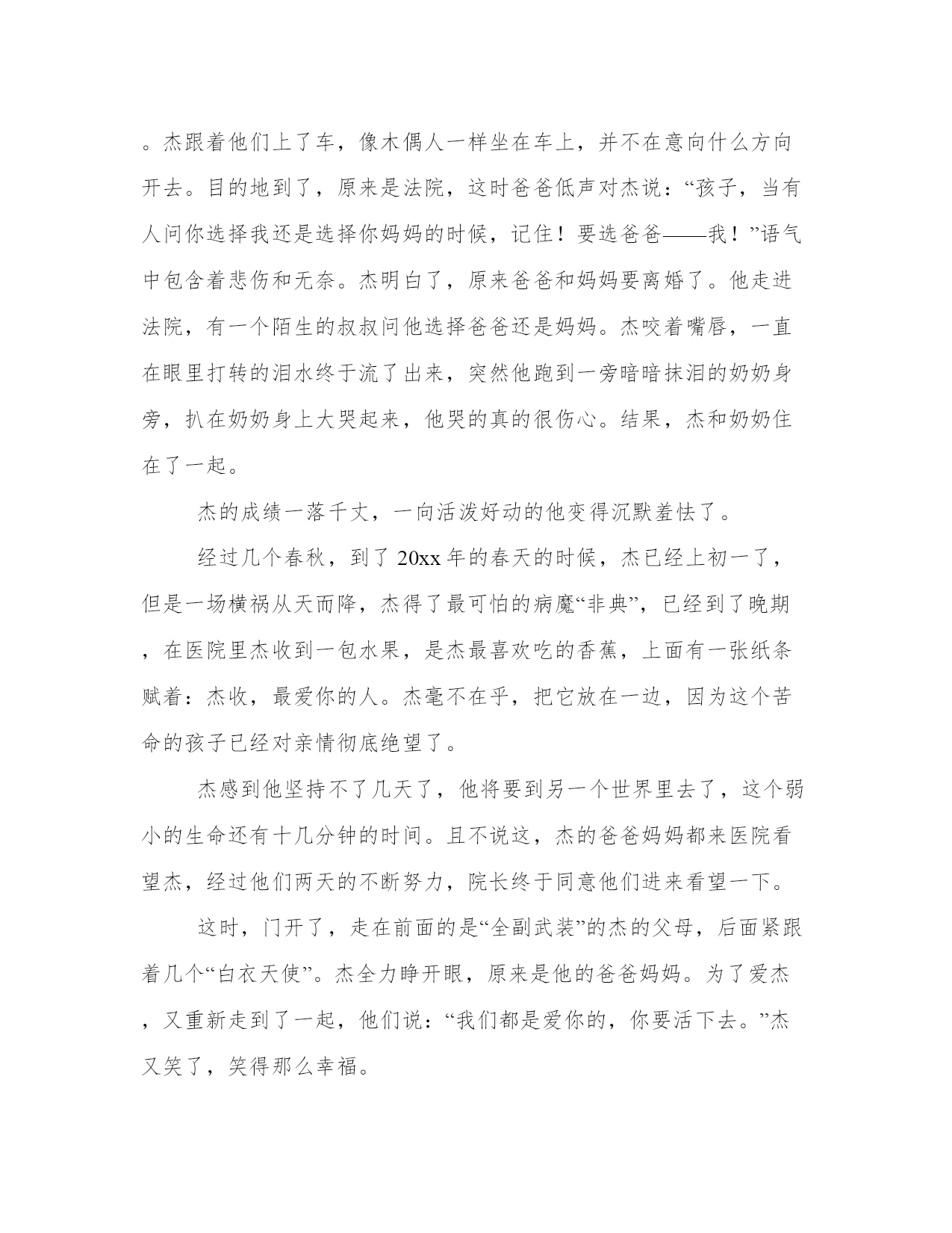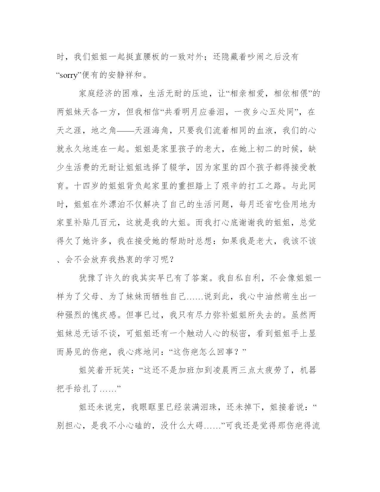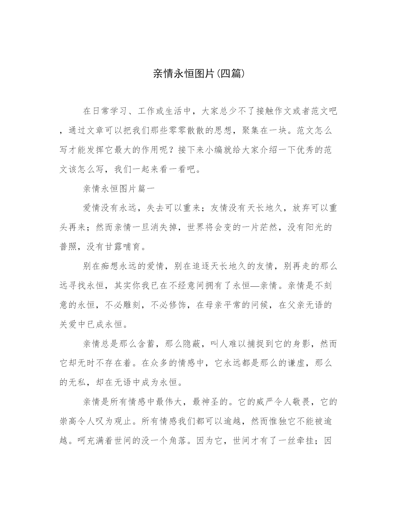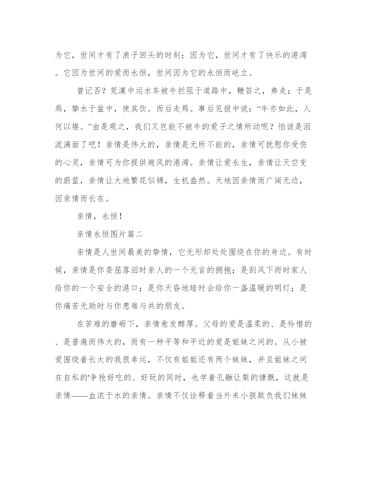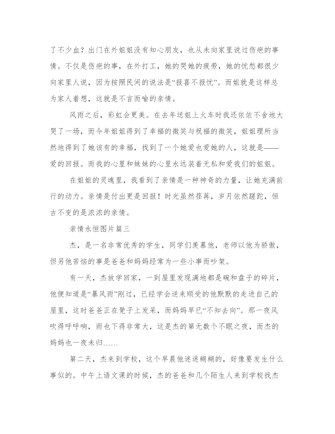 亲情永恒图片(四篇)在日常学习、工作或生活中,大家总少不了接触作文或者范文吧,通过文章可以把我们那些零零散散的思想,聚集在一块。范文怎么写才能发挥它最大的作用呢?接下来小编就给大家介绍一下优秀的范文该怎么写,我们一起来看一看吧。亲情永恒图片篇一爱情没有永远,失去可以重来;友情没有天长地久,放弃可以重头再来;然而亲情一旦消失掉,世界将会变的一片茫然,没有阳光的普照,没有甘露哺育。别在痴想永远的爱情,别在追逐天长地久的友情,别再走的那么远寻找永恒,其实你我已在不经意间拥有了永恒—亲情。亲情是不刻意的永恒,不必雕刻,不必修饰,在母亲平常的问候,在父亲无语的关爱中已成永恒。亲情总是那么含蓄,那么隐蔽,叫人难以捕捉到它的身影,然而它却无时不存在着。在众多的情感中,它永远都是那么的谦虚,那么的无私,却在无语中成为永恒。亲情是所有情感中最伟大,最神圣的。它的威严令人敬畏,它的崇高令人叹为观止。所有情感我们都可以逾越,然而惟独它不能被逾越。呵充满着世间的没一个角落。因为它,世间才有了一丝牵挂;因为它,世间才有了浪子回头的时刻;因为它,世间才有了快乐的港湾。它因为世间的爱而永恒,世间因为它的永恒而屹立。曾记否?荒漠中运水车被牛拦阻于道路中,鞭笞之,弗走;于是焉,挚水于盆中,使其饮。而后走焉。事后见报中说:“牛亦如此,人何以堪。”由是观之,我们又岂能不被牛的爱子之情所动呢?怕该是泪流满面了吧!亲情是伟大的,亲情是无所不能的,亲情可抚慰你受伤的心灵,亲情可为你提供避风的港湾。亲情让爱永生,亲情让天空变的蔚蓝,亲情让大地繁花似锦,生机盎然。天地因亲情而广阔无边,因亲情而长在。亲情,永恒!亲情永恒图片篇二亲情是人世间最美的挚情,它无形却处处围绕在你的身边。有时候,亲情是你委屈落泪时亲人的一个无言的拥抱;是刮风下雨时家人给你的一个安全的港口;是你天昏地暗时会给你一盏温暖的明灯;是你痛苦无助时与你患难与共的朋友。在苦难的磨砺下,亲情愈发醇厚。父母的爱是温柔的、是怜惜的、是普遍而伟大的,而有一种平等和平近的爱是姐妹之间的。从小被爱围绕着长大的我很幸运,不仅有姐姐还有两个妹妹,并且姐妹之间在自私的'争抢好吃的、好玩的同时,也学着孔融让梨的慷慨,这就是亲情——血浓于水的亲情。亲情不仅诠释着当外来小孩欺负我们妹妹时,我们姐姐一起挺直腰板的一致对外;还隐藏着吵闹之后没有“sorry”便有的安静祥和。家庭经济的困难,生活无耐的压迫,让“相亲相爱,相依相偎”的两姐妹天各一方,但我相信“共看明月应垂泪,一夜乡心五处同”,在天之涯,地之角——天涯海角,只要我们流着相同的血液,我们的心就永久地连在一起。姐姐是家里孩子的老大,在她上初二的时候,缺少生活费的无耐让姐姐选择了辍学,因为家里的四个孩子都得接受教育。十四岁的姐姐背负起家里的重担踏上了艰辛的打工之路。与此同时,姐姐在外漂泊不仅解决了自己的生活问题,每月还省吃俭用地为家里补贴几百元,这就是我的大姐。而我打心底谢谢我的姐姐,总觉得欠了她许多,我在接受她的帮助时总想:如果我是老大,我该不该、会不会放弃我热衷的学习呢?犹豫了许久的我其实早已有了答案。我自私自利,不会像姐姐一样为了父母、为了妹妹而牺牲自己……说到此,我心中油然萌生出一种强烈的愧疚感。但事已过,我只有尽力弥补姐姐所失去的。虽然两姐妹总无话不谈,可姐姐还有一个触动人心的秘密,看到姐姐手上显而易见的伤疤,我心疼地问:“这伤疤怎么回事?”姐笑着开玩笑:“这还不是加班加到凌晨两三点太疲劳了,机器把手给扎了……”姐还未说完,我眼眶里已经装满泪珠,还未掉下,姐接着说:“别担心,是我不小心磕的,没什么大碍……”可我还是觉得那伤疤得流了不少血?出门在外姐姐没有知心朋友,也从未向家里说过伤疤的事情。不仅是伤疤的事,在外打工,她的哭她的疲劳,她的忧愁都很少向家里人说,因为按照民间的说法是“报喜不报忧”。而姐就是这样总为家人着想,这就是不言而喻的亲情。风雨之后,彩虹会更美。在去年送姐上火车时我还依依不舍地大哭了一场,而今年姐姐得到了幸福的微笑与祝福的微笑,姐姐理所当然地得到了她该有的幸福,找到了一个她爱也爱她的人,这就是——爱的回报。而我的心里和妹妹的心里永远装着无私和爱我们的姐姐。在姐姐的灵魂里,我看到了亲情是一种神奇的力量,让她充满前行的动力。亲情是付出更是回报!时光虽然荏苒,岁月依然蹉跎,恒古不变的是浓浓的亲情。亲情永恒图片篇三杰,是一名非常优秀的学生,同学们羡慕他,老师以他为骄傲,但另他苦恼的事是爸爸和妈妈经常为一些小事而吵架。有一天,杰放学回家,一到屋里发现满地都是碗和盘子的碎片,他便知道是“暴风雨”刚过,已经学会逆来顺受的他默默的走进自己的屋里,这时爸爸正在凳子上发呆,而妈妈早已“不知去向”。那一夜风吹得呼呼响,雨也下得非常大,这是杰的第无数个不眠之夜,而杰的妈妈也一夜未归…