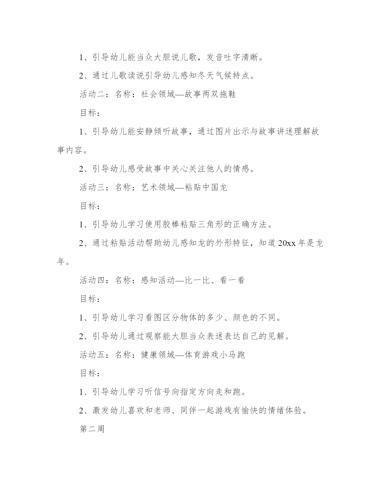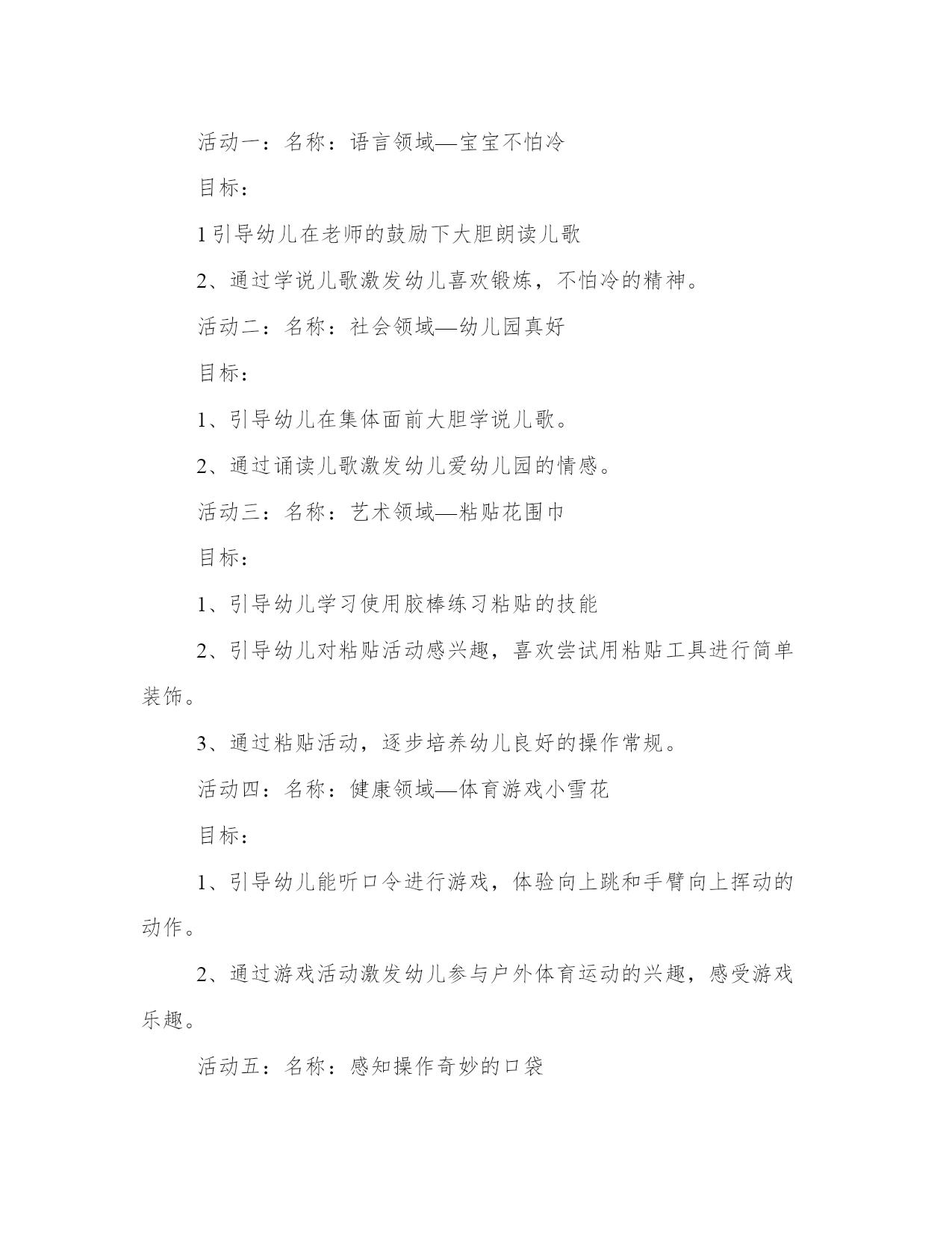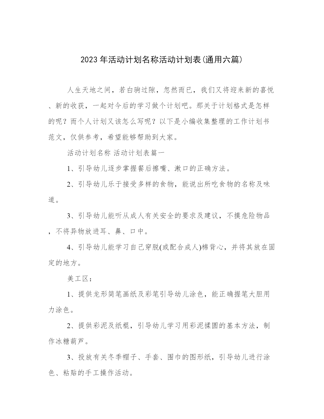 2023年活动计划名称活动计划表(通用六篇)人生天地之间,若白驹过隙,忽然而已,我们又将迎来新的喜悦、新的收获,一起对今后的学习做个计划吧。那关于计划格式是怎样的呢?而个人计划又该怎么写呢?以下是小编收集整理的工作计划书范文,仅供参考,希望能够帮助到大家。活动计划名称活动计划表篇一1、引导幼儿逐步掌握餐后擦嘴、漱口的正确方法。2、引导幼儿乐于接受多样的食物,能说出所吃食物的名称及味道。3、引导幼儿能听从成人有关安全的要求及建议,不摸危险物品,不将异物放进耳、鼻、口中。4、引导幼儿能学习自己穿脱(或配合成人)棉背心,并将其放在固定的地方。美工区:1、提供龙形简笔画纸及彩笔引导幼儿涂色,能正确握笔大胆用力涂色。2、提供彩泥及纸棍,引导幼儿学习用彩泥揉圆的基本方法,制作冰糖葫芦。3、投放有关冬季帽子、手套、围巾的图形纸,引导幼儿进行涂色、粘贴的手工操作活动。4、投放白色纸及蓝色背景,引导幼儿练习将撕碎,粘贴雪花。5、提供颜料、毛笔、宣纸,继续引导幼儿学习使用排笔进行大胆涂鸦,感知运笔的乐趣。6、投放节日新装唐装彩色底纸及滚珠与颜料,引导幼儿练习滚珠作画的方法。7、投放轻型纸泥,引导幼儿尝试制作新年美食:“饺子、年糕”8、制作“福字”用粘贴及拓印的方法装饰。益智区:1、投放自制玩具“新年树”引导幼儿左右手交替用二指捏的方法取放“红苹果”,增强幼儿手指的灵活性。2、投放自制玩具:“钓鱼”引导幼儿操作练习用吸铁石鱼钩钓鱼并边钓边点数5以内的数,发展鱼儿手眼协调性与手口一致点数的能力。3、投放自制玩具“拧一拧”引导幼儿练习拧瓶盖,发展幼儿手腕灵活性。娃娃家:1、投放有关娃娃家角色:爸爸的领带、妈妈发夹、爷爷的眼镜、奶奶的围裙、宝宝的奶瓶等实物扮演道具,引导幼儿根据角色进行装扮游戏。2、投放幼儿的衣服、裤子,引导幼儿在游戏时操作学习叠衣服的方法。3以“过年客人到我家”为主题的区域游戏扮演,引导幼儿学说礼貌用语:你好、请、谢谢、过年好等词语,丰富幼儿社会性经验及渗透礼貌教育。自然角:1、引导幼儿观察自己种植的大蒜生长情况,并能持续有意关注植物的生长变化,在老师的指导下给其换水。2、投放有关风雪天气的图片,引导幼儿观察感知冬季的气候特征。3、提供有关冬天绿植的树木图片,引导幼儿知道冬天松树仍是绿色的。1、和幼儿一同布置以“欢欢喜喜过新年”为主题的墙面,展示过节食物和习俗图片。2、用制作的福字及烟花布置班级环境。3、将制作的美食放在区域中,巩固幼儿对它的认知。1、与幼儿一起谈谈如何迎接春节2、协助收集龙的图片3、与幼儿一起参观公共场所中迎春的环境装饰4、与孩子一同利用废旧材料制作新年灯笼,感受欢乐氛围。第一周活动一:名称:语言领域—儿歌冬天目标:1、引导幼儿能当众大胆说儿歌,发音吐字清晰。2、通过儿歌读说引导幼儿感知冬天气候特点。活动二:名称:社会领域—故事两双拖鞋目标:1、引导幼儿能安静倾听故事,通过图片出示与故事讲述理解故事内容。2、引导幼儿感受故事中关心关注他人的情感。活动三:名称:艺术领域—粘贴中国龙目标:1、引导幼儿学习使用胶棒粘贴三角形的正确方法。2、通过粘贴活动帮助幼儿感知龙的外形特征,知道20xx年是龙年。活动四:名称:感知活动—比一比、看一看目标:1、引导幼儿学习看图区分物体的多少、颜色的不同。2、引导幼儿通过观察能大胆当众表述表达自己的见解。活动五:名称:健康领域—体育游戏小马跑目标:1、引导幼儿学习听信号向指定方向走和跑。2、激发幼儿喜欢和老师、同伴一起游戏有愉快的情绪体验。第二周活动一:名称:语言领域—宝宝不怕冷目标:1引导幼儿在老师的鼓励下大胆朗读儿歌2、通过学说儿歌激发幼儿喜欢锻炼,不怕冷的精神。活动二:名称:社会领域—幼儿园真好目标:1、引导幼儿在集体面前大胆学说儿歌。2、通过诵读儿歌激发幼儿爱幼儿园的情感。活动三:名称:艺术领域—粘贴花围巾目标:1、引导幼儿学习使用胶棒练习粘贴的技能2、引导幼儿对粘贴活动感兴趣,喜欢尝试用粘贴工具进行简单装饰。3、通过粘贴活动,逐步培养幼儿良好的操作常规。活动四:名称:健康领域—体育游戏小雪花目标:1、引导幼儿能听口令进行游戏,体验向上跳和手臂向上挥动的动作。2、通过游戏活动激发幼儿参与户外体育运动的兴趣,感受游戏乐趣。活动五:名称:感知操作奇妙的口袋目标:1、引导幼儿通过操作感知物体的多少,大小,长短等明显特征。2、引导幼儿通过操作感知学习观察食物的基本方法及思维能力的培养。第三周活动一:名称:语言领域—洗脚目标:1引导幼儿在教师的引导下有节奏的说出儿歌。2、通过学说儿歌,幼儿能基本理解儿歌内容,让幼儿养成爱洗脚的好习惯。活动二:名称:语言领域—贝贝与菲菲目标:1、幼儿能很好的倾听教师讲故事,能正确的回答教师提出的问题。2、幼儿能基本理解故事内容,让幼儿养成正确的进餐习惯。活动三: