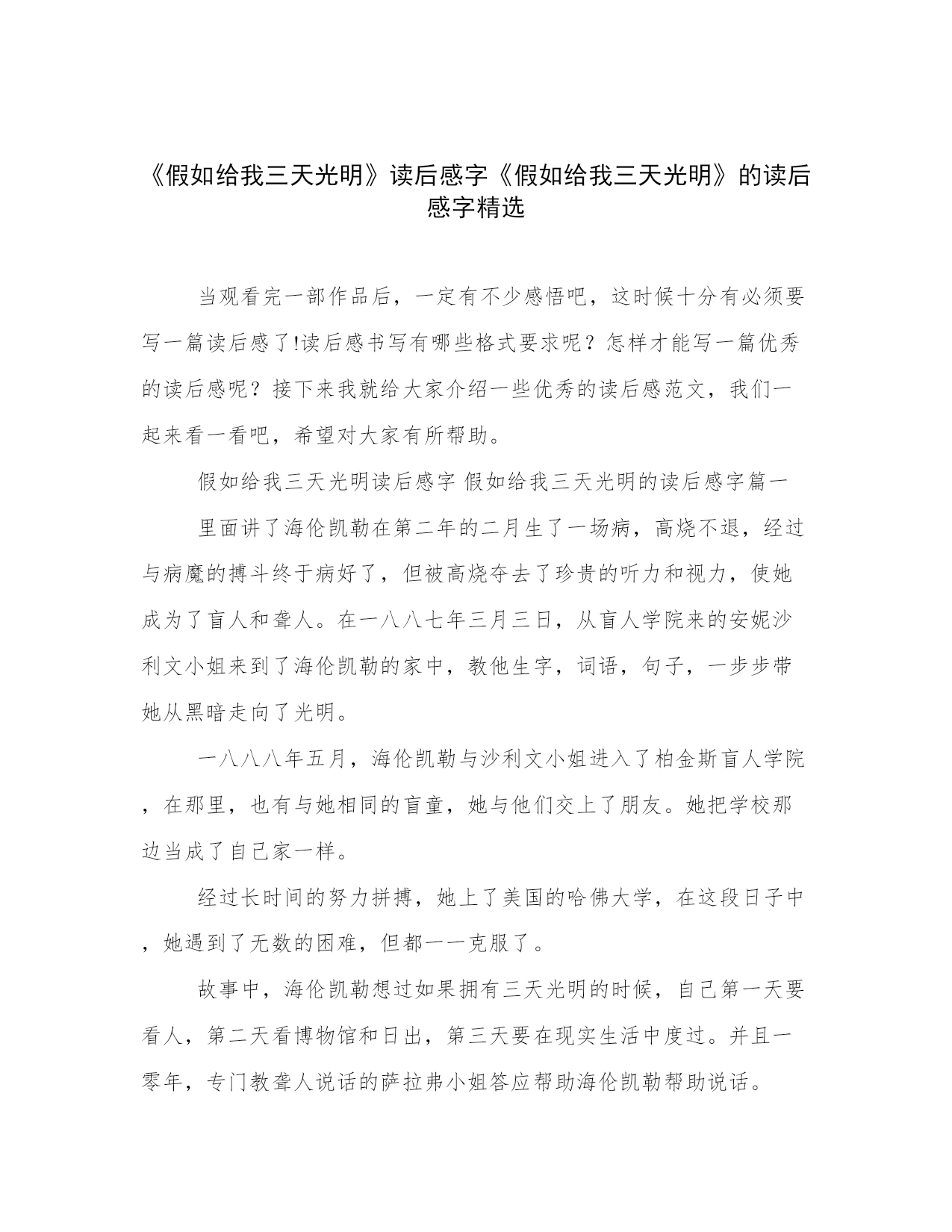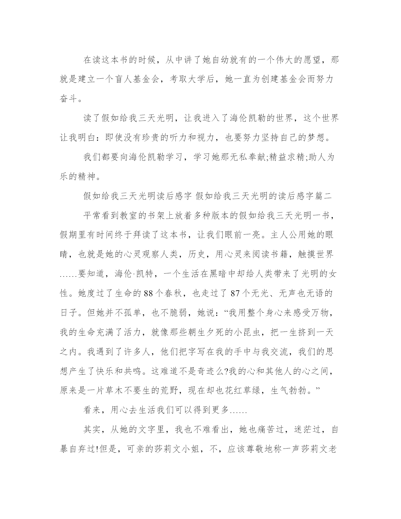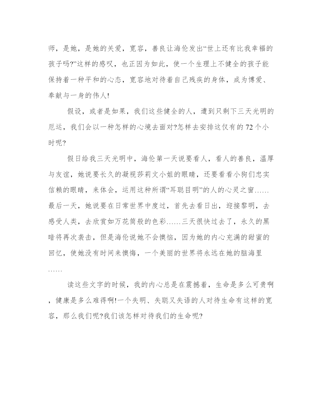 《假如给我三天光明》读后感字《假如给我三天光明》的读后感字精选当观看完一部作品后,一定有不少感悟吧,这时候十分有必须要写一篇读后感了!读后感书写有哪些格式要求呢?怎样才能写一篇优秀的读后感呢?接下来我就给大家介绍一些优秀的读后感范文,我们一起来看一看吧,希望对大家有所帮助。假如给我三天光明读后感字假如给我三天光明的读后感字篇一里面讲了海伦凯勒在第二年的二月生了一场病,高烧不退,经过与病魔的搏斗终于病好了,但被高烧夺去了珍贵的听力和视力,使她成为了盲人和聋人。在一八八七年三月三日,从盲人学院来的安妮沙利文小姐来到了海伦凯勒的家中,教他生字,词语,句子,一步步带她从黑暗走向了光明。一八八八年五月,海伦凯勒与沙利文小姐进入了柏金斯盲人学院,在那里,也有与她相同的盲童,她与他们交上了朋友。她把学校那边当成了自己家一样。经过长时间的努力拼搏,她上了美国的哈佛大学,在这段日子中,她遇到了无数的困难,但都一一克服了。故事中,海伦凯勒想过如果拥有三天光明的时候,自己第一天要看人,第二天看博物馆和日出,第三天要在现实生活中度过。并且一零年,专门教聋人说话的萨拉弗小姐答应帮助海伦凯勒帮助说话。在读这本书的时候,从中讲了她自幼就有的一个伟大的愿望,那就是建立一个盲人基金会,考取大学后,她一直为创建基金会而努力奋斗。读了假如给我三天光明,让我进入了海伦凯勒的世界,这个世界让我明白:即使没有珍贵的听力和视力,也要努力坚持自己的梦想。我们都要向海伦凯勒学习,学习她那无私奉献;精益求精;助人为乐的精神。假如给我三天光明读后感字假如给我三天光明的读后感字篇二平常看到教室的书架上放着多种版本的假如给我三天光明一书,假期里有时间终于拜读了这本书,让我们眼前一亮。主人公用她的眼睛,也就是她的心灵观察人类,历史,用心灵来阅读书籍,触摸世界……要知道,海伦·凯特,一个生活在黑暗中却给人类带来了光明的女性。她度过了生命的88个春秋,也走过了87个无光、无声也无语的日子。但她并不孤单,也不脆弱,她说:“我用整个身心来感受万物,我的生命充满了活力,就像那些朝生夕死的小昆虫,把一生挤到一天之内。我遇到了许多人,他们把字写在我的手中与我交流,我们的思想产生了快乐和共鸣。这难道不是奇迹么?我的心和其他人的心之间,原来是一片草木不要生的荒野,现在却也花红草绿,生气勃勃。”看来,用心去生活我们可以得到更多……其实,从她的文字里,我也不难看出,她也痛苦过,迷茫过,自暴自弃过!但是,可亲的莎莉文小姐,不,应该尊敬地称一声莎莉文老师,是她,是她的关爱,宽容,善良让海伦发出“世上还有比我幸福的孩子吗?”这样的感叹,也正因为如此,使一个生理上不健全的孩子能保持着一种平和的心态,宽容地对待着自己残疾的身体,成为博爱、奉献与一身的伟人!假设,或者是如果,我们这些健全的人,遭到只剩下三天光明的厄运,我们会以一种怎样的心境去面对?怎样去安排这仅有的72个小时呢?假日给我三天光明中,海伦第一天说要看人,看人的善良,温厚与友谊,她说要长久的凝视莎莉文小姐的眼睛,还要看看小狗们忠实信赖的眼睛,来体会,运用这种所谓“耳聪目明”的人的心灵之窗……最后一天,她说要在日常世界中度过,首先去看日出,迎接黎明,去感受人类,去欣赏如万花筒般的色彩……三天很快过去了,永久的黑暗将再次袭击,但是海伦说她不会懊恼,因为她的内心充满的甜蜜的回忆,使她没有时间来懊悔,一个美丽的世界将永远在她的脑海里……读这些文字的时候,我的内心总是在震撼着,生命是多么可贵啊,健康是多么难得啊!一个失明、失聪又失语的人对待生命有这样的宽容,那么我们呢?我们该怎样对待我们的生命呢?