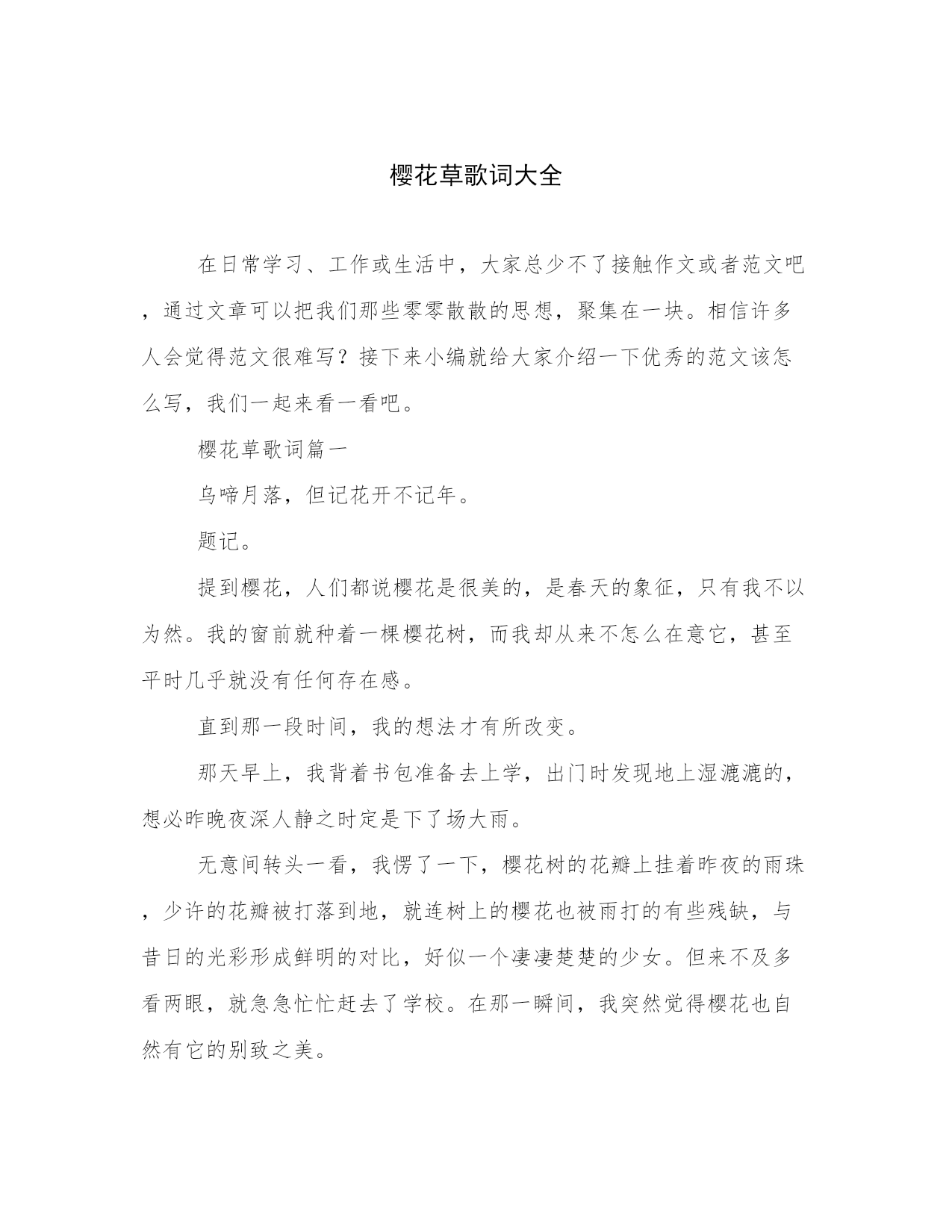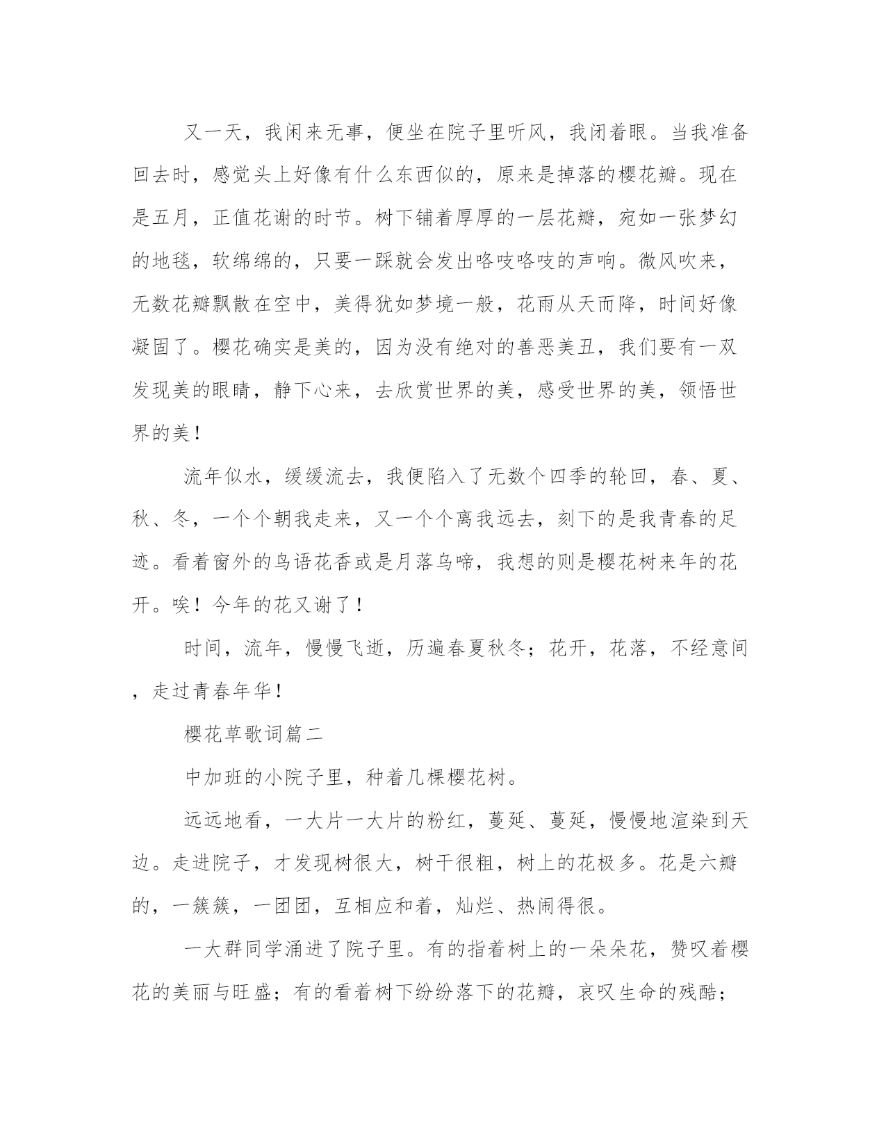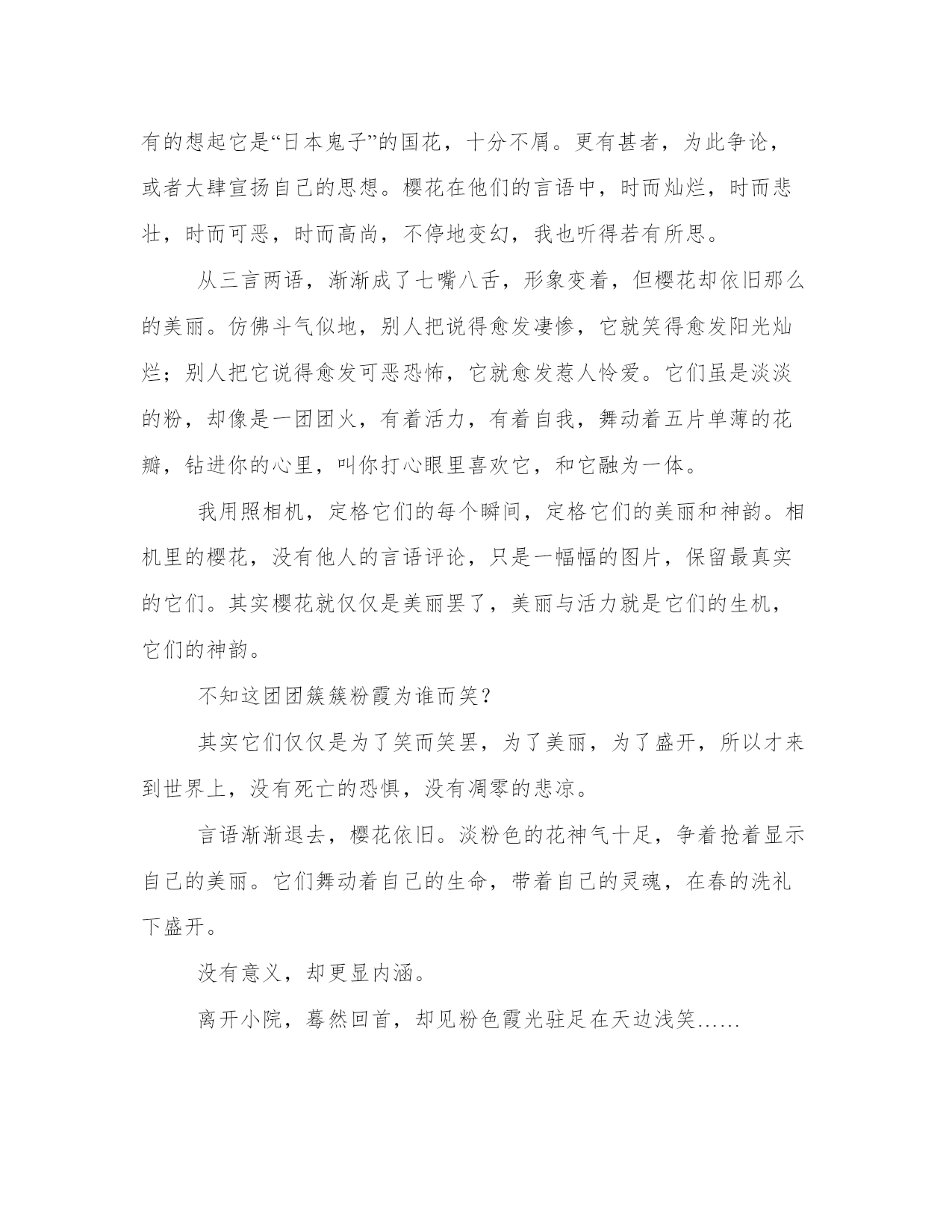 樱花草歌词大全在日常学习、工作或生活中,大家总少不了接触作文或者范文吧,通过文章可以把我们那些零零散散的思想,聚集在一块。相信许多人会觉得范文很难写?接下来小编就给大家介绍一下优秀的范文该怎么写,我们一起来看一看吧。樱花草歌词篇一乌啼月落,但记花开不记年。题记。提到樱花,人们都说樱花是很美的,是春天的象征,只有我不以为然。我的窗前就种着一棵樱花树,而我却从来不怎么在意它,甚至平时几乎就没有任何存在感。直到那一段时间,我的想法才有所改变。那天早上,我背着书包准备去上学,出门时发现地上湿漉漉的,想必昨晚夜深人静之时定是下了场大雨。无意间转头一看,我愣了一下,樱花树的花瓣上挂着昨夜的雨珠,少许的花瓣被打落到地,就连树上的樱花也被雨打的有些残缺,与昔日的光彩形成鲜明的对比,好似一个凄凄楚楚的少女。但来不及多看两眼,就急急忙忙赶去了学校。在那一瞬间,我突然觉得樱花也自然有它的别致之美。又一天,我闲来无事,便坐在院子里听风,我闭着眼。当我准备回去时,感觉头上好像有什么东西似的,原来是掉落的樱花瓣。现在是五月,正值花谢的时节。树下铺着厚厚的一层花瓣,宛如一张梦幻的地毯,软绵绵的,只要一踩就会发出咯吱咯吱的声响。微风吹来,无数花瓣飘散在空中,美得犹如梦境一般,花雨从天而降,时间好像凝固了。樱花确实是美的,因为没有绝对的善恶美丑,我们要有一双发现美的眼睛,静下心来,去欣赏世界的美,感受世界的美,领悟世界的美!流年似水,缓缓流去,我便陷入了无数个四季的轮回,春、夏、秋、冬,一个个朝我走来,又一个个离我远去,刻下的是我青春的足迹。看着窗外的鸟语花香或是月落乌啼,我想的则是樱花树来年的花开。唉!今年的花又谢了!时间,流年,慢慢飞逝,历遍春夏秋冬;花开,花落,不经意间,走过青春年华!樱花草歌词篇二中加班的小院子里,种着几棵樱花树。远远地看,一大片一大片的粉红,蔓延、蔓延,慢慢地渲染到天边。走进院子,才发现树很大,树干很粗,树上的花极多。花是六瓣的,一簇簇,一团团,互相应和着,灿烂、热闹得很。一大群同学涌进了院子里。有的指着树上的一朵朵花,赞叹着樱花的美丽与旺盛;有的看着树下纷纷落下的花瓣,哀叹生命的残酷;有的想起它是“日本鬼子”的国花,十分不屑。更有甚者,为此争论,或者大肆宣扬自己的思想。樱花在他们的言语中,时而灿烂,时而悲壮,时而可恶,时而高尚,不停地变幻,我也听得若有所思。从三言两语,渐渐成了七嘴八舌,形象变着,但樱花却依旧那么的美丽。仿佛斗气似地,别人把说得愈发凄惨,它就笑得愈发阳光灿烂;别人把它说得愈发可恶恐怖,它就愈发惹人怜爱。它们虽是淡淡的粉,却像是一团团火,有着活力,有着自我,舞动着五片单薄的花瓣,钻进你的心里,叫你打心眼里喜欢它,和它融为一体。我用照相机,定格它们的每个瞬间,定格它们的美丽和神韵。相机里的樱花,没有他人的言语评论,只是一幅幅的图片,保留最真实的它们。其实樱花就仅仅是美丽罢了,美丽与活力就是它们的生机,它们的神韵。不知这团团簇簇粉霞为谁而笑?其实它们仅仅是为了笑而笑罢,为了美丽,为了盛开,所以才来到世界上,没有死亡的恐惧,没有凋零的悲凉。言语渐渐退去,樱花依旧。淡粉色的花神气十足,争着抢着显示自己的美丽。它们舞动着自己的生命,带着自己的灵魂,在春的洗礼下盛开。没有意义,却更显内涵。离开小院,蓦然回首,却见粉色霞光驻足在天边浅笑……