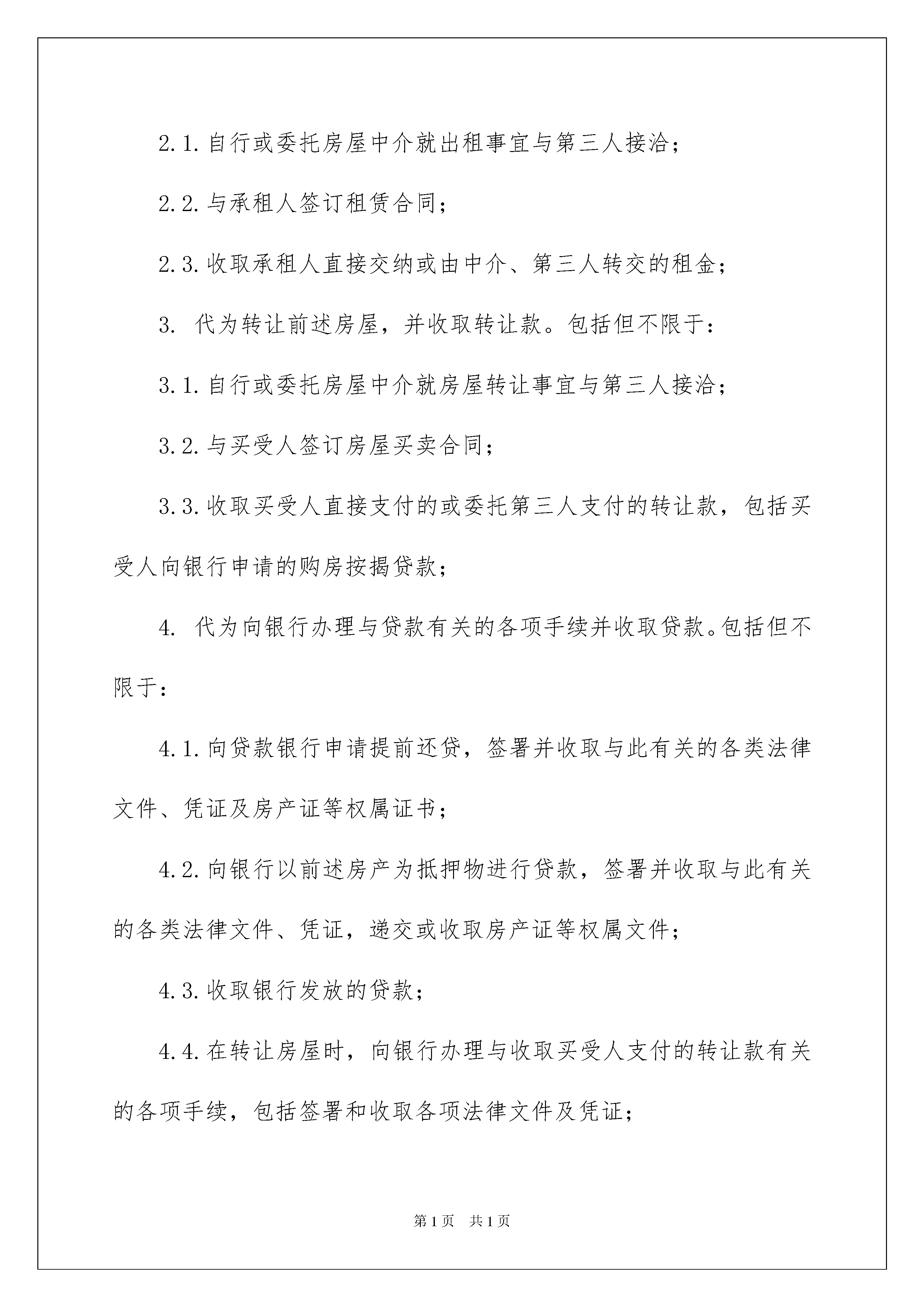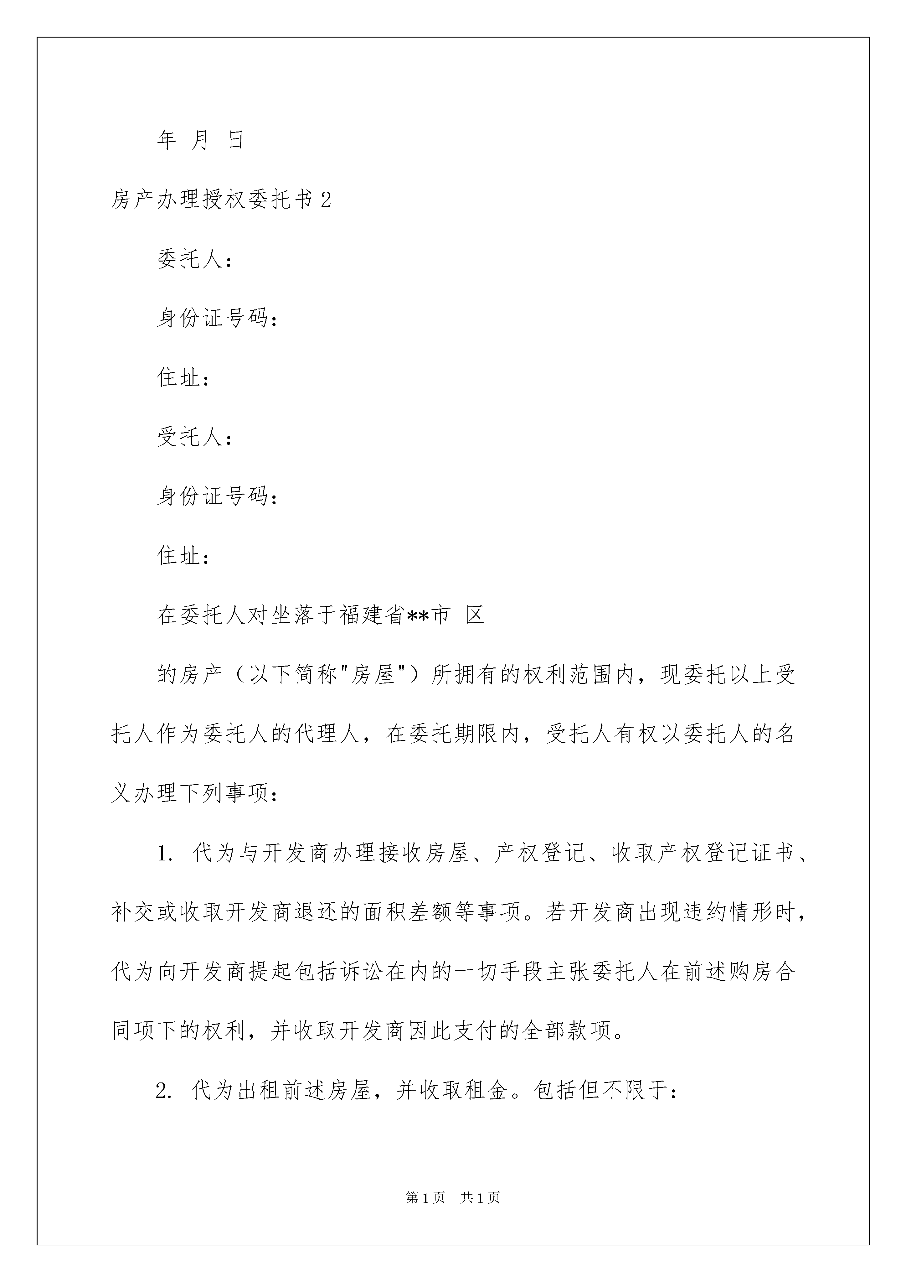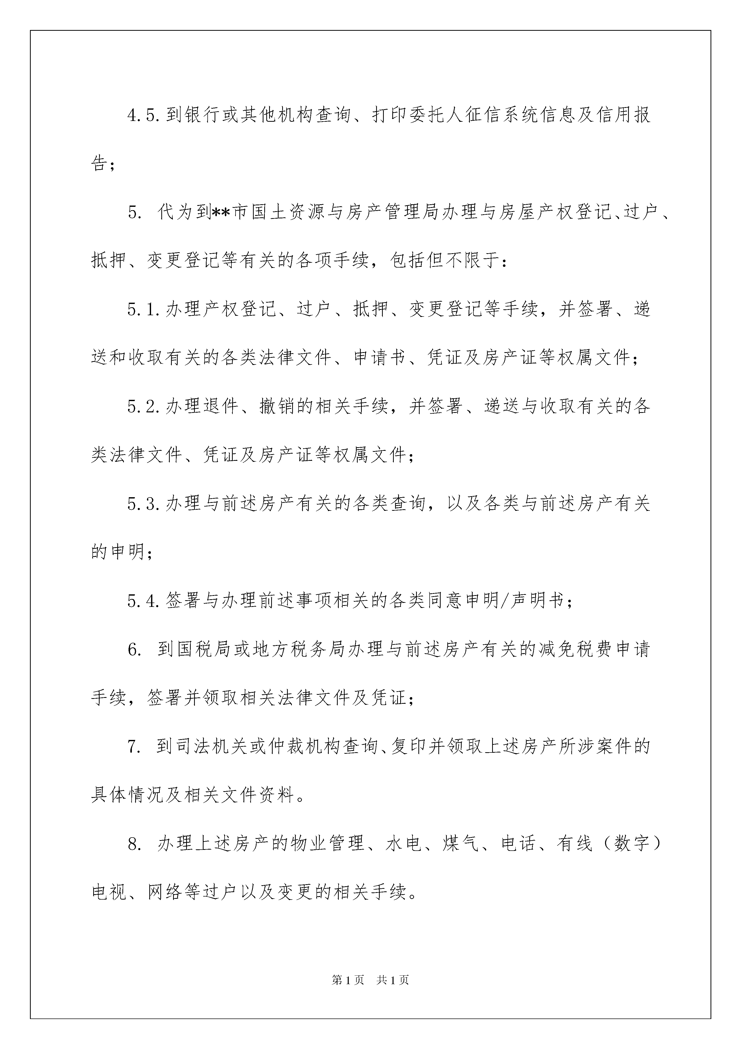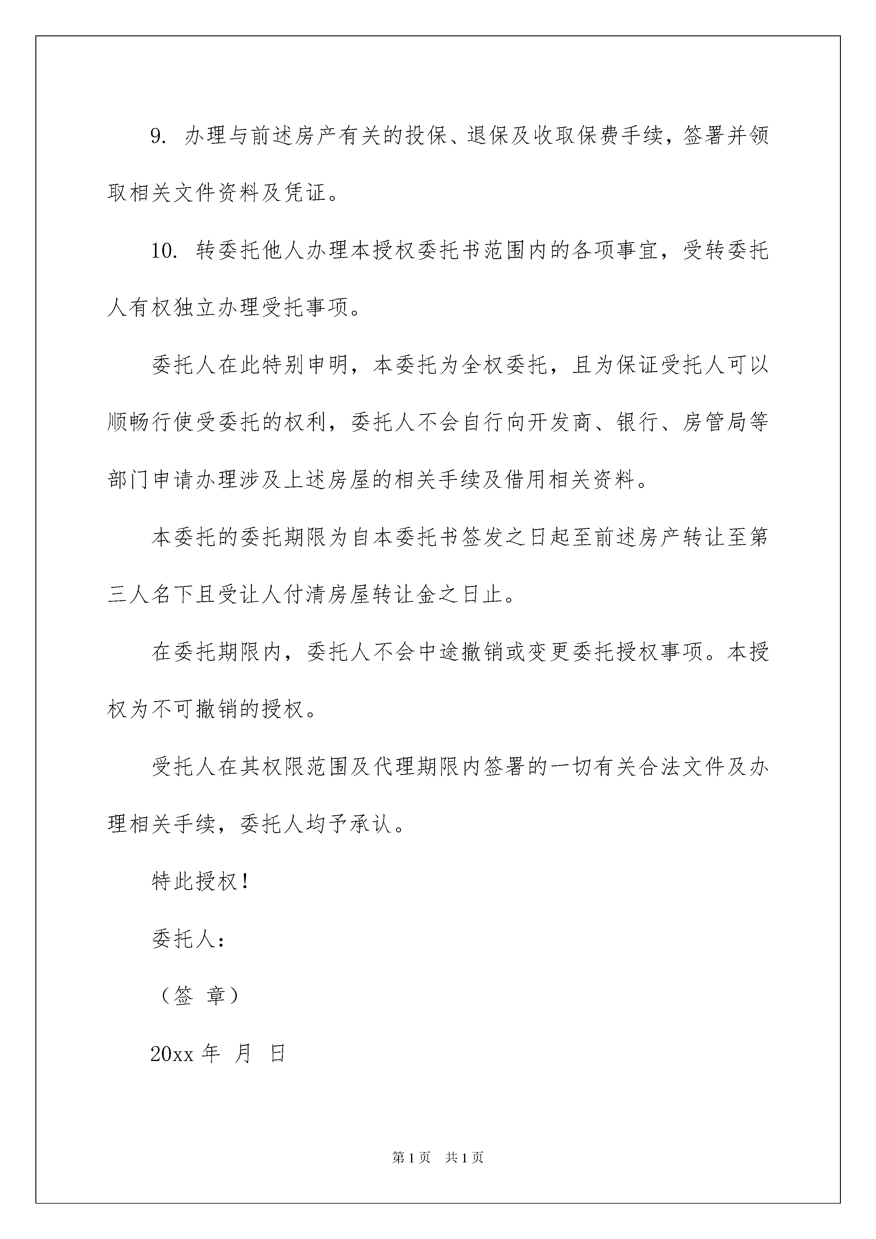 2022房产办理授权委托书房产办理授权委托书委托他人代表自己行使自己的合法权益,被委托人在行使权力时需出具委托人的法律文书叫委托书。在充满活力,日益开放的今天,用到委托书的事务越来越多,委托书的注意事项有许多,你确定会写吗?下面是我整理的房产办理授权委托书,欢迎阅读与收藏。房产办理授权委托书1委托人:受托人:我公司以工程款抵顶XXX公司开发建设的小区,号单元层号房屋,公司决定将该房屋所有权转移给,现委托前往贵单位办理该房的《商品房买卖合同》手续。因该房产转移产生的一切责任纠纷和相关法律连带责任,由我公司全权承担,贵公司不承担任何责任。后附:购房人身份证复印件壹份。委托人(签字):受托人或单位(盖章、签字):年月日房产办理授权委托书2委托人:身份证号码:住址:受托人:身份证号码:住址:在委托人对坐落于福建省**市区的房产(以下简称"房屋")所拥有的权利范围内,现委托以上受托人作为委托人的代理人,在委托期限内,受托人有权以委托人的名义办理下列事项:1.代为与开发商办理接收房屋、产权登记、收取产权登记证书、补交或收取开发商退还的面积差额等事项。若开发商出现违约情形时,代为向开发商提起包括诉讼在内的一切手段主张委托人在前述购房合同项下的权利,并收取开发商因此支付的全部款项。2.代为出租前述房屋,并收取租金。包括但不限于:2.1.自行或委托房屋中介就出租事宜与第三人接洽;2.2.与承租人签订租赁合同;2.3.收取承租人直接交纳或由中介、第三人转交的租金;3.代为转让前述房屋,并收取转让款。包括但不限于:3.1.自行或委托房屋中介就房屋转让事宜与第三人接洽;3.2.与买受人签订房屋买卖合同;3.3.收取买受人直接支付的或委托第三人支付的转让款,包括买受人向银行申请的购房按揭贷款;4.代为向银行办理与贷款有关的各项手续并收取贷款。包括但不限于:4.1.向贷款银行申请提前还贷,签署并收取与此有关的各类法律文件、凭证及房产证等权属证书;4.2.向银行以前述房产为抵押物进行贷款,签署并收取与此有关的各类法律文件、凭证,递交或收取房产证等权属文件;4.3.收取银行发放的贷款;4.4.在转让房屋时,向银行办理与收取买受人支付的转让款有关的各项手续,包括签署和收取各项法律文件及凭证;4.5.到银行或其他机构查询、打印委托人征信系统信息及信用报告;5.代为到**市国土资源与房产管理局办理与房屋产权登记、过户、抵押、变更登记等有关的各项手续,包括但不限于:5.1.办理产权登记、过户、抵押、变更登记等手续,并签署、递送和收取有关的各类法律文件、申请书、凭证及房产证等权属文件;5.2.办理退件、撤销的相关手续,并签署、递送与收取有关的各类法律文件、凭证及房产证等权属文件;5.3.办理与前述房产有关的各类查询,以及各类与前述房产有关的申明;5.4.签署与办理前述事项相关的各类同意申明/声明书;6.到国税局或地方税务局办理与前述房产有关的减免税费申请手续,签署并领取相关法律文件及凭证;7.到司法机关或仲裁机构查询、复印并领取上述房产所涉案件的具体情况及相关文件资料。8.办理上述房产的物业管理、水电、煤气、电话、有线(数字)电视、网络等过户以及变更的相关手续。9.办理与前述房产有关的投保、退保及收取保费手续,签署并领取相关文件资料及凭证。10.转委托他人办理本授权委托书范围内的各项事宜,受转委托人有权独立办理受托事项。委托人在此特别申明,本委托为全权委托,且为保证受托人可以顺畅行使受委托的权利,委托人不会自行向开发商、银行、房管局等部门申请办理涉及上述房屋的相关手续及借用相关资料。本委托的委托期限为自本委托书签发之日起至前述房产转让至第三人名下且受让人付清房屋转让金之日止。在委托期限内,委托人不会中途撤销或变更委托授权事项。本授权为不可撤销的授权。受托人在其权限范围及代理期限内签署的一切有关合法文件及办理相关手续,委托人均予承认。特此授权!委托人:(签章)20xx年月日房产办理授权委托书3身份证号码:住址:受托人:身份证号码:住址:在委托人对坐落于福建省**市区的房产(以下简称“房屋”)所拥有的权利范围内,现委托以上受托人作为委托人的代理人,在委托期限内,受托人有权以委托人的名义办理下列事项:代为与开发商办理接收房屋、产权登记、收取产权登记证书、补交或收取开发商退还的面积差额等事项。若开发商出现违约情形时,代为向开发商提起包括诉讼在内的一切手段主张委托人在前述购房合同项下的权利,并收取开发商因此支付的全部款项。代为出租前述房屋,并收取租金。包括但不限于:2.1.自行或委托房屋中介就出租事宜与第三人接洽;2.2.