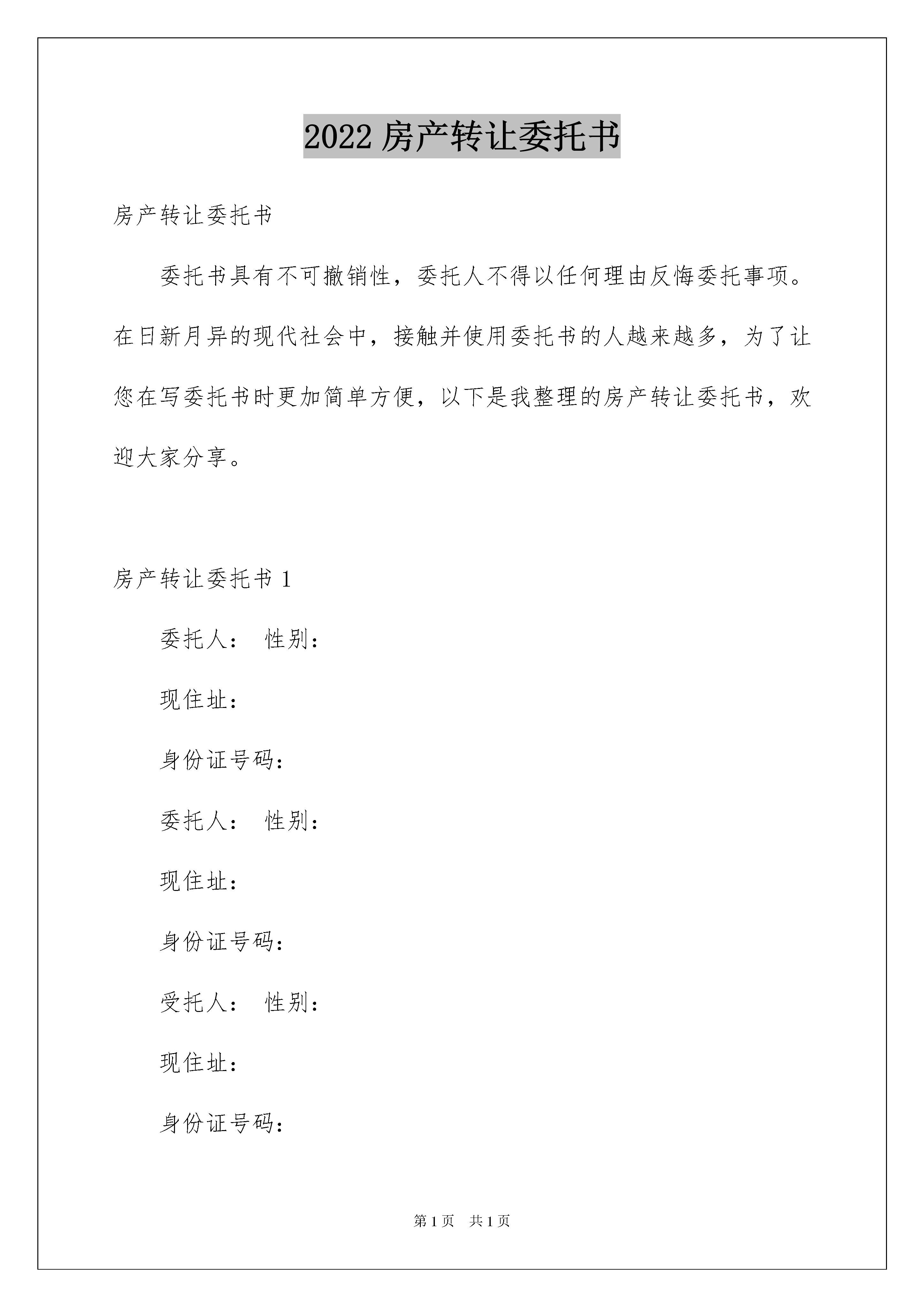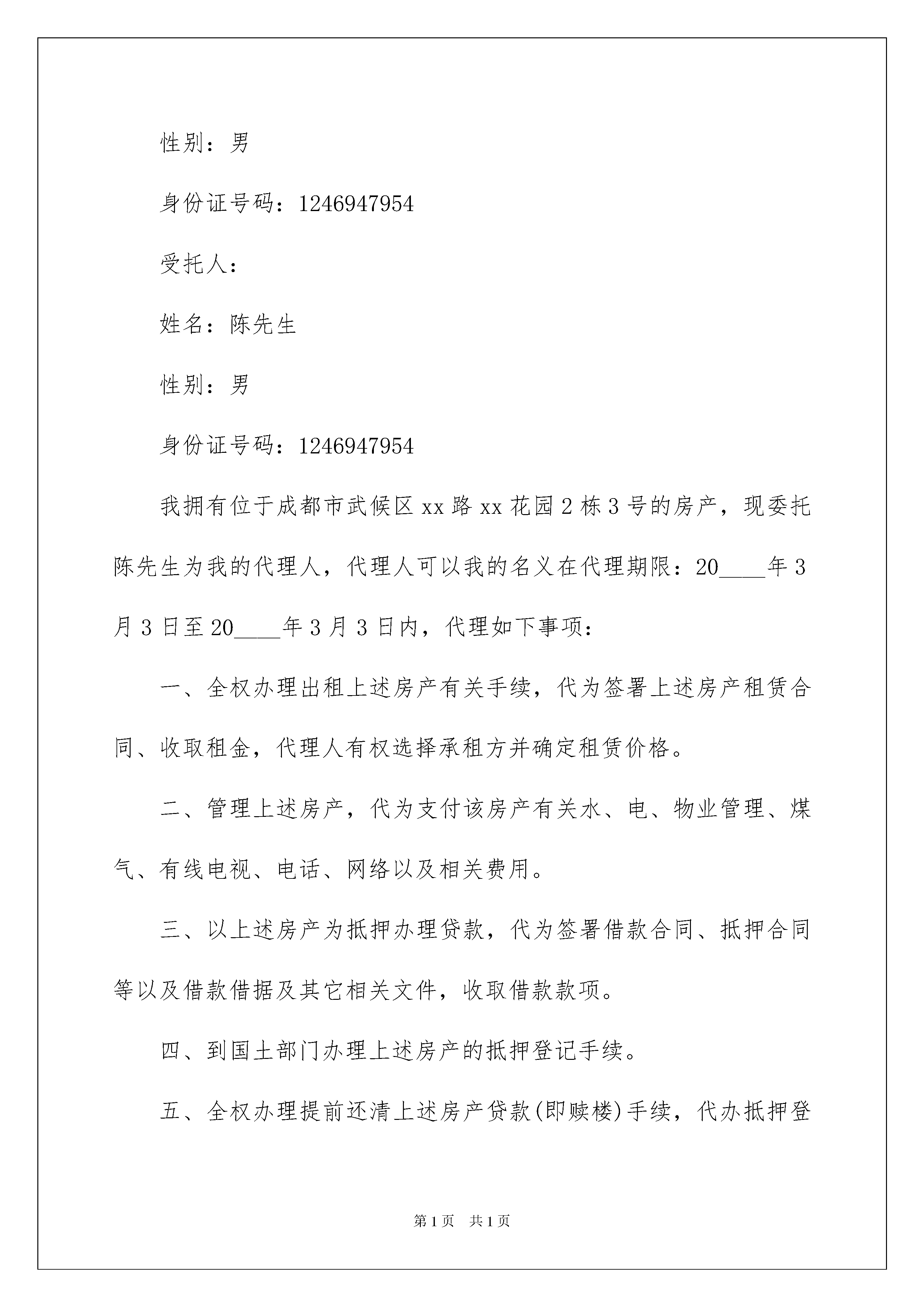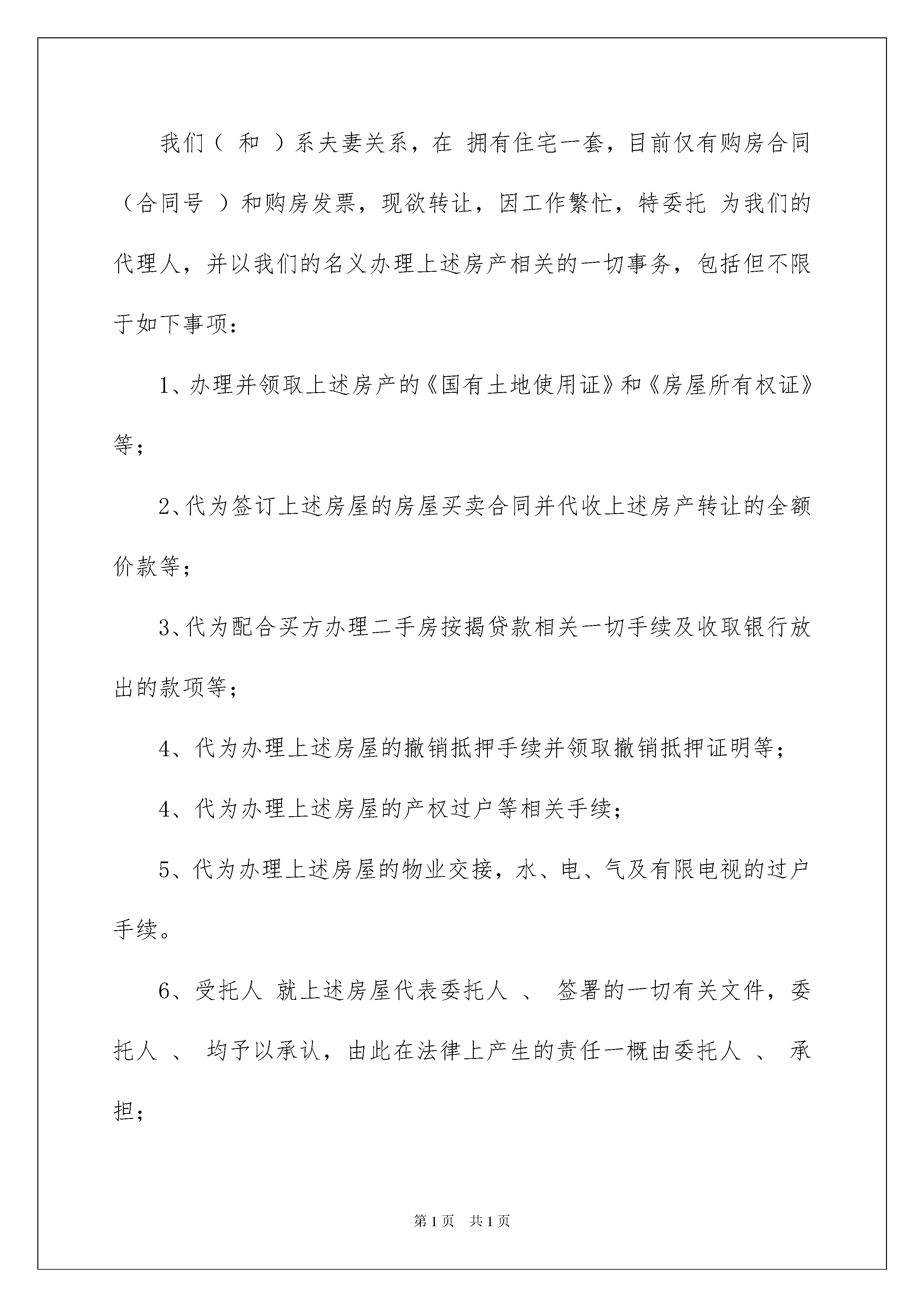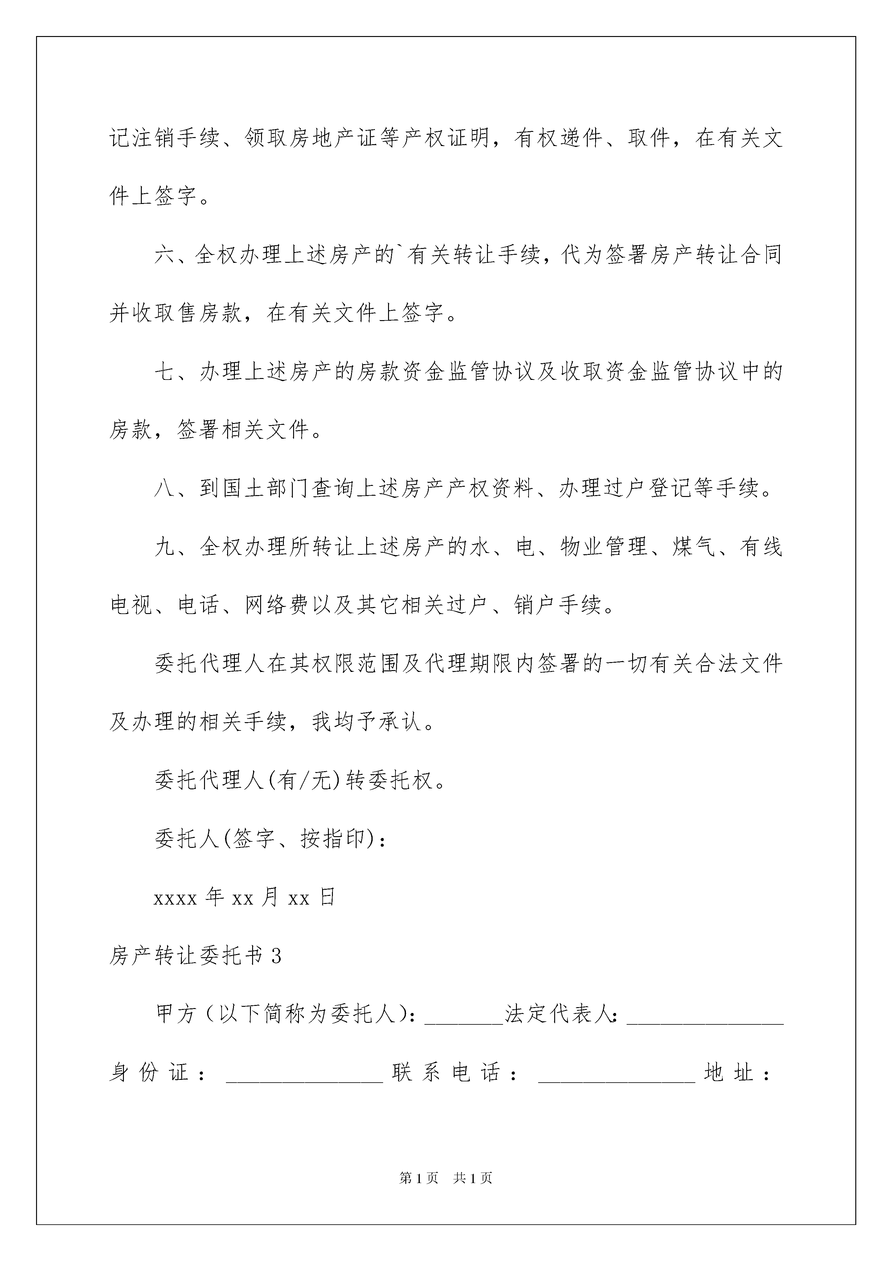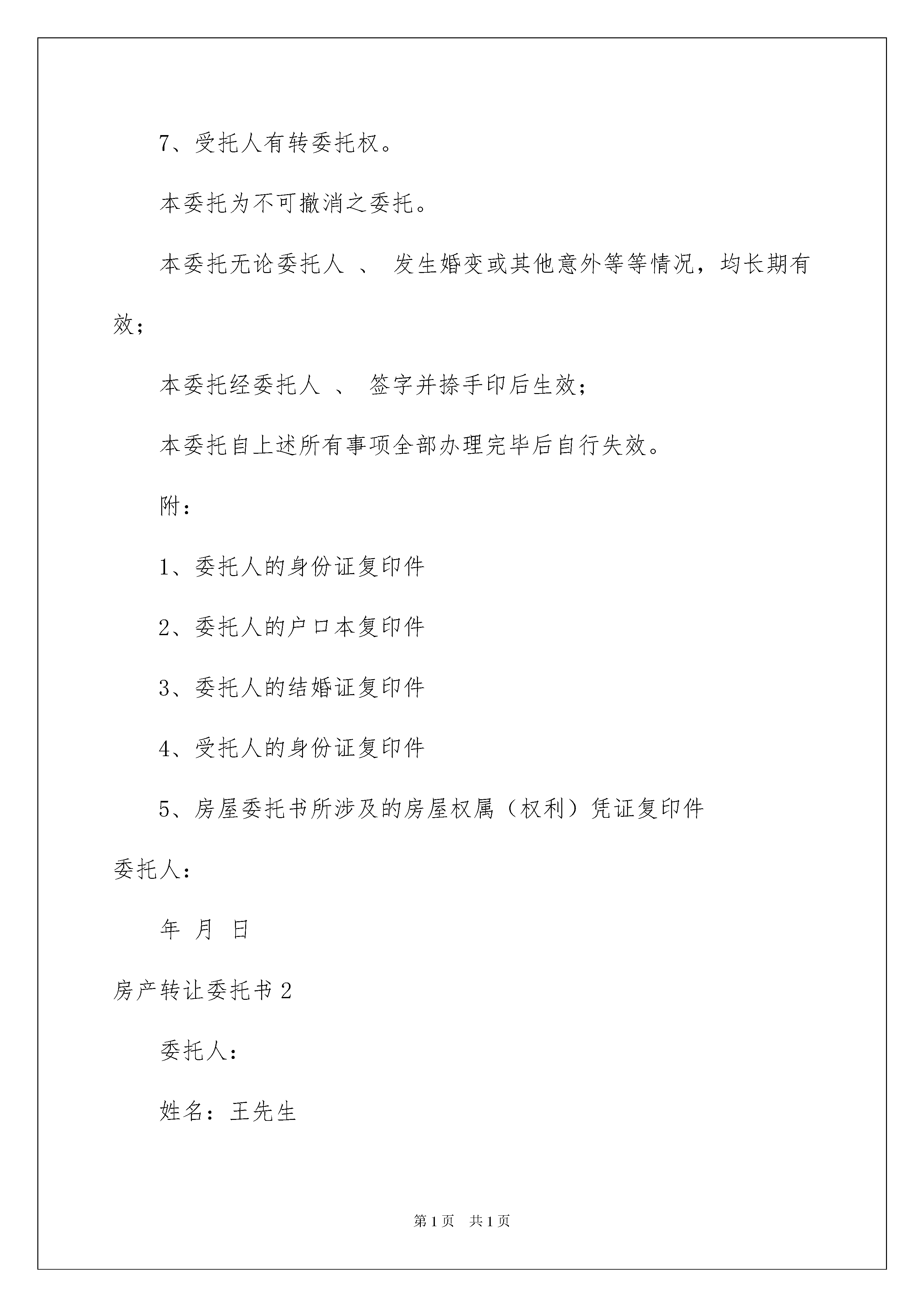 2022房产转让委托书房产转让委托书委托书具有不可撤销性,委托人不得以任何理由反悔委托事项。在日新月异的现代社会中,接触并使用委托书的人越来越多,为了让您在写委托书时更加简单方便,以下是我整理的房产转让委托书,欢迎大家分享。房产转让委托书1委托人:性别:现住址:身份证号码:委托人:性别:现住址:身份证号码:受托人:性别:现住址:身份证号码:我们(和)系夫妻关系,在拥有住宅一套,目前仅有购房合同(合同号)和购房发票,现欲转让,因工作繁忙,特委托为我们的代理人,并以我们的名义办理上述房产相关的一切事务,包括但不限于如下事项:1、办理并领取上述房产的《国有土地使用证》和《房屋所有权证》等;2、代为签订上述房屋的房屋买卖合同并代收上述房产转让的全额价款等;3、代为配合买方办理二手房按揭贷款相关一切手续及收取银行放出的款项等;4、代为办理上述房屋的撤销抵押手续并领取撤销抵押证明等;4、代为办理上述房屋的产权过户等相关手续;5、代为办理上述房屋的物业交接,水、电、气及有限电视的过户手续。6、受托人就上述房屋代表委托人、签署的一切有关文件,委托人、均予以承认,由此在法律上产生的责任一概由委托人、承担;7、受托人有转委托权。本委托为不可撤消之委托。本委托无论委托人、发生婚变或其他意外等等情况,均长期有效;本委托经委托人、签字并捺手印后生效;本委托自上述所有事项全部办理完毕后自行失效。附:1、委托人的身份证复印件2、委托人的户口本复印件3、委托人的结婚证复印件4、受托人的身份证复印件5、房屋委托书所涉及的房屋权属(权利)凭证复印件委托人:年月日房产转让委托书2委托人:姓名:王先生性别:男身份证号码:1246947954受托人:姓名:陈先生性别:男身份证号码:1246947954我拥有位于成都市武候区xx路xx花园2栋3号的房产,现委托陈先生为我的代理人,代理人可以我的名义在代理期限:20____年3月3日至20____年3月3日内,代理如下事项:一、全权办理出租上述房产有关手续,代为签署上述房产租赁合同、收取租金,代理人有权选择承租方并确定租赁价格。二、管理上述房产,代为支付该房产有关水、电、物业管理、煤气、有线电视、电话、网络以及相关费用。三、以上述房产为抵押办理贷款,代为签署借款合同、抵押合同等以及借款借据及其它相关文件,收取借款款项。四、到国土部门办理上述房产的抵押登记手续。五、全权办理提前还清上述房产贷款(即赎楼)手续,代办抵押登记注销手续、领取房地产证等产权证明,有权递件、取件,在有关文件上签字。六、全权办理上述房产的`有关转让手续,代为签署房产转让合同并收取售房款,在有关文件上签字。七、办理上述房产的房款资金监管协议及收取资金监管协议中的房款,签署相关文件。八、到国土部门查询上述房产产权资料、办理过户登记等手续。九、全权办理所转让上述房产的水、电、物业管理、煤气、有线电视、电话、网络费以及其它相关过户、销户手续。委托代理人在其权限范围及代理期限内签署的一切有关合法文件及办理的相关手续,我均予承认。委托代理人(有/无)转委托权。委托人(签字、按指印):xxxx年xx月xx日房产转让委托书3甲方(以下简称为委托人):_______法定代表人:______________身份证:______________联系电话:______________地址:______________乙方(以下简称为受托人):_______法定代表人:______________身份证:______________联系电话:______________地址:______________经甲乙双方本着公平、平等、互利的原则下,双方达成委托销售房产的委托:一、委托销售房产乙方授权委托销售甲方客户全部房产且具有优先销售权。二、甲方的义务因甲方公司业务出现的客户房产,在客户同意前提下统一委托乙方销售,甲方保证提供的客户房产真实可靠,且享有房产的合法完全处分权。三、乙方义务乙方优先寻找提供适合的房产需求信息按照甲方客户规定交易价格方式销售,成功后收取1%(税后)的服务费。四、低价部分约定甲方客户同意前提下,低于市场价格40——50%的房产,乙方保证十天内办理好该房产的销售并且不收取任何费用。本授权书宣告,在下面签字的_______公司董事_______以法定代表人身份合法代表本单位授权:为______________公司的合法代理人,授权代理人在以本单位的名义,并代表本人与客户进行买卖房产磋商、签署合同和处理一切与此事有关的事务。代理人的一切行为均代表本单位,与本人的行为具有同样的法律效力。受托人在上述委托范围内所进