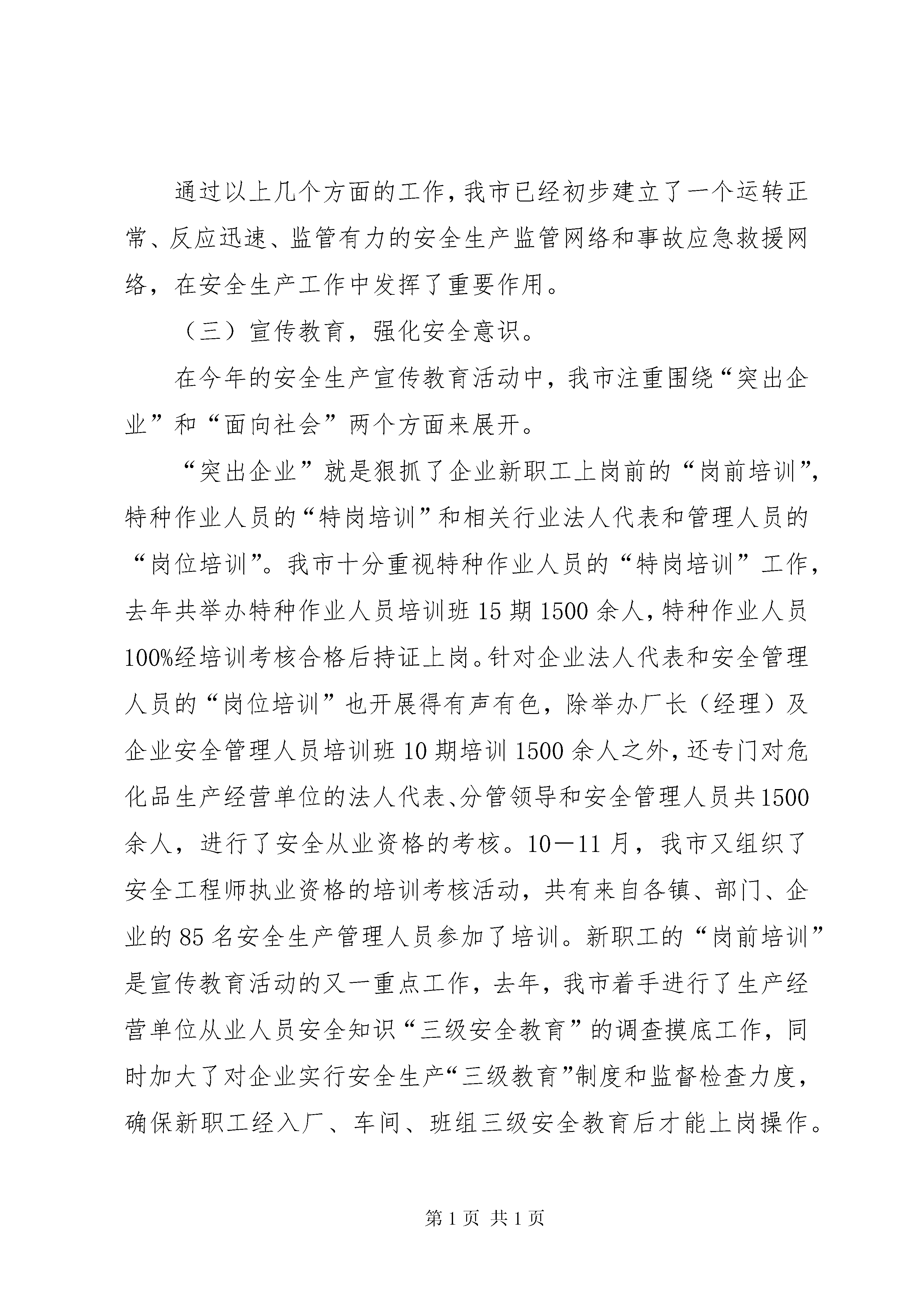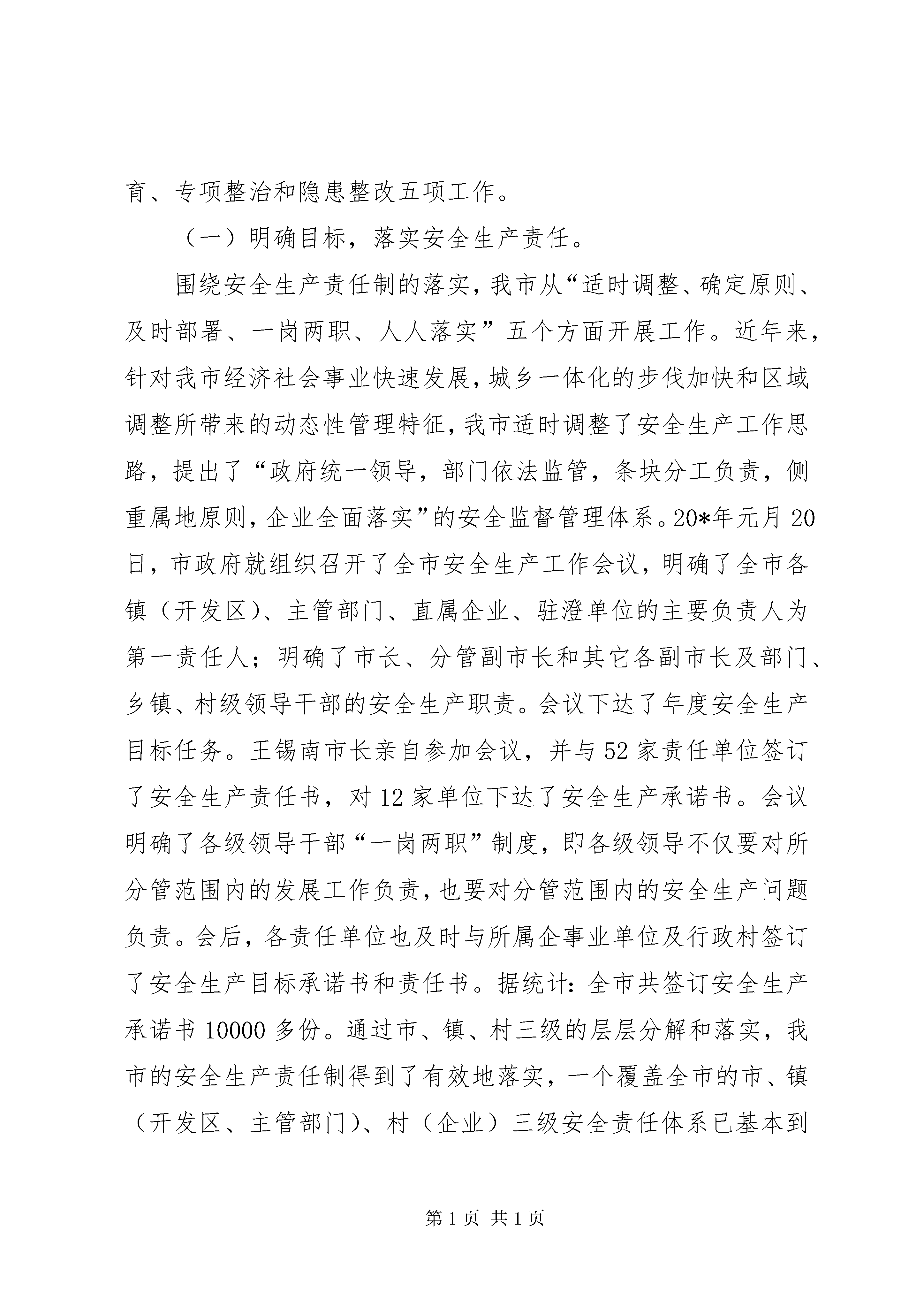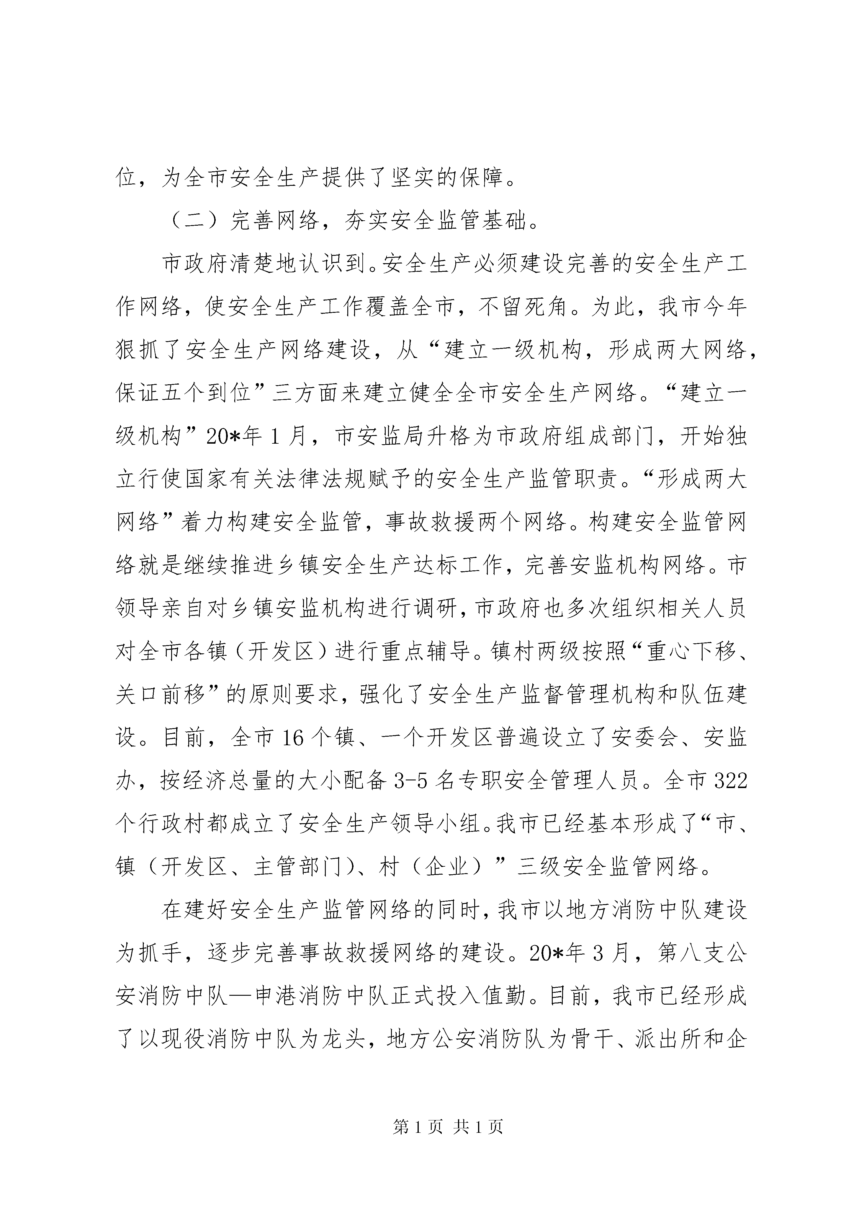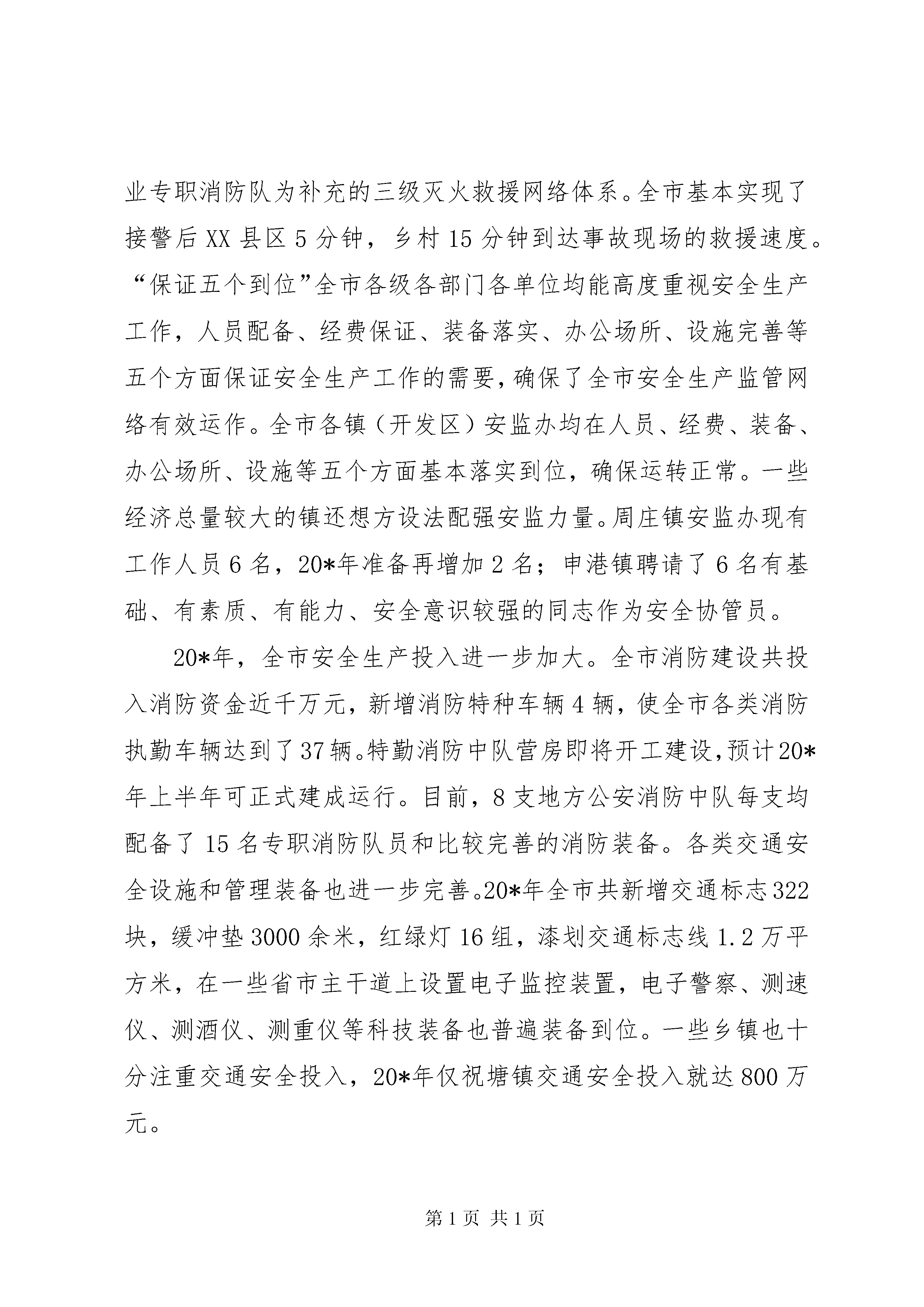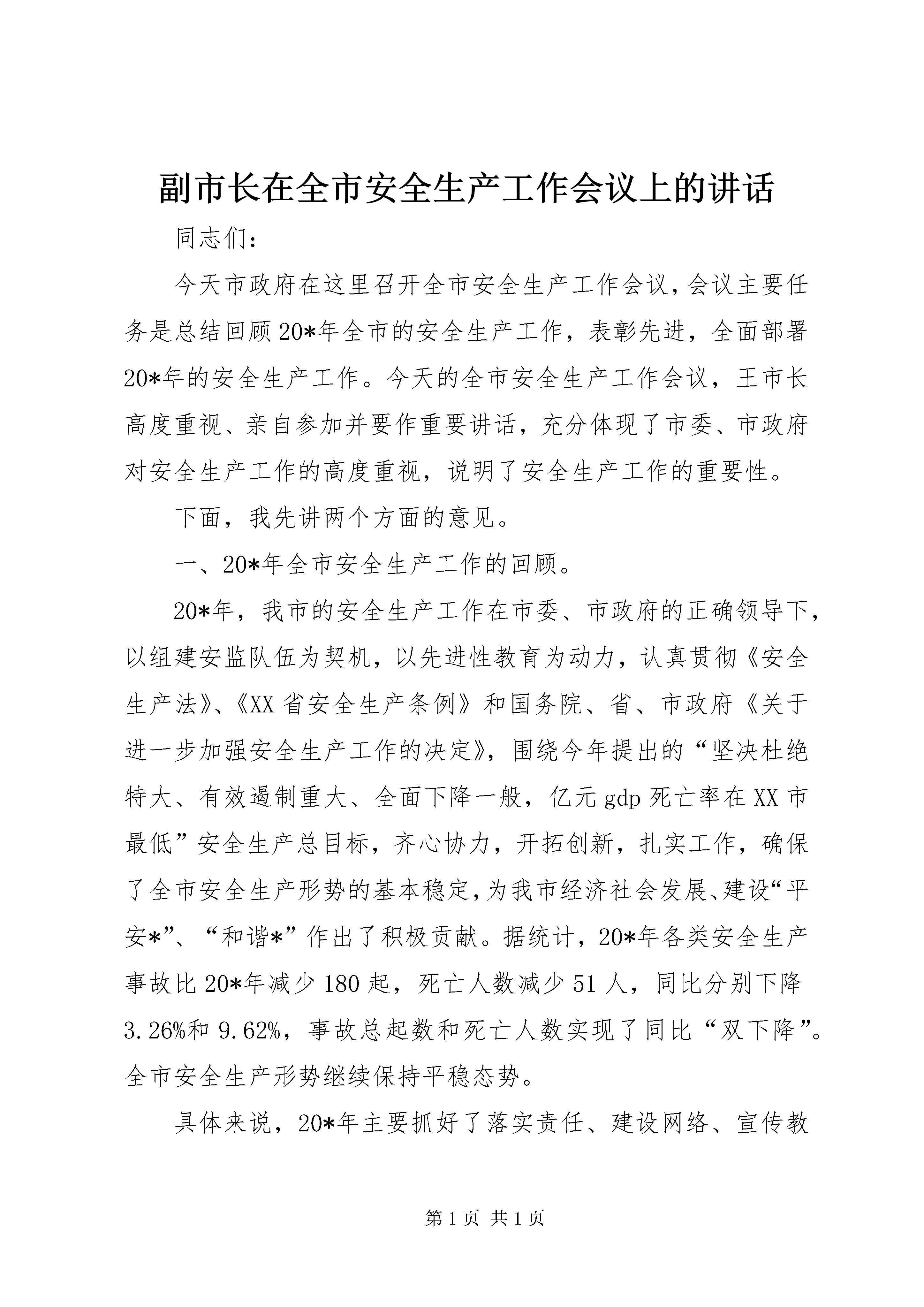 副市长在全市安全生产工作会议上的讲话同志们:今天市政府在这里召开全市安全生产工作会议,会议主要任务是总结回顾20*年全市的安全生产工作,表彰先进,全面部署20*年的安全生产工作。今天的全市安全生产工作会议,王市长高度重视、亲自参加并要作重要讲话,充分体现了市委、市政府对安全生产工作的高度重视,说明了安全生产工作的重要性。下面,我先讲两个方面的意见。一、20*年全市安全生产工作的回顾。20*年,我市的安全生产工作在市委、市政府的正确领导下,以组建安监队伍为契机,以先进性教育为动力,认真贯彻《安全生产法》、《XX省安全生产条例》和国务院、省、市政府《关于进一步加强安全生产工作的决定》,围绕今年提出的“坚决杜绝特大、有效遏制重大、全面下降一般,亿元gdp死亡率在XX市最低”安全生产总目标,齐心协力,开拓创新,扎实工作,确保了全市安全生产形势的基本稳定,为我市经济社会发展、建设“平安*”、“和谐*”作出了积极贡献。据统计,20*年各类安全生产事故比20*年减少180起,死亡人数减少51人,同比分别下降3.26%和9.62%,事故总起数和死亡人数实现了同比“双下降”。全市安全生产形势继续保持平稳态势。具体来说,20*年主要抓好了落实责任、建设网络、宣传教育、专项整治和隐患整改五项工作。(一)明确目标,落实安全生产责任。围绕安全生产责任制的落实,我市从“适时调整、确定原则、及时部署、一岗两职、人人落实”五个方面开展工作。近年来,针对我市经济社会事业快速发展,城乡一体化的步伐加快和区域调整所带来的动态性管理特征,我市适时调整了安全生产工作思路,提出了“政府统一领导,部门依法监管,条块分工负责,侧重属地原则,企业全面落实”的安全监督管理体系。20*年元月20日,市政府就组织召开了全市安全生产工作会议,明确了全市各镇(开发区)、主管部门、直属企业、驻澄单位的主要负责人为第一责任人;明确了市长、分管副市长和其它各副市长及部门、乡镇、村级领导干部的安全生产职责。会议下达了年度安全生产目标任务。王锡南市长亲自参加会议,并与52家责任单位签订了安全生产责任书,对12家单位下达了安全生产承诺书。会议明确了各级领导干部“一岗两职”制度,即各级领导不仅要对所分管范围内的发展工作负责,也要对分管范围内的安全生产问题负责。会后,各责任单位也及时与所属企事业单位及行政村签订了安全生产目标承诺书和责任书。据统计:全市共签订安全生产承诺书10000多份。通过市、镇、村三级的层层分解和落实,我市的安全生产责任制得到了有效地落实,一个覆盖全市的市、镇(开发区、主管部门)、村(企业)三级安全责任体系已基本到位,为全市安全生产提供了坚实的保障。(二)完善网络,夯实安全监管基础。市政府清楚地认识到。安全生产必须建设完善的安全生产工作网络,使安全生产工作覆盖全市,不留死角。为此,我市今年狠抓了安全生产网络建设,从“建立一级机构,形成两大网络,保证五个到位”三方面来建立健全全市安全生产网络。“建立一级机构”20*年1月,市安监局升格为市政府组成部门,开始独立行使国家有关法律法规赋予的安全生产监管职责。“形成两大网络”着力构建安全监管,事故救援两个网络。构建安全监管网络就是继续推进乡镇安全生产达标工作,完善安监机构网络。市领导亲自对乡镇安监机构进行调研,市政府也多次组织相关人员对全市各镇(开发区)进行重点辅导。镇村两级按照“重心下移、关口前移”的原则要求,强化了安全生产监督管理机构和队伍建设。目前,全市16个镇、一个开发区普遍设立了安委会、安监办,按经济总量的大小配备3-5名专职安全管理人员。全市322个行政村都成立了安全生产领导小组。我市已经基本形成了“市、镇(开发区、主管部门)、村(企业)”三级安全监管网络。在建好安全生产监管网络的同时,我市以地方消防中队建设为抓手,逐步完善事故救援网络的建设。20*年3月,第八支公安消防中队—申港消防中队正式投入值勤。目前,我市已经形成了以现役消防中队为龙头,地方公安消防队为骨干、派出所和企业专职消防队为补充的三级灭火救援网络体系。全市基本实现了接警后XX县区5分钟,乡村15分钟到达事故现场的救援速度。“保证五个到位”全市各级各部门各单位均能高度重视安全生产工作,人员配备、经费保证、装备落实、办公场所、设施完善等五个方面保证安全生产工作的需要,确保了全市安全生产监管网络有效运作。全市各镇(开发区)安监办均在人员、经费、装备、办公场所、设施等五个方面基本落实到位,确保运转正常。一些经济总量较大的镇还想方设法配强安监力量。周庄镇安监办现有工作人员6名,20*年准备再增加2名;申港镇聘请了6名有基础、有素质、有能力、安全意识较强的同志作为安全协管员。20*年,全市安全生产投入进一步加大。全市消防建设共投入消防资金近千万元,新