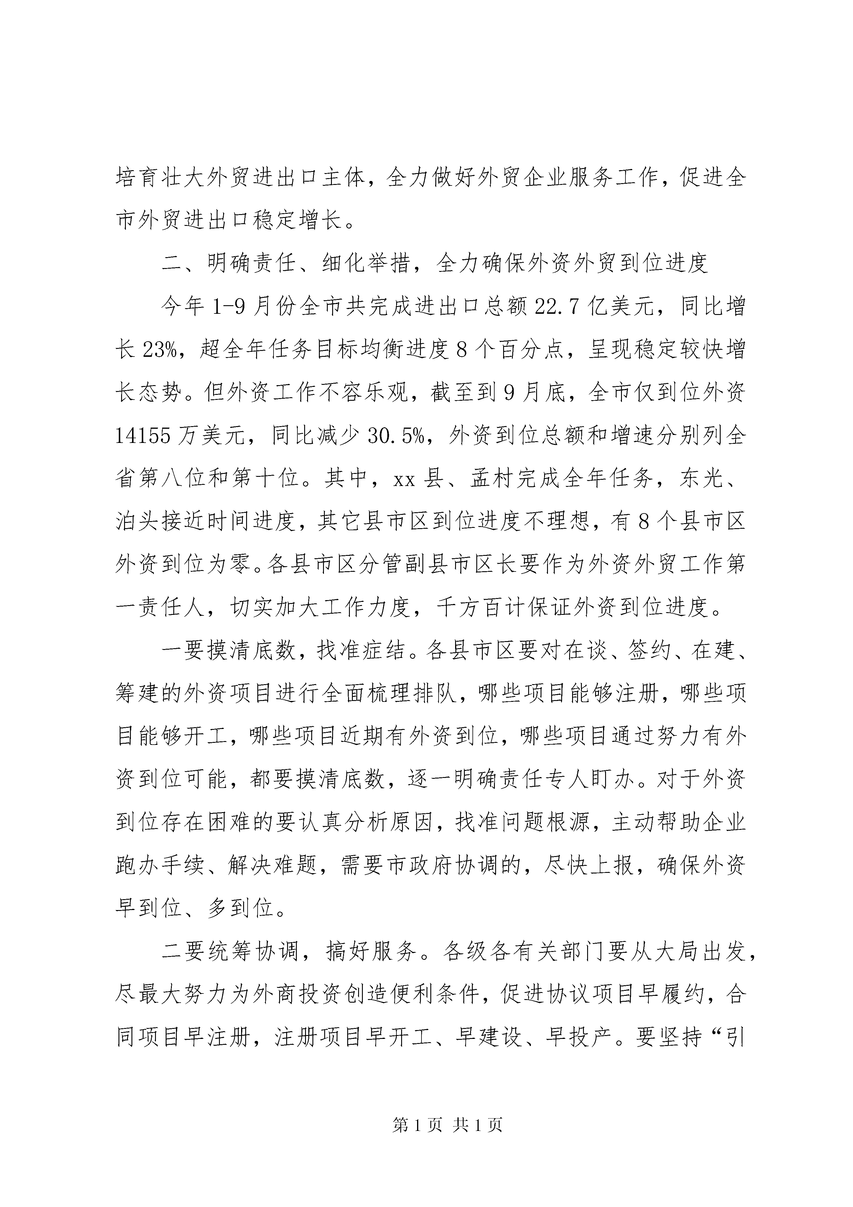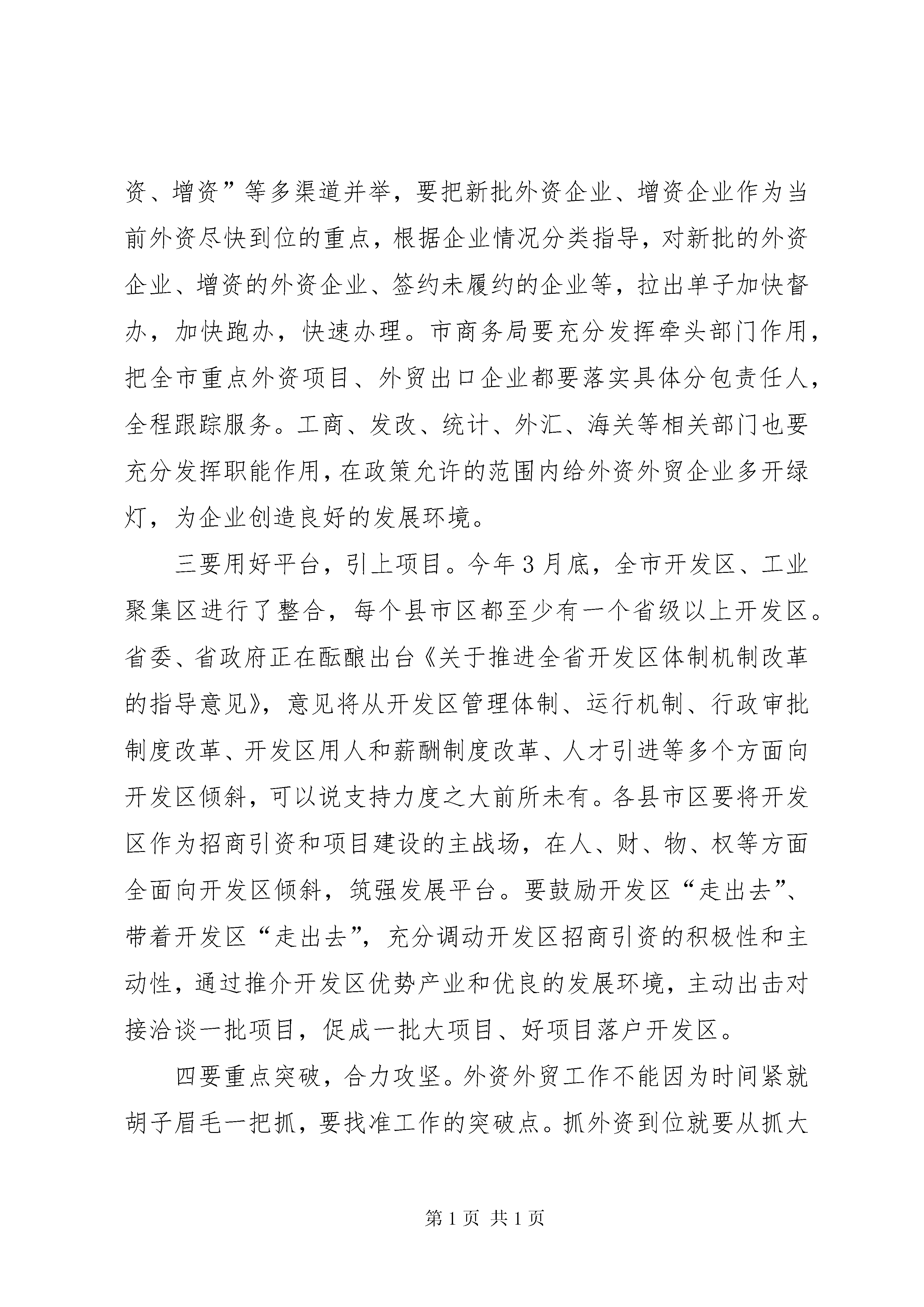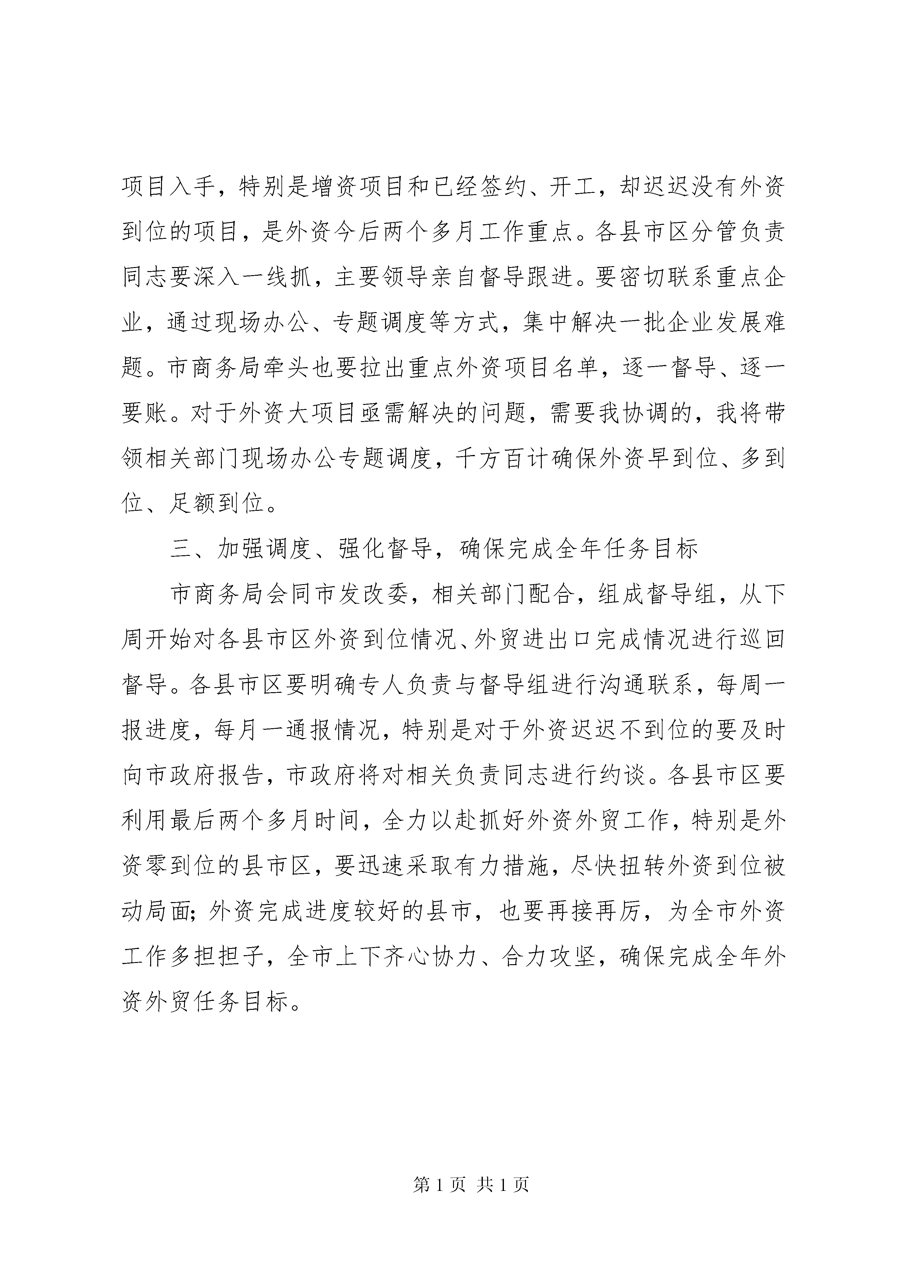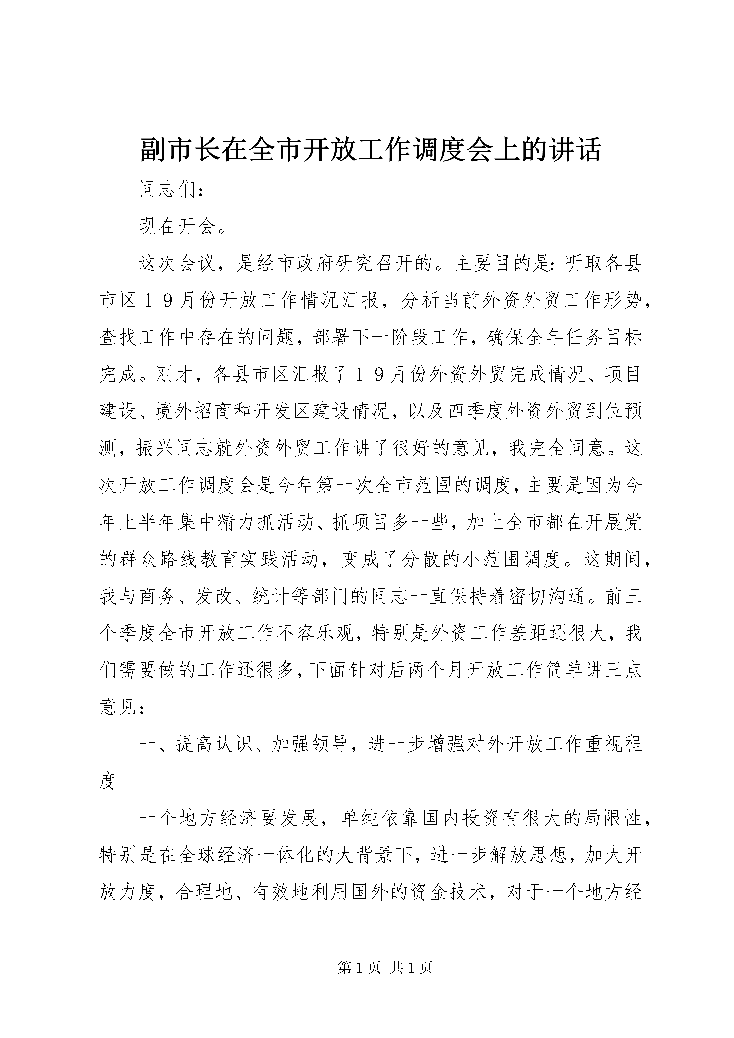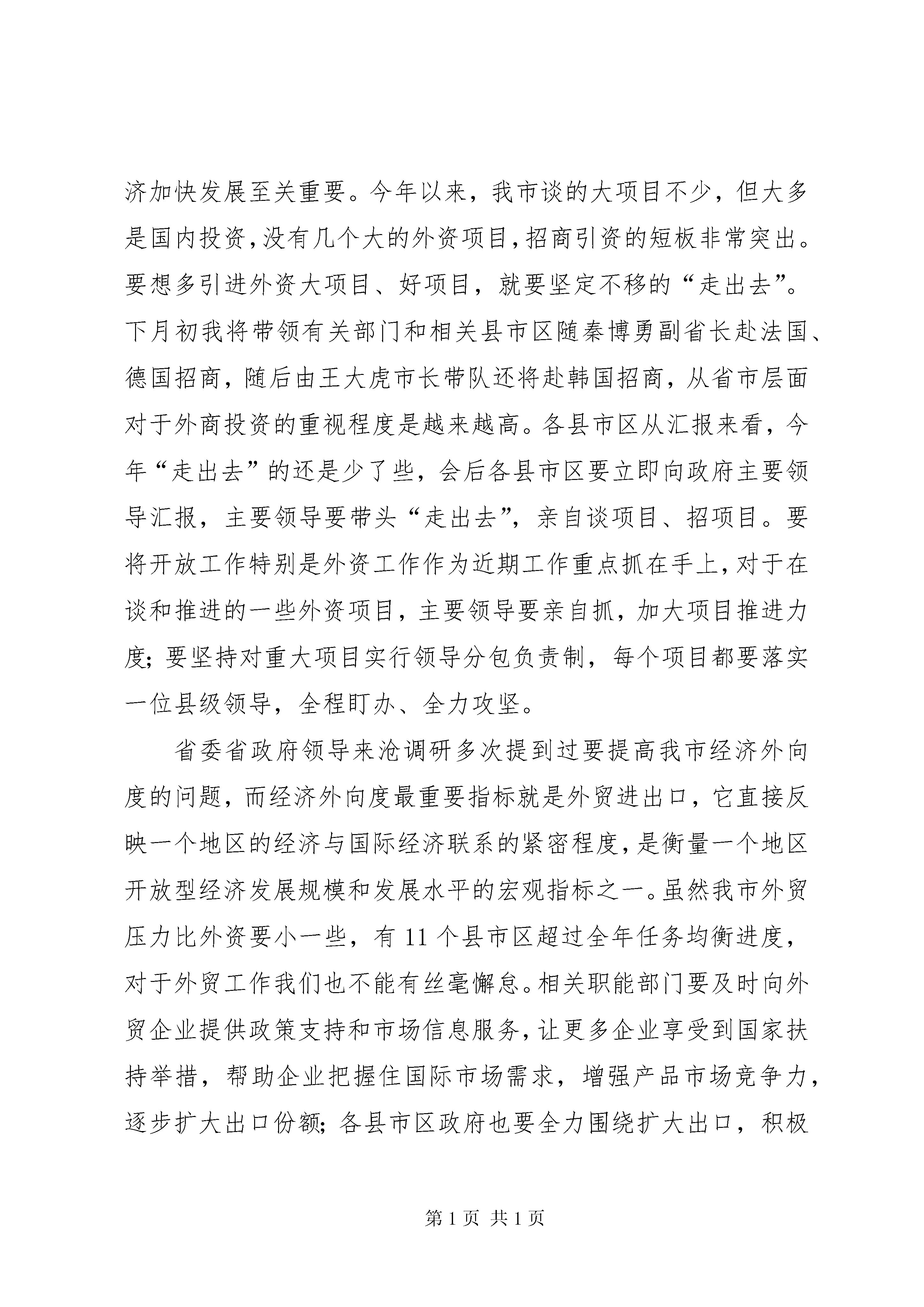 副市长在全市开放工作调度会上的讲话同志们:现在开会。这次会议,是经市政府研究召开的。主要目的是:听取各县市区1-9月份开放工作情况汇报,分析当前外资外贸工作形势,查找工作中存在的问题,部署下一阶段工作,确保全年任务目标完成。刚才,各县市区汇报了1-9月份外资外贸完成情况、项目建设、境外招商和开发区建设情况,以及四季度外资外贸到位预测,振兴同志就外资外贸工作讲了很好的意见,我完全同意。这次开放工作调度会是今年第一次全市范围的调度,主要是因为今年上半年集中精力抓活动、抓项目多一些,加上全市都在开展党的群众路线教育实践活动,变成了分散的小范围调度。这期间,我与商务、发改、统计等部门的同志一直保持着密切沟通。前三个季度全市开放工作不容乐观,特别是外资工作差距还很大,我们需要做的工作还很多,下面针对后两个月开放工作简单讲三点意见:一、提高认识、加强领导,进一步增强对外开放工作重视程度一个地方经济要发展,单纯依靠国内投资有很大的局限性,特别是在全球经济一体化的大背景下,进一步解放思想,加大开放力度,合理地、有效地利用国外的资金技术,对于一个地方经济加快发展至关重要。今年以来,我市谈的大项目不少,但大多是国内投资,没有几个大的外资项目,招商引资的短板非常突出。要想多引进外资大项目、好项目,就要坚定不移的“走出去”。下月初我将带领有关部门和相关县市区随秦博勇副省长赴法国、德国招商,随后由王大虎市长带队还将赴韩国招商,从省市层面对于外商投资的重视程度是越来越高。各县市区从汇报来看,今年“走出去”的还是少了些,会后各县市区要立即向政府主要领导汇报,主要领导要带头“走出去”,亲自谈项目、招项目。要将开放工作特别是外资工作作为近期工作重点抓在手上,对于在谈和推进的一些外资项目,主要领导要亲自抓,加大项目推进力度;要坚持对重大项目实行领导分包负责制,每个项目都要落实一位县级领导,全程盯办、全力攻坚。省委省政府领导来沧调研多次提到过要提高我市经济外向度的问题,而经济外向度最重要指标就是外贸进出口,它直接反映一个地区的经济与国际经济联系的紧密程度,是衡量一个地区开放型经济发展规模和发展水平的宏观指标之一。虽然我市外贸压力比外资要小一些,有11个县市区超过全年任务均衡进度,对于外贸工作我们也不能有丝毫懈怠。相关职能部门要及时向外贸企业提供政策支持和市场信息服务,让更多企业享受到国家扶持举措,帮助企业把握住国际市场需求,增强产品市场竞争力,逐步扩大出口份额;各县市区政府也要全力围绕扩大出口,积极培育壮大外贸进出口主体,全力做好外贸企业服务工作,促进全市外贸进出口稳定增长。二、明确责任、细化举措,全力确保外资外贸到位进度今年1-9月份全市共完成进出口总额22.7亿美元,同比增长23%,超全年任务目标均衡进度8个百分点,呈现稳定较快增长态势。但外资工作不容乐观,截至到9月底,全市仅到位外资14155万美元,同比减少30.5%,外资到位总额和增速分别列全省第八位和第十位。其中,xx县、孟村完成全年任务,东光、泊头接近时间进度,其它县市区到位进度不理想,有8个县市区外资到位为零。各县市区分管副县市区长要作为外资外贸工作第一责任人,切实加大工作力度,千方百计保证外资到位进度。一要摸清底数,找准症结。各县市区要对在谈、签约、在建、筹建的外资项目进行全面梳理排队,哪些项目能够注册,哪些项目能够开工,哪些项目近期有外资到位,哪些项目通过努力有外资到位可能,都要摸清底数,逐一明确责任专人盯办。对于外资到位存在困难的要认真分析原因,找准问题根源,主动帮助企业跑办手续、解决难题,需要市政府协调的,尽快上报,确保外资早到位、多到位。二要统筹协调,搞好服务。各级各有关部门要从大局出发,尽最大努力为外商投资创造便利条件,促进协议项目早履约,合同项目早注册,注册项目早开工、早建设、早投产。要坚持“引资、增资”等多渠道并举,要把新批外资企业、增资企业作为当前外资尽快到位的重点,根据企业情况分类指导,对新批的外资企业、增资的外资企业、签约未履约的企业等,拉出单子加快督办,加快跑办,快速办理。市商务局要充分发挥牵头部门作用,把全市重点外资项目、外贸出口企业都要落实具体分包责任人,全程跟踪服务。工商、发改、统计、外汇、海关等相关部门也要充分发挥职能作用,在政策允许的范围内给外资外贸企业多开绿灯,为企业创造良好的发展环境。三要用好平台,引上项目。今年3月底,全市开发区、工业聚集区进行了整合,每个县市区都至少有一个省级以上开发区。省委、省政府正在酝酿出台《关于推进全省开发区体制机制改革的指导意见》,意见将从开发区管理体制、运行机制、行政审批制度改革、开发区用人和薪酬制度改革、人才引进等多个方面向开发区倾斜,可以说支持力度之大前所未有。各县市区要将开发区作为招商引资和项目建设的