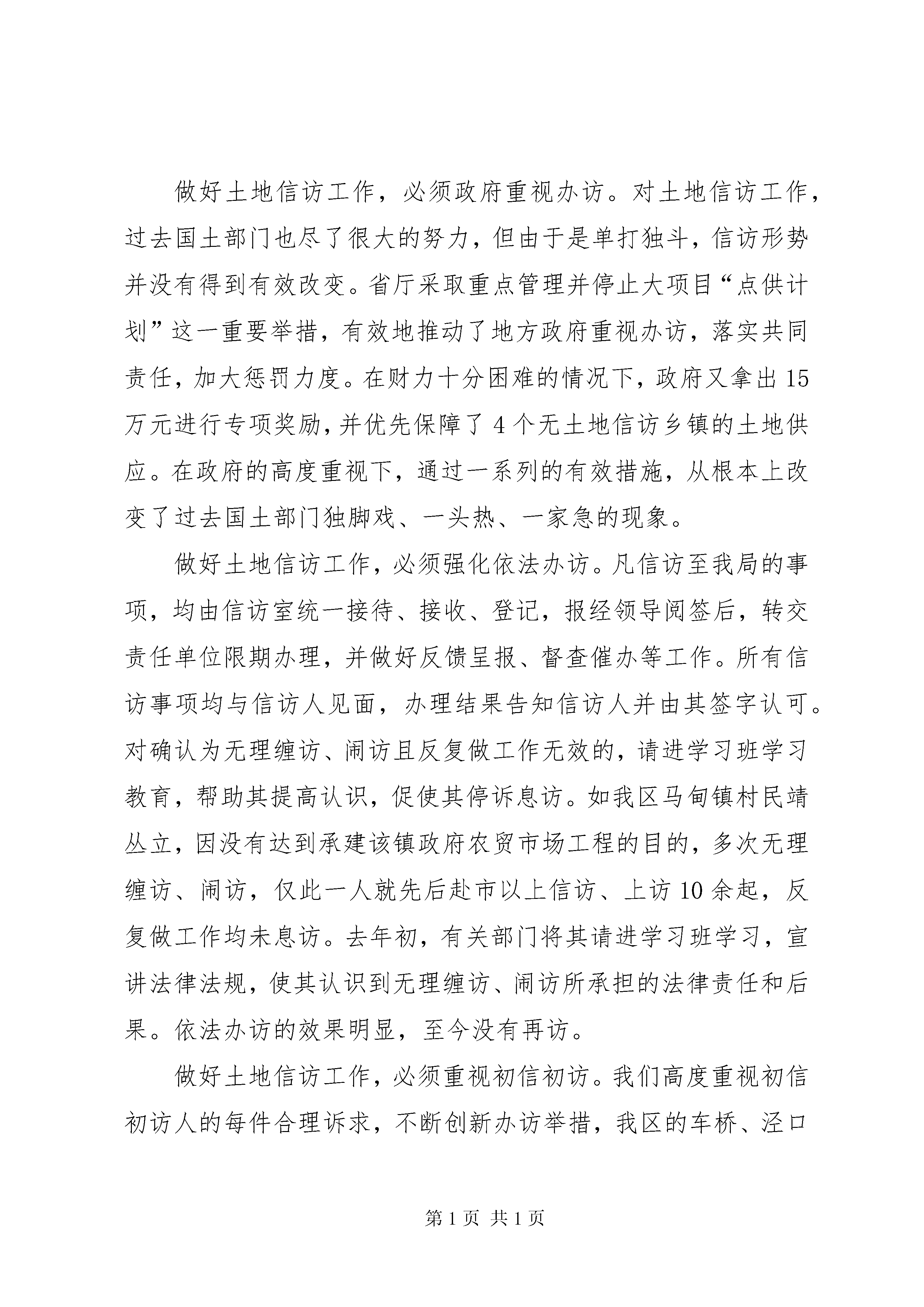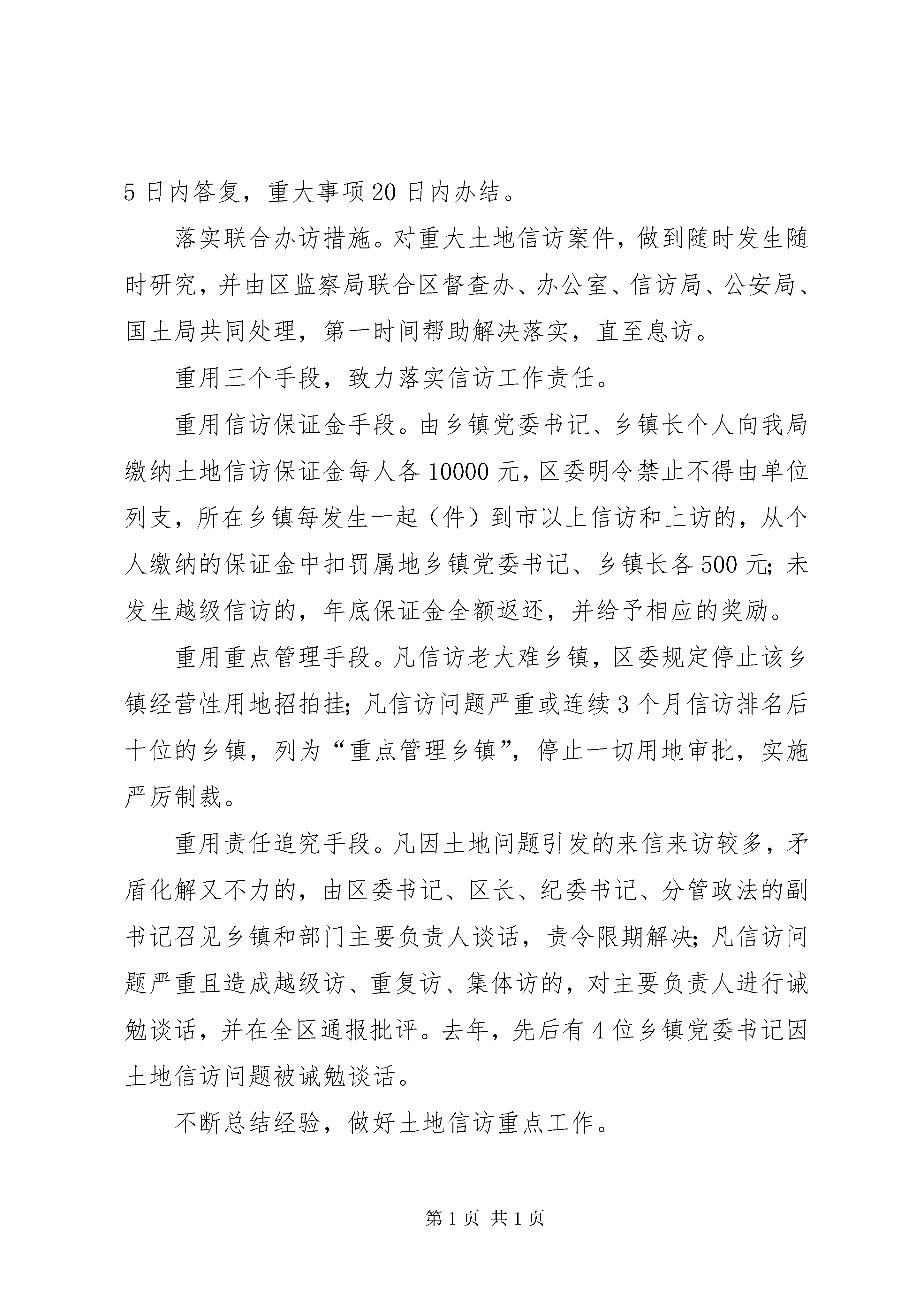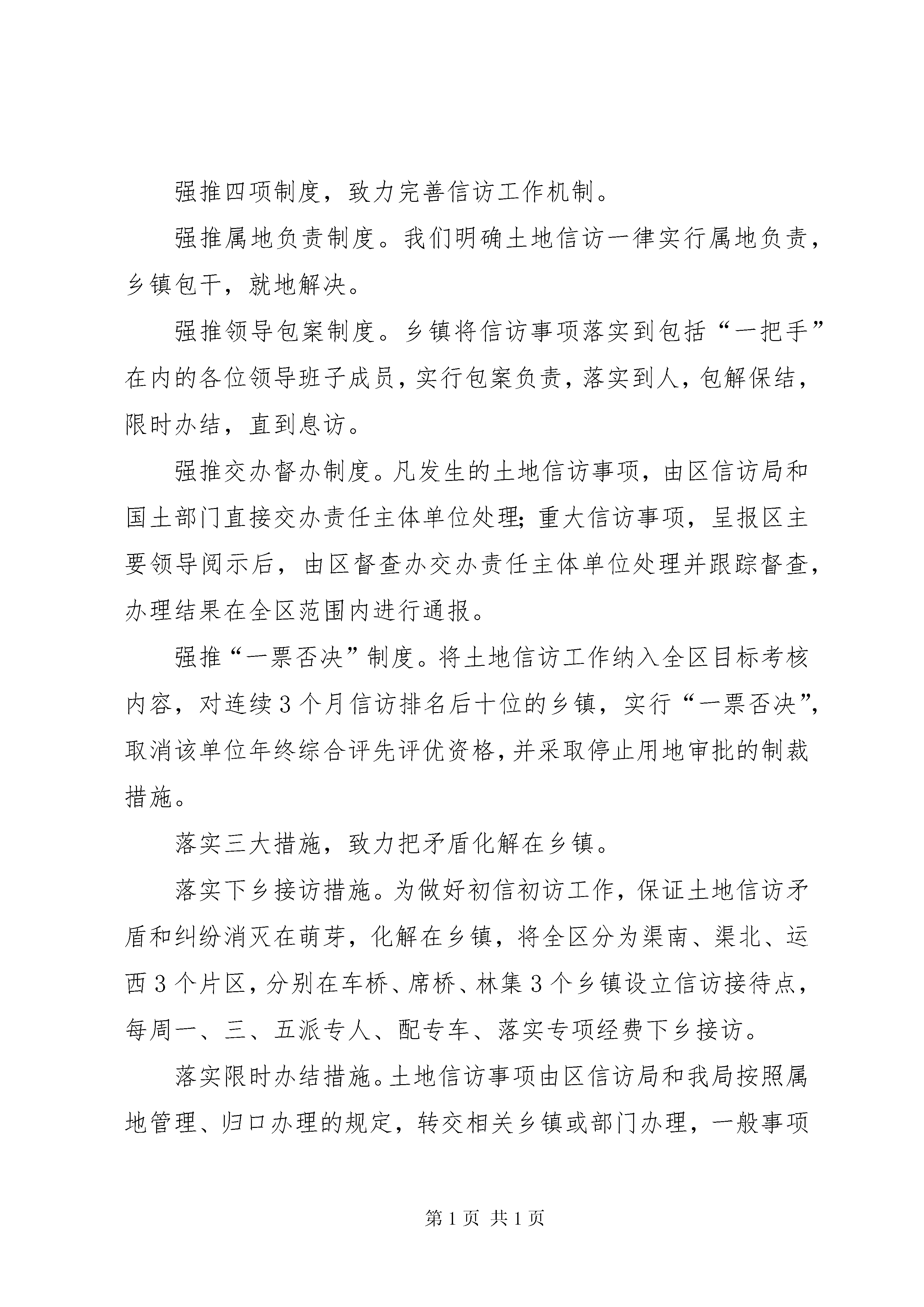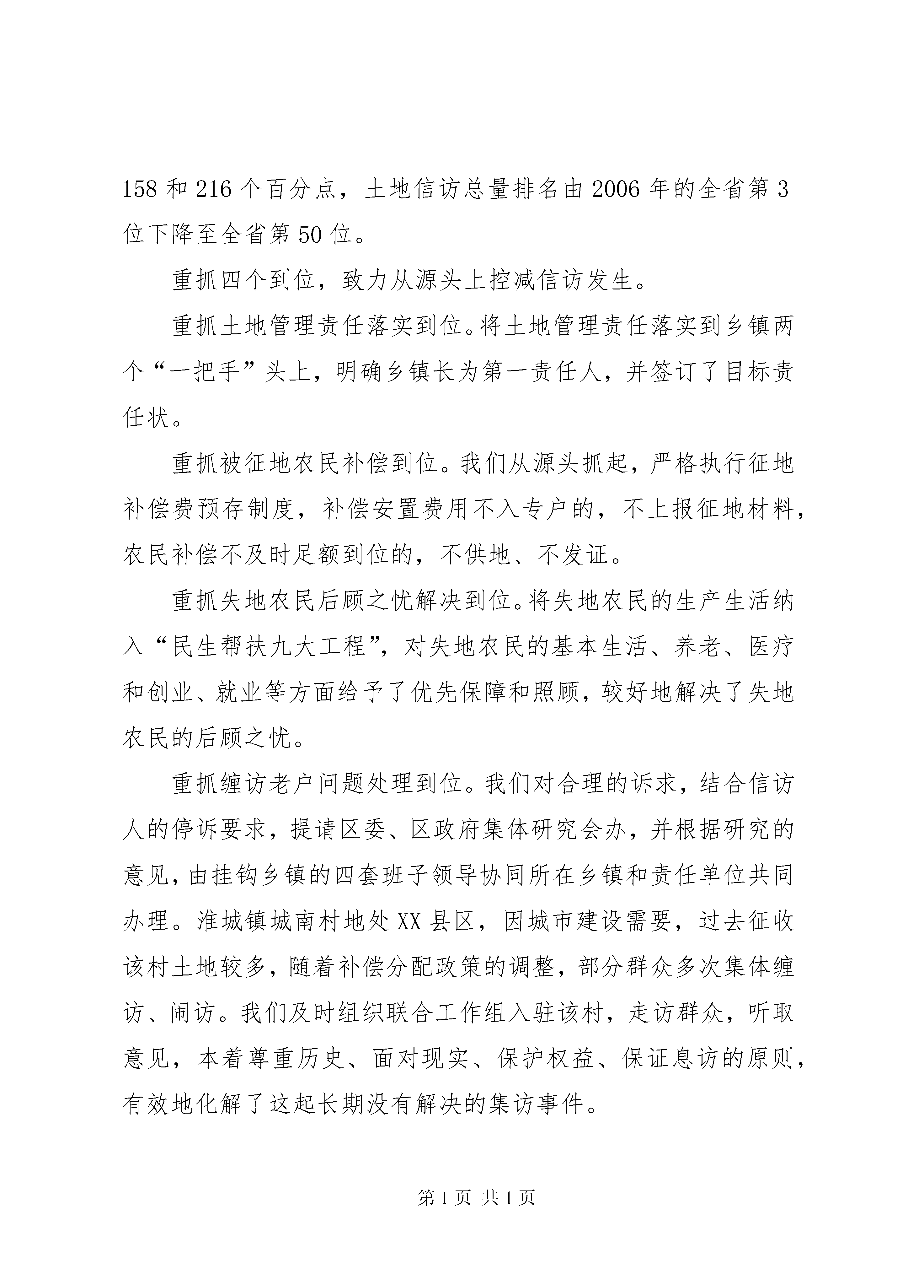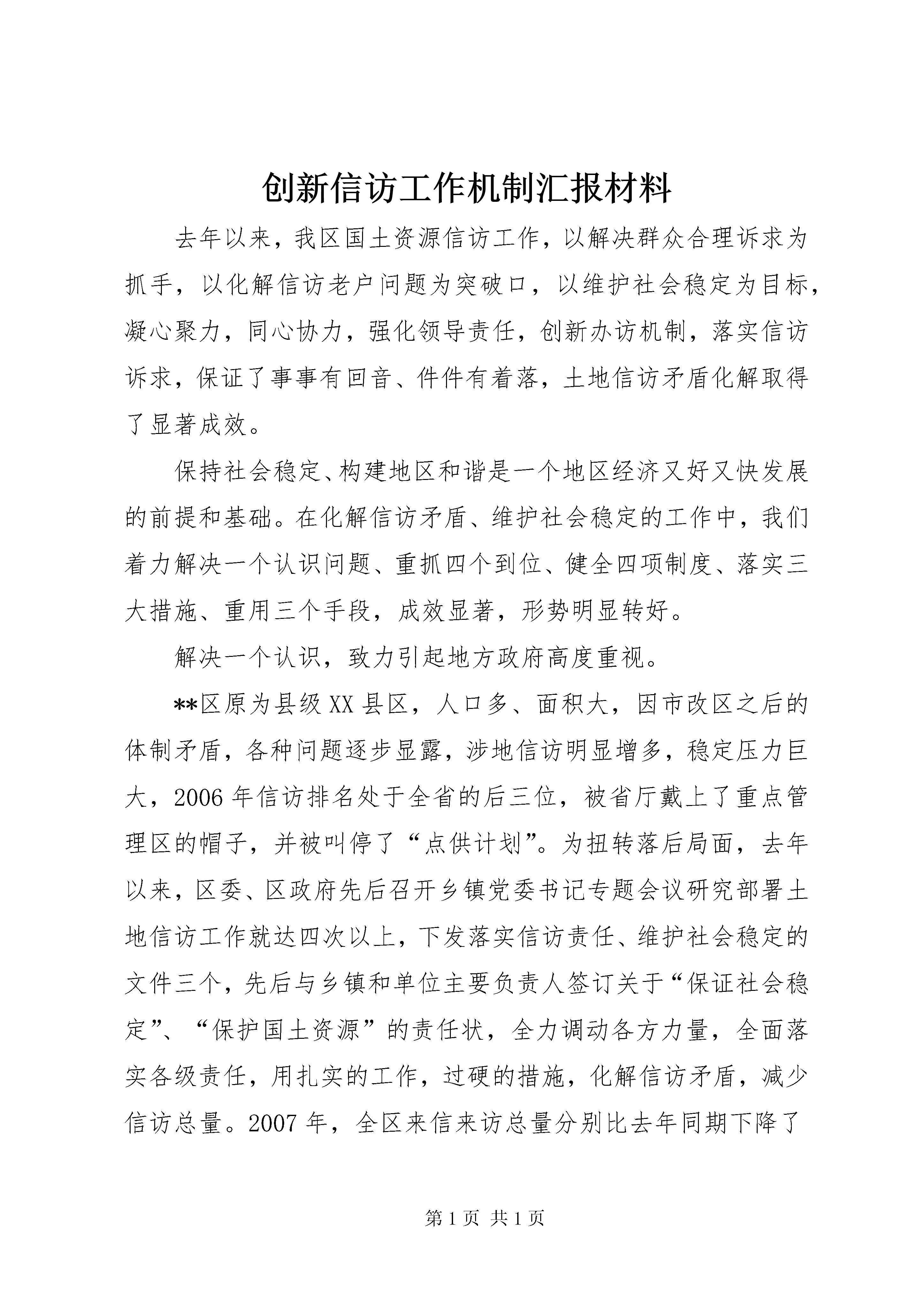 创新信访工作机制汇报材料去年以来,我区国土资源信访工作,以解决群众合理诉求为抓手,以化解信访老户问题为突破口,以维护社会稳定为目标,凝心聚力,同心协力,强化领导责任,创新办访机制,落实信访诉求,保证了事事有回音、件件有着落,土地信访矛盾化解取得了显著成效。保持社会稳定、构建地区和谐是一个地区经济又好又快发展的前提和基础。在化解信访矛盾、维护社会稳定的工作中,我们着力解决一个认识问题、重抓四个到位、健全四项制度、落实三大措施、重用三个手段,成效显著,形势明显转好。解决一个认识,致力引起地方政府高度重视。**区原为县级XX县区,人口多、面积大,因市改区之后的体制矛盾,各种问题逐步显露,涉地信访明显增多,稳定压力巨大,2006年信访排名处于全省的后三位,被省厅戴上了重点管理区的帽子,并被叫停了“点供计划”。为扭转落后局面,去年以来,区委、区政府先后召开乡镇党委书记专题会议研究部署土地信访工作就达四次以上,下发落实信访责任、维护社会稳定的文件三个,先后与乡镇和单位主要负责人签订关于“保证社会稳定”、“保护国土资源”的责任状,全力调动各方力量,全面落实各级责任,用扎实的工作,过硬的措施,化解信访矛盾,减少信访总量。2007年,全区来信来访总量分别比去年同期下降了158和216个百分点,土地信访总量排名由2006年的全省第3位下降至全省第50位。重抓四个到位,致力从源头上控减信访发生。重抓土地管理责任落实到位。将土地管理责任落实到乡镇两个“一把手”头上,明确乡镇长为第一责任人,并签订了目标责任状。重抓被征地农民补偿到位。我们从源头抓起,严格执行征地补偿费预存制度,补偿安置费用不入专户的,不上报征地材料,农民补偿不及时足额到位的,不供地、不发证。重抓失地农民后顾之忧解决到位。将失地农民的生产生活纳入“民生帮扶九大工程”,对失地农民的基本生活、养老、医疗和创业、就业等方面给予了优先保障和照顾,较好地解决了失地农民的后顾之忧。重抓缠访老户问题处理到位。我们对合理的诉求,结合信访人的停诉要求,提请区委、区政府集体研究会办,并根据研究的意见,由挂钩乡镇的四套班子领导协同所在乡镇和责任单位共同办理。淮城镇城南村地处XX县区,因城市建设需要,过去征收该村土地较多,随着补偿分配政策的调整,部分群众多次集体缠访、闹访。我们及时组织联合工作组入驻该村,走访群众,听取意见,本着尊重历史、面对现实、保护权益、保证息访的原则,有效地化解了这起长期没有解决的集访事件。强推四项制度,致力完善信访工作机制。强推属地负责制度。我们明确土地信访一律实行属地负责,乡镇包干,就地解决。强推领导包案制度。乡镇将信访事项落实到包括“一把手”在内的各位领导班子成员,实行包案负责,落实到人,包解保结,限时办结,直到息访。强推交办督办制度。凡发生的土地信访事项,由区信访局和国土部门直接交办责任主体单位处理;重大信访事项,呈报区主要领导阅示后,由区督查办交办责任主体单位处理并跟踪督查,办理结果在全区范围内进行通报。强推“一票否决”制度。将土地信访工作纳入全区目标考核内容,对连续3个月信访排名后十位的乡镇,实行“一票否决”,取消该单位年终综合评先评优资格,并采取停止用地审批的制裁措施。落实三大措施,致力把矛盾化解在乡镇。落实下乡接访措施。为做好初信初访工作,保证土地信访矛盾和纠纷消灭在萌芽,化解在乡镇,将全区分为渠南、渠北、运西3个片区,分别在车桥、席桥、林集3个乡镇设立信访接待点,每周一、三、五派专人、配专车、落实专项经费下乡接访。落实限时办结措施。土地信访事项由区信访局和我局按照属地管理、归口办理的规定,转交相关乡镇或部门办理,一般事项5日内答复,重大事项20日内办结。落实联合办访措施。对重大土地信访案件,做到随时发生随时研究,并由区监察局联合区督查办、办公室、信访局、公安局、国土局共同处理,第一时间帮助解决落实,直至息访。重用三个手段,致力落实信访工作责任。重用信访保证金手段。由乡镇党委书记、乡镇长个人向我局缴纳土地信访保证金每人各10000元,区委明令禁止不得由单位列支,所在乡镇每发生一起(件)到市以上信访和上访的,从个人缴纳的保证金中扣罚属地乡镇党委书记、乡镇长各500元;未发生越级信访的,年底保证金全额返还,并给予相应的奖励。重用重点管理手段。凡信访老大难乡镇,区委规定停止该乡镇经营性用地招拍挂;凡信访问题严重或连续3个月信访排名后十位的乡镇,列为“重点管理乡镇”,停止一切用地审批,实施严厉制裁。重用责任追究手段。凡因土地问题引发的来信来访较多,矛盾化解又不力的,由区委书记、区长、纪委书记、分管政法的副书记召见乡镇和部门主要负责人谈话,责令限期解决;凡信访问题严重且造成越级访、重复访、集体访的,对主要负责人进行诫勉谈话,并在全区通报批评。去年,先后有4位