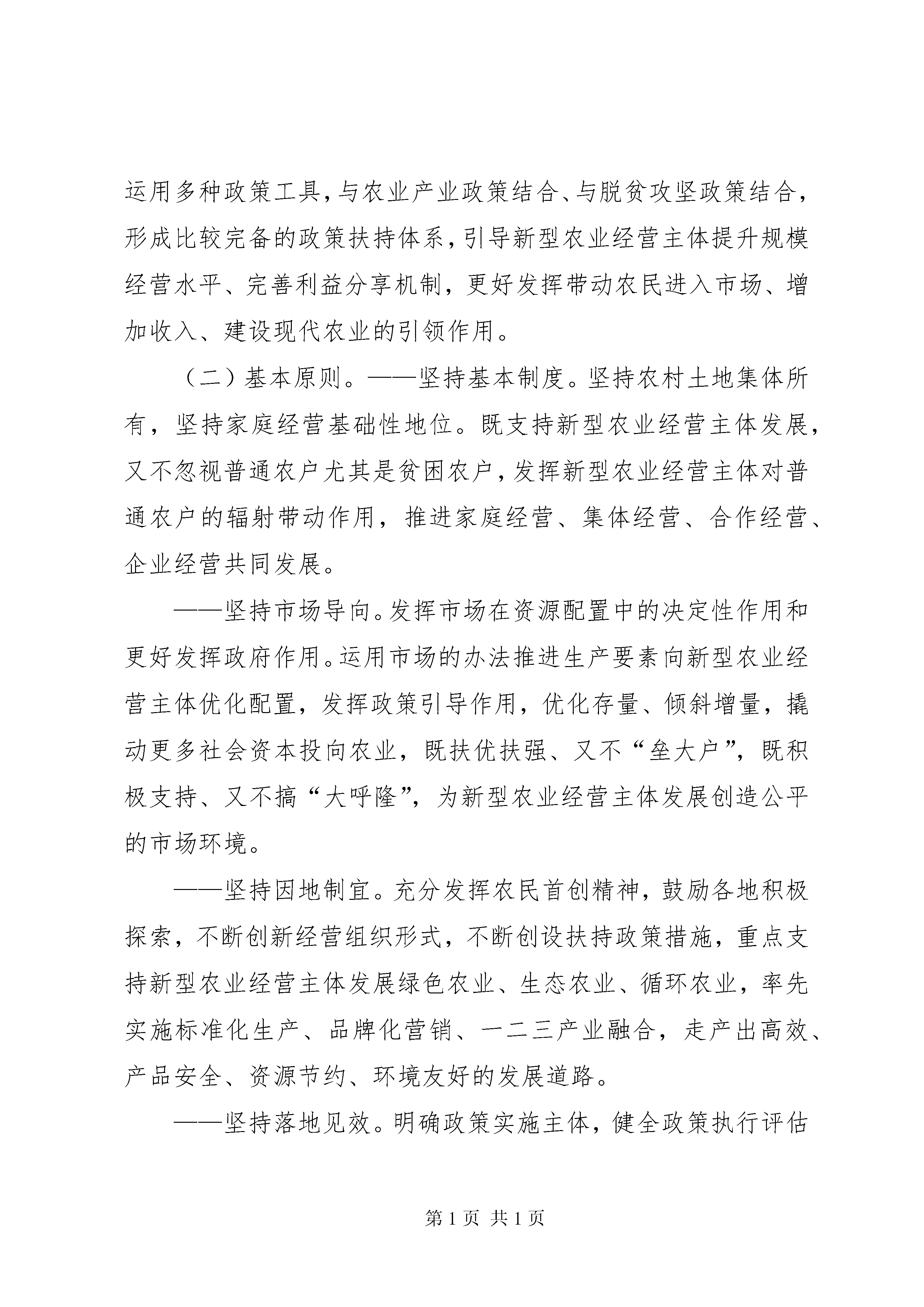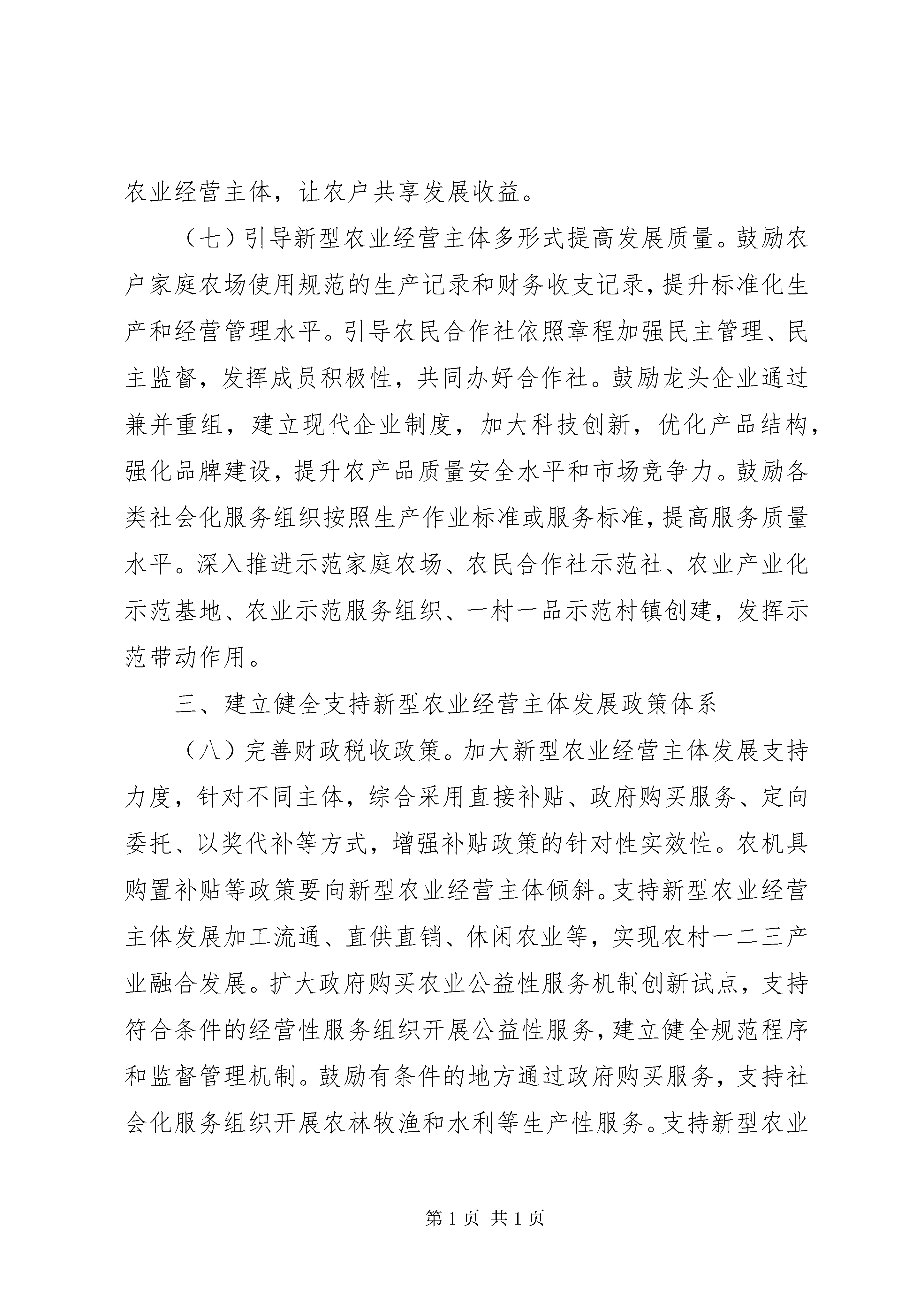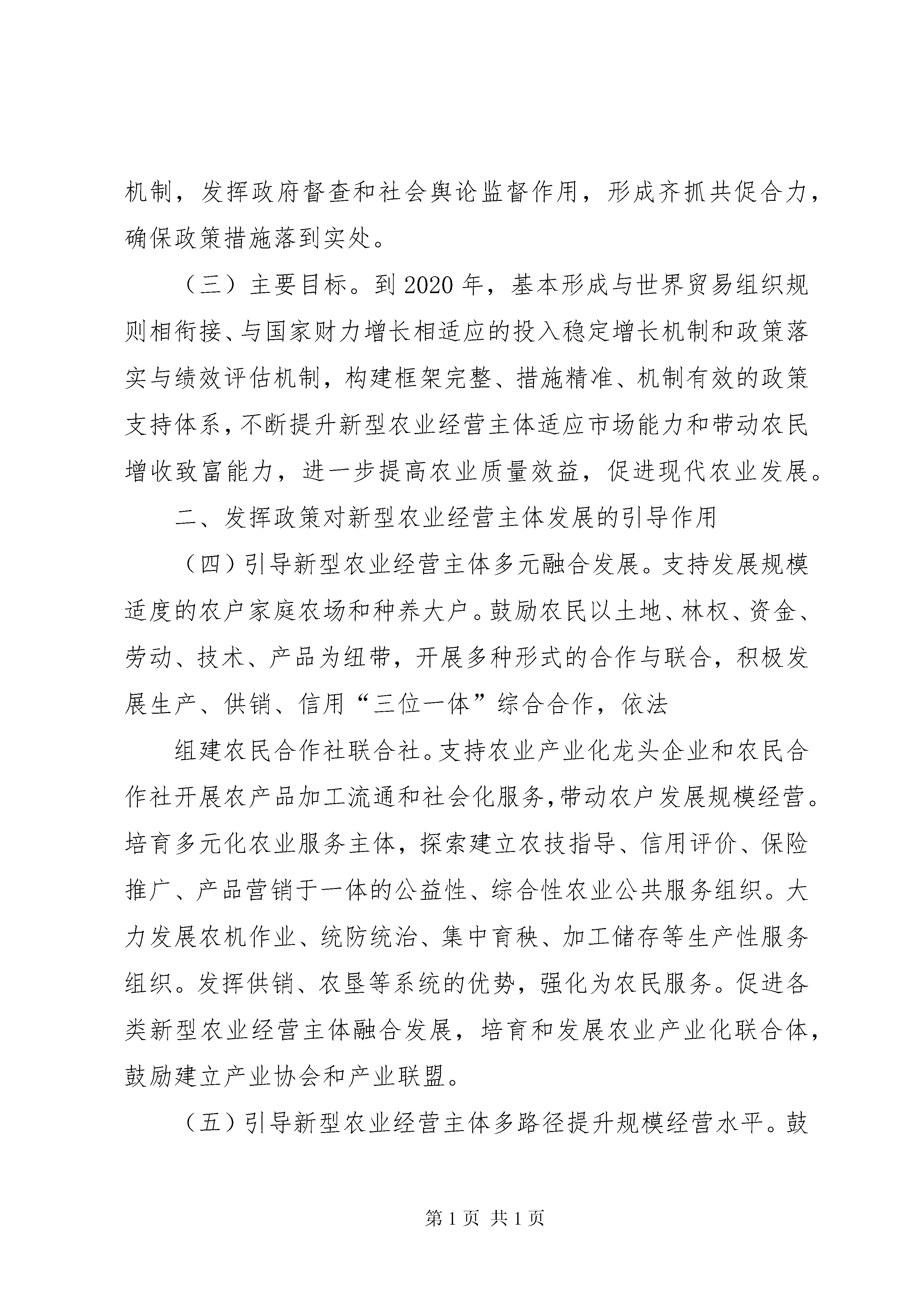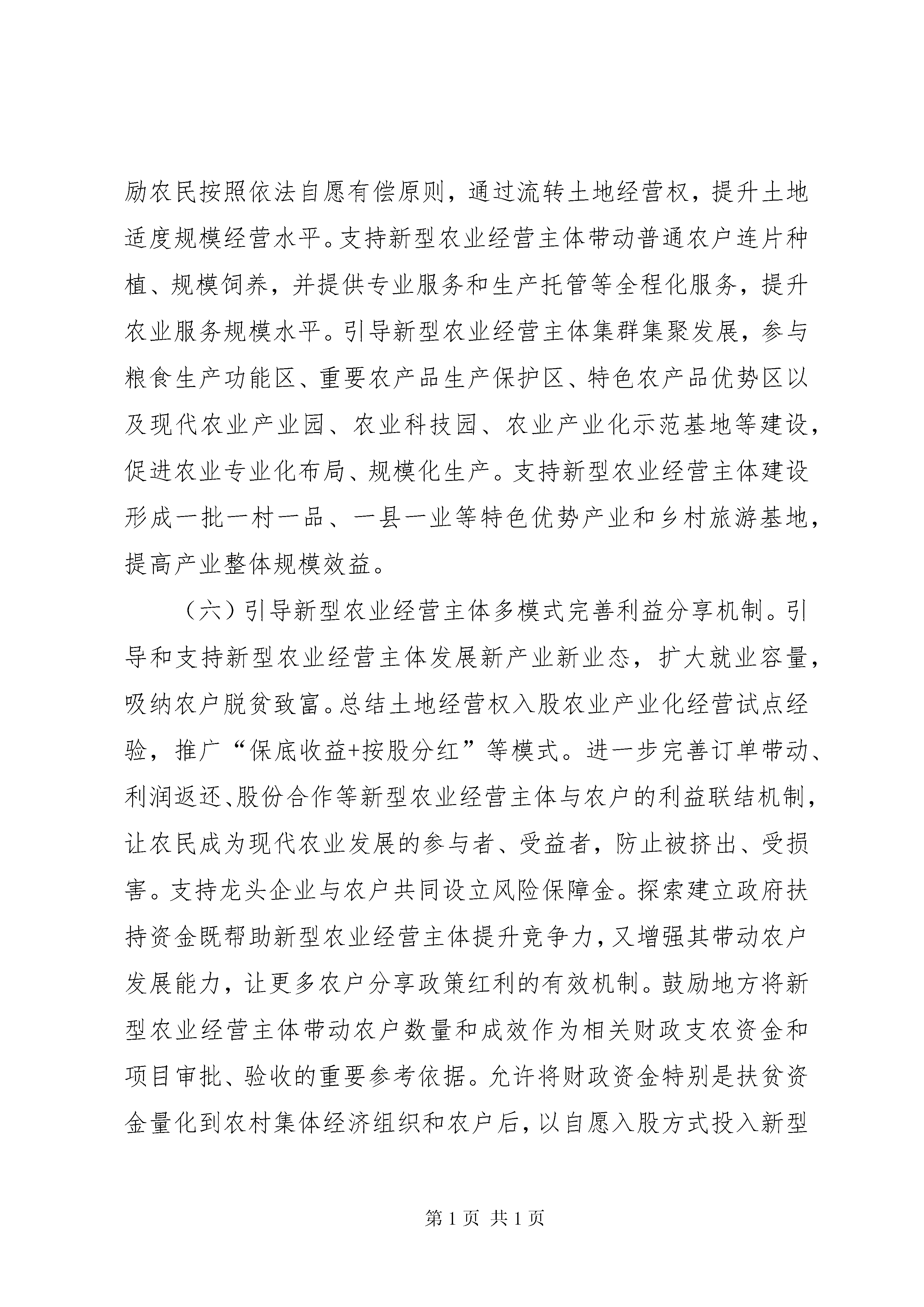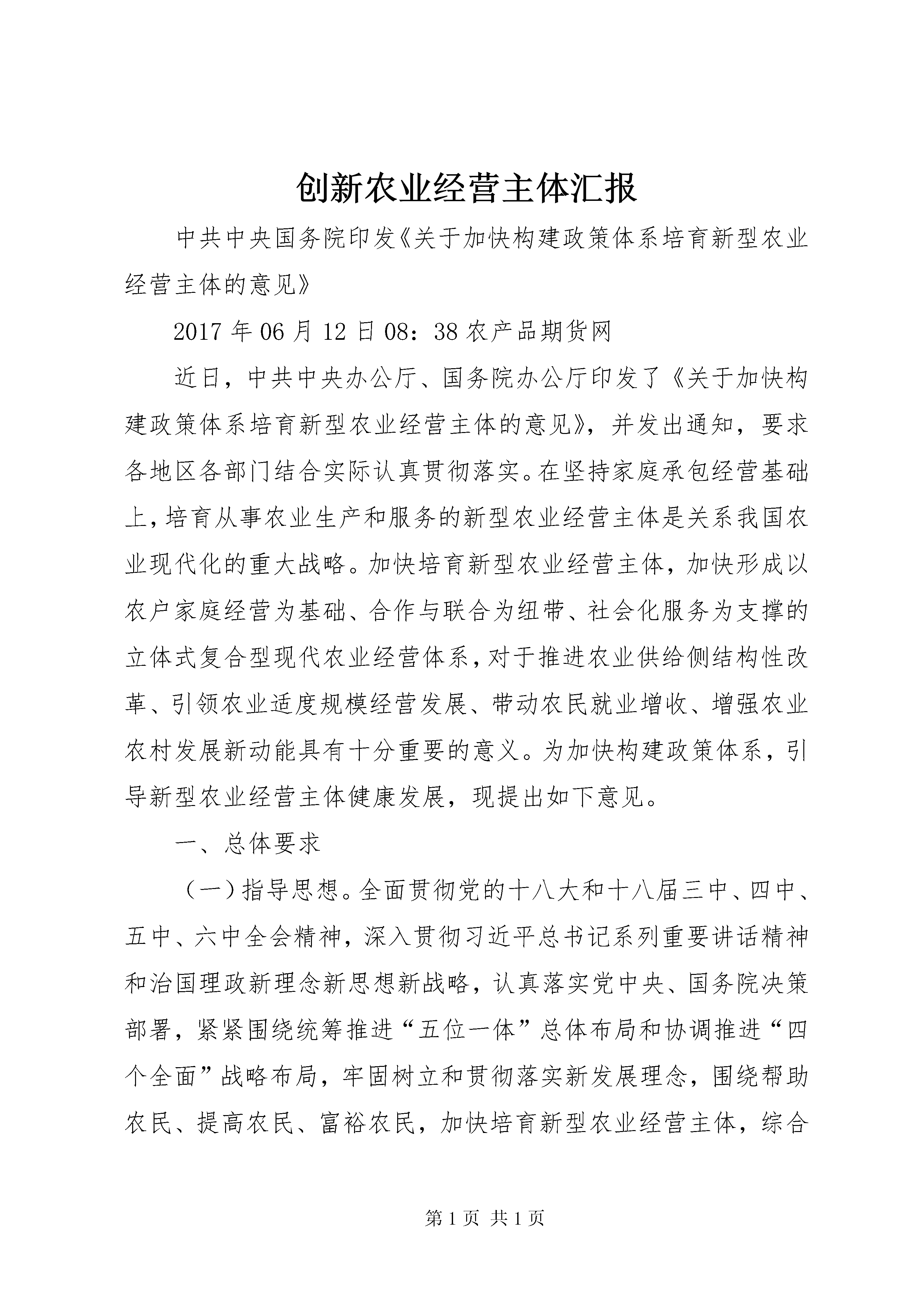 创新农业经营主体汇报中共中央国务院印发《关于加快构建政策体系培育新型农业经营主体的意见》2017年06月12日08:38农产品期货网近日,中共中央办公厅、国务院办公厅印发了《关于加快构建政策体系培育新型农业经营主体的意见》,并发出通知,要求各地区各部门结合实际认真贯彻落实。在坚持家庭承包经营基础上,培育从事农业生产和服务的新型农业经营主体是关系我国农业现代化的重大战略。加快培育新型农业经营主体,加快形成以农户家庭经营为基础、合作与联合为纽带、社会化服务为支撑的立体式复合型现代农业经营体系,对于推进农业供给侧结构性改革、引领农业适度规模经营发展、带动农民就业增收、增强农业农村发展新动能具有十分重要的意义。为加快构建政策体系,引导新型农业经营主体健康发展,现提出如下意见。一、总体要求(一)指导思想。全面贯彻党的十八大和十八届三中、四中、五中、六中全会精神,深入贯彻习近平总书记系列重要讲话精神和治国理政新理念新思想新战略,认真落实党中央、国务院决策部署,紧紧围绕统筹推进“五位一体”总体布局和协调推进“四个全面”战略布局,牢固树立和贯彻落实新发展理念,围绕帮助农民、提高农民、富裕农民,加快培育新型农业经营主体,综合运用多种政策工具,与农业产业政策结合、与脱贫攻坚政策结合,形成比较完备的政策扶持体系,引导新型农业经营主体提升规模经营水平、完善利益分享机制,更好发挥带动农民进入市场、增加收入、建设现代农业的引领作用。(二)基本原则。——坚持基本制度。坚持农村土地集体所有,坚持家庭经营基础性地位。既支持新型农业经营主体发展,又不忽视普通农户尤其是贫困农户,发挥新型农业经营主体对普通农户的辐射带动作用,推进家庭经营、集体经营、合作经营、企业经营共同发展。——坚持市场导向。发挥市场在资源配置中的决定性作用和更好发挥政府作用。运用市场的办法推进生产要素向新型农业经营主体优化配置,发挥政策引导作用,优化存量、倾斜增量,撬动更多社会资本投向农业,既扶优扶强、又不“垒大户”,既积极支持、又不搞“大呼隆”,为新型农业经营主体发展创造公平的市场环境。——坚持因地制宜。充分发挥农民首创精神,鼓励各地积极探索,不断创新经营组织形式,不断创设扶持政策措施,重点支持新型农业经营主体发展绿色农业、生态农业、循环农业,率先实施标准化生产、品牌化营销、一二三产业融合,走产出高效、产品安全、资源节约、环境友好的发展道路。——坚持落地见效。明确政策实施主体,健全政策执行评估机制,发挥政府督查和社会舆论监督作用,形成齐抓共促合力,确保政策措施落到实处。(三)主要目标。到2020年,基本形成与世界贸易组织规则相衔接、与国家财力增长相适应的投入稳定增长机制和政策落实与绩效评估机制,构建框架完整、措施精准、机制有效的政策支持体系,不断提升新型农业经营主体适应市场能力和带动农民增收致富能力,进一步提高农业质量效益,促进现代农业发展。二、发挥政策对新型农业经营主体发展的引导作用(四)引导新型农业经营主体多元融合发展。支持发展规模适度的农户家庭农场和种养大户。鼓励农民以土地、林权、资金、劳动、技术、产品为纽带,开展多种形式的合作与联合,积极发展生产、供销、信用“三位一体”综合合作,依法组建农民合作社联合社。支持农业产业化龙头企业和农民合作社开展农产品加工流通和社会化服务,带动农户发展规模经营。培育多元化农业服务主体,探索建立农技指导、信用评价、保险推广、产品营销于一体的公益性、综合性农业公共服务组织。大力发展农机作业、统防统治、集中育秧、加工储存等生产性服务组织。发挥供销、农垦等系统的优势,强化为农民服务。促进各类新型农业经营主体融合发展,培育和发展农业产业化联合体,鼓励建立产业协会和产业联盟。(五)引导新型农业经营主体多路径提升规模经营水平。鼓励农民按照依法自愿有偿原则,通过流转土地经营权,提升土地适度规模经营水平。支持新型农业经营主体带动普通农户连片种植、规模饲养,并提供专业服务和生产托管等全程化服务,提升农业服务规模水平。引导新型农业经营主体集群集聚发展,参与粮食生产功能区、重要农产品生产保护区、特色农产品优势区以及现代农业产业园、农业科技园、农业产业化示范基地等建设,促进农业专业化布局、规模化生产。支持新型农业经营主体建设形成一批一村一品、一县一业等特色优势产业和乡村旅游基地,提高产业整体规模效益。(六)引导新型农业经营主体多模式完善利益分享机制。引导和支持新型农业经营主体发展新产业新业态,扩大就业容量,吸纳农户脱贫致富。总结土地经营权入股农业产业化经营试点经验,推广“保底收益+按股分红”等模式。进一步完善订单带动、利润返还、股份合作等新型农业经营主体与农户的利益联结机制,让农民成为现代农业发展的参与者、受益者,防止被挤出、受损害。支持龙头企业与农户共同