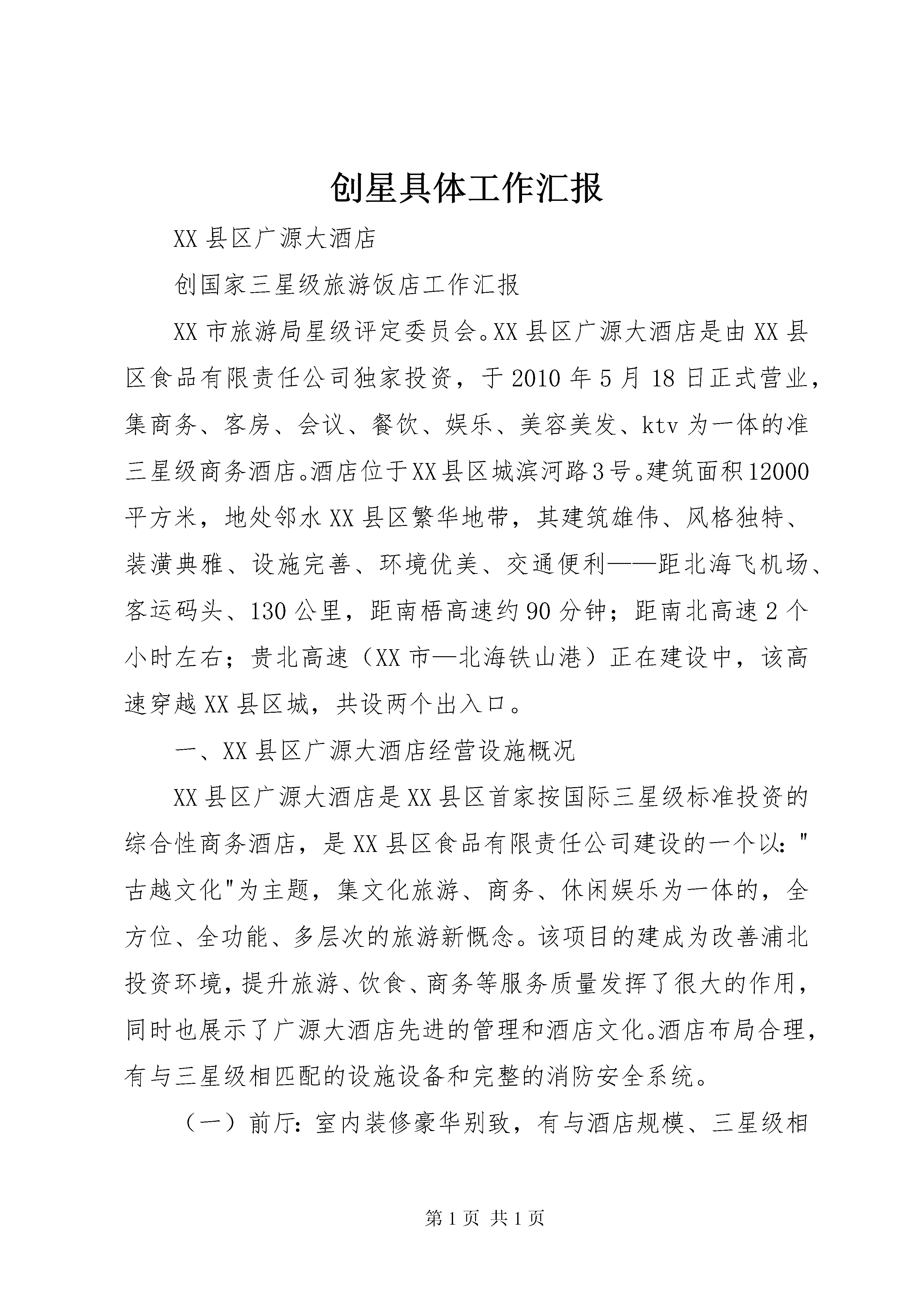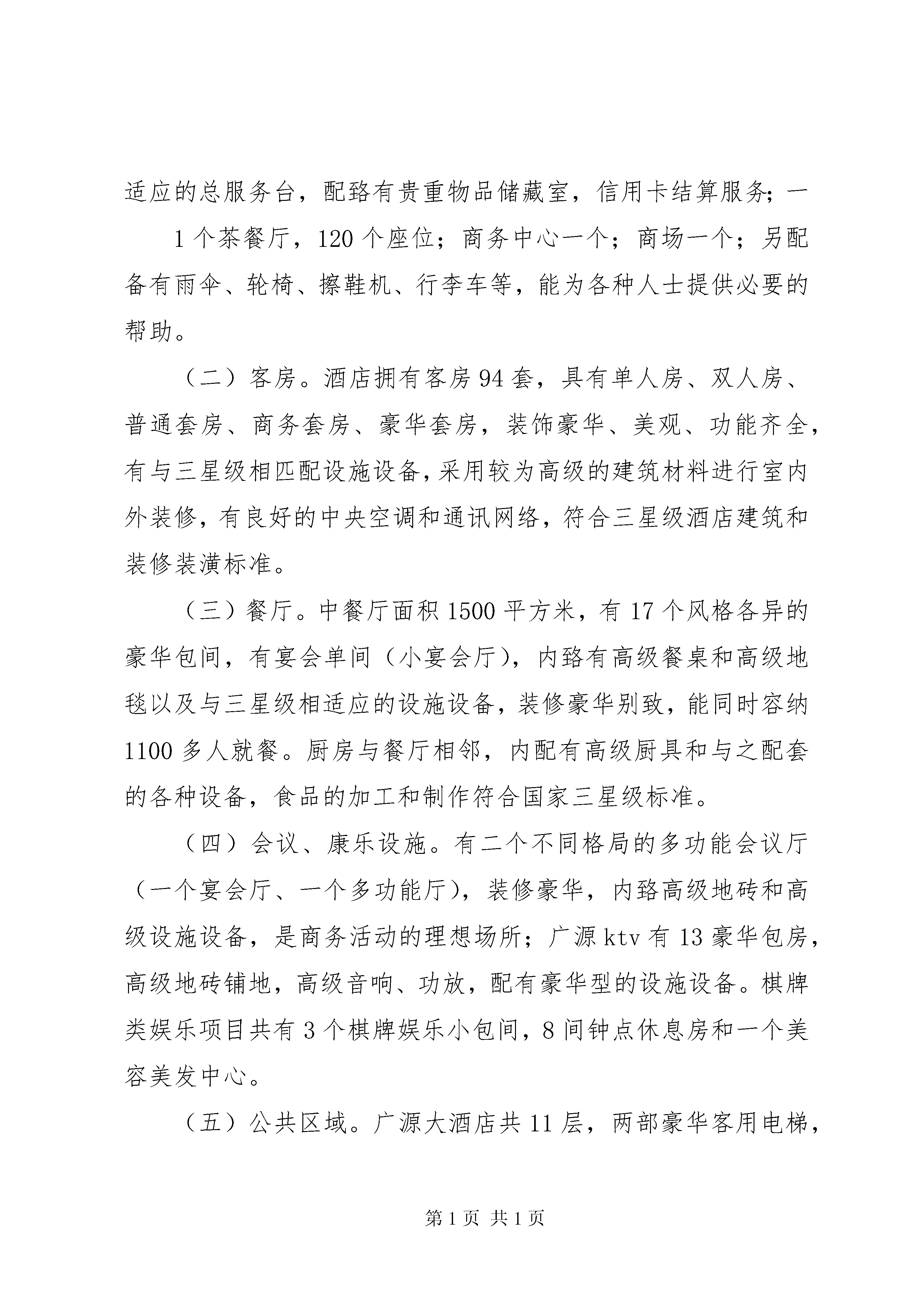 创星具体工作汇报XX县区广源大酒店创国家三星级旅游饭店工作汇报XX市旅游局星级评定委员会。XX县区广源大酒店是由XX县区食品有限责任公司独家投资,于2010年5月18日正式营业,集商务、客房、会议、餐饮、娱乐、美容美发、ktv为一体的准三星级商务酒店。酒店位于XX县区城滨河路3号。建筑面积12000平方米,地处邻水XX县区繁华地带,其建筑雄伟、风格独特、装潢典雅、设施完善、环境优美、交通便利——距北海飞机场、客运码头、130公里,距南梧高速约90分钟;距南北高速2个小时左右;贵北高速(XX市—北海铁山港)正在建设中,该高速穿越XX县区城,共设两个出入口。一、XX县区广源大酒店经营设施概况XX县区广源大酒店是XX县区首家按国际三星级标准投资的综合性商务酒店,是XX县区食品有限责任公司建设的一个以:"古越文化"为主题,集文化旅游、商务、休闲娱乐为一体的,全方位、全功能、多层次的旅游新慨念。该项目的建成为改善浦北投资环境,提升旅游、饮食、商务等服务质量发挥了很大的作用,同时也展示了广源大酒店先进的管理和酒店文化。酒店布局合理,有与三星级相匹配的设施设备和完整的消防安全系统。(一)前厅:室内装修豪华别致,有与酒店规模、三星级相适应的总服务台,配臵有贵重物品储藏室,信用卡结算服务;一1个茶餐厅,120个座位;商务中心一个;商场一个;另配备有雨伞、轮椅、擦鞋机、行李车等,能为各种人士提供必要的帮助。(二)客房。酒店拥有客房94套,具有单人房、双人房、普通套房、商务套房、豪华套房,装饰豪华、美观、功能齐全,有与三星级相匹配设施设备,采用较为高级的建筑材料进行室内外装修,有良好的中央空调和通讯网络,符合三星级酒店建筑和装修装潢标准。(三)餐厅。中餐厅面积1500平方米,有17个风格各异的豪华包间,有宴会单间(小宴会厅),内臵有高级餐桌和高级地毯以及与三星级相适应的设施设备,装修豪华别致,能同时容纳1100多人就餐。厨房与餐厅相邻,内配有高级厨具和与之配套的各种设备,食品的加工和制作符合国家三星级标准。(四)会议、康乐设施。有二个不同格局的多功能会议厅(一个宴会厅、一个多功能厅),装修豪华,内臵高级地砖和高级设施设备,是商务活动的理想场所;广源ktv有13豪华包房,高级地砖铺地,高级音响、功放,配有豪华型的设施设备。棋牌类娱乐项目共有3个棋牌娱乐小包间,8间钟点休息房和一个美容美发中心。(五)公共区域。广源大酒店共11层,两部豪华客用电梯,配有客用电话、室外停车场、公共卫生间以及应急供电设施和应急照明设施,每层楼走廊铺设高级地毯或瓷砖。二、广源大酒店经营管理情况2广源大酒店是XX县区食品有限责任公司以灵活的市场经验、采用较好的投资方式,成功开发的星级酒店。酒店组建初期,先后聘请了XX市祥泰酒店管理有限公司、广西水电职业技术学院等酒店管理专业人才,严格按照三星级酒店服务标准及要求对操作层进行强化培训,使之树立标准意识、服务意识,掌握各岗位的服务准则、服务规范,领悟本职工作的内涵意义,培养服务人员的良好服务意识和推销意识,从而使各部门进入规范的循环体系,最终使员工个人素质和业务素质适应三星级饭店的要求。(一)建立健全人才引进、培养、发展机制,逐步树立竞争观念。一个企业成功的最大奥秘实际上就是如何能够把一个人的潜能调整到最大限度,就是把一个人的能量尽可能地发挥出来,人才的引进、培养、发展是驱动竞争力逐步提升的源泉。在人才的引进上,制定一套立体的人才引进、培训、使用、积累体系,通过到旅游学校和社会进行招聘,严格进行挑选、试用,也可以直接聘请有资质的专业的饭店管理人员;在人才的培训上,建立培训档案和培训卡制度,强化对培训工作各环节的管理和控制,采取集中军训、专题讲座、淡季轮训、部门自训、员工自我开发培训等途径,逐步建立具有自身特色的员工培训体系;在人才的使用上,建立“先进个人”、“优秀员工”、“服务之星”员工评定制度,制定“先进个人”、“优秀员工”、“服务之星”员工的评定标准,确立企业可以重用的骨干力量、可以依靠的中3坚力量、需要培养的后续力量、需要淘汰的不适之才。在人才的积累上,通过开展员工星级评定,不断地使最有责任心与才能的人进入酒店的中坚层,在分配上形成按业绩贡献分配的梯级制度,使员工与酒店结成事业的共同体。(二)建立健全严格的监督、检查和奖惩制度,对酒店进行安全有效管理酒店组建初期,利用先进的管理经验对酒店进行培育,先后出台了《员工手册》,"酒店组织机构图"对酒店各部门的设臵、管理层级制度、人力资源的合理配臵、《管理制度》等一系列酒店管理系统;建立健全了计算机管理系统和先进的网络系统;先后成立了"安全生产管理领导小组"、"环境卫生监督管理领导小组"、"突发事件应急处理小组"等一系列质量、安全的管理组织,对酒店进行较好的监