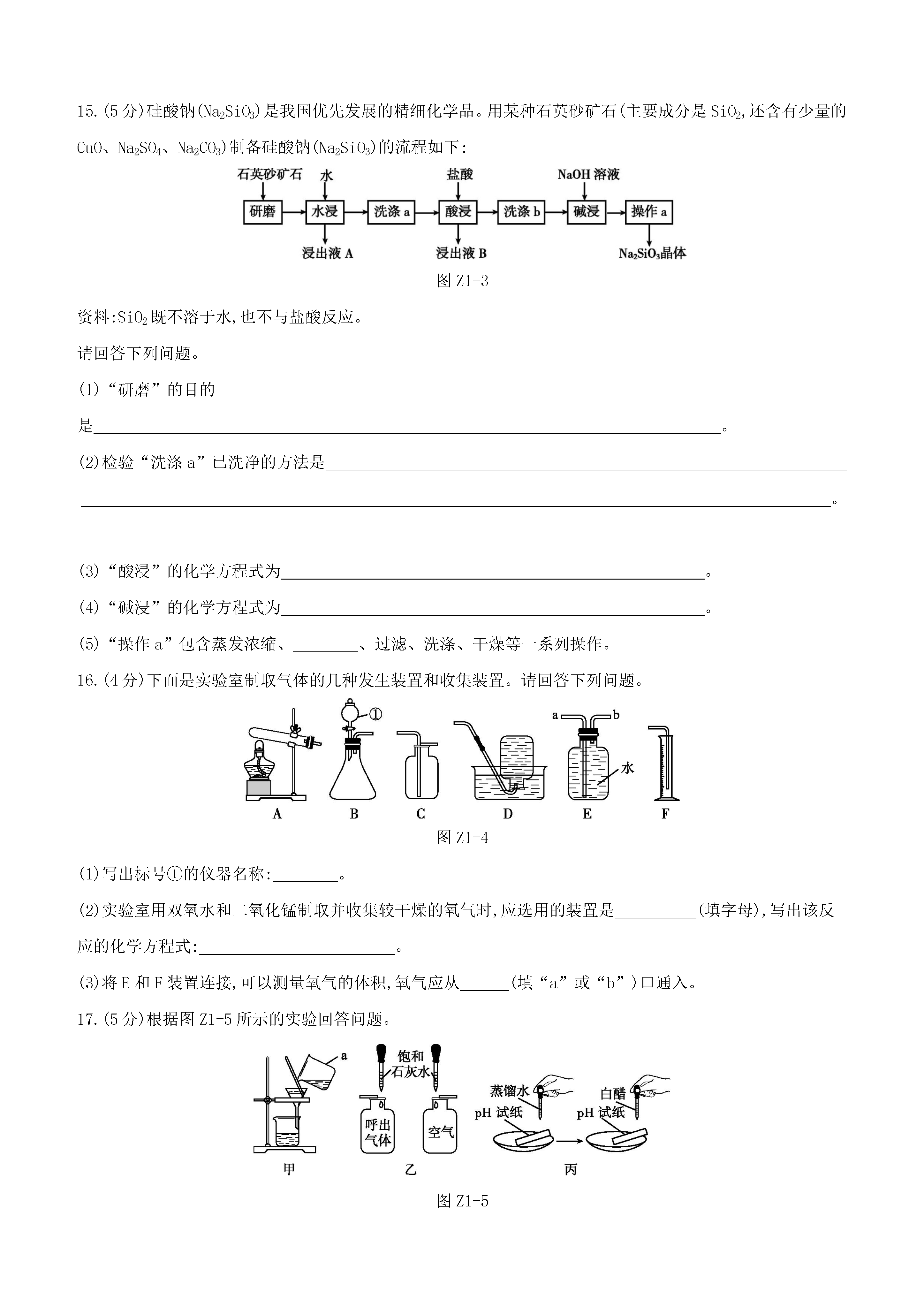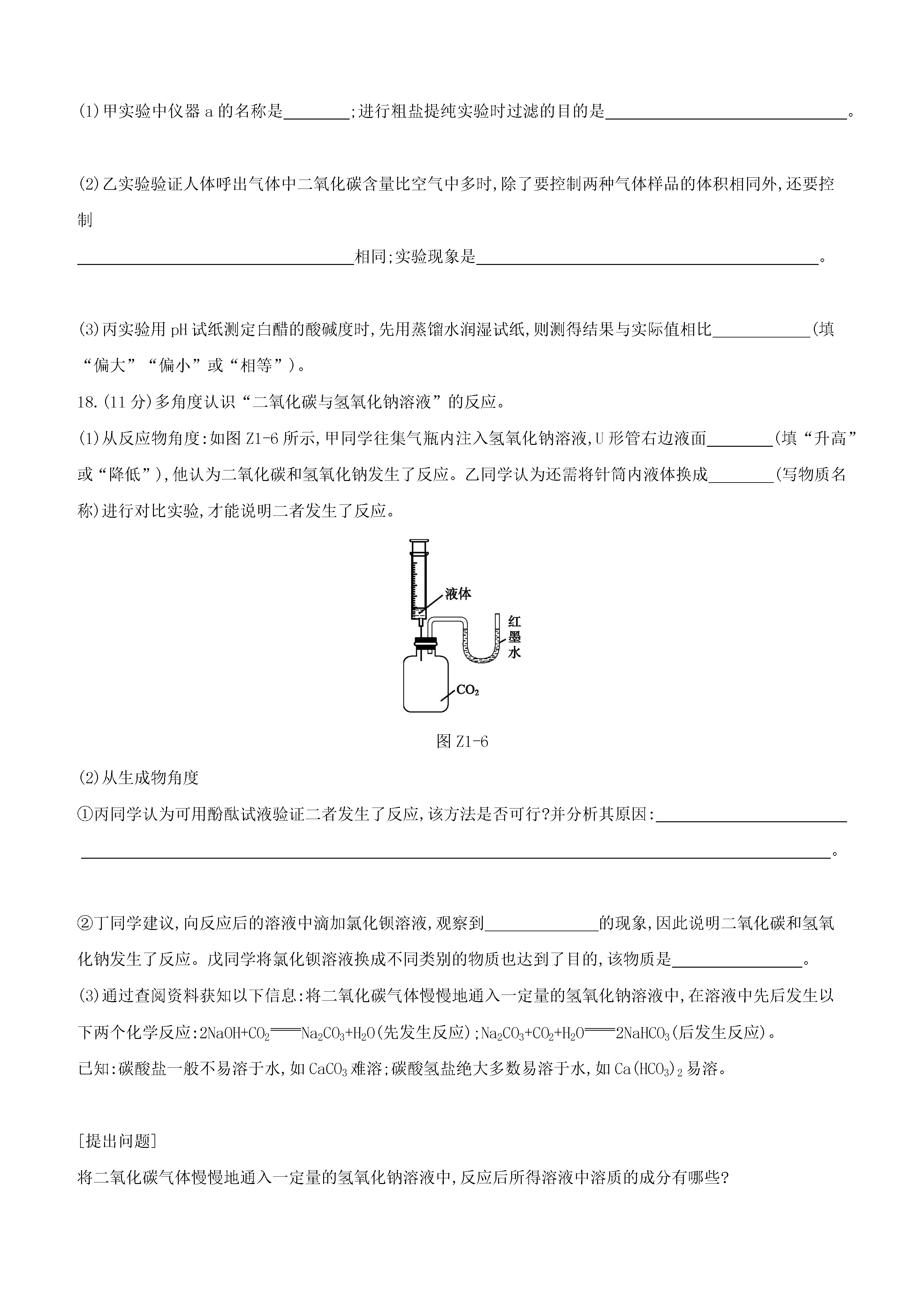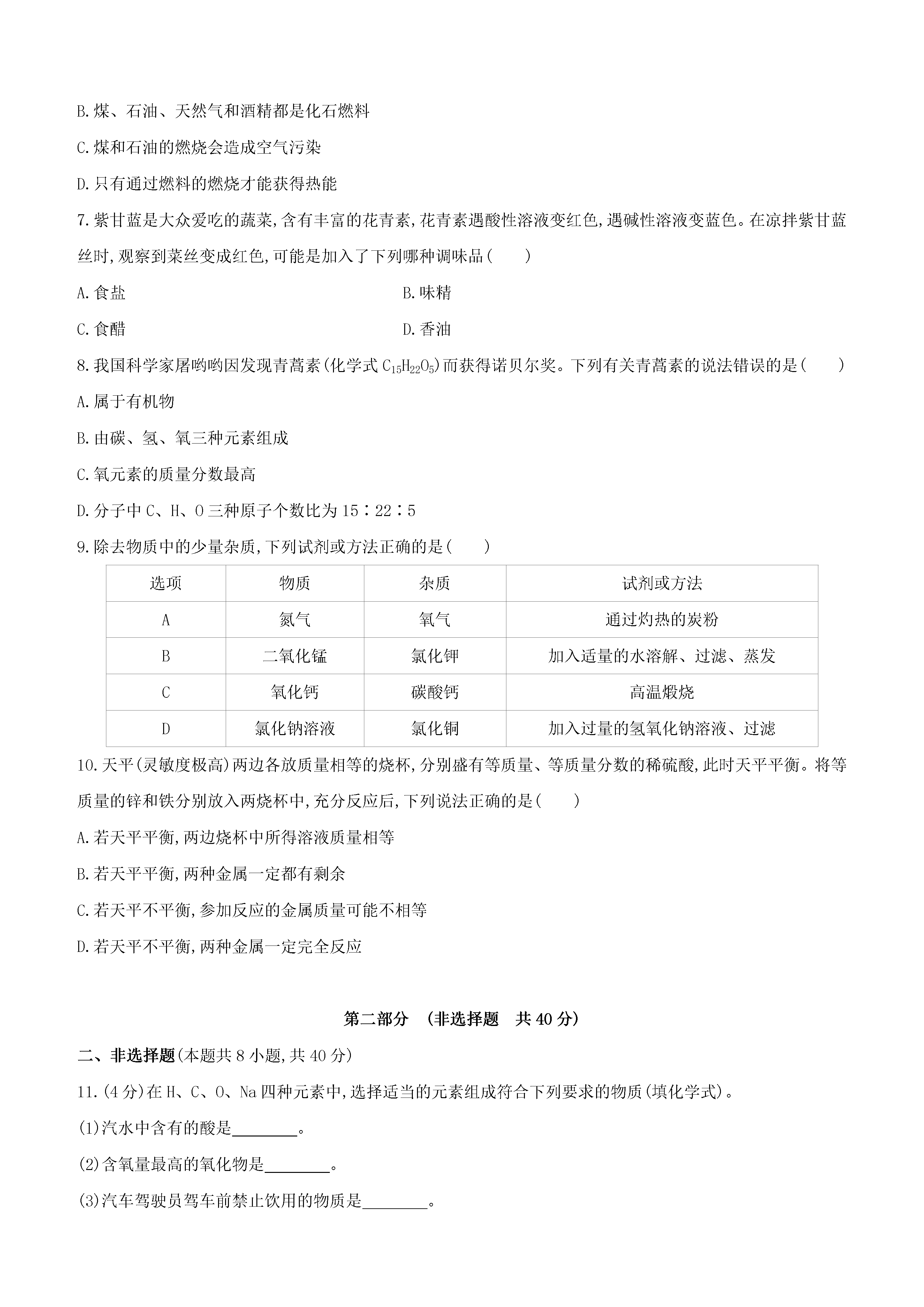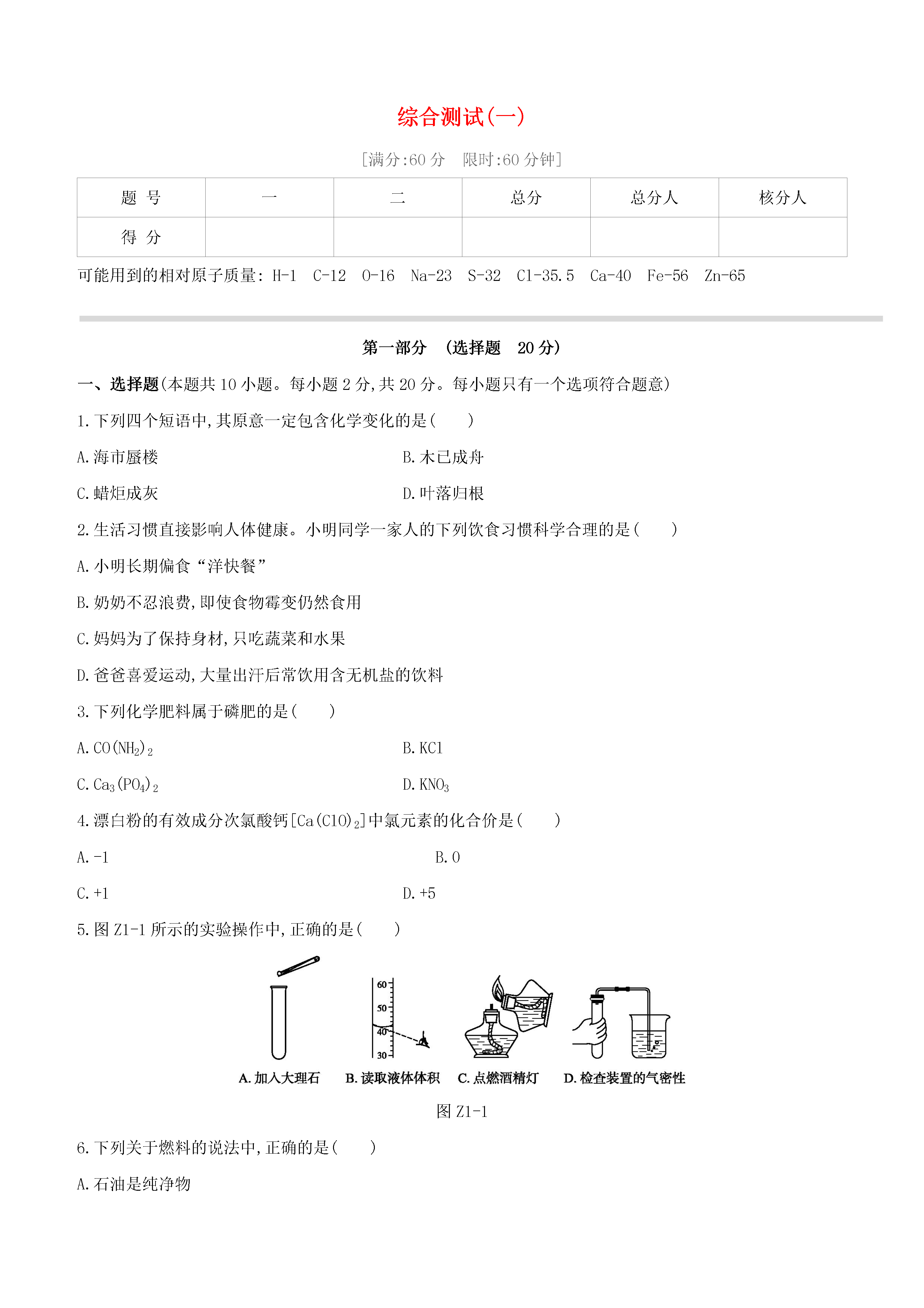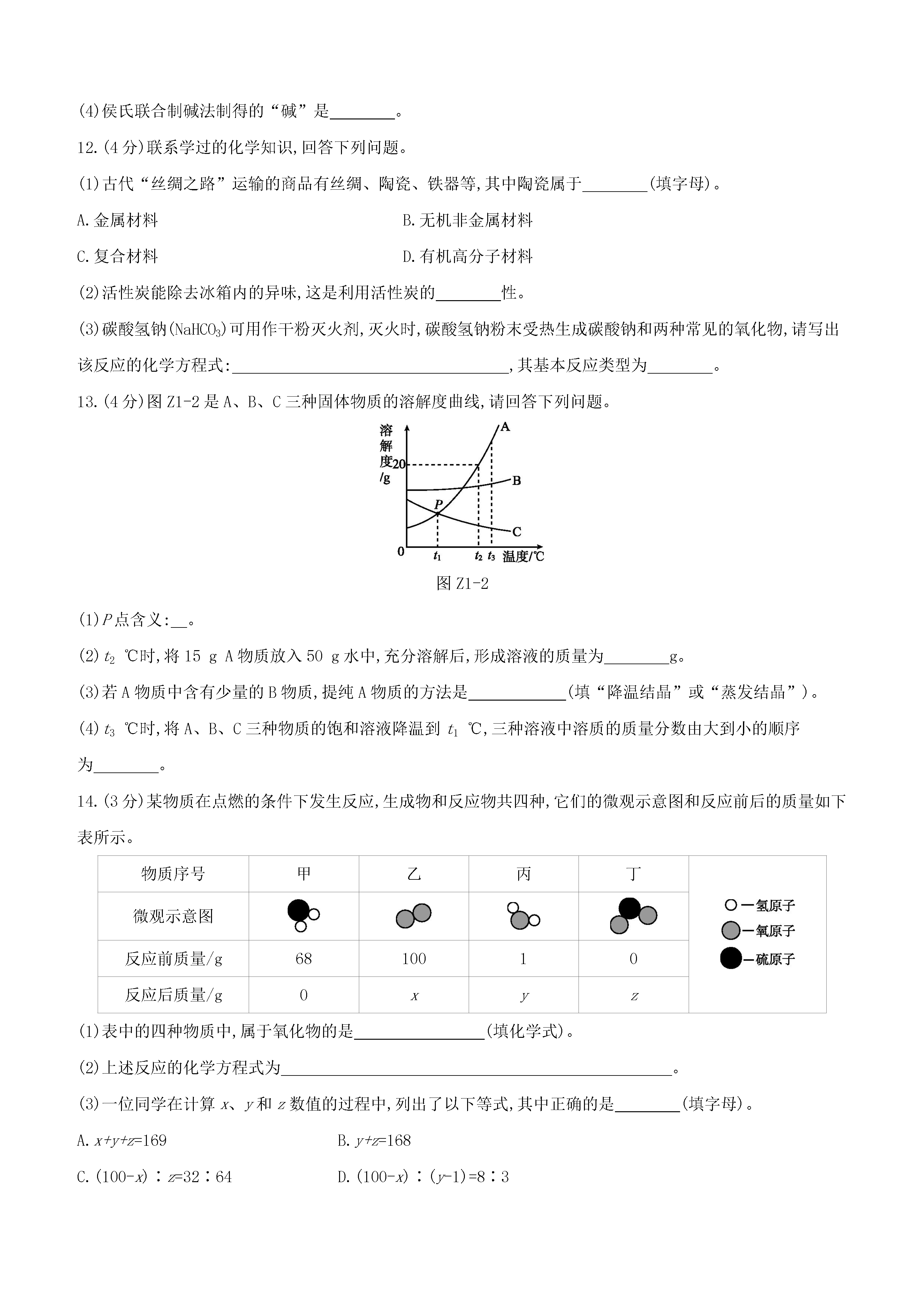 综合测试(一)[满分:60分限时:60分钟]题号一二总分总分人核分人得分可能用到的相对原子质量:H-1C-12O-16Na-23S-32Cl-35.5Ca-40Fe-56Zn-65第一部分(选择题20分)一、选择题(本题共10小题。每小题2分,共20分。每小题只有一个选项符合题意)1.下列四个短语中,其原意一定包含化学变化的是()A.海市蜃楼B.木已成舟C.蜡炬成灰D.叶落归根2.生活习惯直接影响人体健康。小明同学一家人的下列饮食习惯科学合理的是()A.小明长期偏食“洋快餐”B.奶奶不忍浪费,即使食物霉变仍然食用C.妈妈为了保持身材,只吃蔬菜和水果D.爸爸喜爱运动,大量出汗后常饮用含无机盐的饮料3.下列化学肥料属于磷肥的是()A.CO(NH2)2B.KClC.Ca3(PO4)2D.KNO34.漂白粉的有效成分次氯酸钙[Ca(ClO)2]中氯元素的化合价是()A.-1B.0C.+1D.+55.图Z1-1所示的实验操作中,正确的是()图Z1-16.下列关于燃料的说法中,正确的是()A.石油是纯净物B.煤、石油、天然气和酒精都是化石燃料C.煤和石油的燃烧会造成空气污染D.只有通过燃料的燃烧才能获得热能7.紫甘蓝是大众爱吃的蔬菜,含有丰富的花青素,花青素遇酸性溶液变红色,遇碱性溶液变蓝色。在凉拌紫甘蓝丝时,观察到菜丝变成红色,可能是加入了下列哪种调味品()A.食盐B.味精C.食醋D.香油8.我国科学家屠哟哟因发现青蒿素(化学式C15H22O5)而获得诺贝尔奖。下列有关青蒿素的说法错误的是()A.属于有机物B.由碳、氢、氧三种元素组成C.氧元素的质量分数最高D.分子中C、H、O三种原子个数比为15∶22∶59.除去物质中的少量杂质,下列试剂或方法正确的是()选项物质杂质试剂或方法A氮气氧气通过灼热的炭粉B二氧化锰氯化钾加入适量的水溶解、过滤、蒸发C氧化钙碳酸钙高温煅烧D氯化钠溶液氯化铜加入过量的氢氧化钠溶液、过滤10.天平(灵敏度极高)两边各放质量相等的烧杯,分别盛有等质量、等质量分数的稀硫酸,此时天平平衡。将等质量的锌和铁分别放入两烧杯中,充分反应后,下列说法正确的是()A.若天平平衡,两边烧杯中所得溶液质量相等B.若天平平衡,两种金属一定都有剩余C.若天平不平衡,参加反应的金属质量可能不相等D.若天平不平衡,两种金属一定完全反应第二部分(非选择题共40分)二、非选择题(本题共8小题,共40分)11.(4分)在H、C、O、Na四种元素中,选择适当的元素组成符合下列要求的物质(填化学式)。(1)汽水中含有的酸是。(2)含氧量最高的氧化物是。(3)汽车驾驶员驾车前禁止饮用的物质是。(4)侯氏联合制碱法制得的“碱”是。12.(4分)联系学过的化学知识,回答下列问题。(1)古代“丝绸之路”运输的商品有丝绸、陶瓷、铁器等,其中陶瓷属于(填字母)。A.金属材料B.无机非金属材料C.复合材料D.有机高分子材料(2)活性炭能除去冰箱内的异味,这是利用活性炭的性。(3)碳酸氢钠(NaHCO3)可用作干粉灭火剂,灭火时,碳酸氢钠粉末受热生成碳酸钠和两种常见的氧化物,请写出该反应的化学方程式:,其基本反应类型为。13.(4分)图Z1-2是A、B、C三种固体物质的溶解度曲线,请回答下列问题。图Z1-2(1)P点含义:。(2)t2℃时,将15gA物质放入50g水中,充分溶解后,形成溶液的质量为g。(3)若A物质中含有少量的B物质,提纯A物质的方法是(填“降温结晶”或“蒸发结晶”)。(4)t3℃时,将A、B、C三种物质的饱和溶液降温到t1℃,三种溶液中溶质的质量分数由大到小的顺序为。14.(3分)某物质在点燃的条件下发生反应,生成物和反应物共四种,它们的微观示意图和反应前后的质量如下表所示。物质序号甲乙丙丁微观示意图反应前质量/g6810010反应后质量/g0xyz(1)表中的四种物质中,属于氧化物的是(填化学式)。(2)上述反应的化学方程式为。(3)一位同学在计算x、y和z数值的过程中,列出了以下等式,其中正确的是(填字母)。A.x+y+z=169B.y+z=168C.(100-x)∶z=32∶64D.(100-x)∶(y-1)=8∶315.(5分)硅酸钠(Na2SiO3)是我国优先发展的精细化学品。用某种石英砂矿石(主要成分是SiO2,还含有少量的CuO、Na2SO4、Na2CO3)制备硅酸钠(Na2SiO3)的流程如下:图Z1-3资料:SiO2既不溶于水,也不与盐酸反应。请回答下列问题。(1)“研磨”的目的是。(2)检验“洗涤a”已洗净的方法是。(3)“酸浸”的化学方程
