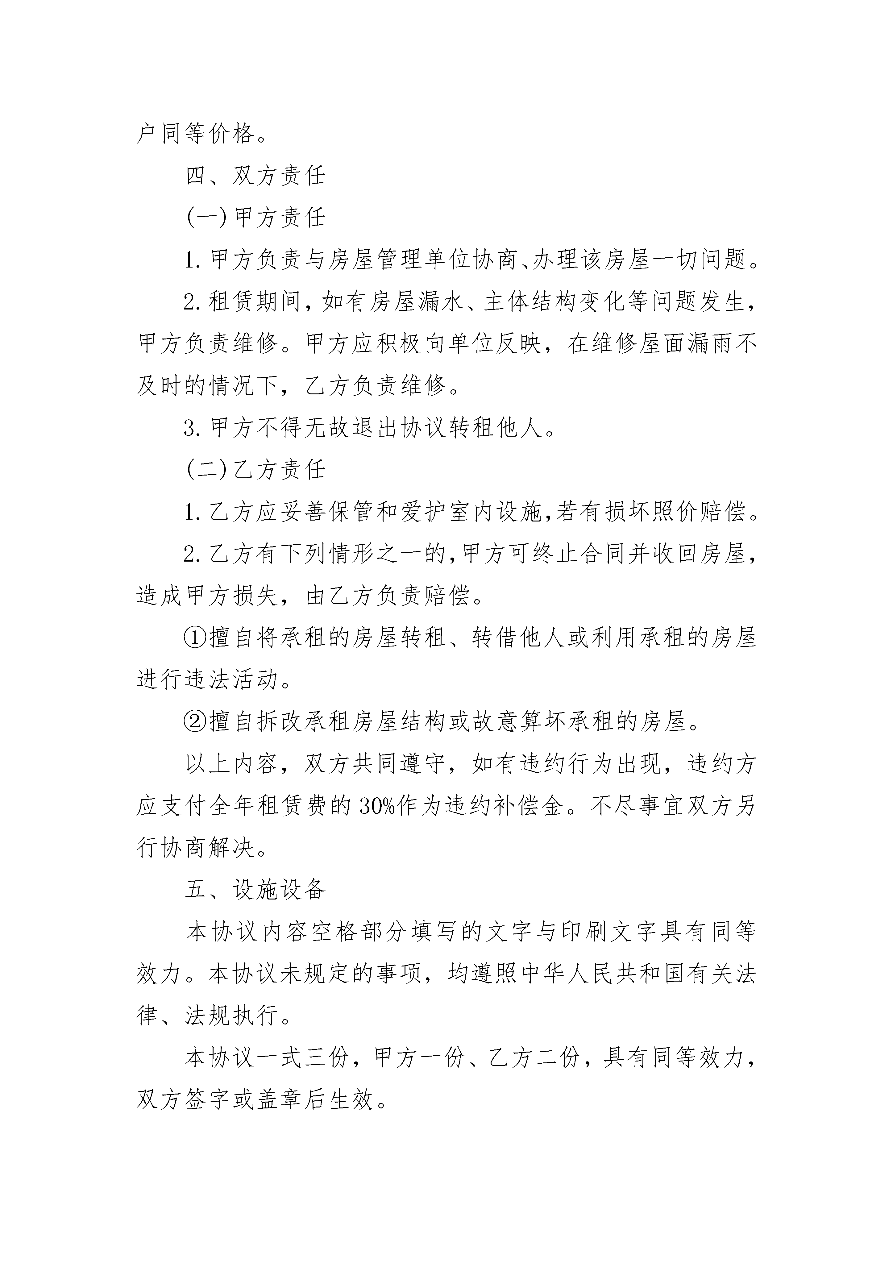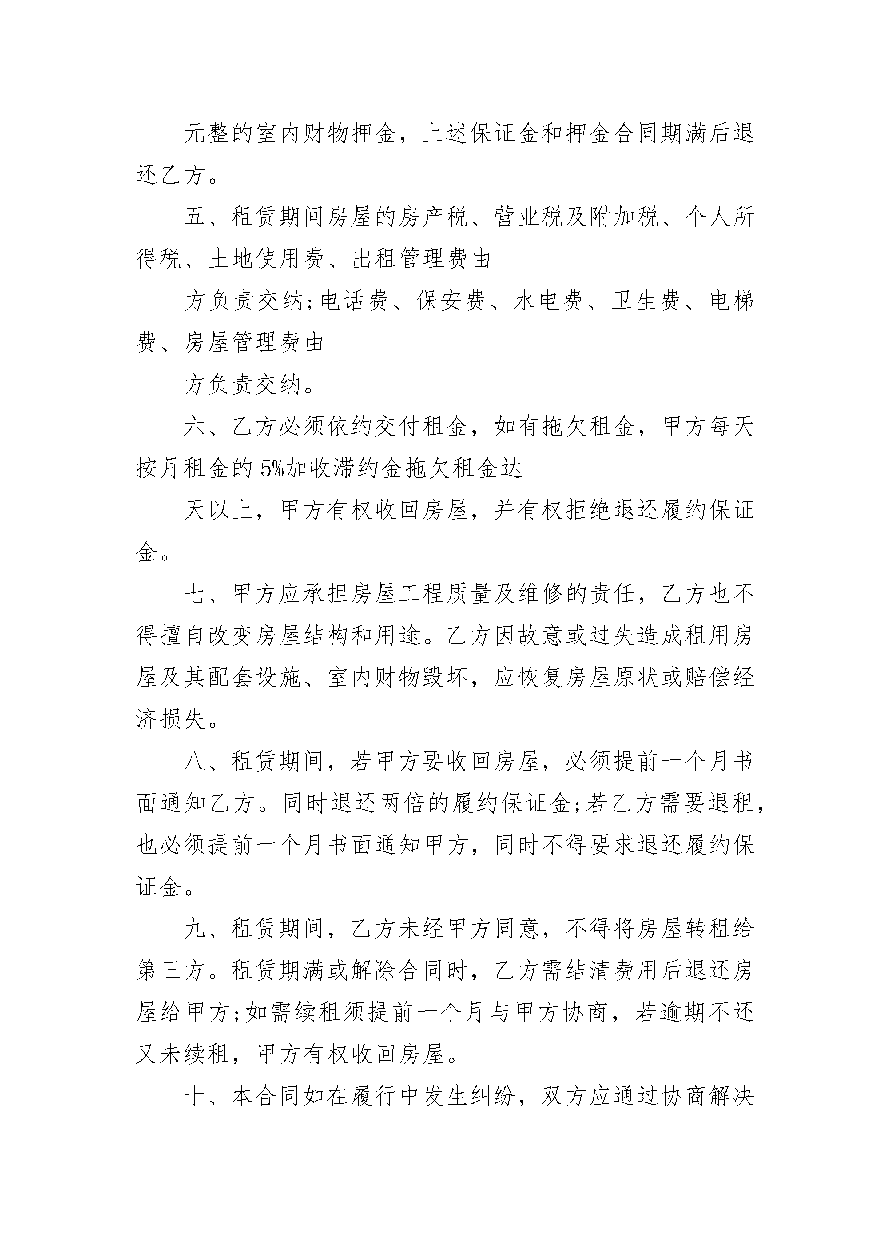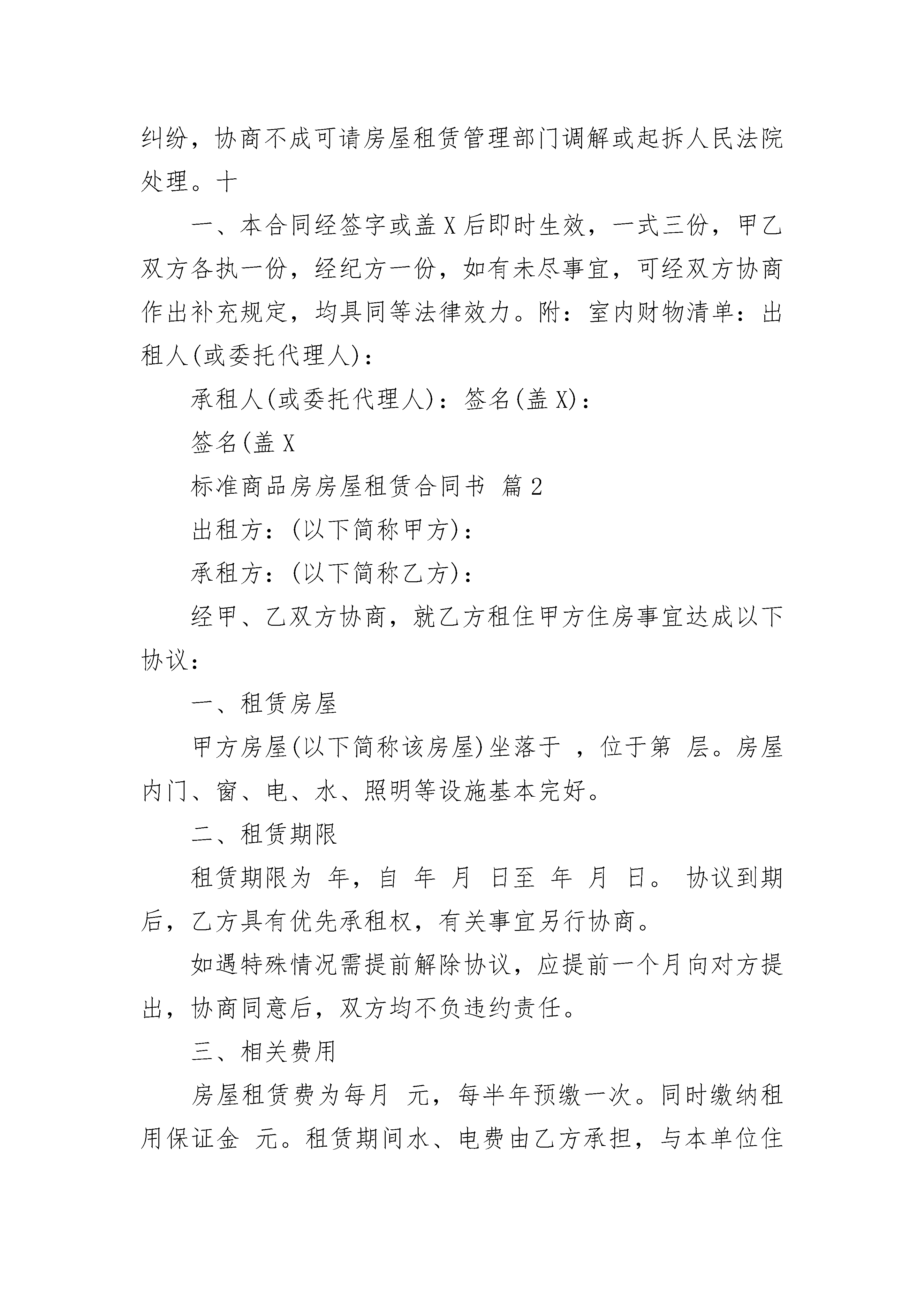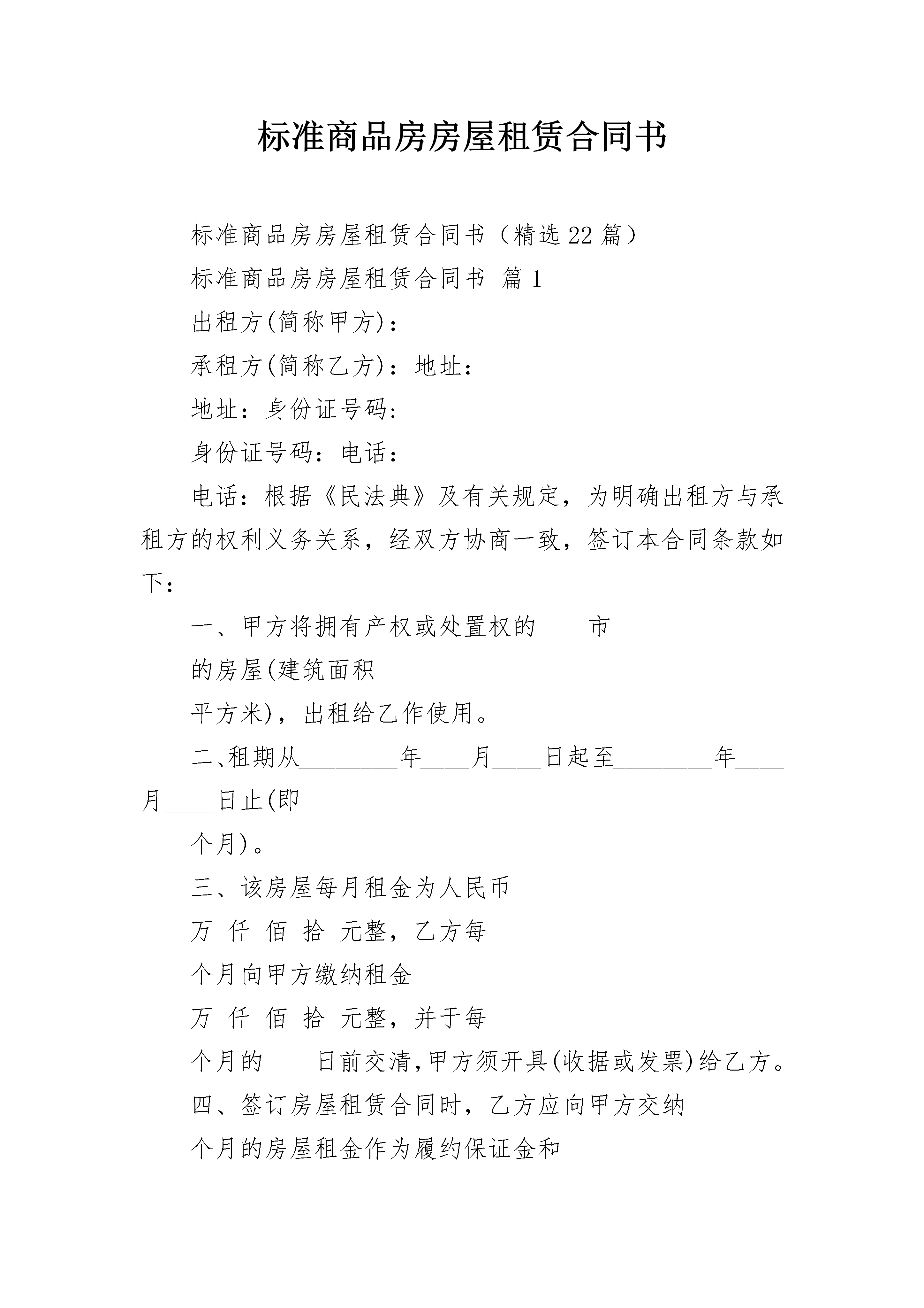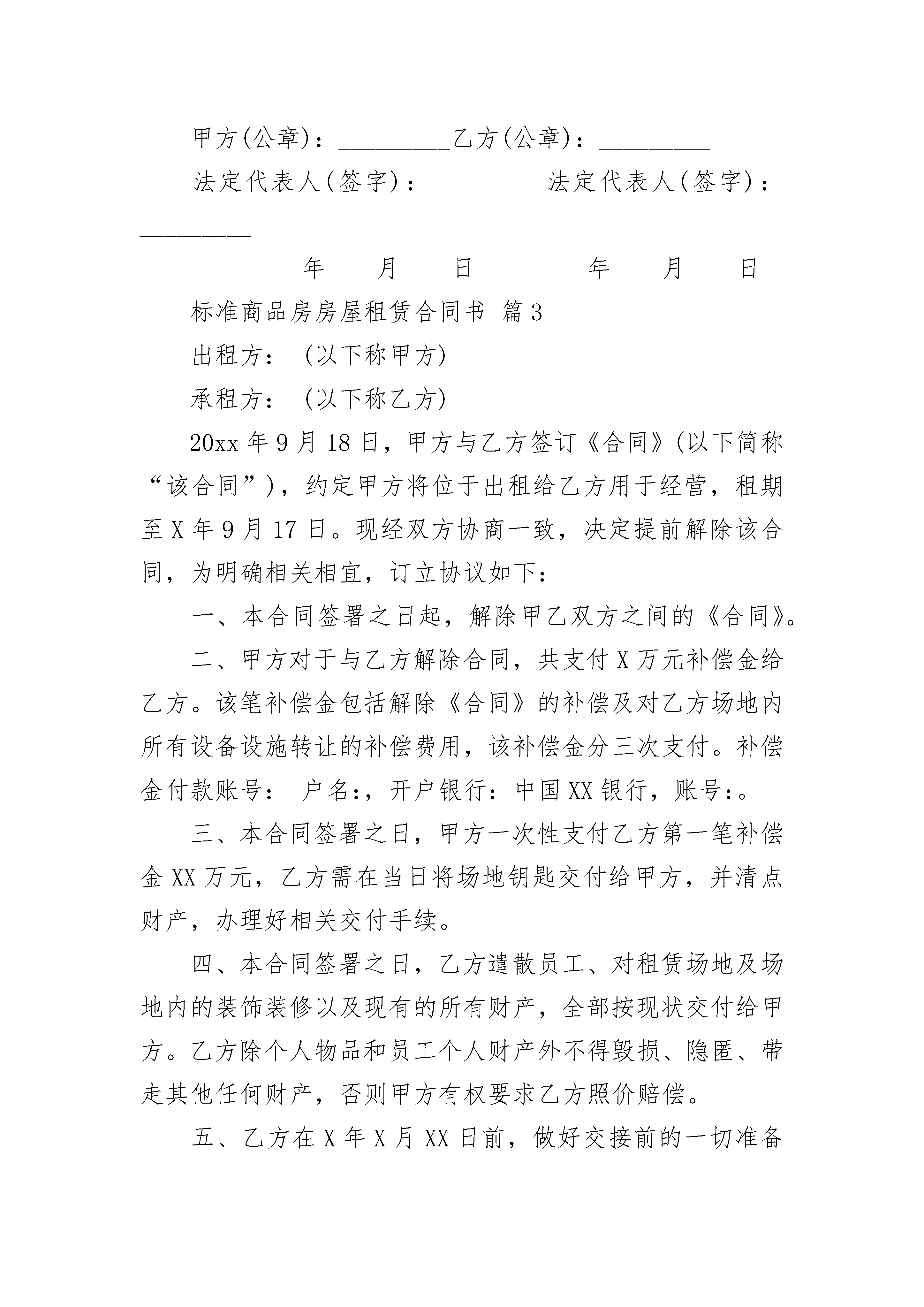 标准商品房房屋租赁合同书标准商品房房屋租赁合同书(精选22篇)标准商品房房屋租赁合同书篇1出租方(简称甲方):承租方(简称乙方):地址:地址:身份证号码:身份证号码:电话:电话:根据《民法典》及有关规定,为明确出租方与承租方的权利义务关系,经双方协商一致,签订本合同条款如下:一、甲方将拥有产权或处置权的____市的房屋(建筑面积平方米),出租给乙作使用。二、租期从________年____月____日起至________年____月____日止(即个月)。三、该房屋每月租金为人民币万仟佰拾元整,乙方每个月向甲方缴纳租金万仟佰拾元整,并于每个月的____日前交清,甲方须开具(收据或发票)给乙方。四、签订房屋租赁合同时,乙方应向甲方交纳个月的房屋租金作为履约保证金和元整的室内财物押金,上述保证金和押金合同期满后退还乙方。五、租赁期间房屋的房产税、营业税及附加税、个人所得税、土地使用费、出租管理费由方负责交纳;电话费、保安费、水电费、卫生费、电梯费、房屋管理费由方负责交纳。六、乙方必须依约交付租金,如有拖欠租金,甲方每天按月租金的5%加收滞约金拖欠租金达天以上,甲方有权收回房屋,并有权拒绝退还履约保证金。七、甲方应承担房屋工程质量及维修的责任,乙方也不得擅自改变房屋结构和用途。乙方因故意或过失造成租用房屋及其配套设施、室内财物毁坏,应恢复房屋原状或赔偿经济损失。八、租赁期间,若甲方要收回房屋,必须提前一个月书面通知乙方。同时退还两倍的履约保证金;若乙方需要退租,也必须提前一个月书面通知甲方,同时不得要求退还履约保证金。九、租赁期间,乙方未经甲方同意,不得将房屋转租给第三方。租赁期满或解除合同时,乙方需结清费用后退还房屋给甲方;如需续租须提前一个月与甲方协商,若逾期不还又未续租,甲方有权收回房屋。十、本合同如在履行中发生纠纷,双方应通过协商解决纠纷,协商不成可请房屋租赁管理部门调解或起拆人民法院处理。十一、本合同经签字或盖X后即时生效,一式三份,甲乙双方各执一份,经纪方一份,如有未尽事宜,可经双方协商作出补充规定,均具同等法律效力。附:室内财物清单:出租人(或委托代理人):承租人(或委托代理人):签名(盖X):签名(盖X标准商品房房屋租赁合同书篇2出租方:(以下简称甲方):承租方:(以下简称乙方):经甲、乙双方协商,就乙方租住甲方住房事宜达成以下协议:一、租赁房屋甲方房屋(以下简称该房屋)坐落于,位于第层。房屋内门、窗、电、水、照明等设施基本完好。二、租赁期限租赁期限为年,自年月日至年月日。协议到期后,乙方具有优先承租权,有关事宜另行协商。如遇特殊情况需提前解除协议,应提前一个月向对方提出,协商同意后,双方均不负违约责任。三、相关费用房屋租赁费为每月元,每半年预缴一次。同时缴纳租用保证金元。租赁期间水、电费由乙方承担,与本单位住户同等价格。四、双方责任(一)甲方责任1.甲方负责与房屋管理单位协商、办理该房屋一切问题。2.租赁期间,如有房屋漏水、主体结构变化等问题发生,甲方负责维修。甲方应积极向单位反映,在维修屋面漏雨不及时的情况下,乙方负责维修。3.甲方不得无故退出协议转租他人。(二)乙方责任1.乙方应妥善保管和爱护室内设施,若有损坏照价赔偿。2.乙方有下列情形之一的,甲方可终止合同并收回房屋,造成甲方损失,由乙方负责赔偿。①擅自将承租的房屋转租、转借他人或利用承租的房屋进行违法活动。②擅自拆改承租房屋结构或故意算坏承租的房屋。以上内容,双方共同遵守,如有违约行为出现,违约方应支付全年租赁费的30%作为违约补偿金。不尽事宜双方另行协商解决。五、设施设备本协议内容空格部分填写的文字与印刷文字具有同等效力。本协议未规定的事项,均遵照中华人民共和国有关法律、法规执行。本协议一式三份,甲方一份、乙方二份,具有同等效力,双方签字或盖章后生效。甲方(公章):_________乙方(公章):_________法定代表人(签字):_________法定代表人(签字):__________________年____月____日_________年____月____日标准商品房房屋租赁合同书篇3出租方:(以下称甲方)承租方:(以下称乙方)20xx年9月18日,甲方与乙方签订《合同》(以下简称“该合同”),约定甲方将位于出租给乙方用于经营,租期至X年9月17日。现经双方协商一致,决定提前解除该合同,为明确相关相宜,订立协议如下:一、本合同签署之日起,解除甲乙双方之间的《合同》。二、甲方对于与乙方解除合同,共支付X万元补偿金给乙方。该笔补偿金包括解除《合同》的补偿及对乙方场地内所有设备设施转让的补偿费用,该补偿金分三次支付。补偿金付款账号:户名:,开户银行:中国XX银行,账号:。三、本合同签署之日,甲方一次性支付乙方第一笔补偿金XX万元,乙方需在当日将场