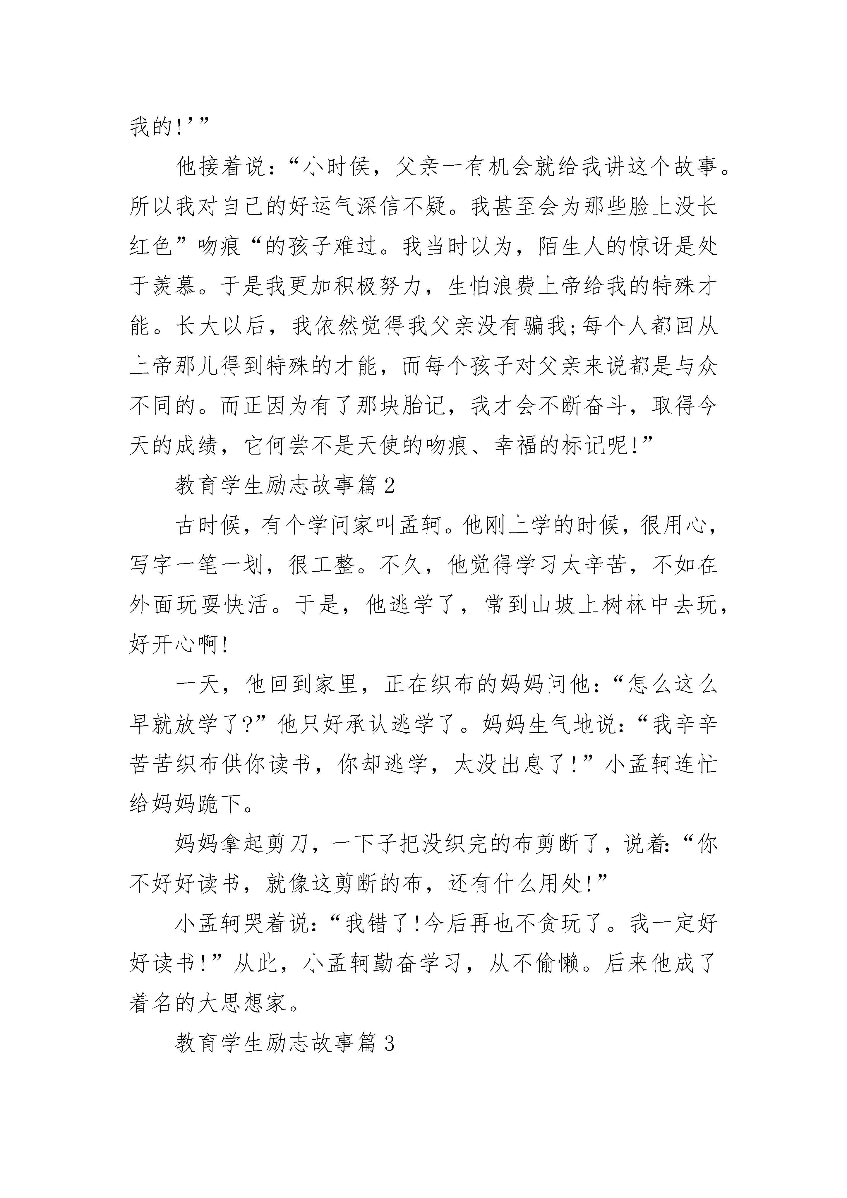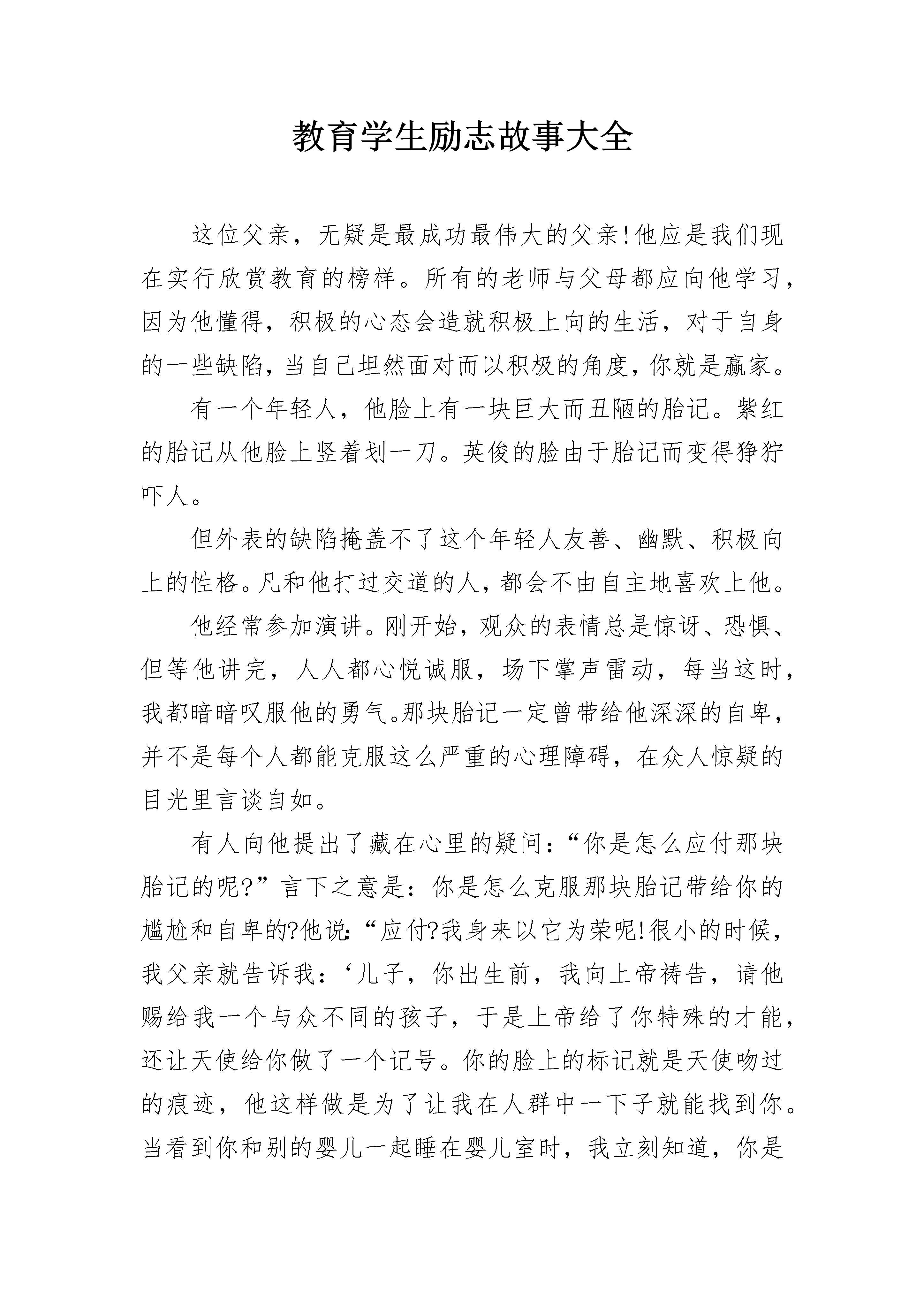 教育学生励志故事大全这位父亲,无疑是最成功最伟大的父亲!他应是我们现在实行欣赏教育的榜样。所有的老师与父母都应向他学习,因为他懂得,积极的心态会造就积极上向的生活,对于自身的一些缺陷,当自己坦然面对而以积极的角度,你就是赢家。有一个年轻人,他脸上有一块巨大而丑陋的胎记。紫红的胎记从他脸上竖着划一刀。英俊的脸由于胎记而变得狰狞吓人。但外表的缺陷掩盖不了这个年轻人友善、幽默、积极向上的性格。凡和他打过交道的人,都会不由自主地喜欢上他。他经常参加演讲。刚开始,观众的表情总是惊讶、恐惧、但等他讲完,人人都心悦诚服,场下掌声雷动,每当这时,我都暗暗叹服他的勇气。那块胎记一定曾带给他深深的自卑,并不是每个人都能克服这么严重的心理障碍,在众人惊疑的目光里言谈自如。有人向他提出了藏在心里的疑问:“你是怎么应付那块胎记的呢?”言下之意是:你是怎么克服那块胎记带给你的尴尬和自卑的?他说:“应付?我身来以它为荣呢!很小的时候,我父亲就告诉我:‘儿子,你出生前,我向上帝祷告,请他赐给我一个与众不同的孩子,于是上帝给了你特殊的才能,还让天使给你做了一个记号。你的脸上的标记就是天使吻过的痕迹,他这样做是为了让我在人群中一下子就能找到你。当看到你和别的婴儿一起睡在婴儿室时,我立刻知道,你是我的!’”他接着说:“小时侯,父亲一有机会就给我讲这个故事。所以我对自己的好运气深信不疑。我甚至会为那些脸上没长红色”吻痕“的孩子难过。我当时以为,陌生人的惊讶是处于羡慕。于是我更加积极努力,生怕浪费上帝给我的特殊才能。长大以后,我依然觉得我父亲没有骗我;每个人都回从上帝那儿得到特殊的才能,而每个孩子对父亲来说都是与众不同的。而正因为有了那块胎记,我才会不断奋斗,取得今天的成绩,它何尝不是天使的吻痕、幸福的标记呢!”教育学生励志故事篇2古时候,有个学问家叫孟轲。他刚上学的时候,很用心,写字一笔一划,很工整。不久,他觉得学习太辛苦,不如在外面玩耍快活。于是,他逃学了,常到山坡上树林中去玩,好开心啊!一天,他回到家里,正在织布的妈妈问他:“怎么这么早就放学了?”他只好承认逃学了。妈妈生气地说:“我辛辛苦苦织布供你读书,你却逃学,太没出息了!”小孟轲连忙给妈妈跪下。妈妈拿起剪刀,一下子把没织完的布剪断了,说着:“你不好好读书,就像这剪断的布,还有什么用处!”小孟轲哭着说:“我错了!今后再也不贪玩了。我一定好好读书!”从此,小孟轲勤奋学习,从不偷懒。后来他成了着名的大思想家。教育学生励志故事篇3阳光明媚的夏天,一只胸怀大志的青蛙蹲在田埂上,做了一个十分重要的决定:要爬上河边那棵最高的柳树,看看夏天最美丽的风景。知道了这只青蛙爬树的志向后,所有的青蛙都向它投来了羡慕和尊敬的目光,因为它们知道这是一只多么优秀的青蛙,而它们又是多么地信任它。这只青蛙选中位置就往树上跳了,其他所有的青蛙都鼓着眼睛拭目以待。可是,这只青蛙大多是还没抱着树干就掉了下来;即使少数几次抱住了,又不知下一步怎么办,风一起,整个身子晃晃悠悠,一会又掉了下来,但是,这只青蛙还是一次又一次地向自己的目标冲刺着。蟋蟀看见这只鼻青脸肿的青蛙,惊奇地问道:“青蛙兄弟,你怎么老是往树上爬呀?”青蛙瞥了蟋蟀一眼,回答道:“我要看夏天美丽的风景,我要改变青蛙不会爬树的命运!”燕子飞过来,对青蛙说:“这树是你们青蛙能爬的吗?”青蛙上气不接下气地说:“我想我们能!”摔得快死的时候,这只青蛙口里还不停地叫着:“爬树!爬树!”所有的青蛙都被这只青蛙的话和坚持不懈的精神深深地感染着,情绪一下子高涨起来;为了实现那只优秀青蛙的遗愿,许多青蛙陆续向河边的柳树跳去,跳去……于是,后来地球上有了一个新物种——树蛙。