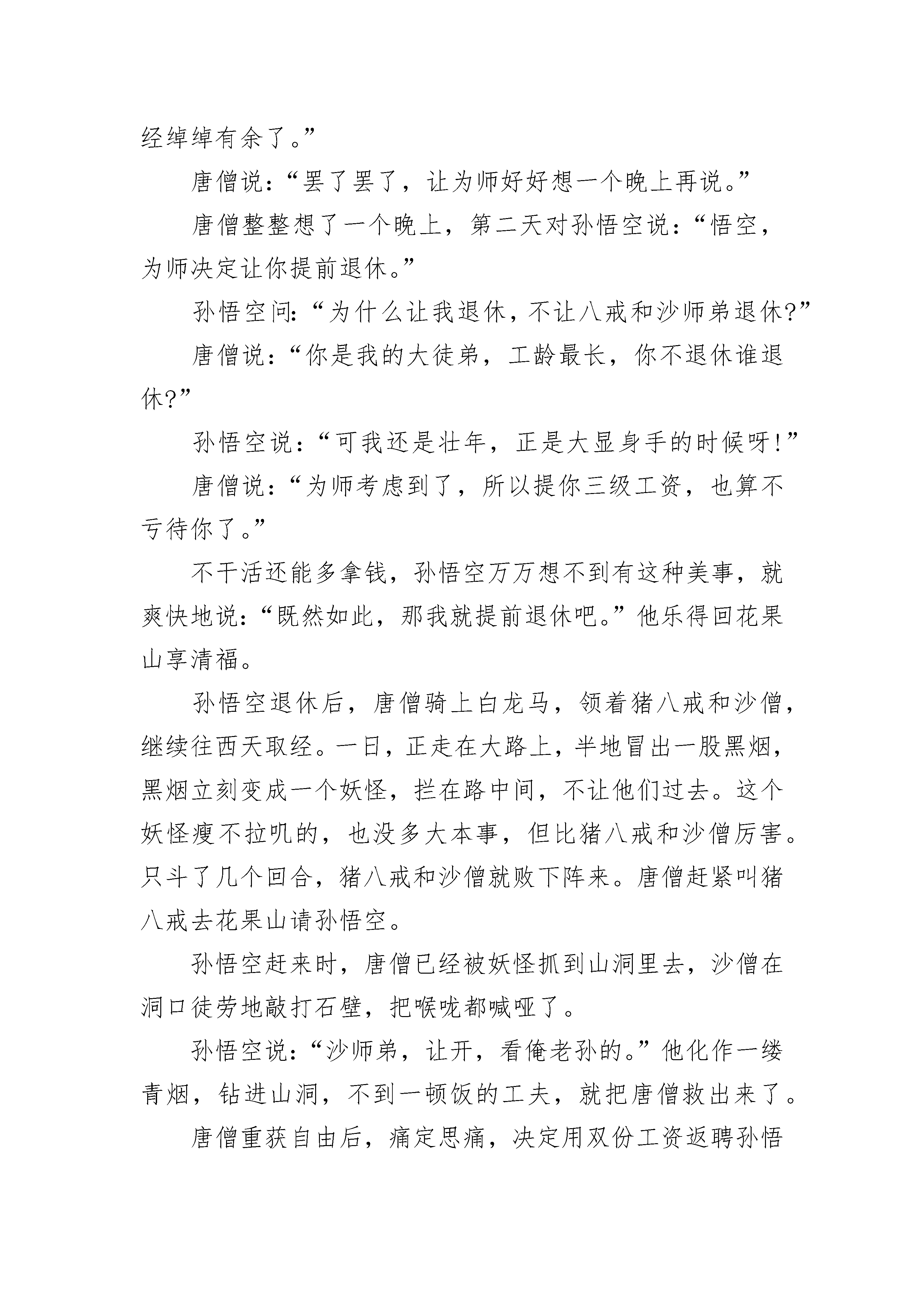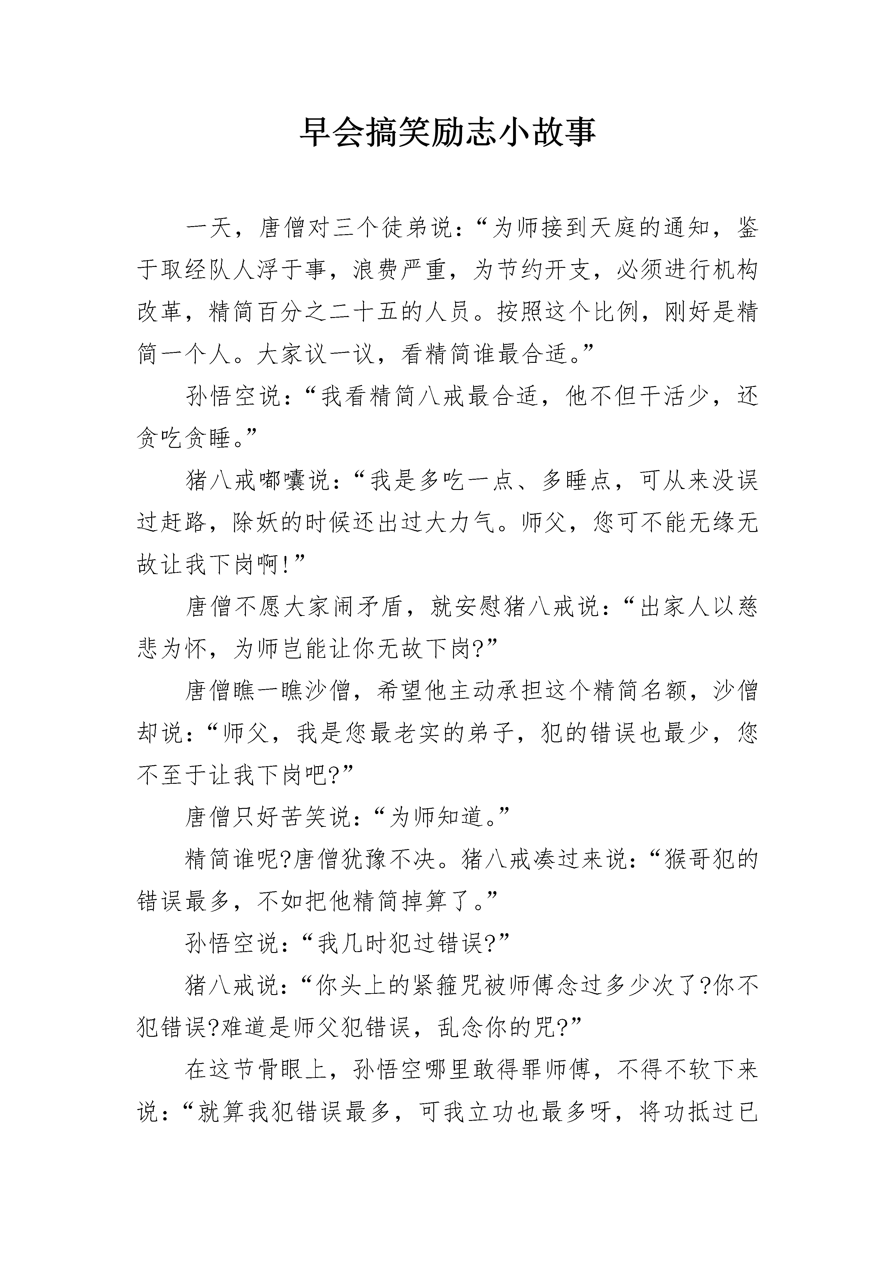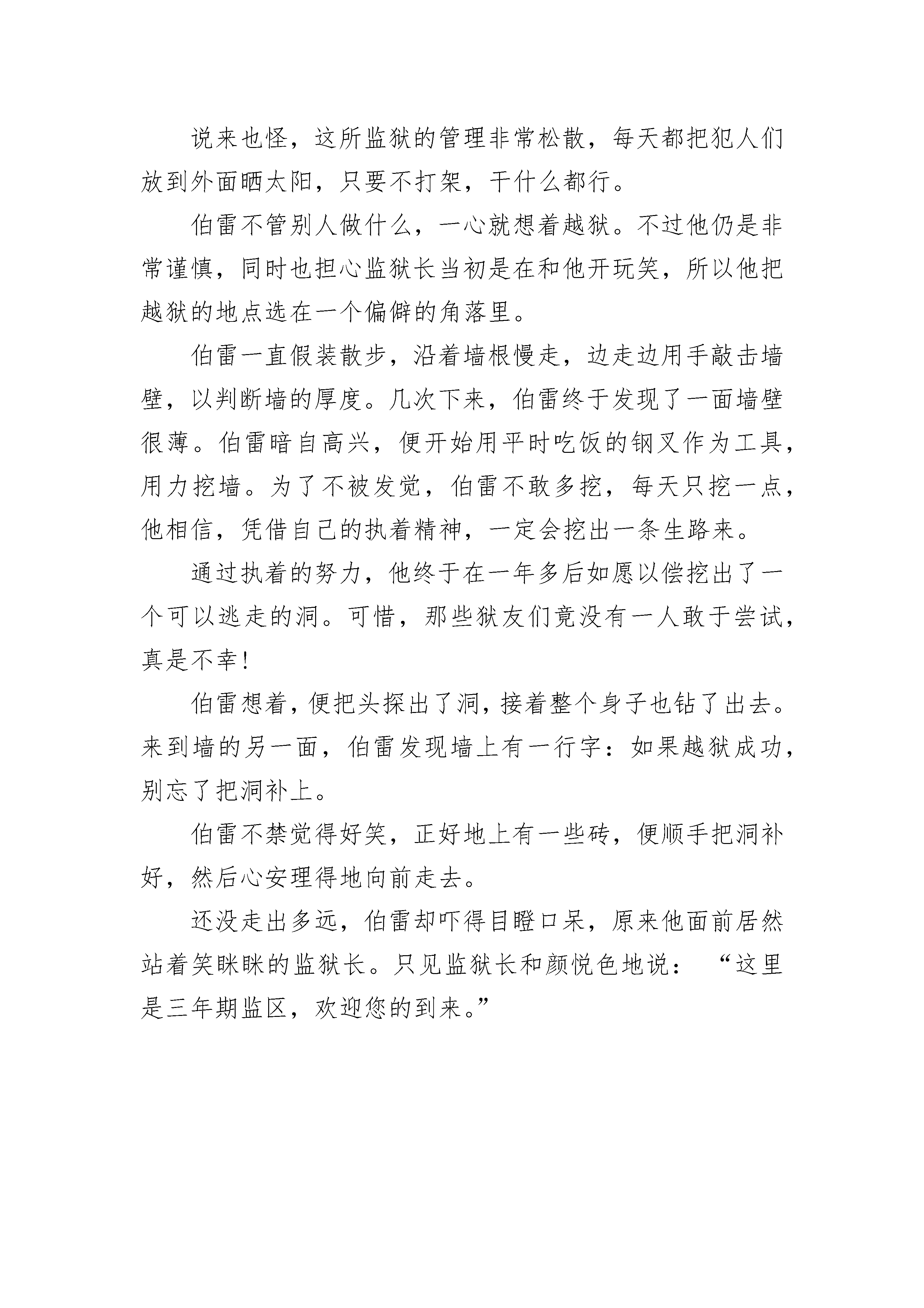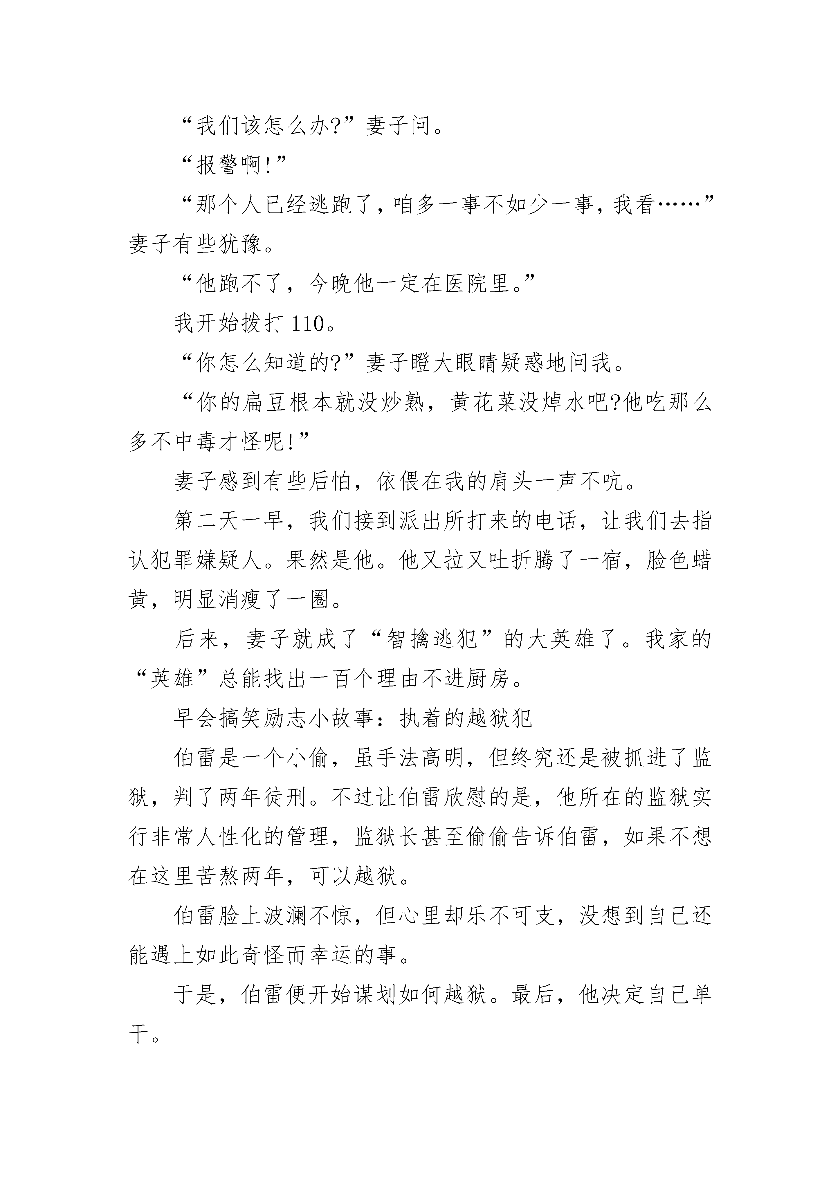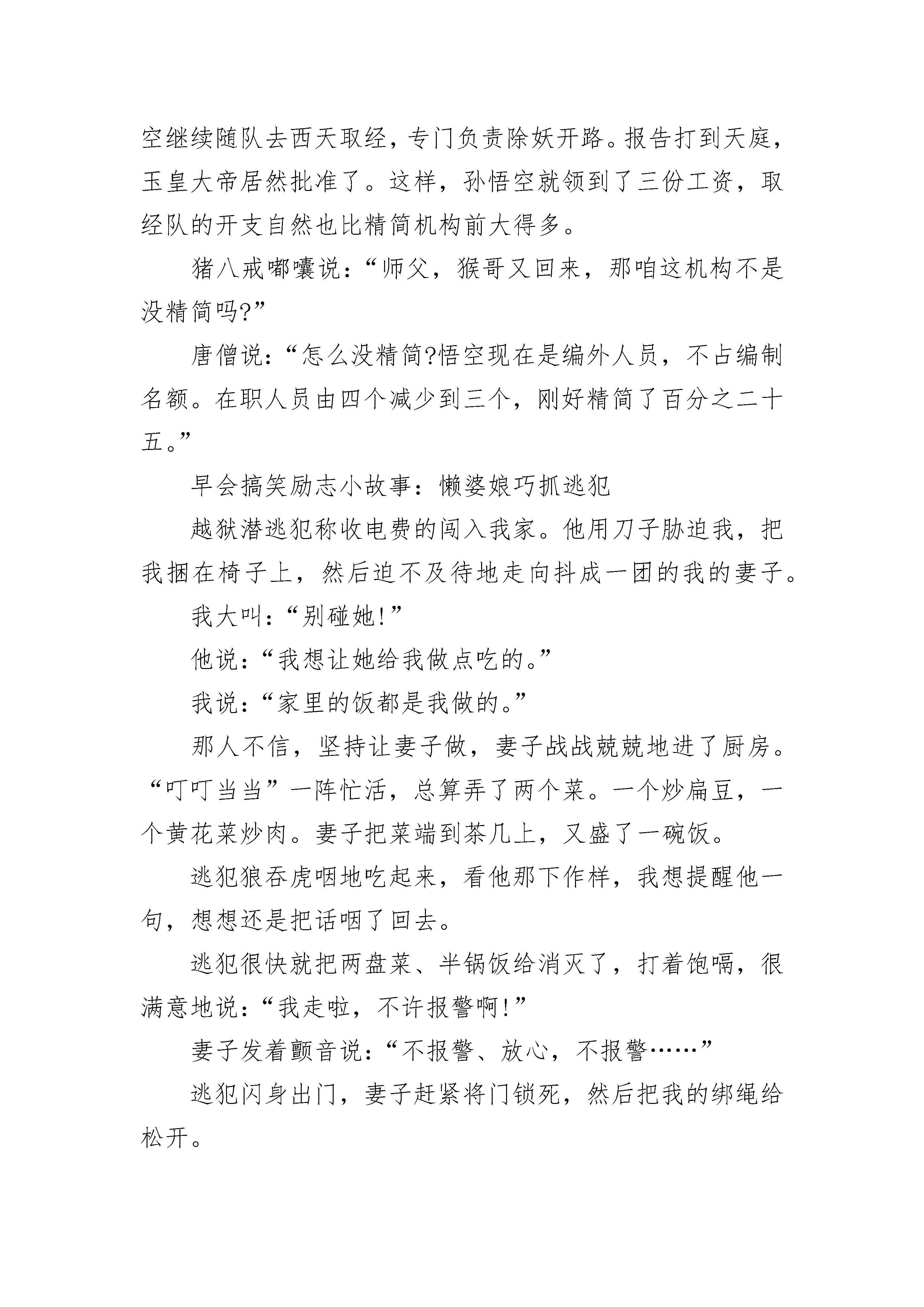 早会搞笑励志小故事一天,唐僧对三个徒弟说:“为师接到天庭的通知,鉴于取经队人浮于事,浪费严重,为节约开支,必须进行机构改革,精简百分之二十五的人员。按照这个比例,刚好是精简一个人。大家议一议,看精简谁最合适。”孙悟空说:“我看精简八戒最合适,他不但干活少,还贪吃贪睡。”猪八戒嘟囔说:“我是多吃一点、多睡点,可从来没误过赶路,除妖的时候还出过大力气。师父,您可不能无缘无故让我下岗啊!”唐僧不愿大家闹矛盾,就安慰猪八戒说:“出家人以慈悲为怀,为师岂能让你无故下岗?”唐僧瞧一瞧沙僧,希望他主动承担这个精简名额,沙僧却说:“师父,我是您最老实的弟子,犯的错误也最少,您不至于让我下岗吧?”唐僧只好苦笑说:“为师知道。”精简谁呢?唐僧犹豫不决。猪八戒凑过来说:“猴哥犯的错误最多,不如把他精简掉算了。”孙悟空说:“我几时犯过错误?”猪八戒说:“你头上的紧箍咒被师傅念过多少次了?你不犯错误?难道是师父犯错误,乱念你的咒?”在这节骨眼上,孙悟空哪里敢得罪师傅,不得不软下来说:“就算我犯错误最多,可我立功也最多呀,将功抵过已经绰绰有余了。”唐僧说:“罢了罢了,让为师好好想一个晚上再说。”唐僧整整想了一个晚上,第二天对孙悟空说:“悟空,为师决定让你提前退休。”孙悟空问:“为什么让我退休,不让八戒和沙师弟退休?”唐僧说:“你是我的大徒弟,工龄最长,你不退休谁退休?”孙悟空说:“可我还是壮年,正是大显身手的时候呀!”唐僧说:“为师考虑到了,所以提你三级工资,也算不亏待你了。”不干活还能多拿钱,孙悟空万万想不到有这种美事,就爽快地说:“既然如此,那我就提前退休吧。”他乐得回花果山享清福。孙悟空退休后,唐僧骑上白龙马,领着猪八戒和沙僧,继续往西天取经。一日,正走在大路上,半地冒出一股黑烟,黑烟立刻变成一个妖怪,拦在路中间,不让他们过去。这个妖怪瘦不拉叽的,也没多大本事,但比猪八戒和沙僧厉害。只斗了几个回合,猪八戒和沙僧就败下阵来。唐僧赶紧叫猪八戒去花果山请孙悟空。孙悟空赶来时,唐僧已经被妖怪抓到山洞里去,沙僧在洞口徒劳地敲打石壁,把喉咙都喊哑了。孙悟空说:“沙师弟,让开,看俺老孙的。”他化作一缕青烟,钻进山洞,不到一顿饭的工夫,就把唐僧救出来了。唐僧重获自由后,痛定思痛,决定用双份工资返聘孙悟空继续随队去西天取经,专门负责除妖开路。报告打到天庭,玉皇大帝居然批准了。这样,孙悟空就领到了三份工资,取经队的开支自然也比精简机构前大得多。猪八戒嘟囔说:“师父,猴哥又回来,那咱这机构不是没精简吗?”唐僧说:“怎么没精简?悟空现在是编外人员,不占编制名额。在职人员由四个减少到三个,刚好精简了百分之二十五。”早会搞笑励志小故事:懒婆娘巧抓逃犯越狱潜逃犯称收电费的闯入我家。他用刀子胁迫我,把我捆在椅子上,然后迫不及待地走向抖成一团的我的妻子。我大叫:“别碰她!”他说:“我想让她给我做点吃的。”我说:“家里的饭都是我做的。”那人不信,坚持让妻子做,妻子战战兢兢地进了厨房。“叮叮当当”一阵忙活,总算弄了两个菜。一个炒扁豆,一个黄花菜炒肉。妻子把菜端到茶几上,又盛了一碗饭。逃犯狼吞虎咽地吃起来,看他那下作样,我想提醒他一句,想想还是把话咽了回去。逃犯很快就把两盘菜、半锅饭给消灭了,打着饱嗝,很满意地说:“我走啦,不许报警啊!”妻子发着颤音说:“不报警、放心,不报警……”逃犯闪身出门,妻子赶紧将门锁死,然后把我的绑绳给松开。“我们该怎么办?”妻子问。“报警啊!”“那个人已经逃跑了,咱多一事不如少一事,我看……”妻子有些犹豫。“他跑不了,今晚他一定在医院里。”我开始拨打110。“你怎么知道的?”妻子瞪大眼睛疑惑地问我。“你的扁豆根本就没炒熟,黄花菜没焯水吧?他吃那么多不中毒才怪呢!”妻子感到有些后怕,依偎在我的肩头一声不吭。第二天一早,我们接到派出所打来的电话,让我们去指认犯罪嫌疑人。果然是他。他又拉又吐折腾了一宿,脸色蜡黄,明显消瘦了一圈。后来,妻子就成了“智擒逃犯”的大英雄了。我家的“英雄”总能找出一百个理由不进厨房。早会搞笑励志小故事:执着的越狱犯伯雷是一个小偷,虽手法高明,但终究还是被抓进了监狱,判了两年徒刑。不过让伯雷欣慰的是,他所在的监狱实行非常人性化的管理,监狱长甚至偷偷告诉伯雷,如果不想在这里苦熬两年,可以越狱。伯雷脸上波澜不惊,但心里却乐不可支,没想到自己还能遇上如此奇怪而幸运的事。于是,伯雷便开始谋划如何越狱。最后,他决定自己单干。说来也怪,这所监狱的管理非常松散,每天都把犯人们放到外面晒太阳,只要不打架,干什么都行。伯雷不管别人做什么,一心就想着越狱。不过他仍是非常谨慎,同时也担心监狱长当初是在和他开玩笑,所以他把越狱的地点选在一个偏僻的角落里。伯雷一直假装散步,沿着墙根慢走,边走边用手敲击墙壁,以判断墙的厚度。几次下来,伯雷终于发现了一面墙壁很薄。伯雷