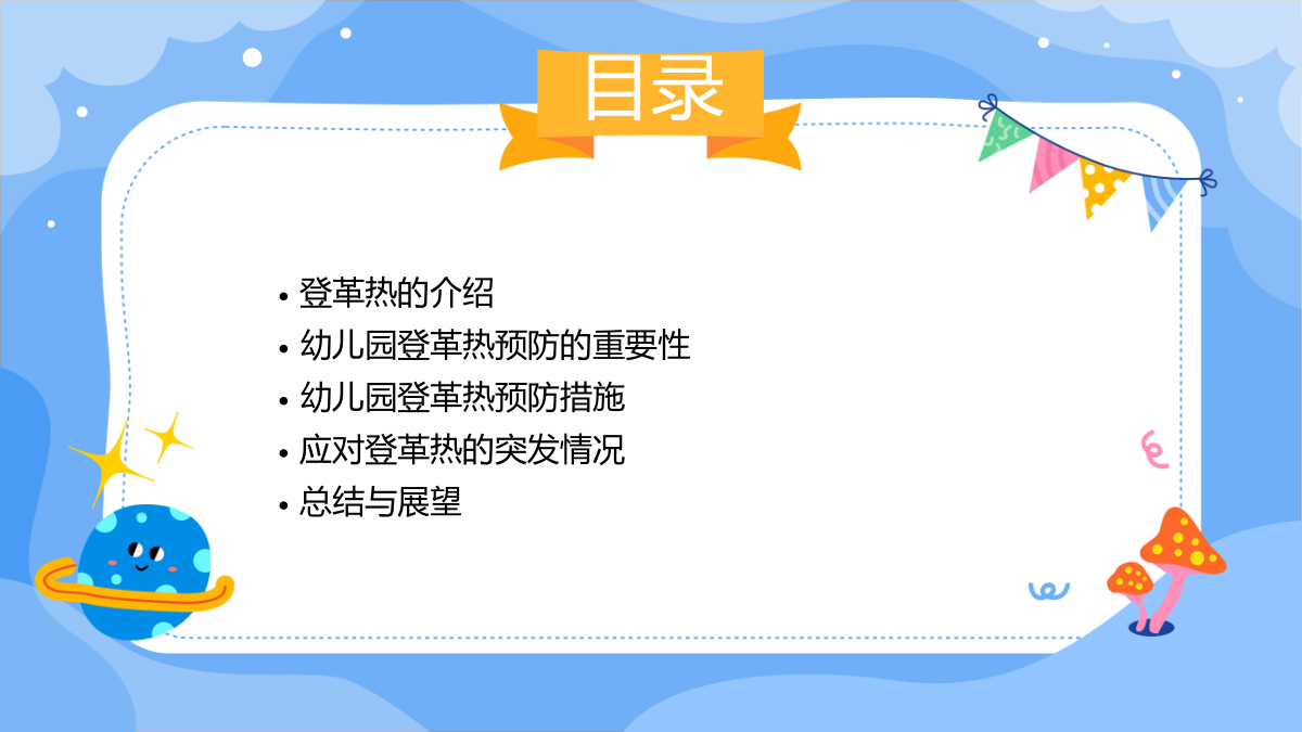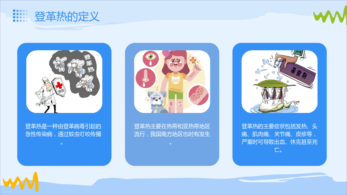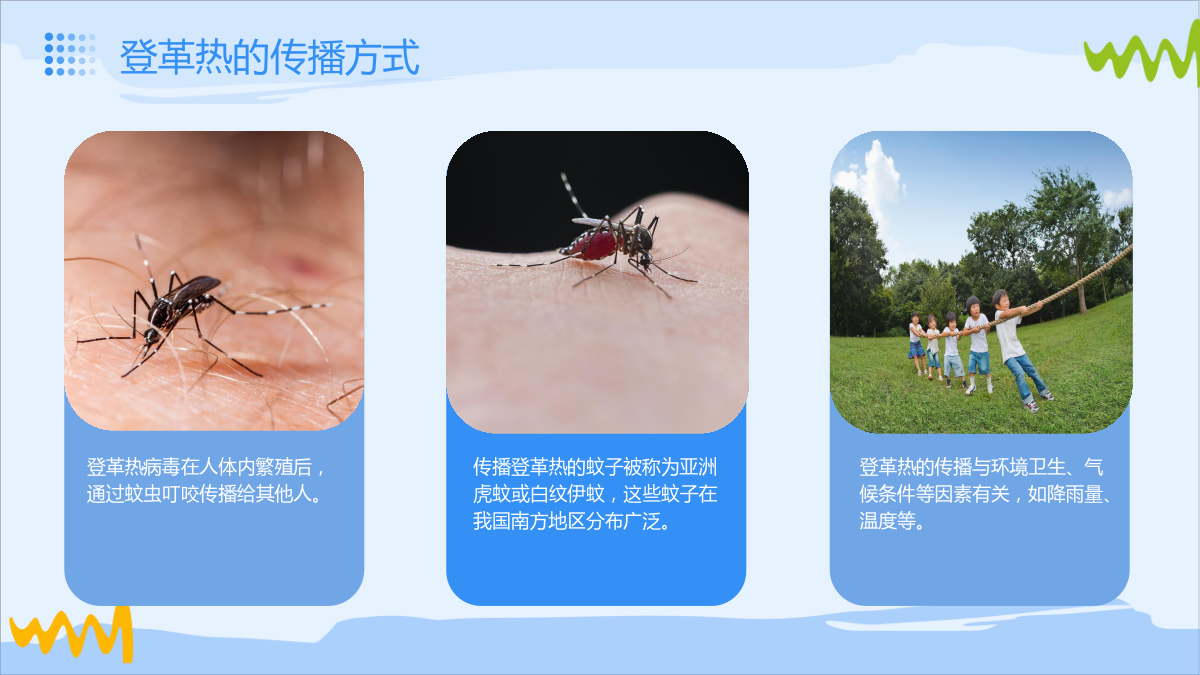 幼儿园登革热预防小班目录0102登革热是一种由蚊子传播的病毒性疾病,幼儿由于身体免疫系统尚未完全发育,容易感染登革热病毒。预防登革热是保障幼儿身体健康的重要措施。家长将孩子送到幼儿园后,最关心的是孩子的健康安全。预防登革热可以减轻家长对幼儿健康的担忧,增强家长对幼儿园的信任。03确保幼儿园内的窗户、门等通风口经常打开,保持室内空气流通。0405完善预防措施感谢观看