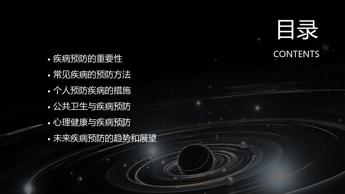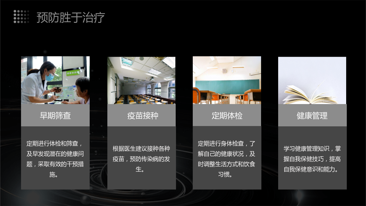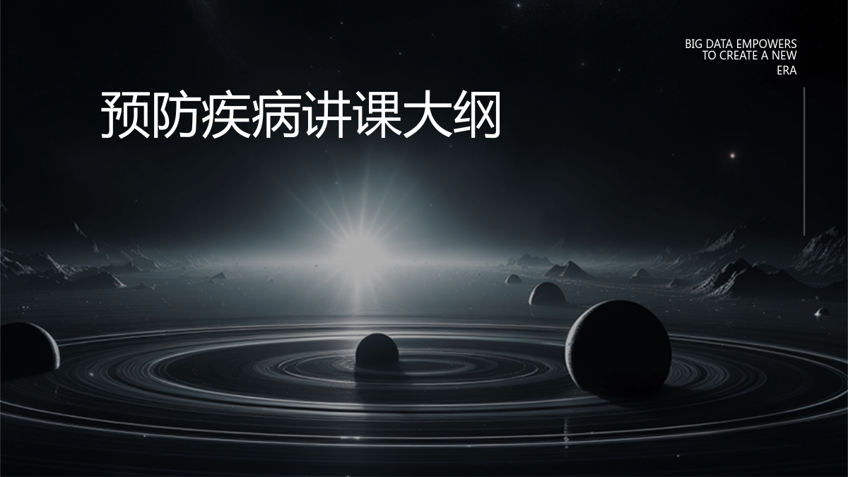 预防疾病讲课大纲目录BIGDATAEMPOWERSTOCREATEANEWERA减少疾病发生BIGDATAEMPOWERSTOCREATEANEWERA接种疫苗BIGDATAEMPOWERSTOCREATEANEWERABIGDATAEMPOWERSTOCREATEANEWERA学校卫生规范BIGDATAEMPOWERSTOCREATEANEWERA心理健康状况与多种疾病的发生和发展密切相关,如心血管疾病、糖尿病和某些癌症等。保持心理健康有助于降低患病风险。BIGDATAEMPOWERSTOCREATEANEWERA