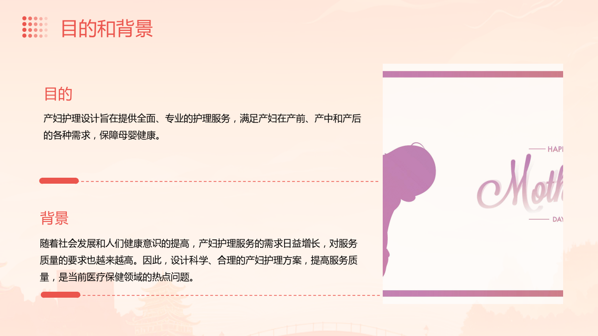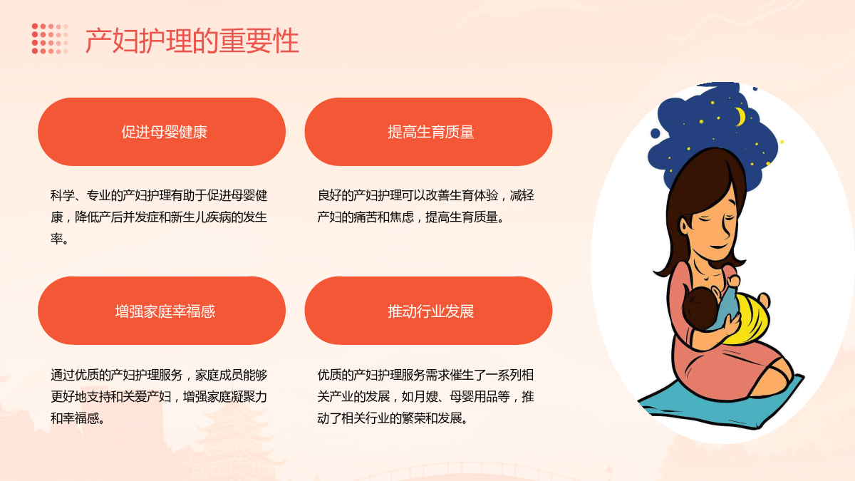 产妇护理设计目录PART目的PART保持清洁卫生PARTPARTPART将护理服务延伸至社区层面,为产妇提供更加便捷和全面的护理服务。例如,在社区内建立母婴护理中心,提供婴儿照护、产后修复等服务,方便产妇在社区内接受护理服务。THANKS