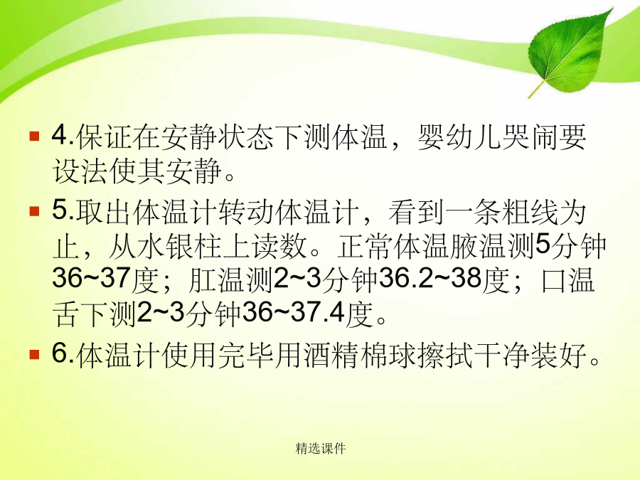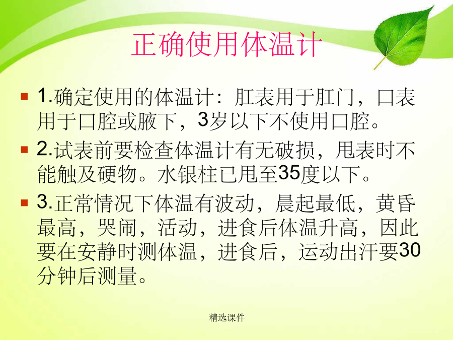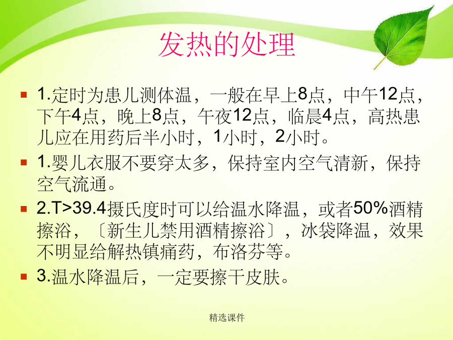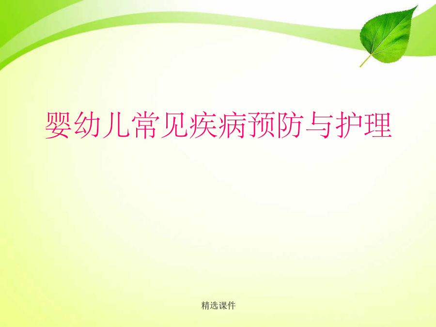 婴幼儿常见疾病预防与护理常见疾病护理原那么正确使用体温计发热的处理患病婴儿的饮食常见疾病的预防与护理痱子的预防与护理尿布疹预防与处理便秘便秘的信号便秘的调理腹痛的护理肠虫症也是婴儿腹痛的常见原因,如果按揉和热敷就会加重病情。急性阑尾炎是比较多见的一种。肠套叠多见于年龄较小的肥胖儿。鉴于婴儿腹痛病因比较复杂,婴儿又缺乏一定的表达能力,所以不要以疼痛的程度来推测病情,更不要盲目动手按揉互补,最好的方法是立即送医院就医。婴儿呕吐的护理喂奶后不要过早地翻动婴儿,最好把婴儿竖抱起来,轻轻拍打背部,打出几个“饱嗝〞再放回床上。生理性呕吐一般会随着婴儿月龄的增长和胃肠功能逐渐完善而慢慢好转。如果婴儿出生后24小时就开始呕吐,或吃后就吐,量较多,甚至呈喷射状,除呕吐外还伴有其他异常的病症体征,那么这是因生病引起的呕吐〔病理性呕吐〕,应及早送到医院进行治疗。水痘的预防和护理预防和护理的方法〔1〕、水痘不是必得的病,注射疫苗有良好的预防效果。〔2〕、多休息、多喝水,食物宜清淡,保持肠胃通畅。〔3〕、保持皮肤清洁健康,勤洗澡、勤换衣服,剪短指甲,引导婴儿不要用手搔抓。抓破后会留下疤痕,影响容貌,还可能引起溃疡或细菌感染。〔4〕、不要外出,以免传染别人。本卷须知:不要涂抹肤轻松类外用软膏;水痘继发感染,要及时上医院治疗。婴儿夜惊的护理婴儿鼻出血的简单护理急性上呼吸道感染的护理〔2〕休息环境要安静、舒适,注意保持室内空气新鲜。〔3〕让婴儿减少活动,注意休息。发热时应卧床休息,多饮开水。〔4〕保持鼻咽部通畅,及时去除分泌物,保持鼻孔周围皮肤清洁。〔5〕保持口腔清洁,防止口腔炎、溃疡的发生,每天用生理盐水漱口1-2次。〔6〕饮食以流食、半流食为好,如果用奶瓶吃奶易呛咳,可以用小勺喂。婴儿食欲不好或呕吐,可以适当增加喂奶的次数,每次量少一点。菜汁和蔬菜水包含维生素和矿物质,对疾病恢复有好处。腮腺炎的护理〔3〕保持口腔清洁,每天用盐水或复方硼酸液漱口,去除口腔内的食物残渣,防止发生继发性感染。〔4〕在医生指导下服药。可以用清热解毒、止痛消肿的中药涂敷在外部肿胀处。本卷须知:根据患病婴儿的具体情况确定,如果情形严重,马上送医院治疗。高热惊厥的家庭急救〔2〕用手指掐人中穴〔人中穴位于鼻唇沟上1/3与2/3交界处〕,将患儿头偏向一侧,以免痰液吸入气管引起窒息。用裹布的筷子或小木片塞在患儿的上下牙之间,以免咬伤舌头病保障通气。〔3〕婴儿抽风时,不能喂水,进食,以免误入气管发生窒息引起肺炎。家庭处理的同时最好先就近治疗。秋季腹泻的预防与护理哮喘患儿的家庭护理肠绞痛的护理腹泻的护理营养性疾病宏量营养素微量元素其他膳食成分营养障碍性疾病预防小儿单纯性肥胖营养性疾病的护理营养素缺乏性病维生素B2缺乏维生素B1缺乏维生素C缺乏叶酸缺乏维生素D缺乏性佝偻病维生素A缺乏维生素E缺乏维生素K缺乏碘缺乏锌缺乏婴幼儿五官的保健谢谢