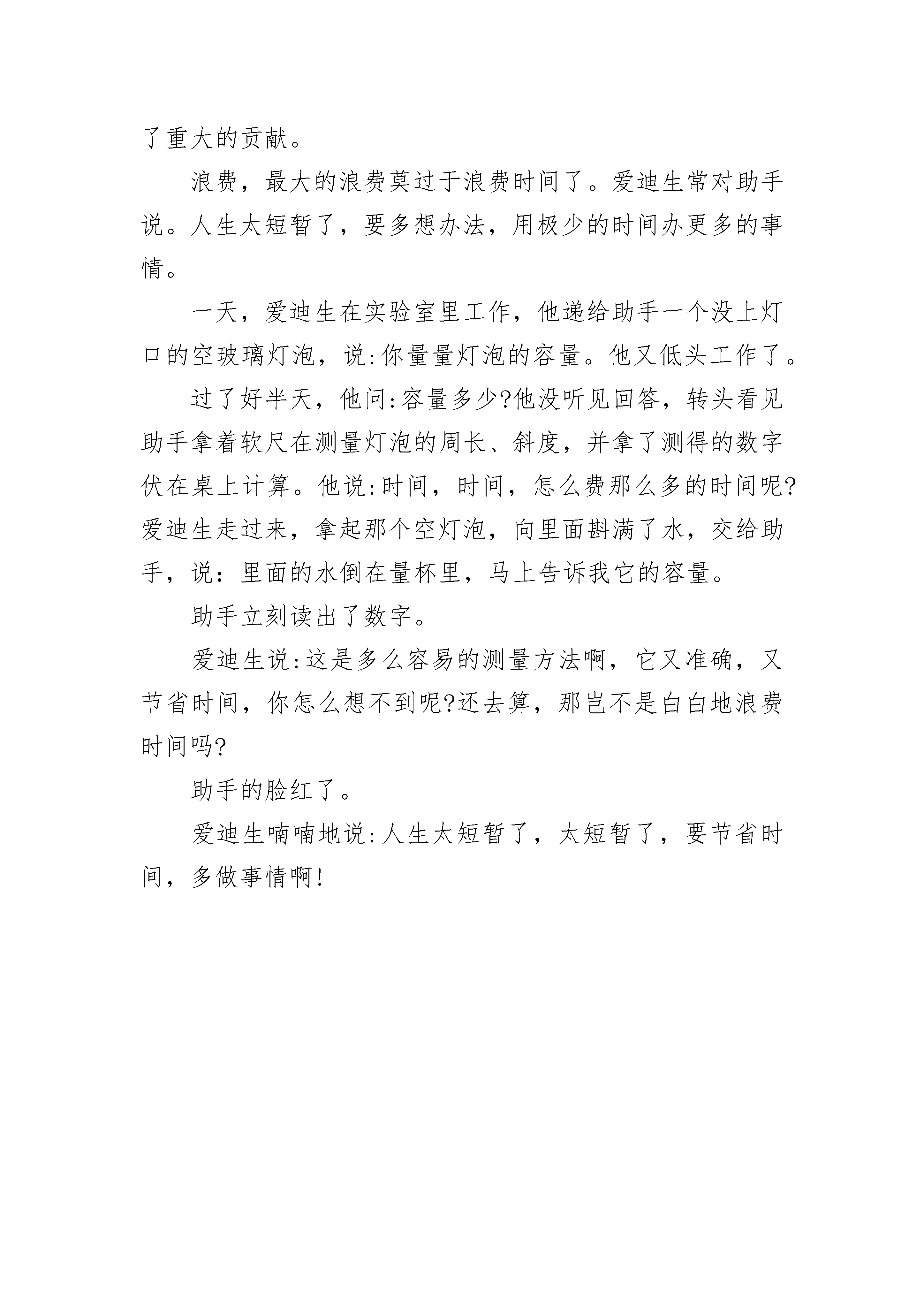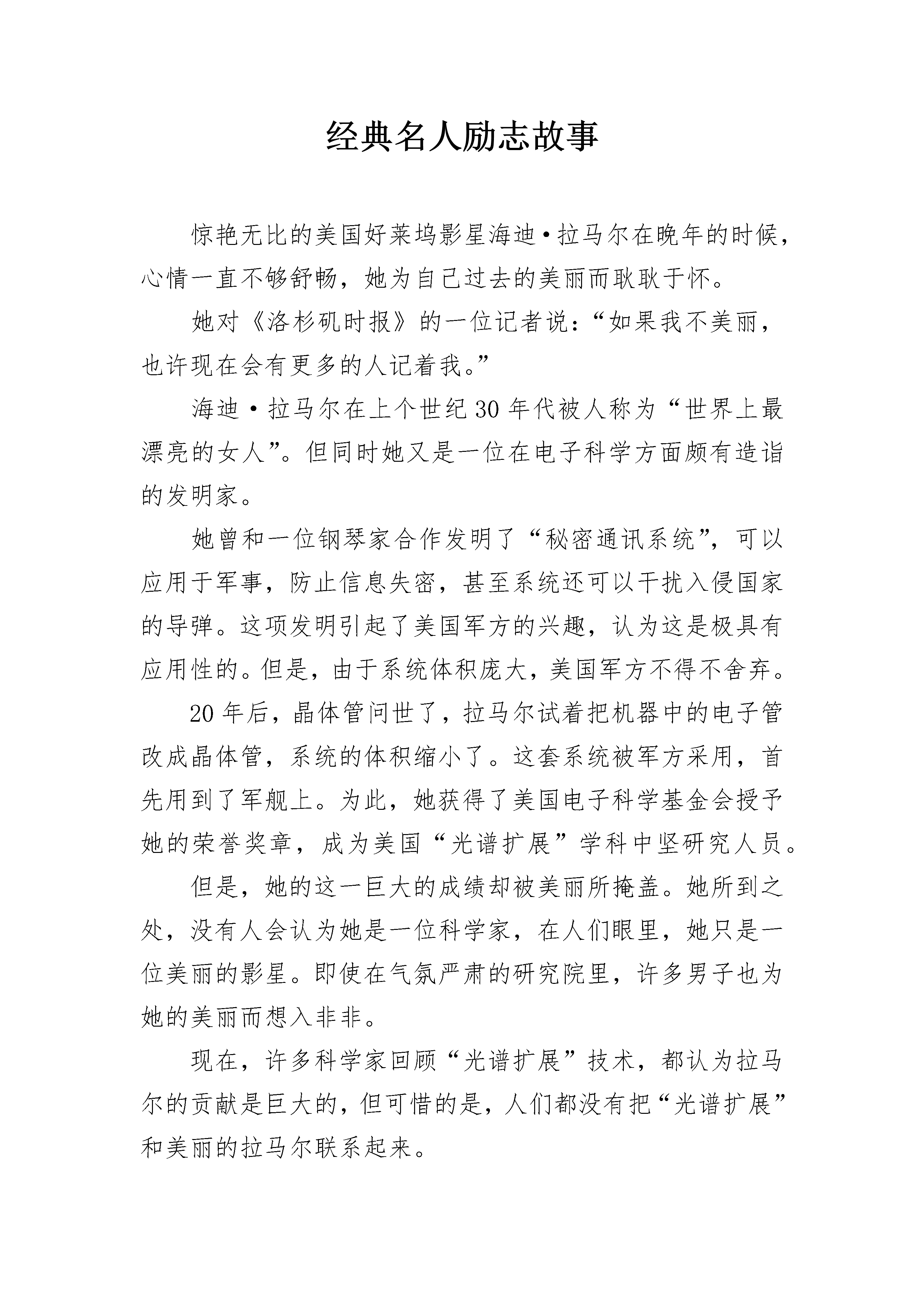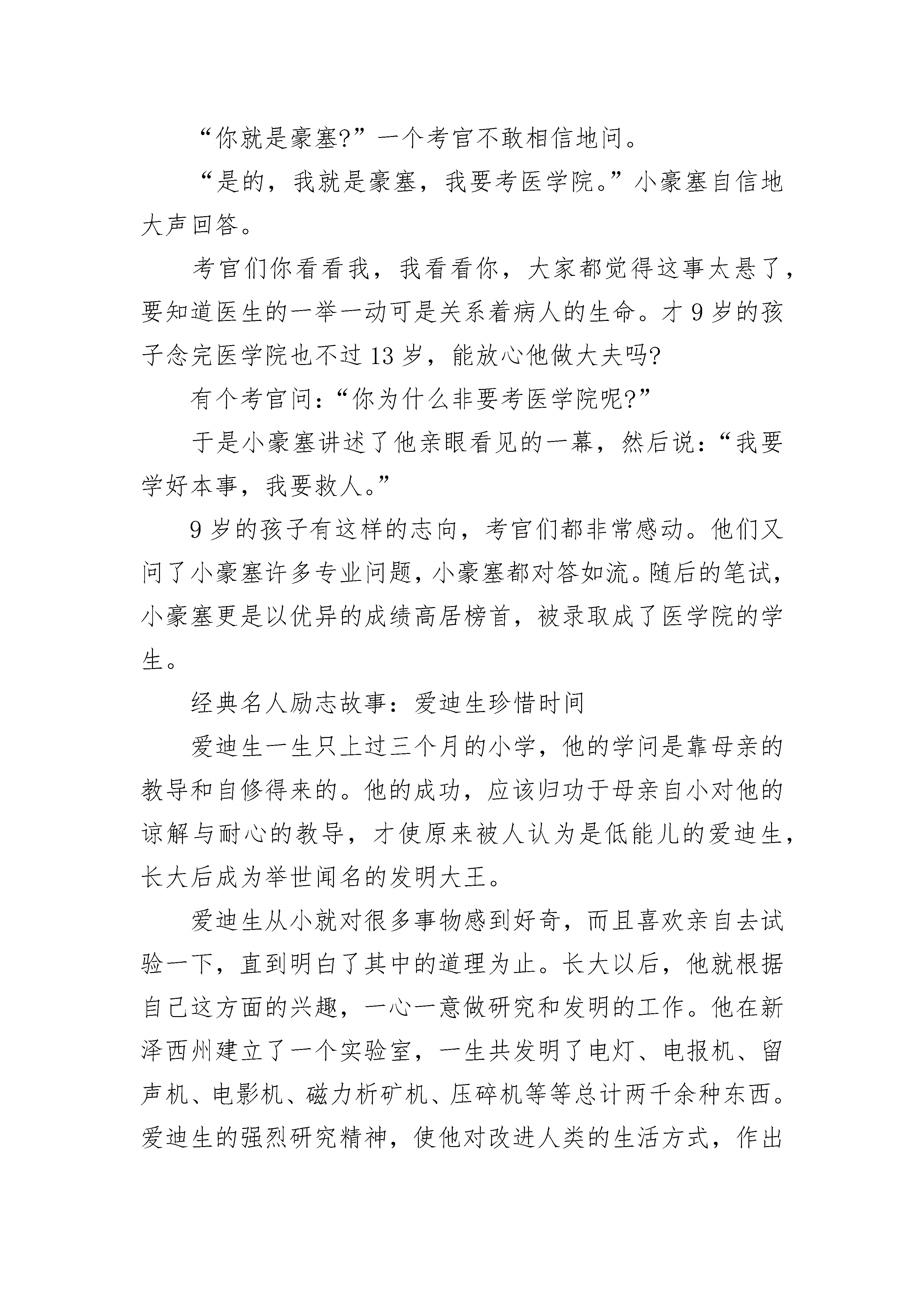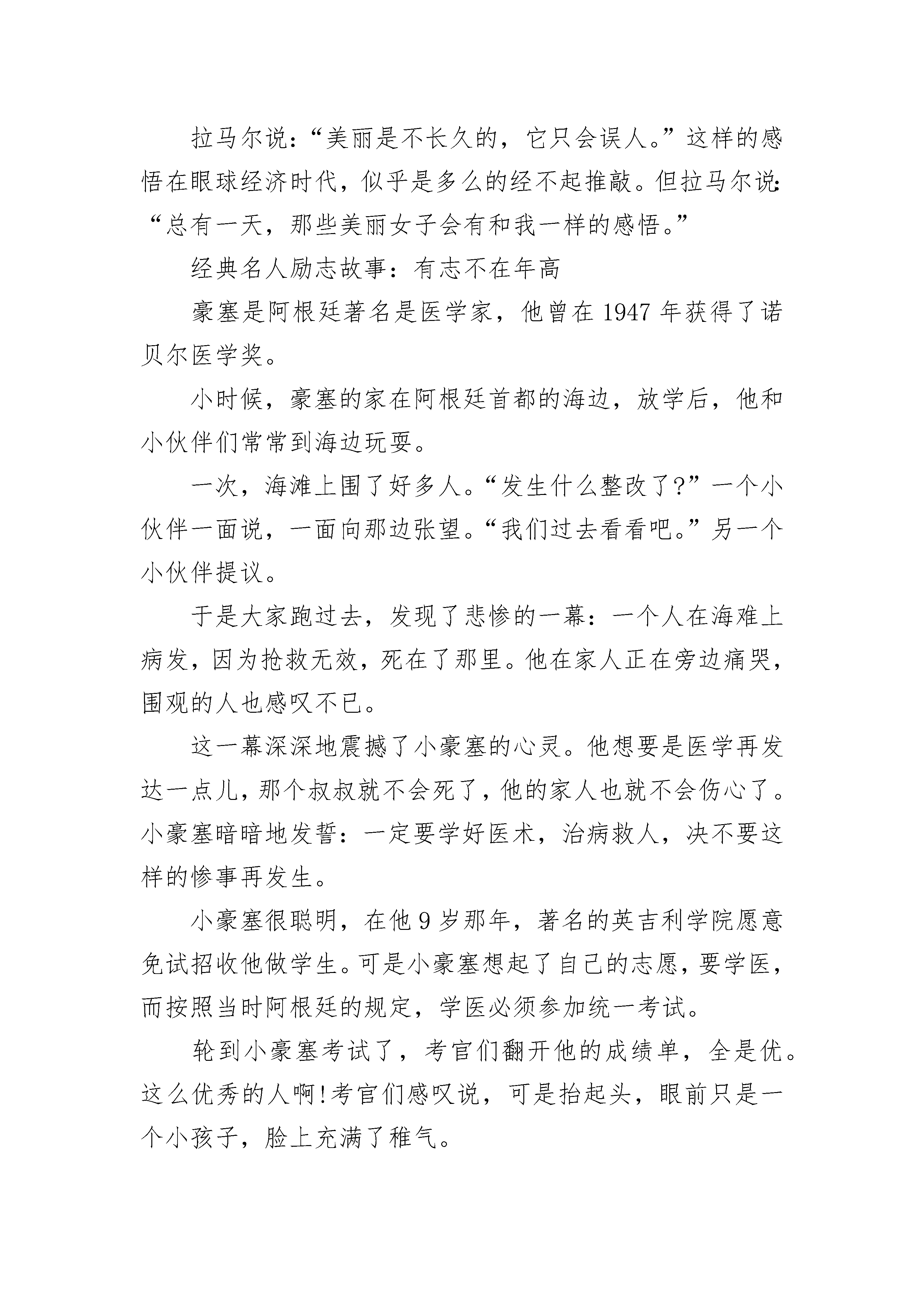 经典名人励志故事惊艳无比的美国好莱坞影星海迪·拉马尔在晚年的时候,心情一直不够舒畅,她为自己过去的美丽而耿耿于怀。她对《洛杉矶时报》的一位记者说:“如果我不美丽,也许现在会有更多的人记着我。”海迪·拉马尔在上个世纪30年代被人称为“世界上最漂亮的女人”。但同时她又是一位在电子科学方面颇有造诣的发明家。她曾和一位钢琴家合作发明了“秘密通讯系统”,可以应用于军事,防止信息失密,甚至系统还可以干扰入侵国家的导弹。这项发明引起了美国军方的兴趣,认为这是极具有应用性的。但是,由于系统体积庞大,美国军方不得不舍弃。20年后,晶体管问世了,拉马尔试着把机器中的电子管改成晶体管,系统的体积缩小了。这套系统被军方采用,首先用到了军舰上。为此,她获得了美国电子科学基金会授予她的荣誉奖章,成为美国“光谱扩展”学科中坚研究人员。但是,她的这一巨大的成绩却被美丽所掩盖。她所到之处,没有人会认为她是一位科学家,在人们眼里,她只是一位美丽的影星。即使在气氛严肃的研究院里,许多男子也为她的美丽而想入非非。现在,许多科学家回顾“光谱扩展”技术,都认为拉马尔的贡献是巨大的,但可惜的是,人们都没有把“光谱扩展”和美丽的拉马尔联系起来。拉马尔说:“美丽是不长久的,它只会误人。”这样的感悟在眼球经济时代,似乎是多么的经不起推敲。但拉马尔说:“总有一天,那些美丽女子会有和我一样的感悟。”经典名人励志故事:有志不在年高豪塞是阿根廷著名是医学家,他曾在1947年获得了诺贝尔医学奖。小时候,豪塞的家在阿根廷首都的海边,放学后,他和小伙伴们常常到海边玩耍。一次,海滩上围了好多人。“发生什么整改了?”一个小伙伴一面说,一面向那边张望。“我们过去看看吧。”另一个小伙伴提议。于是大家跑过去,发现了悲惨的一幕:一个人在海难上病发,因为抢救无效,死在了那里。他在家人正在旁边痛哭,围观的人也感叹不已。这一幕深深地震撼了小豪塞的心灵。他想要是医学再发达一点儿,那个叔叔就不会死了,他的家人也就不会伤心了。小豪塞暗暗地发誓:一定要学好医术,治病救人,决不要这样的惨事再发生。小豪塞很聪明,在他9岁那年,著名的英吉利学院愿意免试招收他做学生。可是小豪塞想起了自己的志愿,要学医,而按照当时阿根廷的规定,学医必须参加统一考试。轮到小豪塞考试了,考官们翻开他的成绩单,全是优。这么优秀的人啊!考官们感叹说,可是抬起头,眼前只是一个小孩子,脸上充满了稚气。“你就是豪塞?”一个考官不敢相信地问。“是的,我就是豪塞,我要考医学院。”小豪塞自信地大声回答。考官们你看看我,我看看你,大家都觉得这事太悬了,要知道医生的一举一动可是关系着病人的生命。才9岁的孩子念完医学院也不过13岁,能放心他做大夫吗?有个考官问:“你为什么非要考医学院呢?”于是小豪塞讲述了他亲眼看见的一幕,然后说:“我要学好本事,我要救人。”9岁的孩子有这样的志向,考官们都非常感动。他们又问了小豪塞许多专业问题,小豪塞都对答如流。随后的笔试,小豪塞更是以优异的成绩高居榜首,被录取成了医学院的学生。经典名人励志故事:爱迪生珍惜时间爱迪生一生只上过三个月的小学,他的学问是靠母亲的教导和自修得来的。他的成功,应该归功于母亲自小对他的谅解与耐心的教导,才使原来被人认为是低能儿的爱迪生,长大后成为举世闻名的发明大王。爱迪生从小就对很多事物感到好奇,而且喜欢亲自去试验一下,直到明白了其中的道理为止。长大以后,他就根据自己这方面的兴趣,一心一意做研究和发明的工作。他在新泽西州建立了一个实验室,一生共发明了电灯、电报机、留声机、电影机、磁力析矿机、压碎机等等总计两千余种东西。爱迪生的强烈研究精神,使他对改进人类的生活方式,作出了重大的贡献。浪费,最大的浪费莫过于浪费时间了。爱迪生常对助手说。人生太短暂了,要多想办法,用极少的时间办更多的事情。一天,爱迪生在实验室里工作,他递给助手一个没上灯口的空玻璃灯泡,说:你量量灯泡的容量。他又低头工作了。过了好半天,他问:容量多少?他没听见回答,转头看见助手拿着软尺在测量灯泡的周长、斜度,并拿了测得的数字伏在桌上计算。他说:时间,时间,怎么费那么多的时间呢?爱迪生走过来,拿起那个空灯泡,向里面斟满了水,交给助手,说:里面的水倒在量杯里,马上告诉我它的容量。助手立刻读出了数字。爱迪生说:这是多么容易的测量方法啊,它又准确,又节省时间,你怎么想不到呢?还去算,那岂不是白白地浪费时间吗?助手的脸红了。爱迪生喃喃地说:人生太短暂了,太短暂了,要节省时间,多做事情啊!