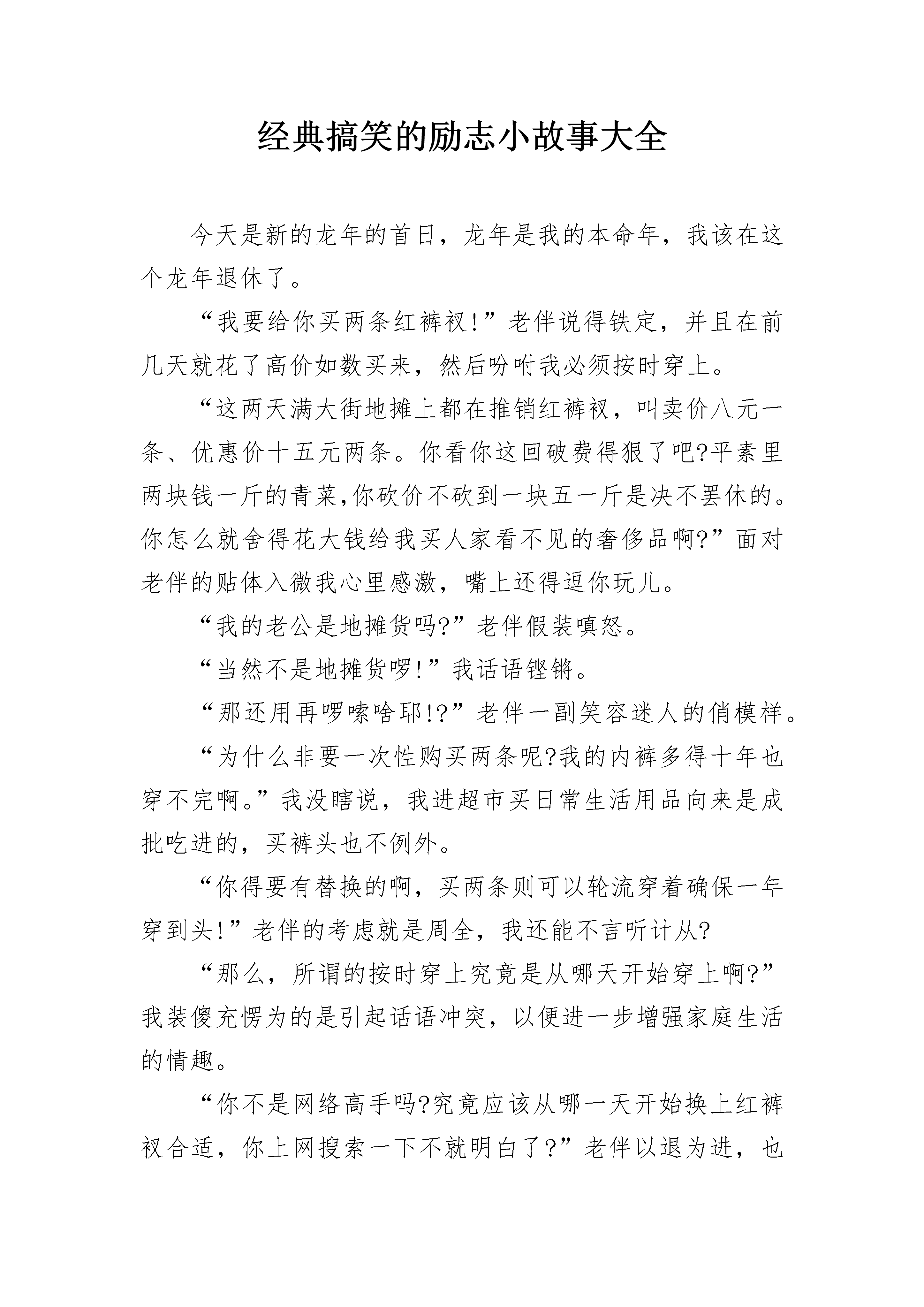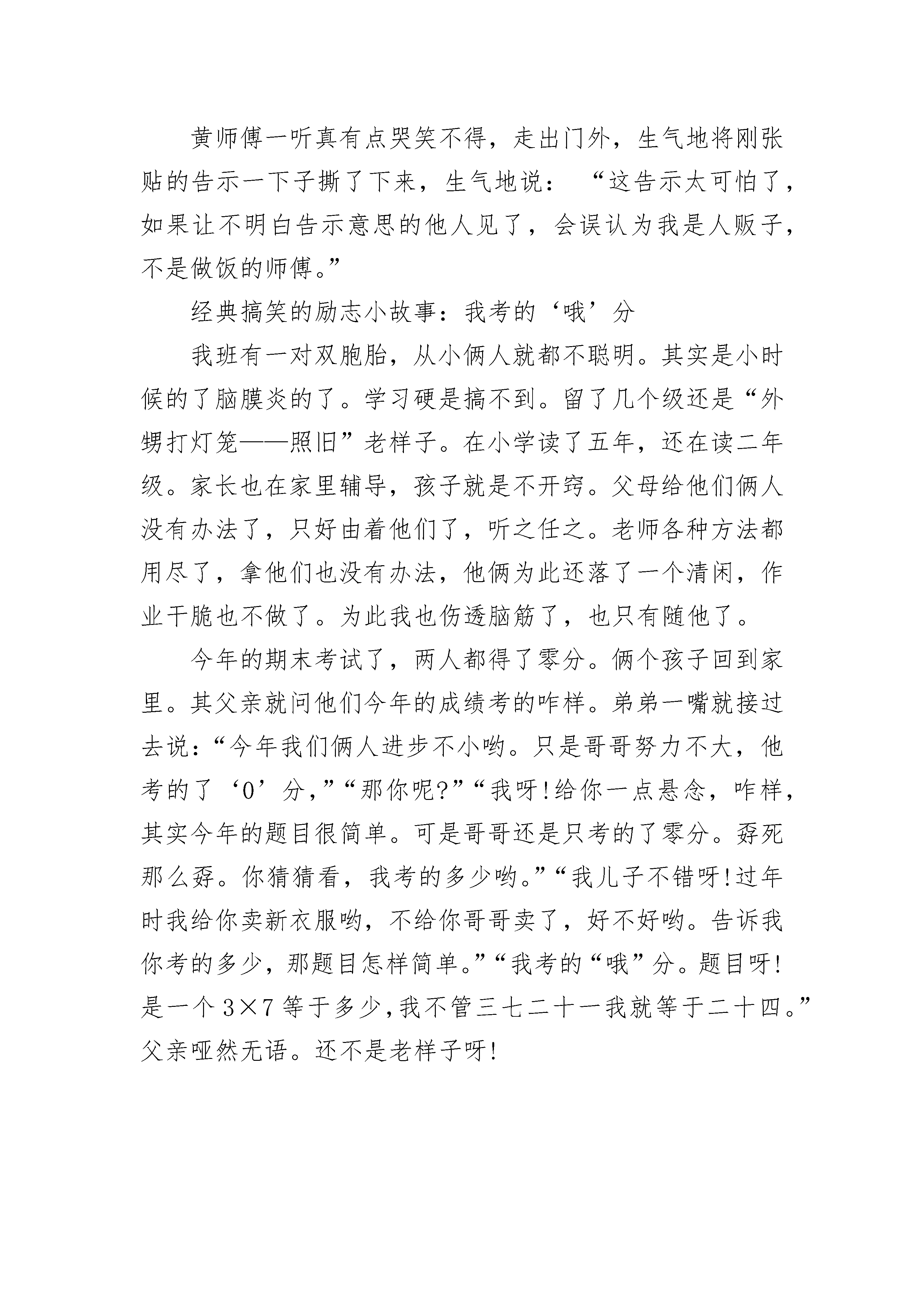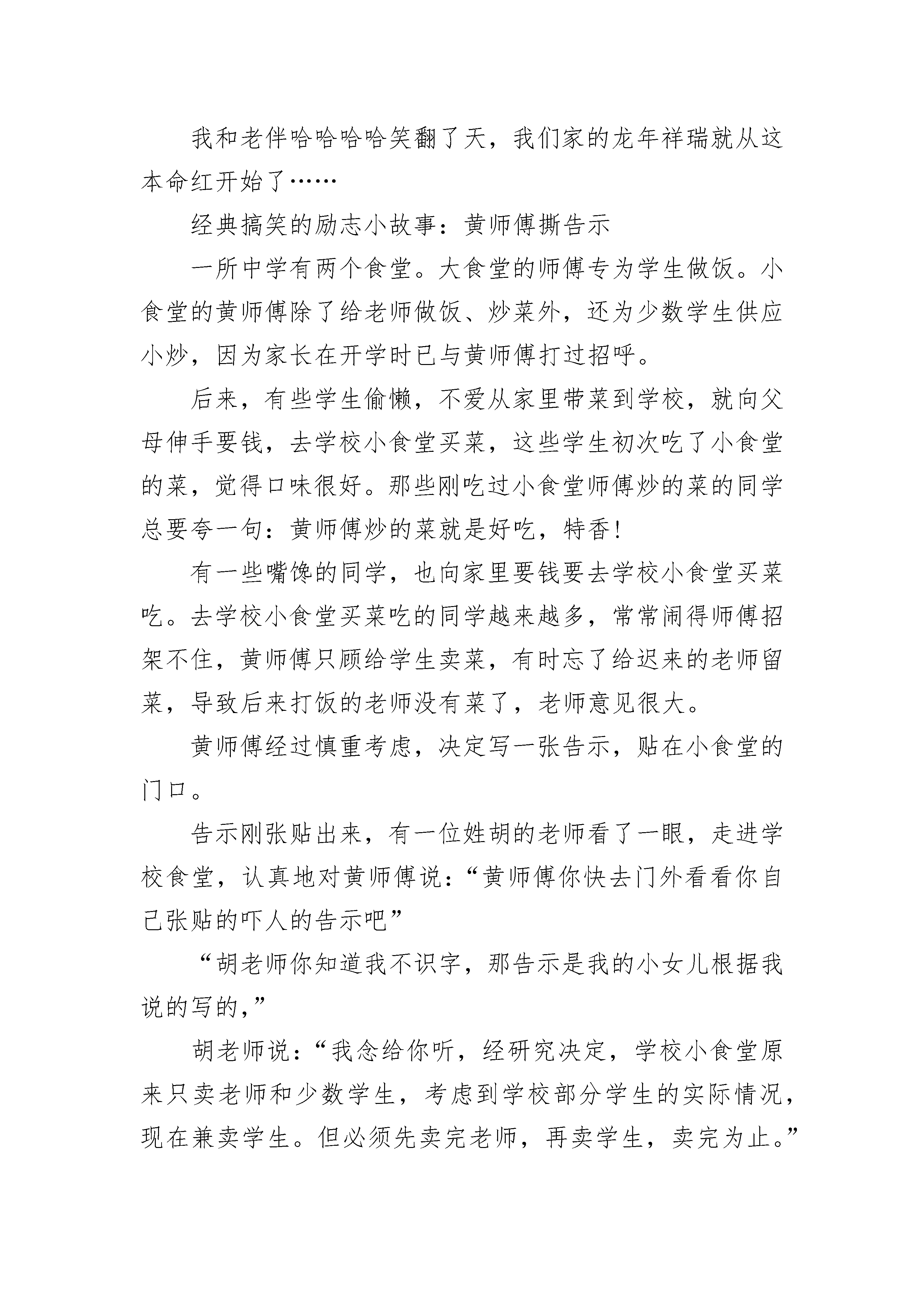 经典搞笑的励志小故事大全今天是新的龙年的首日,龙年是我的本命年,我该在这个龙年退休了。“我要给你买两条红裤衩!”老伴说得铁定,并且在前几天就花了高价如数买来,然后吩咐我必须按时穿上。“这两天满大街地摊上都在推销红裤衩,叫卖价八元一条、优惠价十五元两条。你看你这回破费得狠了吧?平素里两块钱一斤的青菜,你砍价不砍到一块五一斤是决不罢休的。你怎么就舍得花大钱给我买人家看不见的奢侈品啊?”面对老伴的贴体入微我心里感激,嘴上还得逗你玩儿。“我的老公是地摊货吗?”老伴假装嗔怒。“当然不是地摊货啰!”我话语铿锵。“那还用再啰嗦啥耶!?”老伴一副笑容迷人的俏模样。“为什么非要一次性购买两条呢?我的内裤多得十年也穿不完啊。”我没瞎说,我进超市买日常生活用品向来是成批吃进的,买裤头也不例外。“你得要有替换的啊,买两条则可以轮流穿着确保一年穿到头!”老伴的考虑就是周全,我还能不言听计从?“那么,所谓的按时穿上究竟是从哪天开始穿上啊?”我装傻充愣为的是引起话语冲突,以便进一步增强家庭生活的情趣。“你不是网络高手吗?究竟应该从哪一天开始换上红裤衩合适,你上网搜索一下不就明白了?”老伴以退为进,也算是巧于应变。我遵命浏览网页得知:应该在大年三十早早地穿上本命红,以图消灾免祸、避凶趋吉。照此执行,昨天是除夕,午饭后我就沐浴更衣,当然及时地换上了本命红——红裤衩,同时换装的还包括老伴为我定做的孤品高档红色羊绒衫一件。“这红裤衩和红色羊绒衫都是秘不示人的内衣裤哎,这么绝密级的隐私怎么才能让别人知晓呢?”我故意发嗲。“为什么非得让别人知晓?”老伴好像一时被我弄迷糊了。“你想啊,这内在的本命红如果没人知晓,那么妖魔鬼怪怎么就会主动绕我而过或退避三舍呢?”我说得跟真的似的:“你再想啊,这内在的本命红如果没人知晓,那么喜兴吉星怎么就能主动对号入座找到我啊?”“照这么一说,也是有几分道理的,你确实不能大冷天的脱了外衣让人窥探内衣内裤啊,到天热的时候还可以‘一不留神’展露内涵。那你有什么好办法呢?”老伴如此表态,真不知她是被我带进了沟里无法自拔,还是她在以其人之道还治其人之身逗我玩呢。“办法倒是有的,”我故意大喘气等着老伴继续入彀,见老伴表情不置可否,我只得自打锣鼓自唱戏:“我做块大大的牌子挂在胸前,上书‘本人已穿本命红!’夫人啊,你看我的这个创意如何?”老伴大声疾呼:“有本事你就这么干!我乐观其成。”我和老伴哈哈哈哈笑翻了天,我们家的龙年祥瑞就从这本命红开始了……经典搞笑的励志小故事:黄师傅撕告示一所中学有两个食堂。大食堂的师傅专为学生做饭。小食堂的黄师傅除了给老师做饭、炒菜外,还为少数学生供应小炒,因为家长在开学时已与黄师傅打过招呼。后来,有些学生偷懒,不爱从家里带菜到学校,就向父母伸手要钱,去学校小食堂买菜,这些学生初次吃了小食堂的菜,觉得口味很好。那些刚吃过小食堂师傅炒的菜的同学总要夸一句:黄师傅炒的菜就是好吃,特香!有一些嘴馋的同学,也向家里要钱要去学校小食堂买菜吃。去学校小食堂买菜吃的同学越来越多,常常闹得师傅招架不住,黄师傅只顾给学生卖菜,有时忘了给迟来的老师留菜,导致后来打饭的老师没有菜了,老师意见很大。黄师傅经过慎重考虑,决定写一张告示,贴在小食堂的门口。告示刚张贴出来,有一位姓胡的老师看了一眼,走进学校食堂,认真地对黄师傅说:“黄师傅你快去门外看看你自己张贴的吓人的告示吧”“胡老师你知道我不识字,那告示是我的小女儿根据我说的写的,”胡老师说:“我念给你听,经研究决定,学校小食堂原来只卖老师和少数学生,考虑到学校部分学生的实际情况,现在兼卖学生。但必须先卖完老师,再卖学生,卖完为止。”黄师傅一听真有点哭笑不得,走出门外,生气地将刚张贴的告示一下子撕了下来,生气地说:“这告示太可怕了,如果让不明白告示意思的他人见了,会误认为我是人贩子,不是做饭的师傅。”经典搞笑的励志小故事:我考的‘哦’分我班有一对双胞胎,从小俩人就都不聪明。其实是小时候的了脑膜炎的了。学习硬是搞不到。留了几个级还是“外甥打灯笼——照旧”老样子。在小学读了五年,还在读二年级。家长也在家里辅导,孩子就是不开窍。父母给他们俩人没有办法了,只好由着他们了,听之任之。老师各种方法都用尽了,拿他们也没有办法,他俩为此还落了一个清闲,作业干脆也不做了。为此我也伤透脑筋了,也只有随他了。今年的期末考试了,两人都得了零分。俩个孩子回到家里。其父亲就问他们今年的成绩考的咋样。弟弟一嘴就接过去说:“今年我们俩人进步不小哟。只是哥哥努力不大,他考的了‘0’分,”“那你呢?”“我呀!给你一点悬念,咋样,其实今年的题目很简单。可是哥哥还是只考的了零分。孬死那么孬。你猜猜看,我考的多少哟。”“我儿子不错呀!过年时我给你卖新衣服哟,不给你哥哥卖了,好不好哟。告诉我你考的多少,那题目怎样简单。”“我考的“哦”分。题目