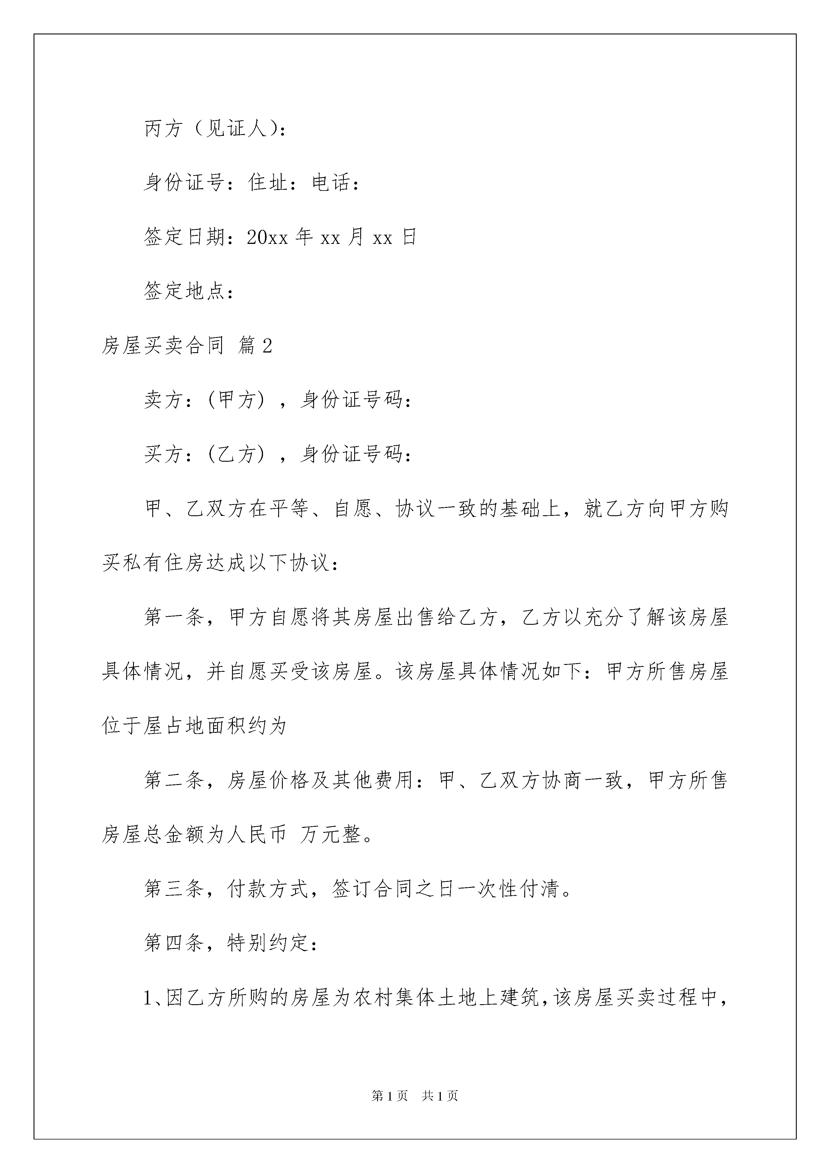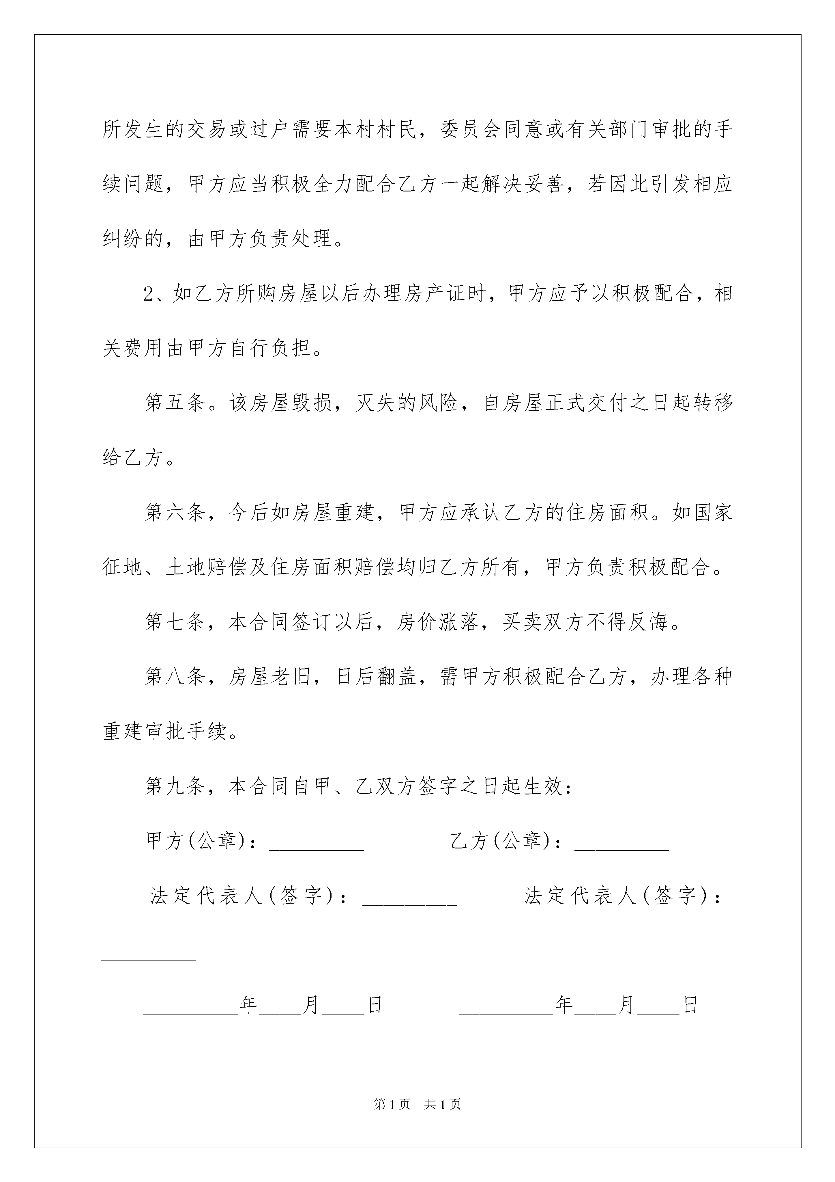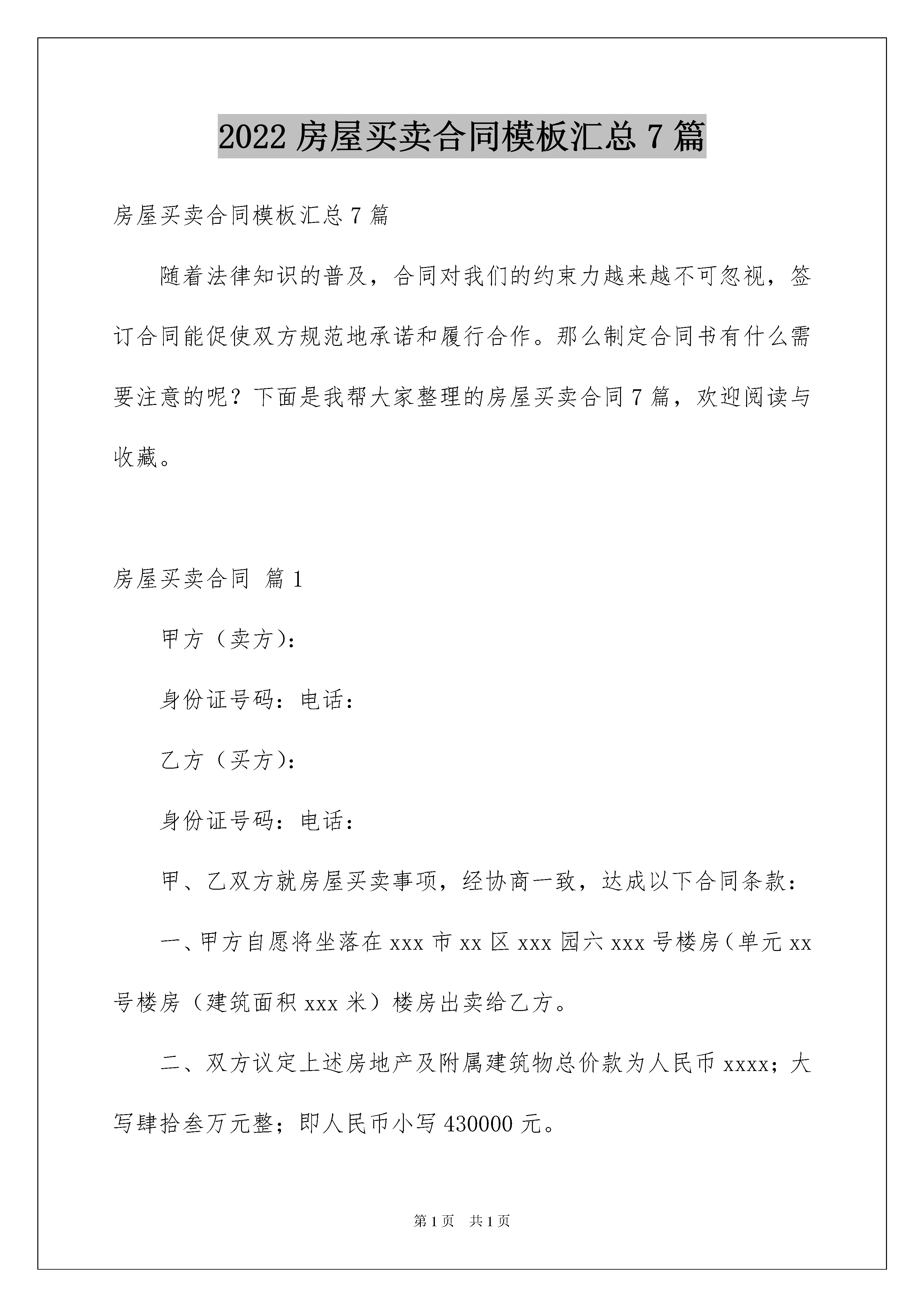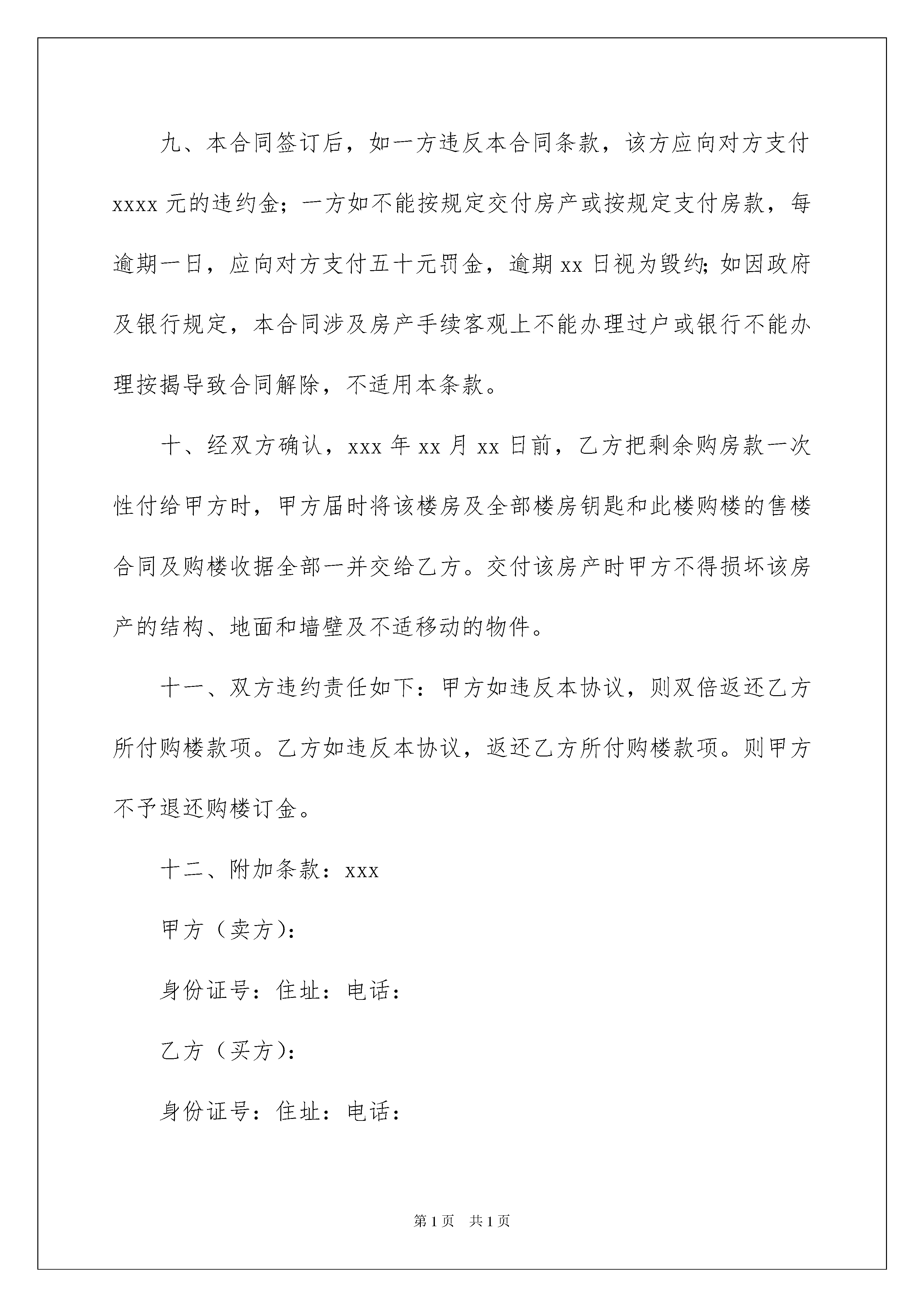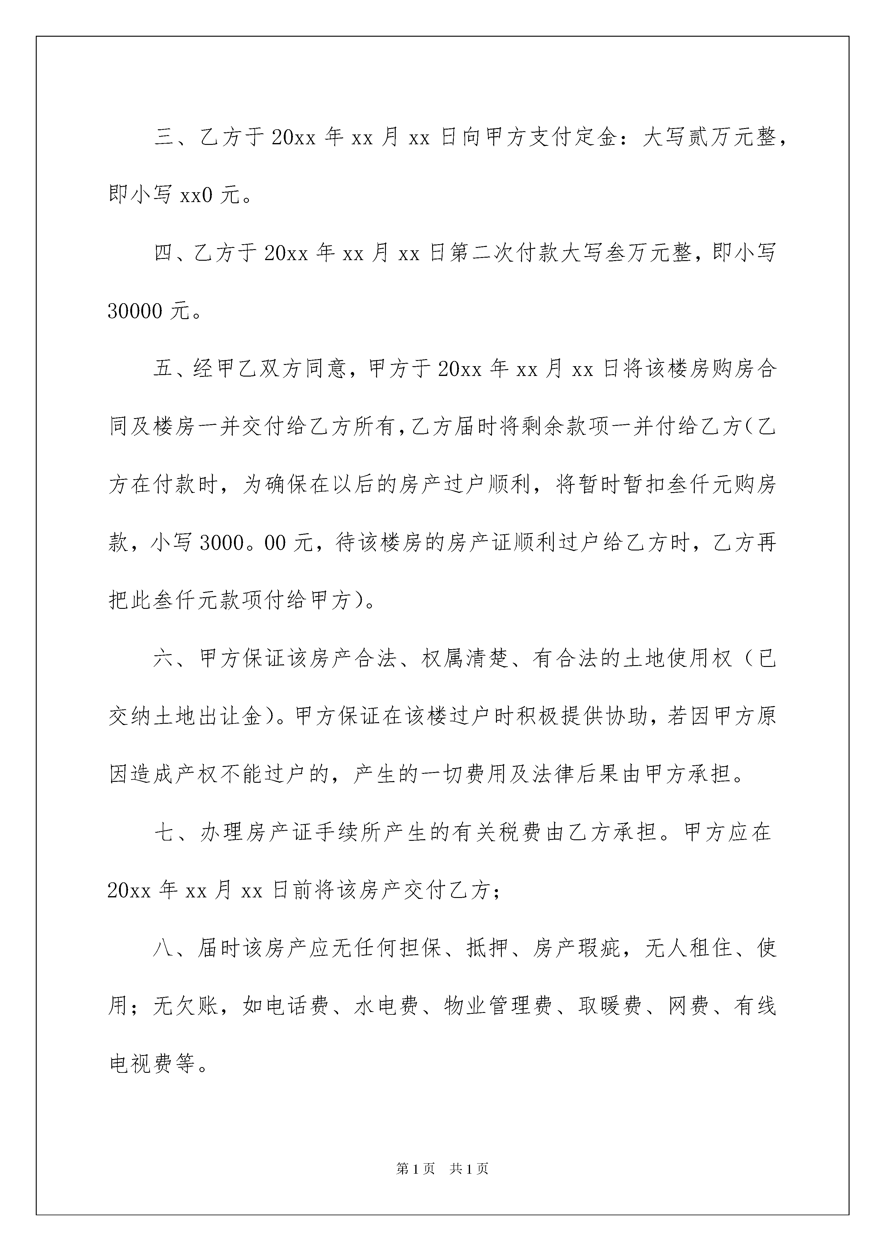 2022房屋买卖合同模板汇总7篇房屋买卖合同模板汇总7篇随着法律知识的普及,合同对我们的约束力越来越不可忽视,签订合同能促使双方规范地承诺和履行合作。那么制定合同书有什么需要注意的呢?下面是我帮大家整理的房屋买卖合同7篇,欢迎阅读与收藏。房屋买卖合同篇1甲方(卖方):身份证号码:电话:乙方(买方):身份证号码:电话:甲、乙双方就房屋买卖事项,经协商一致,达成以下合同条款:一、甲方自愿将坐落在xxx市xx区xxx园六xxx号楼房(单元xx号楼房(建筑面积xxx米)楼房出卖给乙方。二、双方议定上述房地产及附属建筑物总价款为人民币xxxx;大写肆拾叁万元整;即人民币小写430000元。三、乙方于20xx年xx月xx日向甲方支付定金:大写贰万元整,即小写xx0元。四、乙方于20xx年xx月xx日第二次付款大写叁万元整,即小写30000元。五、经甲乙双方同意,甲方于20xx年xx月xx日将该楼房购房合同及楼房一并交付给乙方所有,乙方届时将剩余款项一并付给乙方(乙方在付款时,为确保在以后的房产过户顺利,将暂时暂扣叁仟元购房款,小写3000。00元,待该楼房的房产证顺利过户给乙方时,乙方再把此叁仟元款项付给甲方)。六、甲方保证该房产合法、权属清楚、有合法的土地使用权(已交纳土地出让金)。甲方保证在该楼过户时积极提供协助,若因甲方原因造成产权不能过户的,产生的一切费用及法律后果由甲方承担。七、办理房产证手续所产生的有关税费由乙方承担。甲方应在20xx年xx月xx日前将该房产交付乙方;八、届时该房产应无任何担保、抵押、房产瑕疵,无人租住、使用;无欠账,如电话费、水电费、物业管理费、取暖费、网费、有线电视费等。九、本合同签订后,如一方违反本合同条款,该方应向对方支付xxxx元的违约金;一方如不能按规定交付房产或按规定支付房款,每逾期一日,应向对方支付五十元罚金,逾期xx日视为毁约;如因政府及银行规定,本合同涉及房产手续客观上不能办理过户或银行不能办理按揭导致合同解除,不适用本条款。十、经双方确认,xxx年xx月xx日前,乙方把剩余购房款一次性付给甲方时,甲方届时将该楼房及全部楼房钥匙和此楼购楼的售楼合同及购楼收据全部一并交给乙方。交付该房产时甲方不得损坏该房产的结构、地面和墙壁及不适移动的物件。十一、双方违约责任如下:甲方如违反本协议,则双倍返还乙方所付购楼款项。乙方如违反本协议,返还乙方所付购楼款项。则甲方不予退还购楼订金。十二、附加条款:xxx甲方(卖方):身份证号:住址:电话:乙方(买方):身份证号:住址:电话:丙方(见证人):身份证号:住址:电话:签定日期:20xx年xx月xx日签定地点:房屋买卖合同篇2卖方:(甲方),身份证号码:买方:(乙方),身份证号码:甲、乙双方在平等、自愿、协议一致的基础上,就乙方向甲方购买私有住房达成以下协议:第一条,甲方自愿将其房屋出售给乙方,乙方以充分了解该房屋具体情况,并自愿买受该房屋。该房屋具体情况如下:甲方所售房屋位于屋占地面积约为第二条,房屋价格及其他费用:甲、乙双方协商一致,甲方所售房屋总金额为人民币万元整。第三条,付款方式,签订合同之日一次性付清。第四条,特别约定:1、因乙方所购的房屋为农村集体土地上建筑,该房屋买卖过程中,所发生的交易或过户需要本村村民,委员会同意或有关部门审批的手续问题,甲方应当积极全力配合乙方一起解决妥善,若因此引发相应纠纷的,由甲方负责处理。2、如乙方所购房屋以后办理房产证时,甲方应予以积极配合,相关费用由甲方自行负担。第五条。该房屋毁损,灭失的风险,自房屋正式交付之日起转移给乙方。第六条,今后如房屋重建,甲方应承认乙方的住房面积。如国家征地、土地赔偿及住房面积赔偿均归乙方所有,甲方负责积极配合。第七条,本合同签订以后,房价涨落,买卖双方不得反悔。第八条,房屋老旧,日后翻盖,需甲方积极配合乙方,办理各种重建审批手续。第九条,本合同自甲、乙双方签字之日起生效:甲方(公章):_________乙方(公章):_________法定代表人(签字):_________法定代表人(签字):__________________年____月____日_________年____月____日房屋买卖合同篇3卖方:_______________(简称甲方),身份证号码:_____________________买方:_______________(简称乙方),身份证号码:_____________________根据《中华人民共和国经济合同法》、《中华人民共和国城市房地产管理法》及其他有关法律、法规之规定,甲、乙双方在平等、自愿、协商一