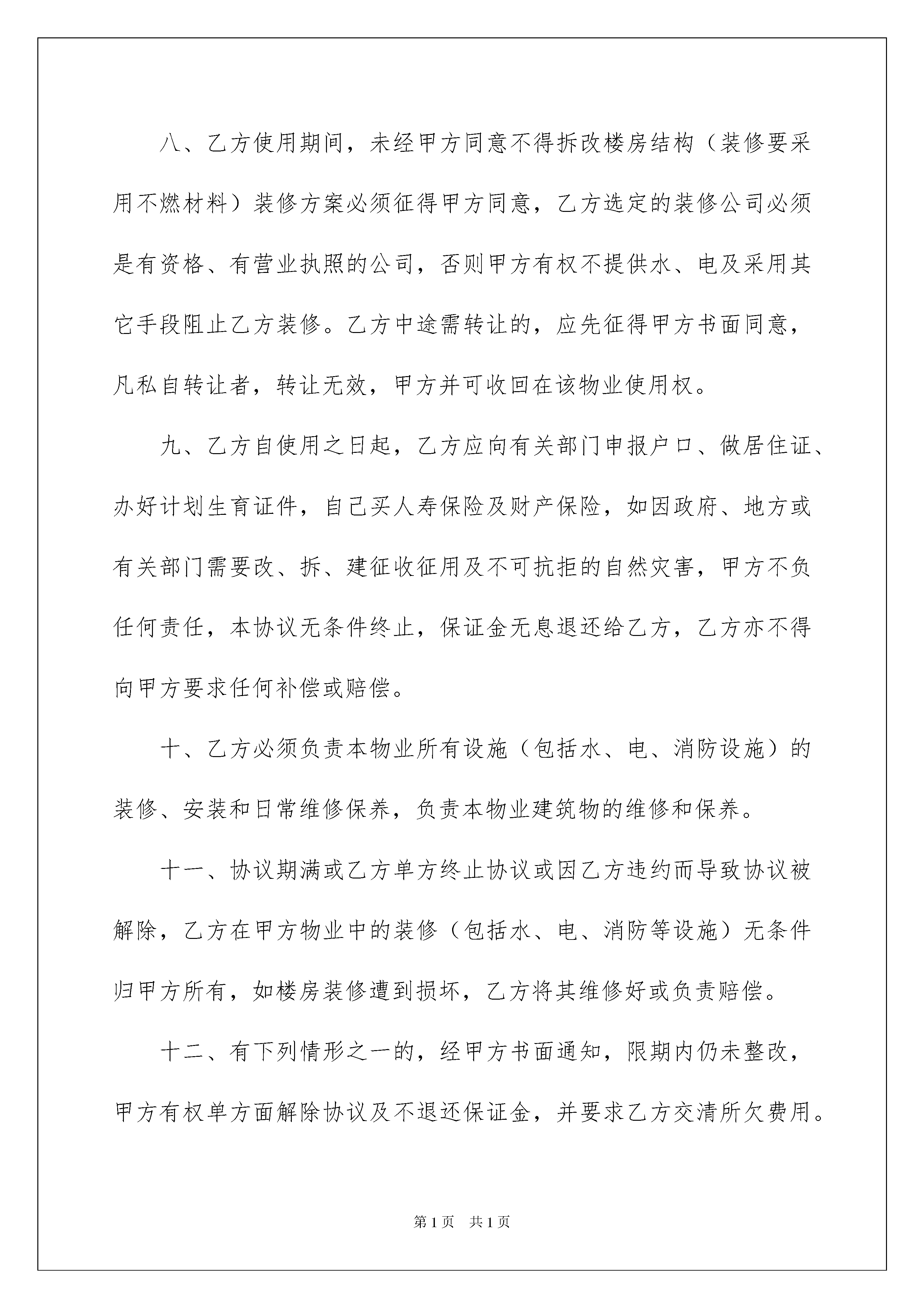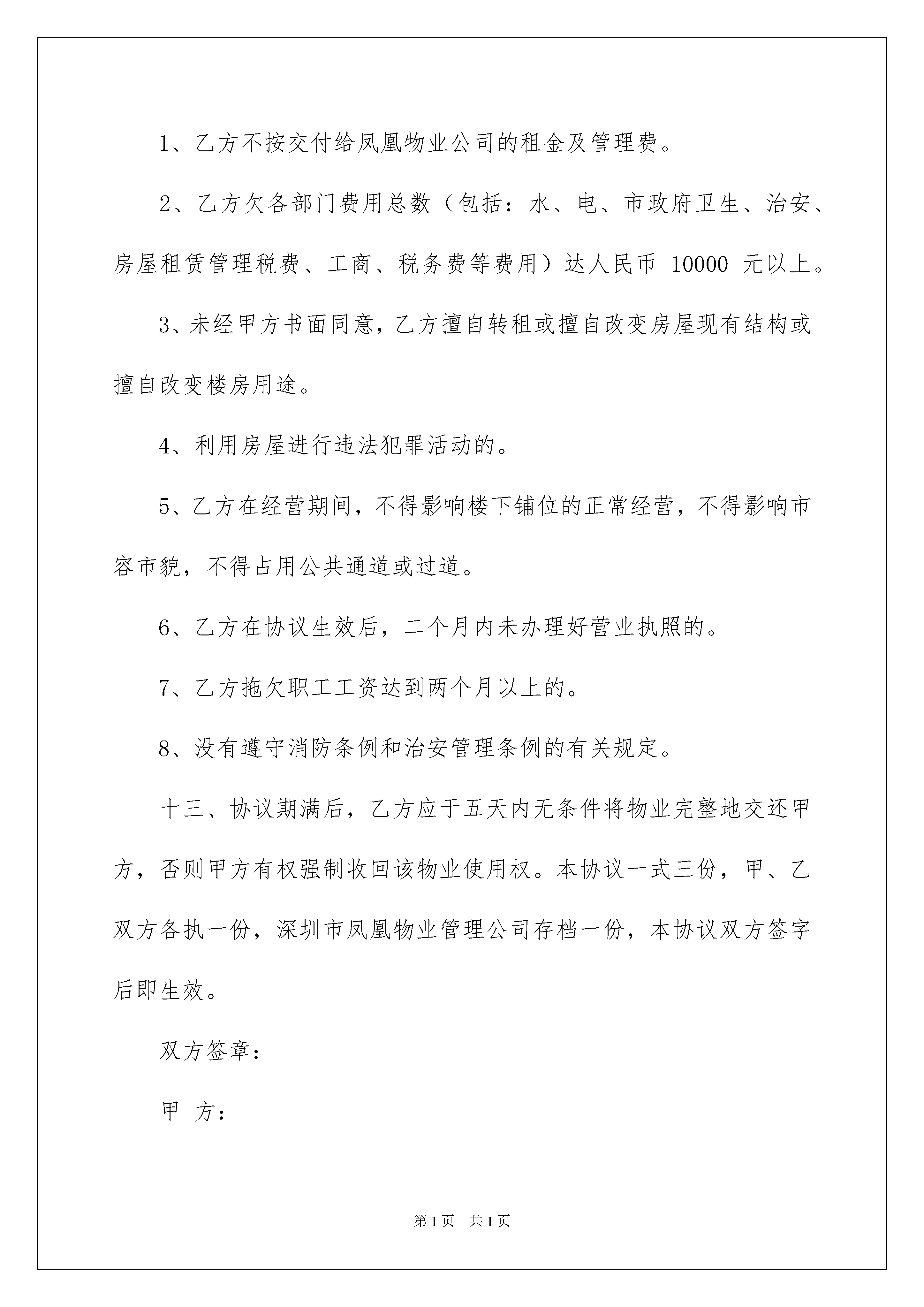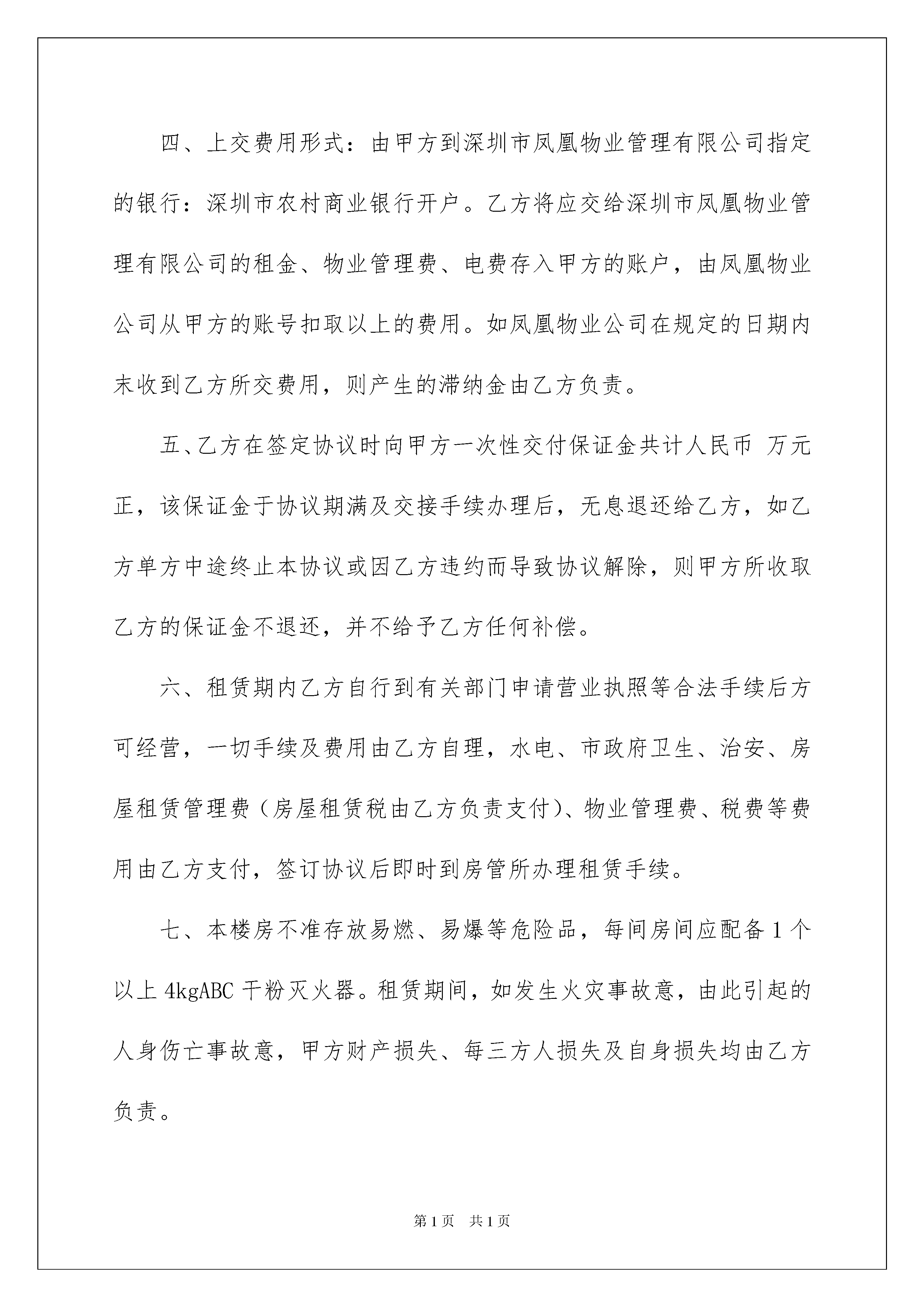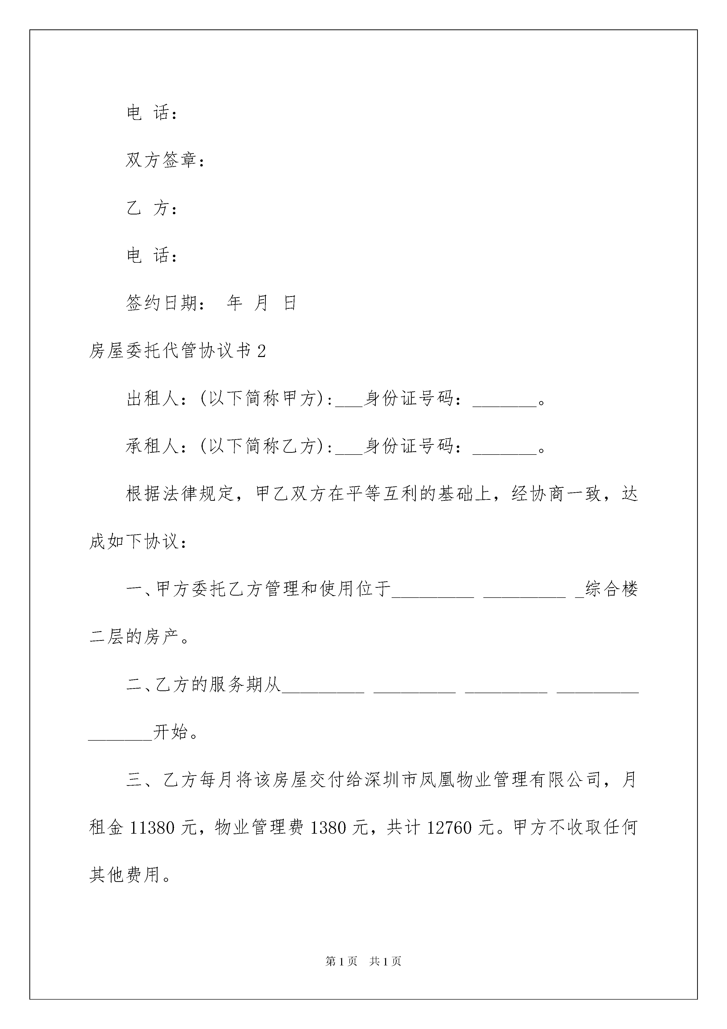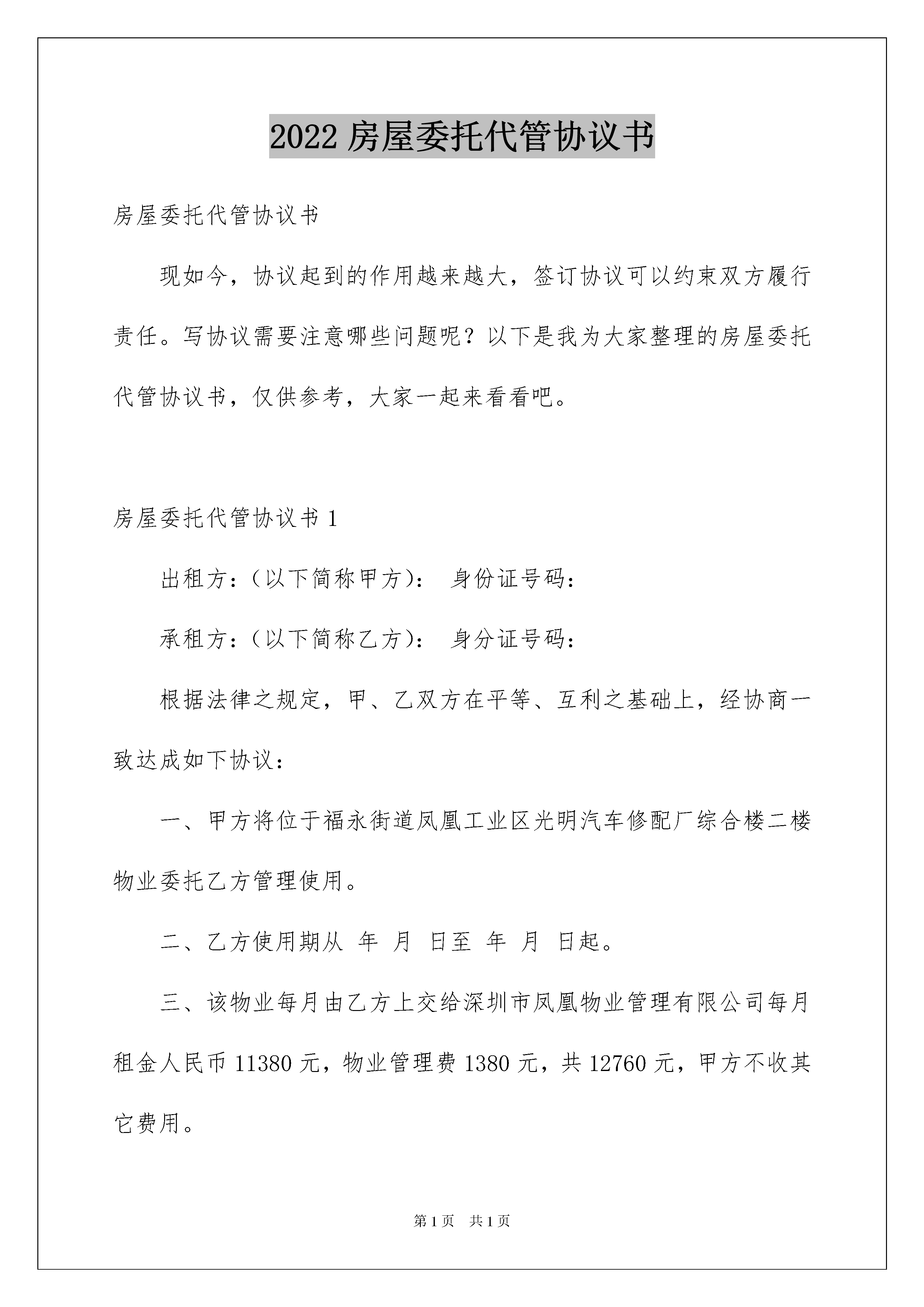 2022房屋委托代管协议书房屋委托代管协议书现如今,协议起到的作用越来越大,签订协议可以约束双方履行责任。写协议需要注意哪些问题呢?以下是我为大家整理的房屋委托代管协议书,仅供参考,大家一起来看看吧。房屋委托代管协议书1出租方:(以下简称甲方):身份证号码:承租方:(以下简称乙方):身分证号码:根据法律之规定,甲、乙双方在平等、互利之基础上,经协商一致达成如下协议:一、甲方将位于福永街道凤凰工业区光明汽车修配厂综合楼二楼物业委托乙方管理使用。二、乙方使用期从年月日至年月日起。三、该物业每月由乙方上交给深圳市凤凰物业管理有限公司每月租金人民币11380元,物业管理费1380元,共12760元,甲方不收其它费用。四、上交费用形式:由甲方到深圳市凤凰物业管理有限公司指定的银行:深圳市农村商业银行开户。乙方将应交给深圳市凤凰物业管理有限公司的租金、物业管理费、电费存入甲方的账户,由凤凰物业公司从甲方的账号扣取以上的费用。如凤凰物业公司在规定的日期内末收到乙方所交费用,则产生的滞纳金由乙方负责。五、乙方在签定协议时向甲方一次性交付保证金共计人民币万元正,该保证金于协议期满及交接手续办理后,无息退还给乙方,如乙方单方中途终止本协议或因乙方违约而导致协议解除,则甲方所收取乙方的保证金不退还,并不给予乙方任何补偿。六、租赁期内乙方自行到有关部门申请营业执照等合法手续后方可经营,一切手续及费用由乙方自理,水电、市政府卫生、治安、房屋租赁管理费(房屋租赁税由乙方负责支付)、物业管理费、税费等费用由乙方支付,签订协议后即时到房管所办理租赁手续。七、本楼房不准存放易燃、易爆等危险品,每间房间应配备1个以上4kgABC干粉灭火器。租赁期间,如发生火灾事故意,由此引起的人身伤亡事故意,甲方财产损失、每三方人损失及自身损失均由乙方负责。八、乙方使用期间,未经甲方同意不得拆改楼房结构(装修要采用不燃材料)装修方案必须征得甲方同意,乙方选定的装修公司必须是有资格、有营业执照的公司,否则甲方有权不提供水、电及采用其它手段阻止乙方装修。乙方中途需转让的,应先征得甲方书面同意,凡私自转让者,转让无效,甲方并可收回在该物业使用权。九、乙方自使用之日起,乙方应向有关部门申报户口、做居住证、办好计划生育证件,自己买人寿保险及财产保险,如因政府、地方或有关部门需要改、拆、建征收征用及不可抗拒的自然灾害,甲方不负任何责任,本协议无条件终止,保证金无息退还给乙方,乙方亦不得向甲方要求任何补偿或赔偿。十、乙方必须负责本物业所有设施(包括水、电、消防设施)的装修、安装和日常维修保养,负责本物业建筑物的维修和保养。十一、协议期满或乙方单方终止协议或因乙方违约而导致协议被解除,乙方在甲方物业中的装修(包括水、电、消防等设施)无条件归甲方所有,如楼房装修遭到损坏,乙方将其维修好或负责赔偿。十二、有下列情形之一的,经甲方书面通知,限期内仍未整改,甲方有权单方面解除协议及不退还保证金,并要求乙方交清所欠费用。1、乙方不按交付给凤凰物业公司的租金及管理费。2、乙方欠各部门费用总数(包括:水、电、市政府卫生、治安、房屋租赁管理税费、工商、税务费等费用)达人民币10000元以上。3、未经甲方书面同意,乙方擅自转租或擅自改变房屋现有结构或擅自改变楼房用途。4、利用房屋进行违法犯罪活动的。5、乙方在经营期间,不得影响楼下铺位的正常经营,不得影响市容市貌,不得占用公共通道或过道。6、乙方在协议生效后,二个月内未办理好营业执照的。7、乙方拖欠职工工资达到两个月以上的。8、没有遵守消防条例和治安管理条例的有关规定。十三、协议期满后,乙方应于五天内无条件将物业完整地交还甲方,否则甲方有权强制收回该物业使用权。本协议一式三份,甲、乙双方各执一份,深圳市凤凰物业管理公司存档一份,本协议双方签字后即生效。双方签章:甲方:电话:双方签章:乙方:电话:签约日期:年月日房屋委托代管协议书2出租人:(以下简称甲方):___身份证号码:_______。承租人:(以下简称乙方):___身份证号码:_______。根据法律规定,甲乙双方在平等互利的基础上,经协商一致,达成如下协议:一、甲方委托乙方管理和使用位于___________________综合楼二层的房产。二、乙方的服务期从___________________________________________开始。三、乙方每月将该房屋交付给深圳市凤凰物业管理有限公司,月租金11380元,物业管理费1380元,共计12760元。甲方不收取任何其他费用。四、付款方式:甲方在深圳市凤凰物业管理有限公司指定的'银行:深圳农