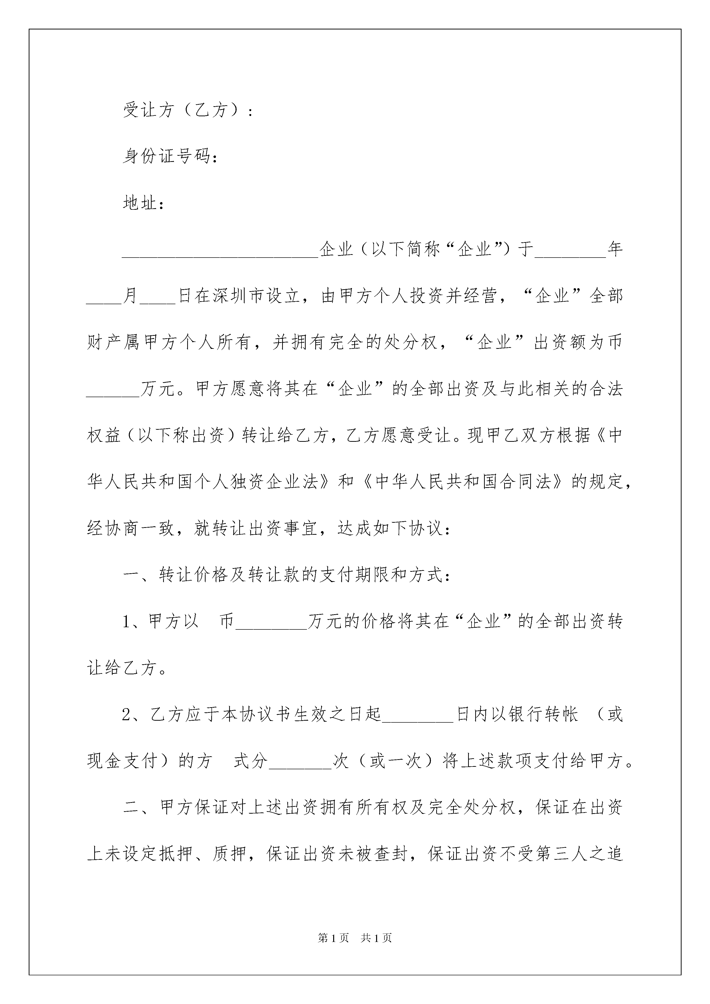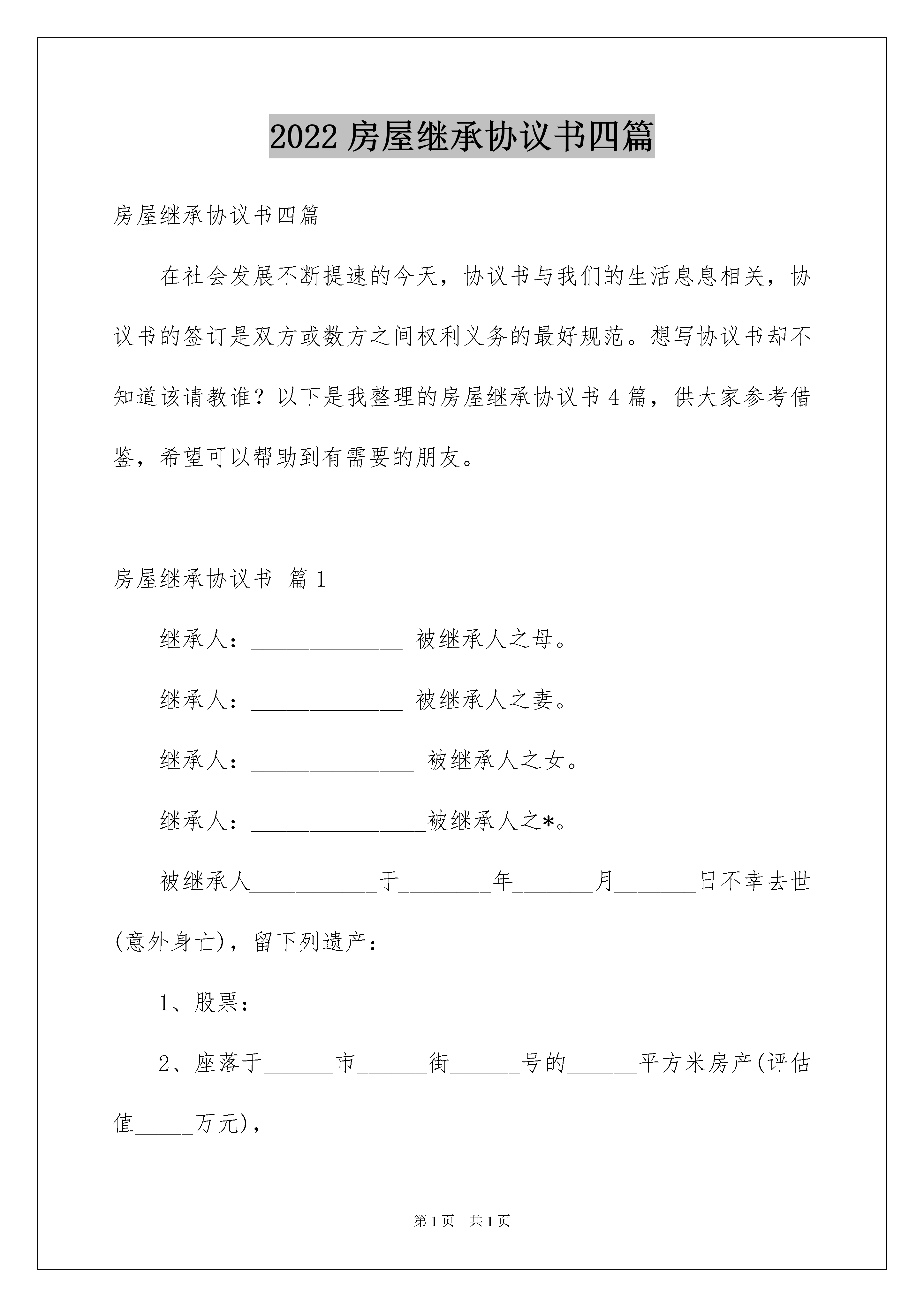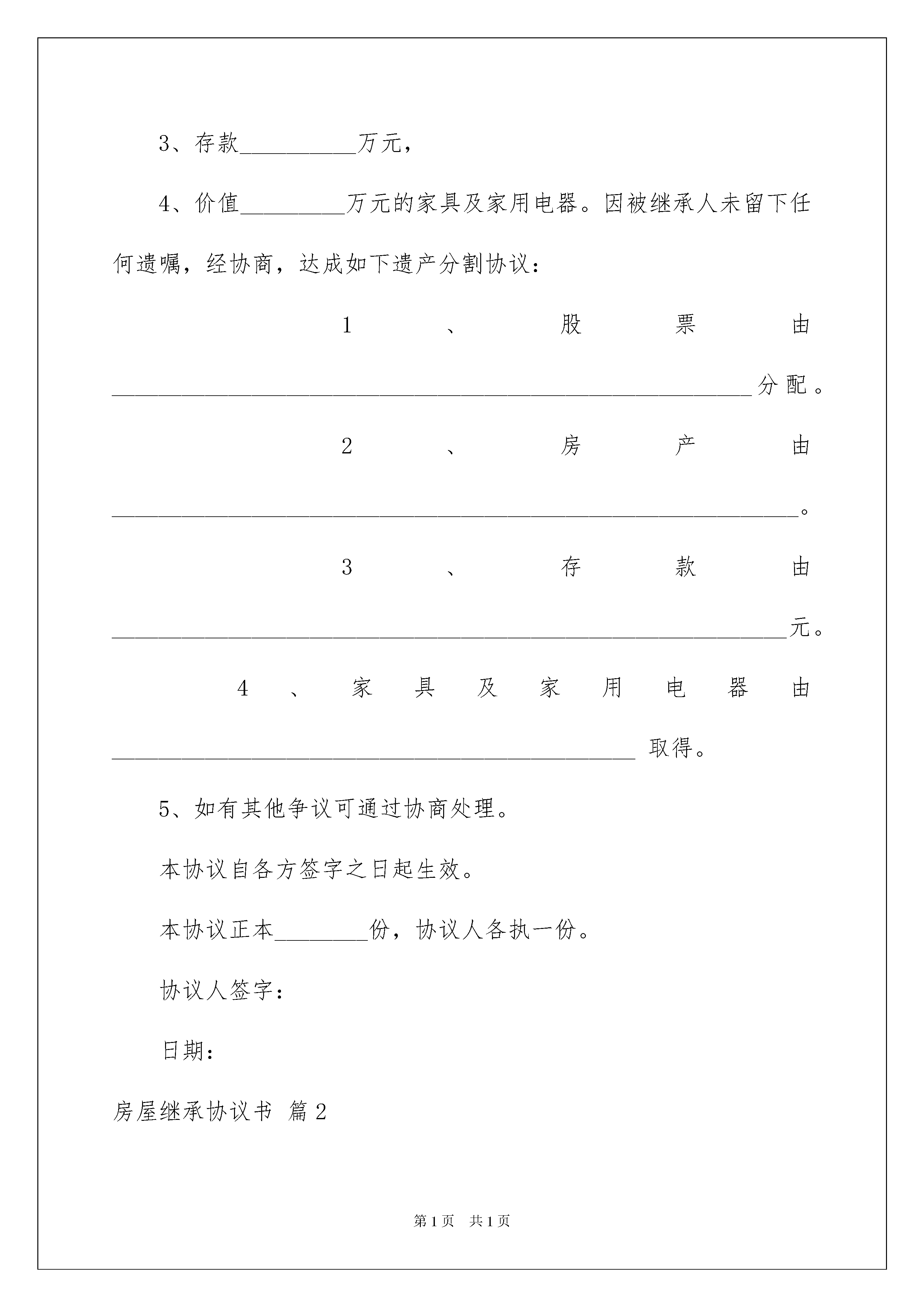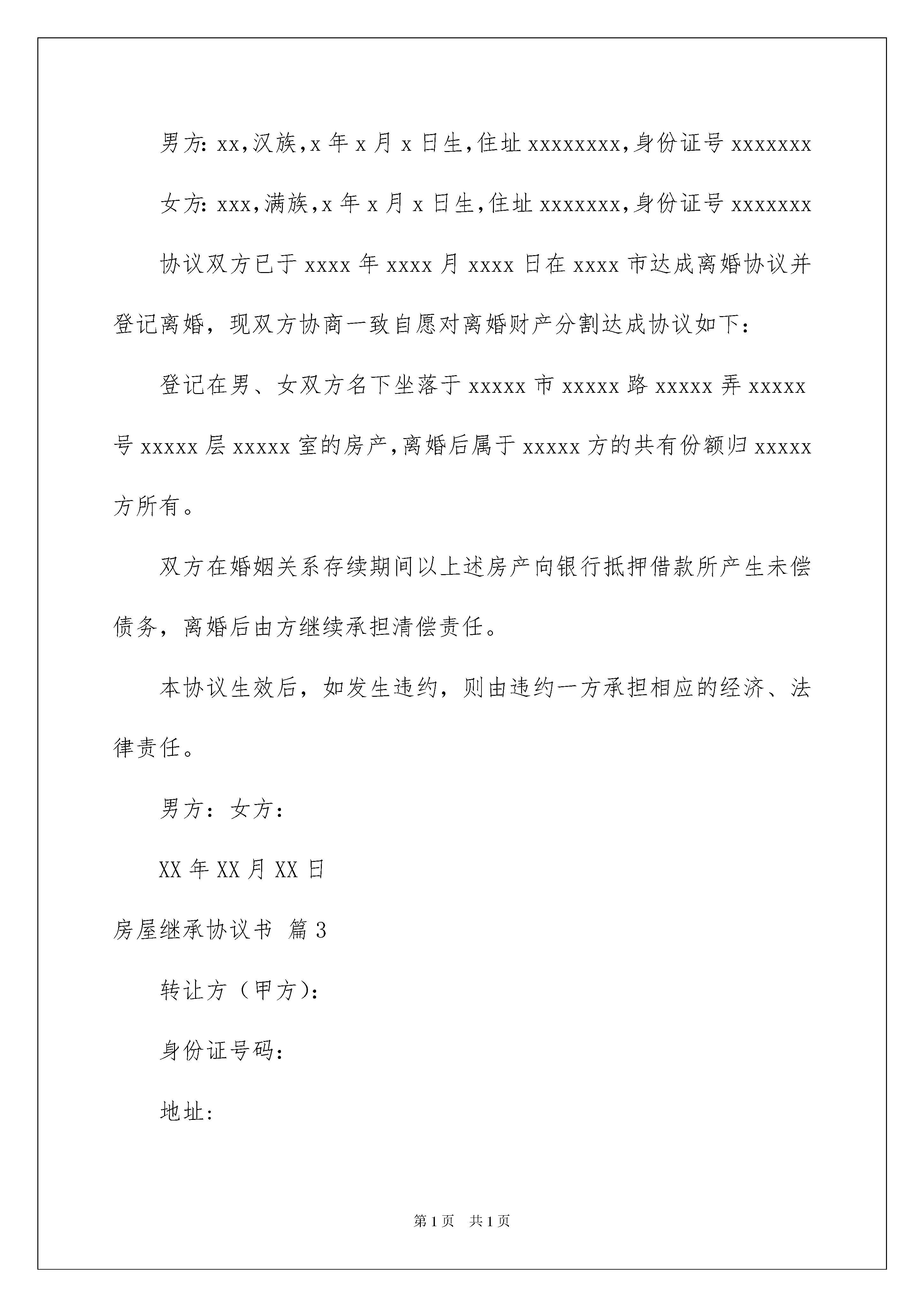 2022房屋继承协议书四篇房屋继承协议书四篇在社会发展不断提速的今天,协议书与我们的生活息息相关,协议书的签订是双方或数方之间权利义务的最好规范。想写协议书却不知道该请教谁?以下是我整理的房屋继承协议书4篇,供大家参考借鉴,希望可以帮助到有需要的朋友。房屋继承协议书篇1继承人:_____________被继承人之母。继承人:_____________被继承人之妻。继承人:______________被继承人之女。继承人:_______________被继承人之*。被继承人___________于________年_______月_______日不幸去世(意外身亡),留下列遗产:1、股票:2、座落于______市______街______号的______平方米房产(评估值_____万元),3、存款__________万元,4、价值_________万元的家具及家用电器。因被继承人未留下任何遗嘱,经协商,达成如下遗产分割协议:1、股票由_______________________________________________________分配。2、房产由___________________________________________________________。3、存款由__________________________________________________________元。4、家具及家用电器由_____________________________________________取得。5、如有其他争议可通过协商处理。本协议自各方签字之日起生效。本协议正本________份,协议人各执一份。协议人签字:日期:房屋继承协议书篇2男方:xx,汉族,x年x月x日生,住址xxxxxxxx,身份证号xxxxxxx女方:xxx,满族,x年x月x日生,住址xxxxxxx,身份证号xxxxxxx协议双方已于xxxx年xxxx月xxxx日在xxxx市达成离婚协议并登记离婚,现双方协商一致自愿对离婚财产分割达成协议如下:登记在男、女双方名下坐落于xxxxx市xxxxx路xxxxx弄xxxxx号xxxxx层xxxxx室的房产,离婚后属于xxxxx方的共有份额归xxxxx方所有。双方在婚姻关系存续期间以上述房产向银行抵押借款所产生未偿债务,离婚后由方继续承担清偿责任。本协议生效后,如发生违约,则由违约一方承担相应的经济、法律责任。男方:女方:XX年XX月XX日房屋继承协议书篇3转让方(甲方):身份证号码:地址:受让方(乙方):身份证号码:地址:______________________企业(以下简称“企业”)于________年____月____日在深圳市设立,由甲方个人投资并经营,“企业”全部财产属甲方个人所有,并拥有完全的处分权,“企业”出资额为币______万元。甲方愿意将其在“企业”的全部出资及与此相关的合法权益(以下称出资)转让给乙方,乙方愿意受让。现甲乙双方根据《中华人民共和国个人独资企业法》和《中华人民共和国合同法》的规定,经协商一致,就转让出资事宜,达成如下协议:一、转让价格及转让款的支付期限和方式:1、甲方以币________万元的价格将其在“企业”的全部出资转让给乙方。2、乙方应于本协议书生效之日起________日内以银行转帐(或现金支付)的方式分_______次(或一次)将上述款项支付给甲方。二、甲方保证对上述出资拥有所有权及完全处分权,保证在出资上未设定抵押、质押,保证出资未被查封,保证出资不受第三人之追索,否则,甲方应承担由此引起的一切经济和法律责任。三、转让的效力:自本协议书项下的转让完成之日起,乙方对“企业”全部财产享有所有权及相关的权益,并以其个人财产对“企业”债务承担无限责任。五、违约责任:1、本协议书一经生效,双方必须自觉履行,任何一方未按协议书的规定全面履行义务,应当依照法律和本协议书的规定承担责任。2、如乙方不能按期支付转让款,每逾期一天,应向甲方支付逾期部分转让款的万分之的违约金。如因乙方违约给甲方造成损失,乙方支付的违约金金额低于实际损失的,乙方必须另予以补偿。3、如由于甲方的原因,致使乙方不能如期办理变更登记,或者严重影响乙方实现订立本协议书的目的',甲方应按照乙方已经支付的转让款的万分之向乙方支付违约金。如因甲方违约给乙方造成损失,甲方支付的违约金金额低于实际损失的,甲方必须另予以补偿。五、甲乙双方经协商一致,可以变更或解除本协议书。经协商变更或解除本协议书的,双方应另签订变更或解除协议书,经深圳市公证处公证。六、有