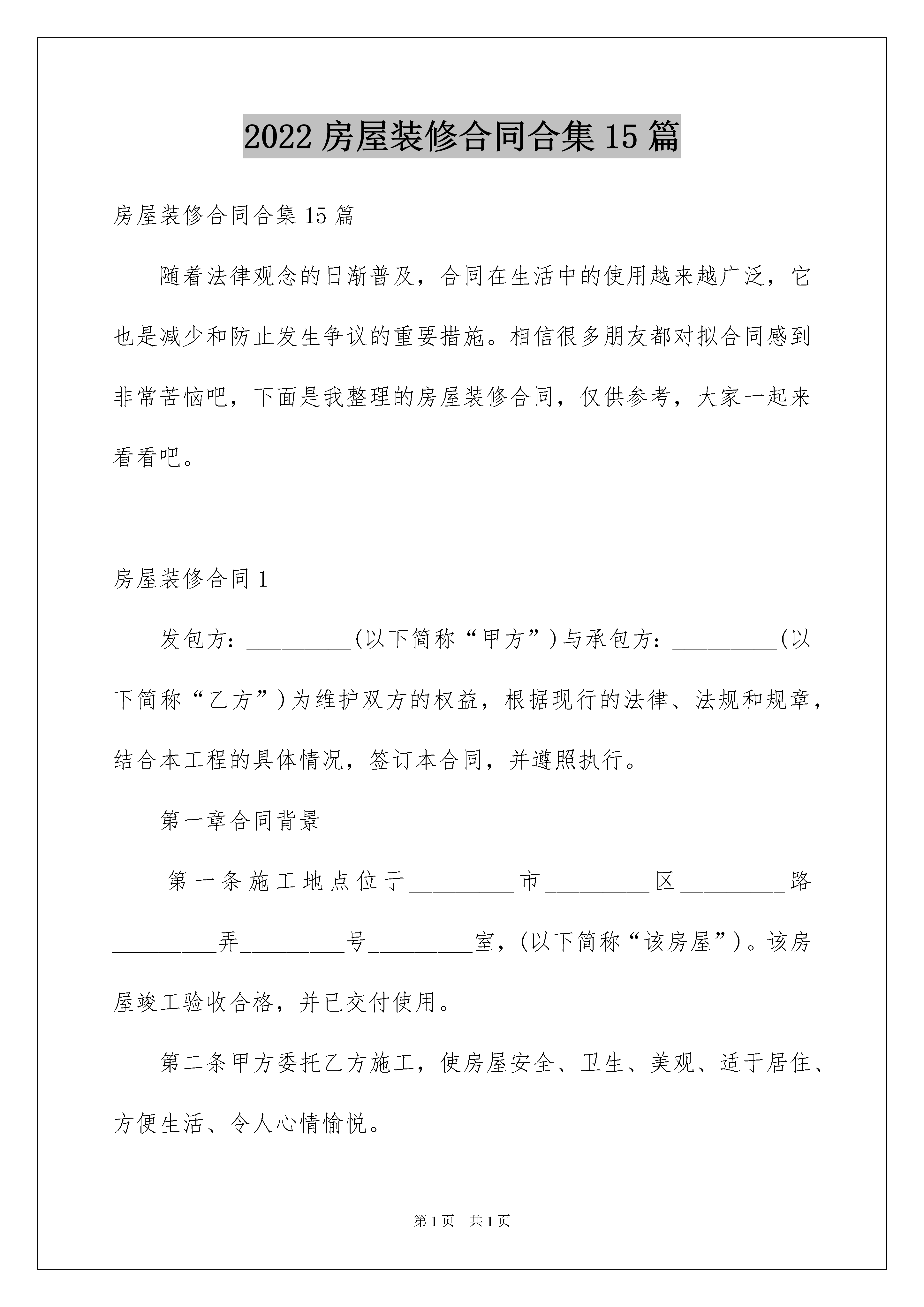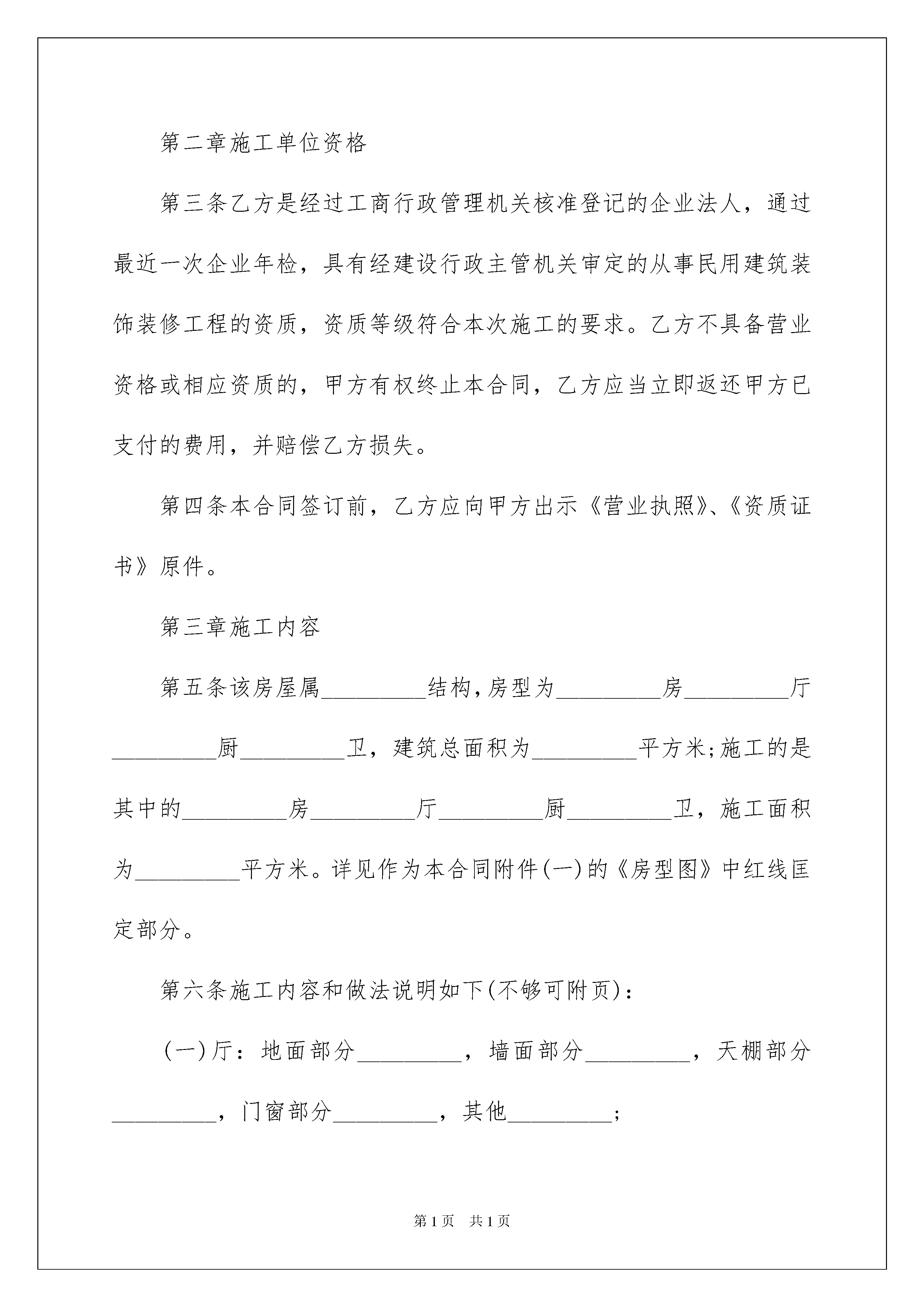 2022房屋装修合同合集15篇房屋装修合同合集15篇随着法律观念的日渐普及,合同在生活中的使用越来越广泛,它也是减少和防止发生争议的重要措施。相信很多朋友都对拟合同感到非常苦恼吧,下面是我整理的房屋装修合同,仅供参考,大家一起来看看吧。房屋装修合同1发包方:_________(以下简称“甲方”)与承包方:_________(以下简称“乙方”)为维护双方的权益,根据现行的法律、法规和规章,结合本工程的具体情况,签订本合同,并遵照执行。第一章合同背景第一条施工地点位于_________市_________区_________路_________弄_________号_________室,(以下简称“该房屋”)。该房屋竣工验收合格,并已交付使用。第二条甲方委托乙方施工,使房屋安全、卫生、美观、适于居住、方便生活、令人心情愉悦。第二章施工单位资格第三条乙方是经过工商行政管理机关核准登记的企业法人,通过最近一次企业年检,具有经建设行政主管机关审定的从事民用建筑装饰装修工程的资质,资质等级符合本次施工的要求。乙方不具备营业资格或相应资质的,甲方有权终止本合同,乙方应当立即返还甲方已支付的费用,并赔偿乙方损失。第四条本合同签订前,乙方应向甲方出示《营业执照》、《资质证书》原件。第三章施工内容第五条该房屋属_________结构,房型为_________房_________厅_________厨_________卫,建筑总面积为_________平方米;施工的是其中的_________房_________厅_________厨_________卫,施工面积为_________平方米。详见作为本合同附件(一)的《房型图》中红线匡定部分。第六条施工内容和做法说明如下(不够可附页):(一)厅:地面部分_________,墙面部分_________,天棚部分_________,门窗部分_________,其他_________;(二)房:地面部分_________,墙面部分_________,天棚部分_________,门窗部分_________,其他_________;(三)厨:地面部分_________,墙面部分_________,天棚部分_________,门窗部分_________,其他_________;(四)卫:地面部分_________,墙面部分_________,天棚部分_________,门窗部分_________,其他_________;(五)其他:地面部分_________,墙面部分_________,天棚部分_________,门窗部分_________,其他_________;前款没有说明的,依作为本合同附件(二)的《装修施工图》确定。第四章材料、设备和价款第七条施工使用的材料和设备见作为本合同附件(三)的《主要材料报价单》、作为本合同附件(四)的《辅助材料报价单》,乙方的人工费见作为本合同附件(五)的《人工费报价单》。第八条该房屋工程总价款为_________元,其中材料费_________元、人工费_________元、管理费_________元、设计费_________元、垃圾清运费_________元、税金_________元、其他费用_________元。工程总价款是各分项价款的总和。前款所述的总价款和分项价款是乙方的预算价格。结算价格超出预算价格的,甲方按预算价格支付工程总价款;结算价格低于预算价格的,甲方按结算价格支付工程总价款。第九条乙方对材料费、人工费、管理费、设计费、垃圾清运费的报价,不得超过本合同签订时该费用的市场平均价格。乙方在本合同中的报价超过市场平均价格的,按市场平均价格结算。双方对前款所述的市场平均价格有异议的,可以委托价格评估部门评估,价格评估部门的评估结论,双方应当接受。第九条乙方应在《主要材料报价单》和《辅助材料报价单》中注明材料和设备的名称、生产厂厂名、厂址、品牌、型号、规格、等级、价格和数量。乙方提供并已经使用的材料和设备与《主要材料报价单》和《辅助材料报价单》的规定不符的,甲方有权选择以下列方式之一处理,乙方应当接受:(1)甲方同意继续使用的,乙方免收该材料和设备的费用;(2)甲方不同意继续使用的,乙方应当根据《主要材料报价单》和《辅助材料报价单》的规定更换和重做,更换后的材料和设备费减半收取,原工期不变。第十条乙方应当提交说明书、保修单、环保说明书和购货发票复印件,甲方要求与原件核对的,乙方应当同意。发票上应当载明产品名称、品牌、型号、规格、等级、价格和数量。第十一条乙方提供的材料和设备质量必须符合国家标准,有质量检验合格证明