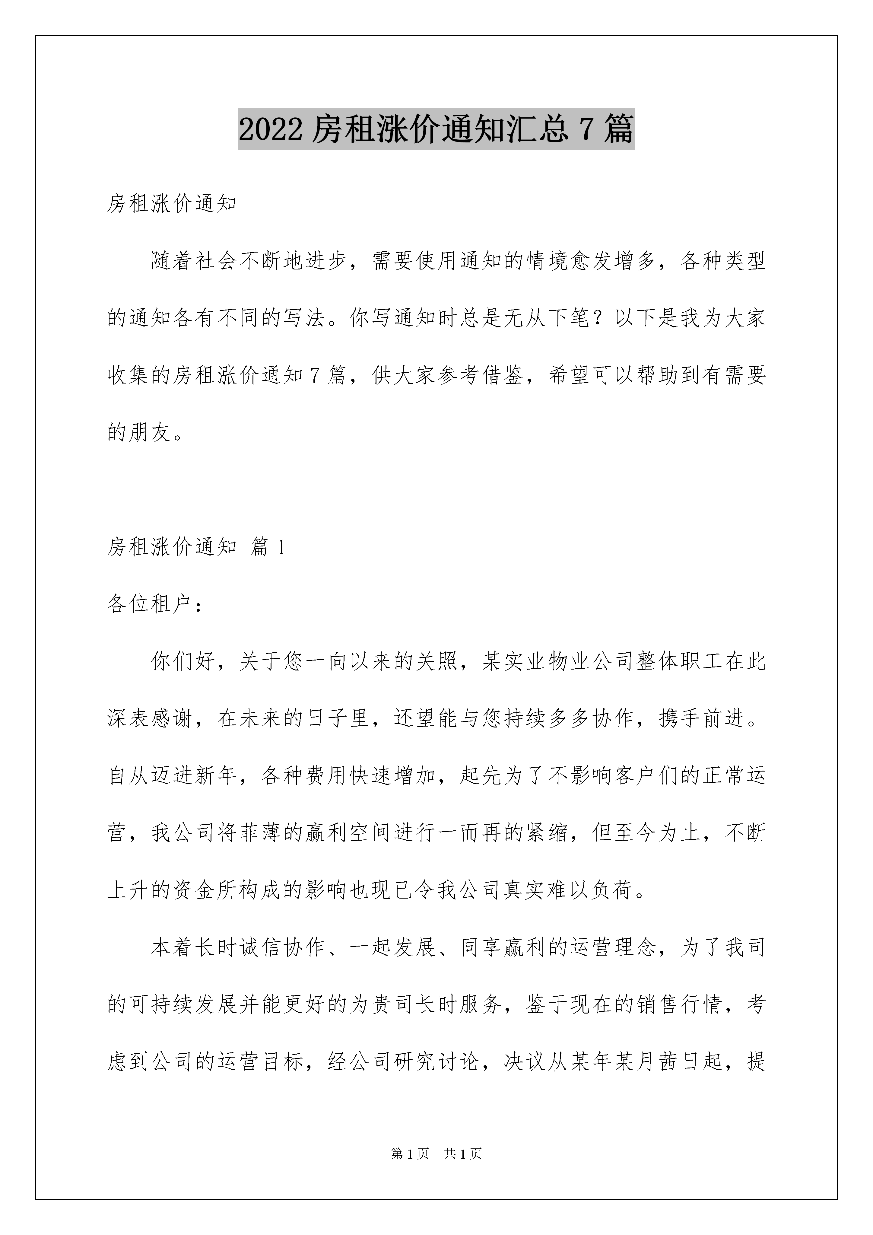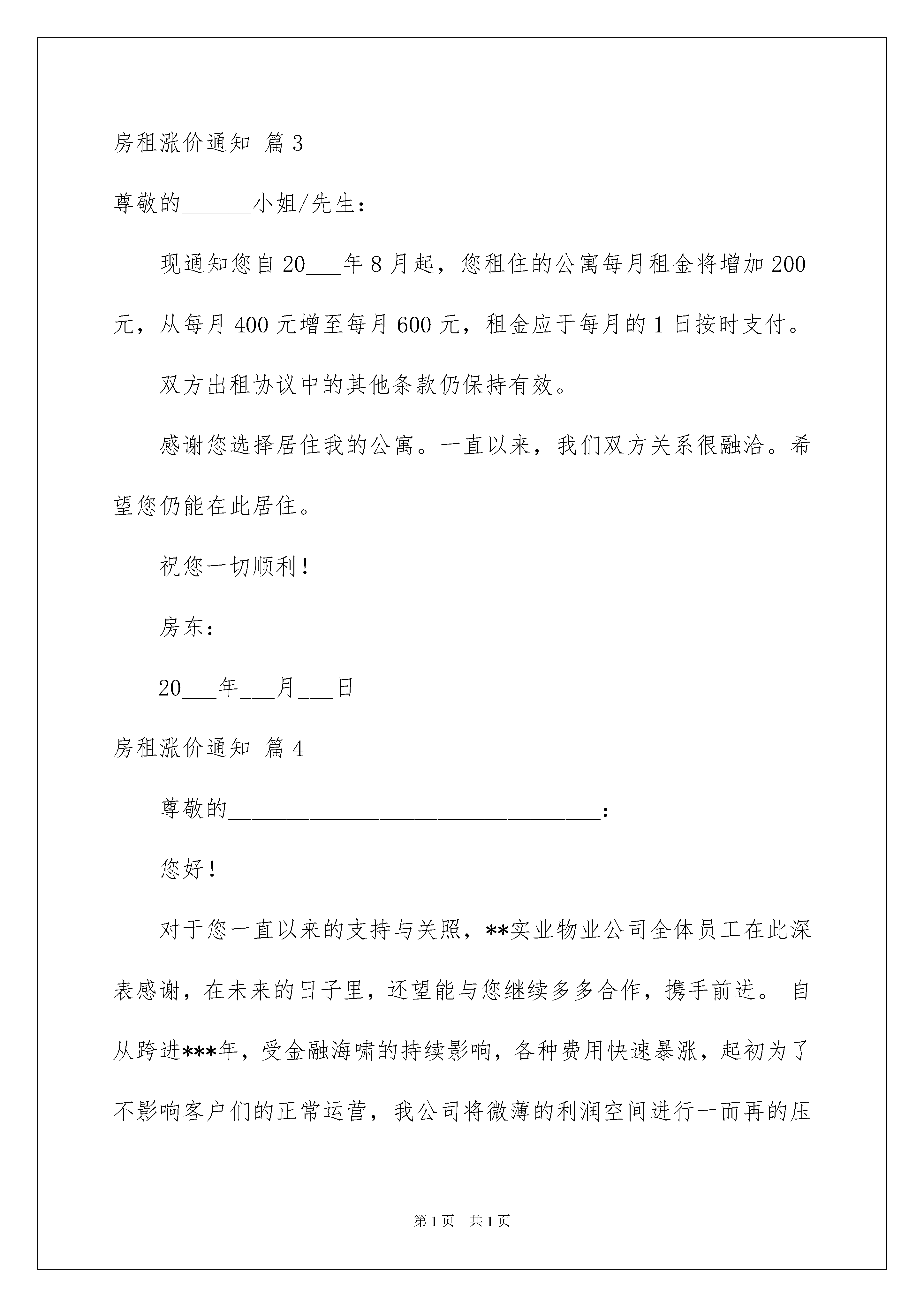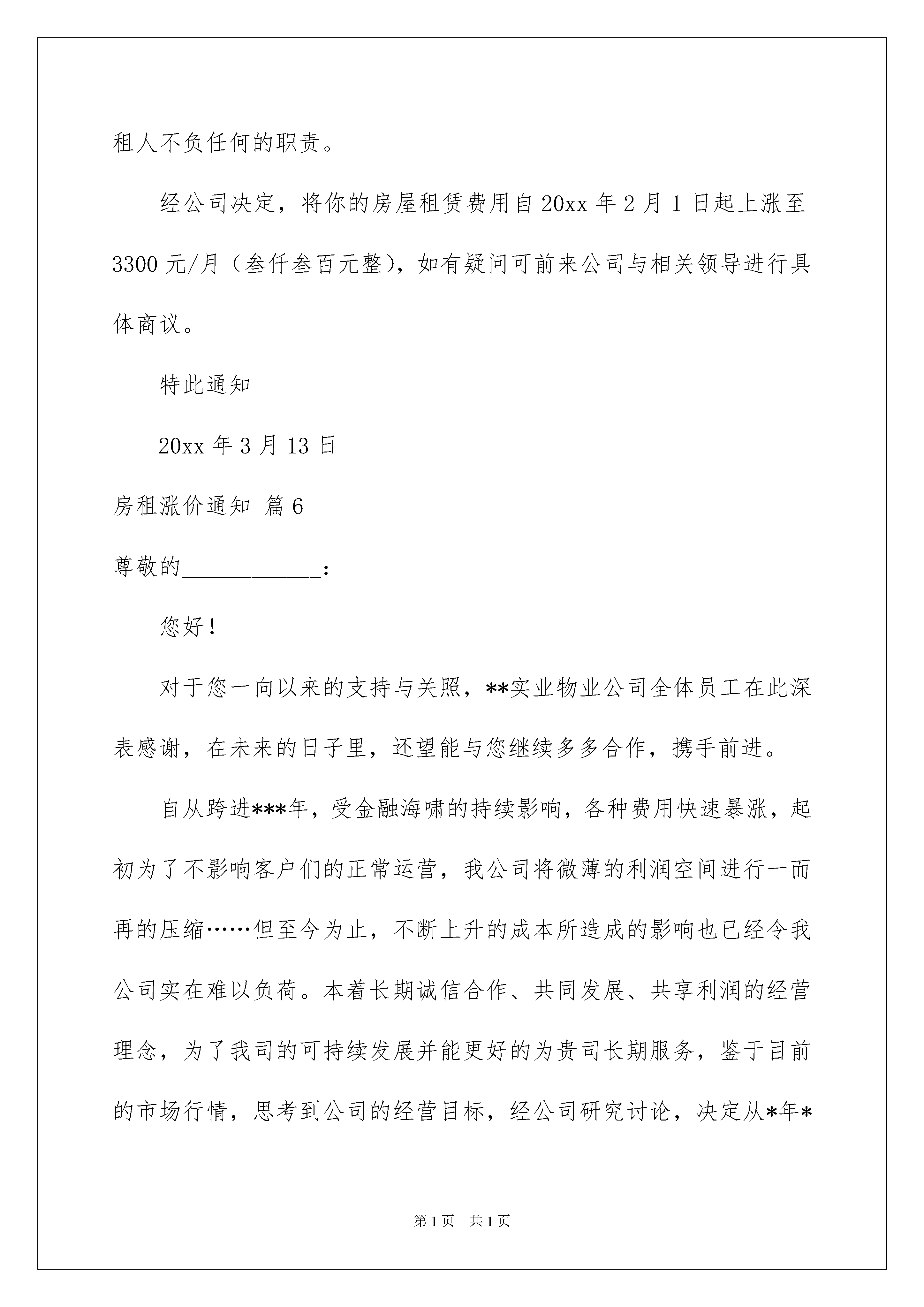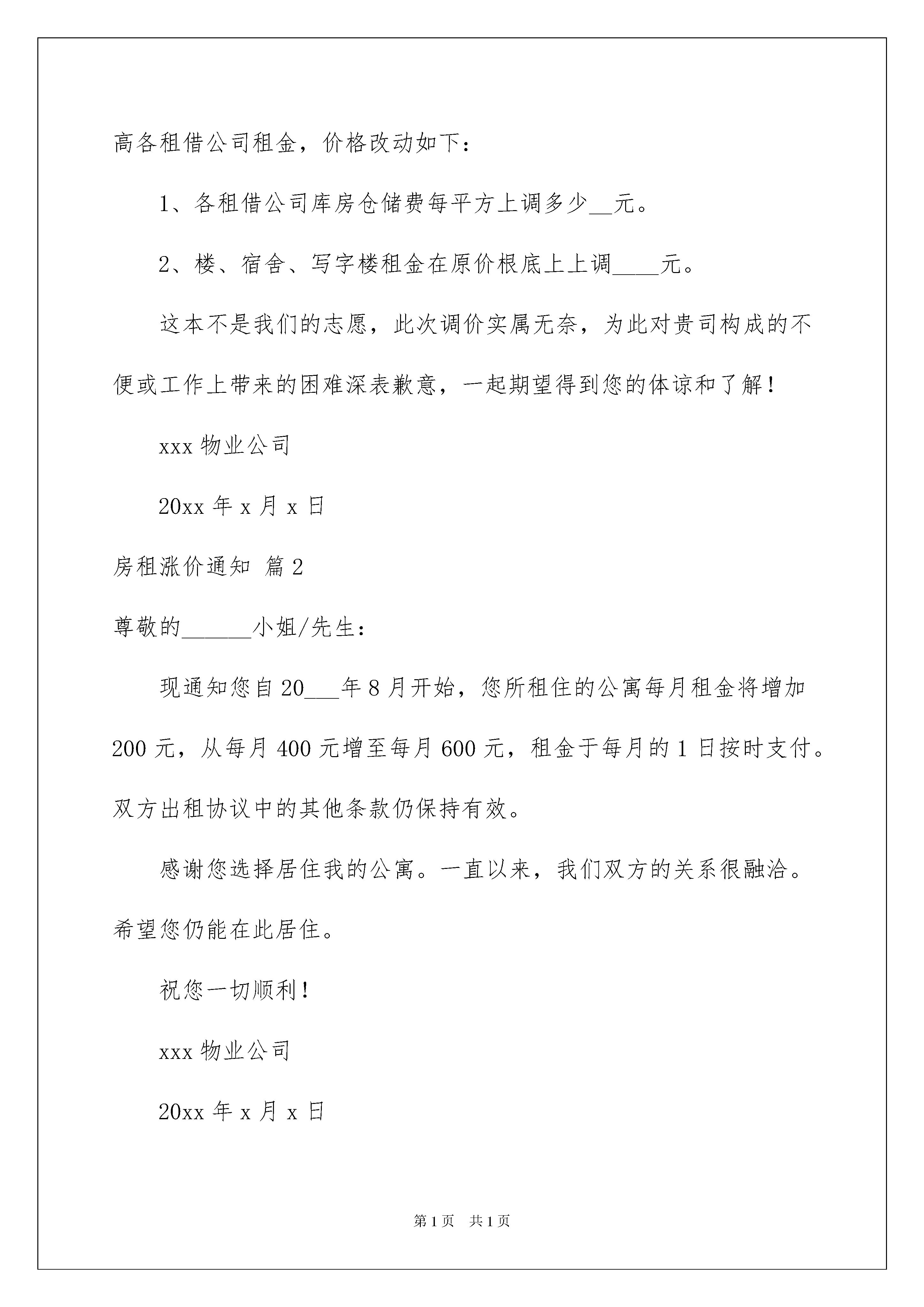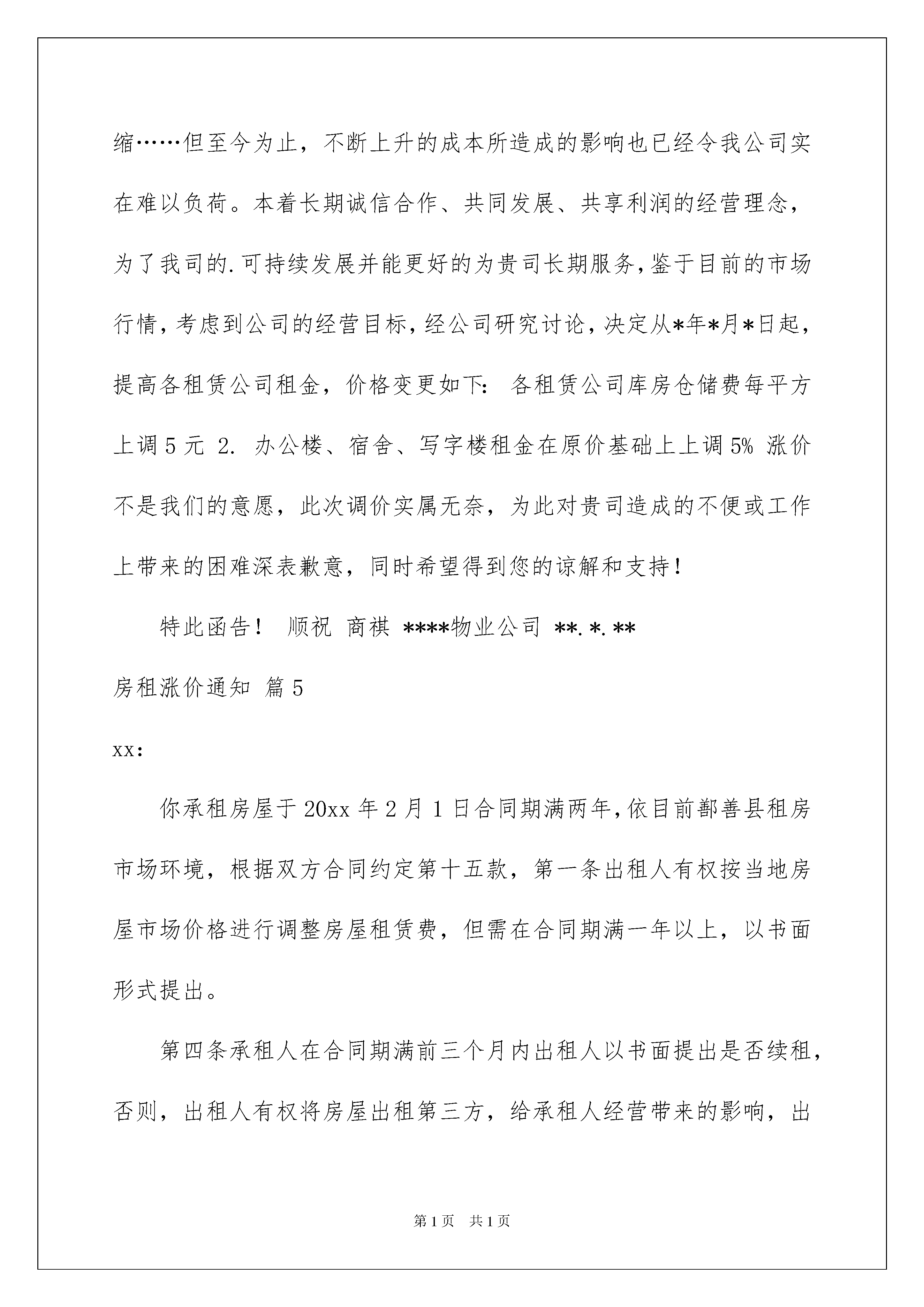 2022房租涨价通知汇总7篇房租涨价通知随着社会不断地进步,需要使用通知的情境愈发增多,各种类型的通知各有不同的写法。你写通知时总是无从下笔?以下是我为大家收集的房租涨价通知7篇,供大家参考借鉴,希望可以帮助到有需要的朋友。房租涨价通知篇1各位租户:你们好,关于您一向以来的关照,某实业物业公司整体职工在此深表感谢,在未来的日子里,还望能与您持续多多协作,携手前进。自从迈进新年,各种费用快速增加,起先为了不影响客户们的正常运营,我公司将菲薄的赢利空间进行一而再的紧缩,但至今为止,不断上升的资金所构成的影响也现已令我公司真实难以负荷。本着长时诚信协作、一起发展、同享赢利的运营理念,为了我司的可持续发展并能更好的为贵司长时服务,鉴于现在的销售行情,考虑到公司的运营目标,经公司研究讨论,决议从某年某月茜日起,提高各租借公司租金,价格改动如下:1、各租借公司库房仓储费每平方上调多少__元。2、楼、宿舍、写字楼租金在原价根底上上调____元。这本不是我们的志愿,此次调价实属无奈,为此对贵司构成的不便或工作上带来的困难深表歉意,一起期望得到您的体谅和了解!xxx物业公司20xx年x月x日房租涨价通知篇2尊敬的______小姐/先生:现通知您自20___年8月开始,您所租住的公寓每月租金将增加200元,从每月400元增至每月600元,租金于每月的1日按时支付。双方出租协议中的其他条款仍保持有效。感谢您选择居住我的公寓。一直以来,我们双方的关系很融洽。希望您仍能在此居住。祝您一切顺利!xxx物业公司20xx年x月x日房租涨价通知篇3尊敬的______小姐/先生:现通知您自20___年8月起,您租住的公寓每月租金将增加200元,从每月400元增至每月600元,租金应于每月的1日按时支付。双方出租协议中的其他条款仍保持有效。感谢您选择居住我的公寓。一直以来,我们双方关系很融洽。希望您仍能在此居住。祝您一切顺利!房东:______20___年___月___日房租涨价通知篇4尊敬的________________________________:您好!对于您一直以来的支持与关照,**实业物业公司全体员工在此深表感谢,在未来的日子里,还望能与您继续多多合作,携手前进。自从跨进***年,受金融海啸的持续影响,各种费用快速暴涨,起初为了不影响客户们的正常运营,我公司将微薄的利润空间进行一而再的压缩……但至今为止,不断上升的成本所造成的影响也已经令我公司实在难以负荷。本着长期诚信合作、共同发展、共享利润的经营理念,为了我司的.可持续发展并能更好的为贵司长期服务,鉴于目前的市场行情,考虑到公司的经营目标,经公司研究讨论,决定从*年*月*日起,提高各租赁公司租金,价格变更如下:各租赁公司库房仓储费每平方上调5元2.办公楼、宿舍、写字楼租金在原价基础上上调5%涨价不是我们的意愿,此次调价实属无奈,为此对贵司造成的不便或工作上带来的困难深表歉意,同时希望得到您的谅解和支持!特此函告!顺祝商祺****物业公司**.*.**房租涨价通知篇5xx:你承租房屋于20xx年2月1日合同期满两年,依目前鄯善县租房市场环境,根据双方合同约定第十五款,第一条出租人有权按当地房屋市场价格进行调整房屋租赁费,但需在合同期满一年以上,以书面形式提出。第四条承租人在合同期满前三个月内出租人以书面提出是否续租,否则,出租人有权将房屋出租第三方,给承租人经营带来的影响,出租人不负任何的职责。经公司决定,将你的房屋租赁费用自20xx年2月1日起上涨至3300元/月(叁仟叁百元整),如有疑问可前来公司与相关领导进行具体商议。特此通知20xx年3月13日房租涨价通知篇6尊敬的____________:您好!对于您一向以来的支持与关照,**实业物业公司全体员工在此深表感谢,在未来的日子里,还望能与您继续多多合作,携手前进。自从跨进***年,受金融海啸的持续影响,各种费用快速暴涨,起初为了不影响客户们的正常运营,我公司将微薄的利润空间进行一而再的压缩……但至今为止,不断上升的成本所造成的影响也已经令我公司实在难以负荷。本着长期诚信合作、共同发展、共享利润的经营理念,为了我司的可持续发展并能更好的为贵司长期服务,鉴于目前的市场行情,思考到公司的经营目标,经公司研究讨论,决定从*年*月*日起,提高各租赁公司租金,价格变更如下:1.各租赁公司库房仓储费每平方上调5元2.办公楼、宿舍、写字楼租金在原价基础上上调5%涨价不是我们的意愿,此次调价实属无奈,为此对贵司造成的不便或工作上带来的困难深表歉意,同时期望得到您的谅解和支持!顺祝商祺****物业公司20xx