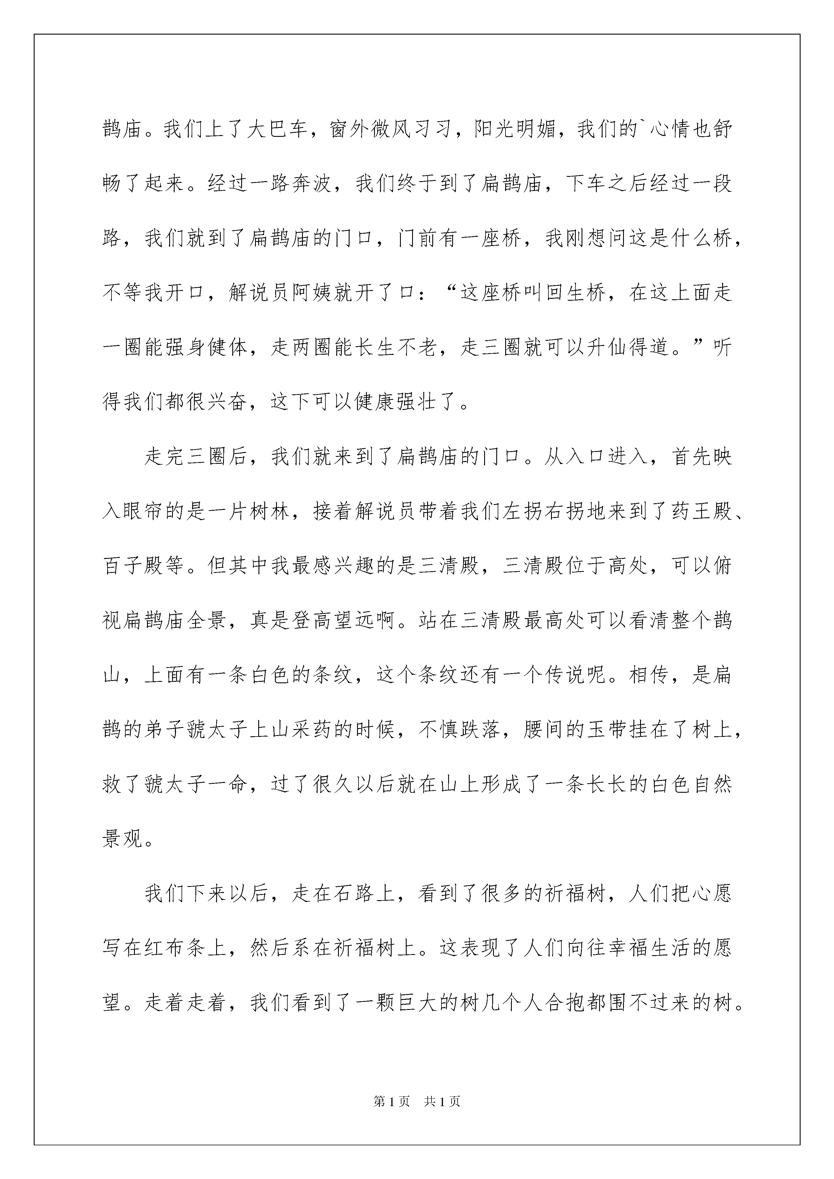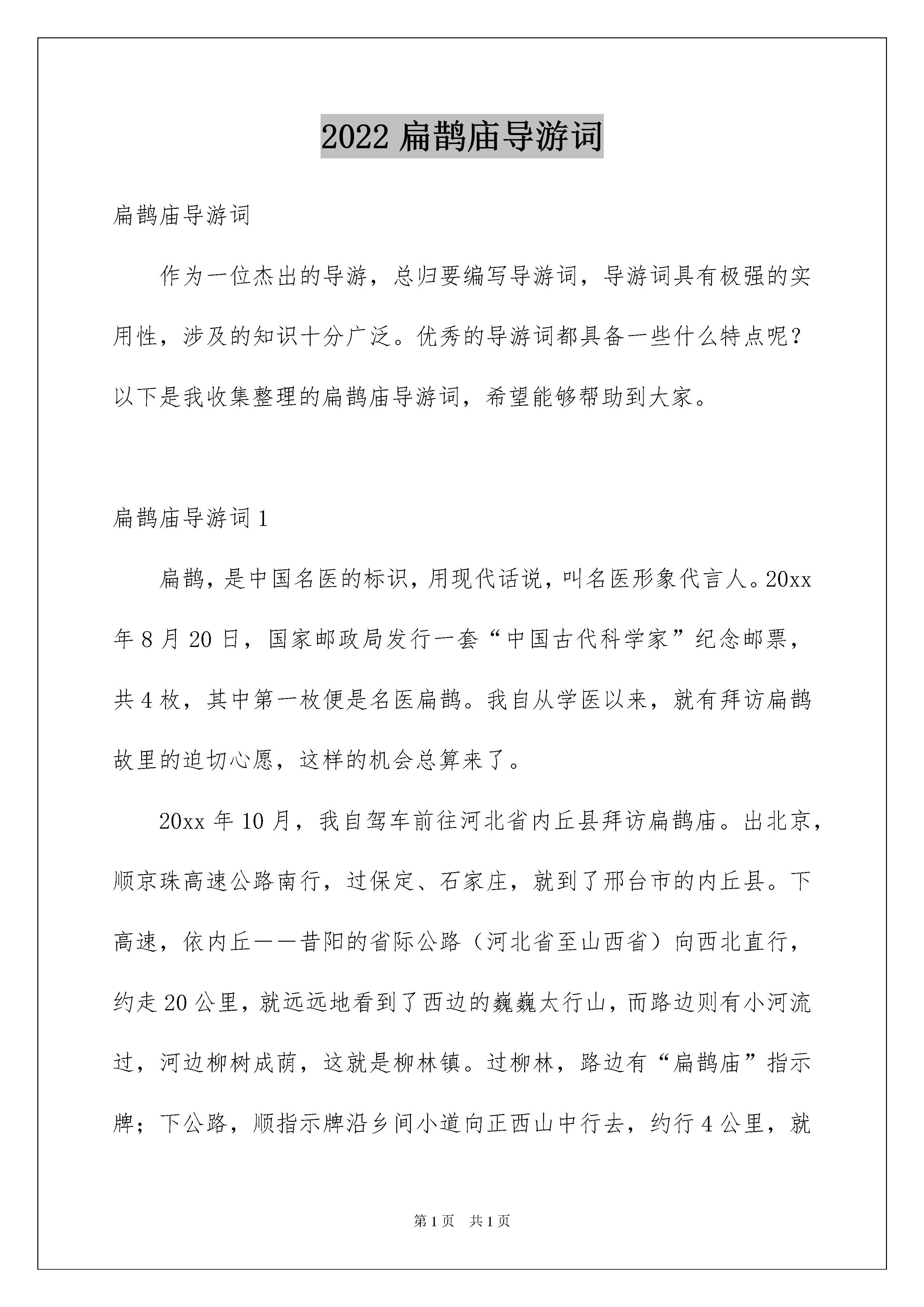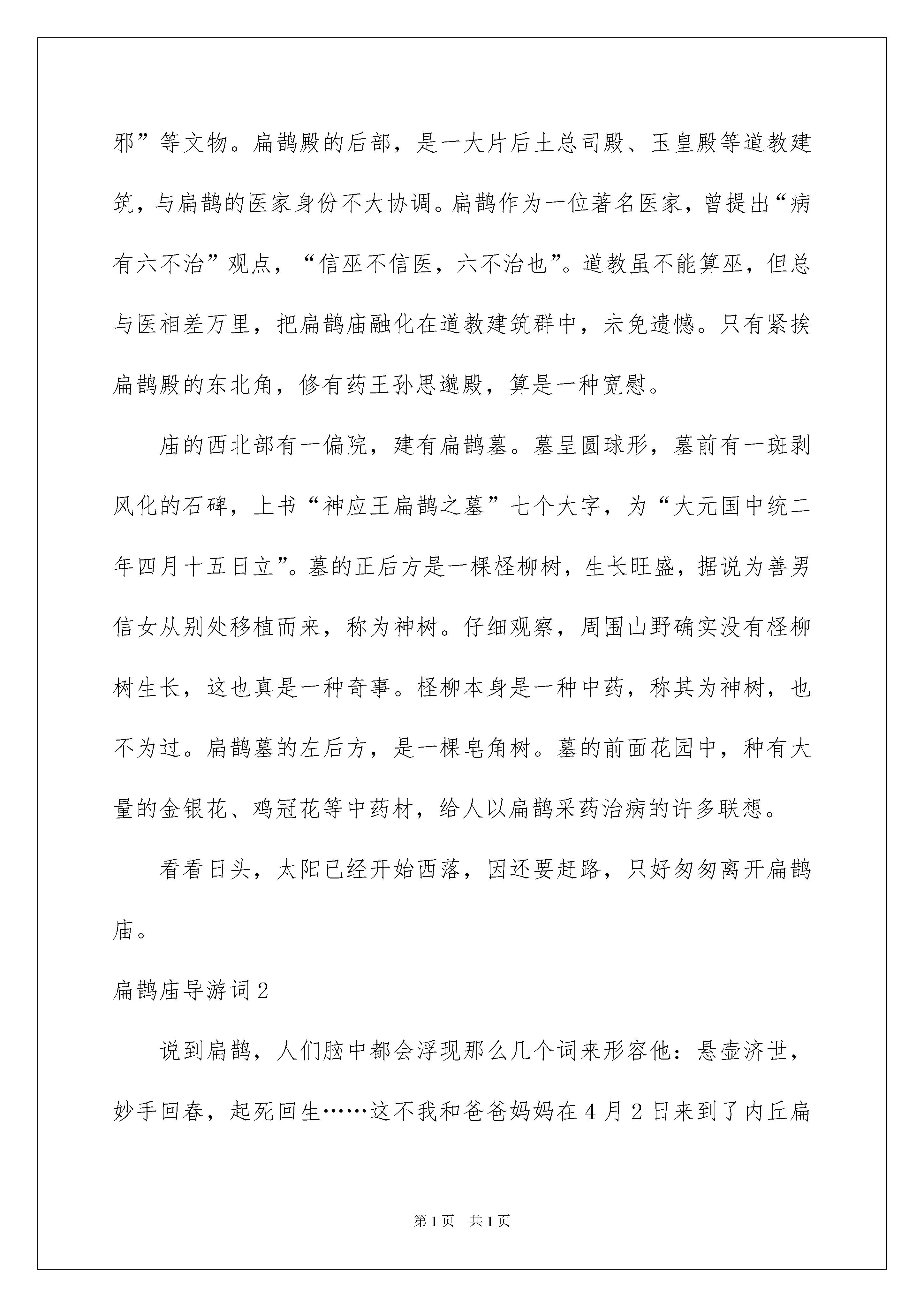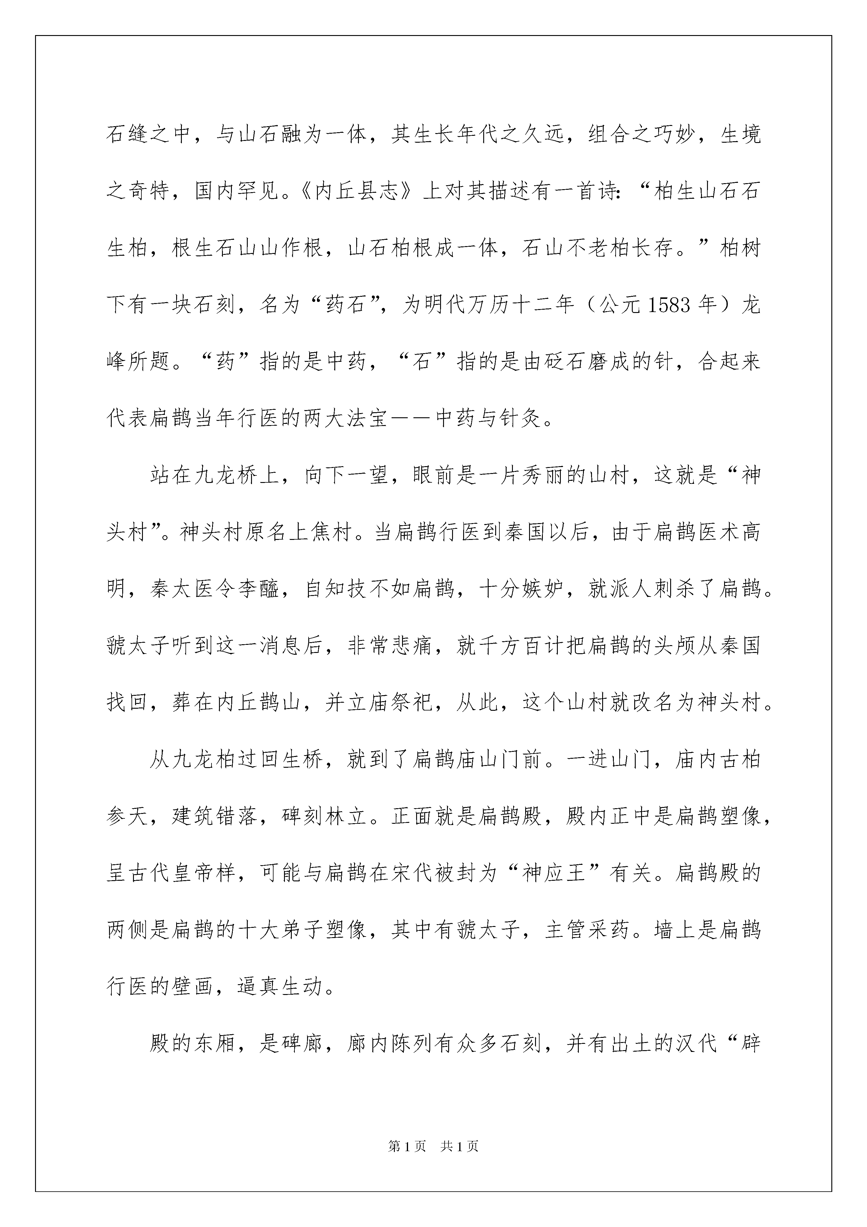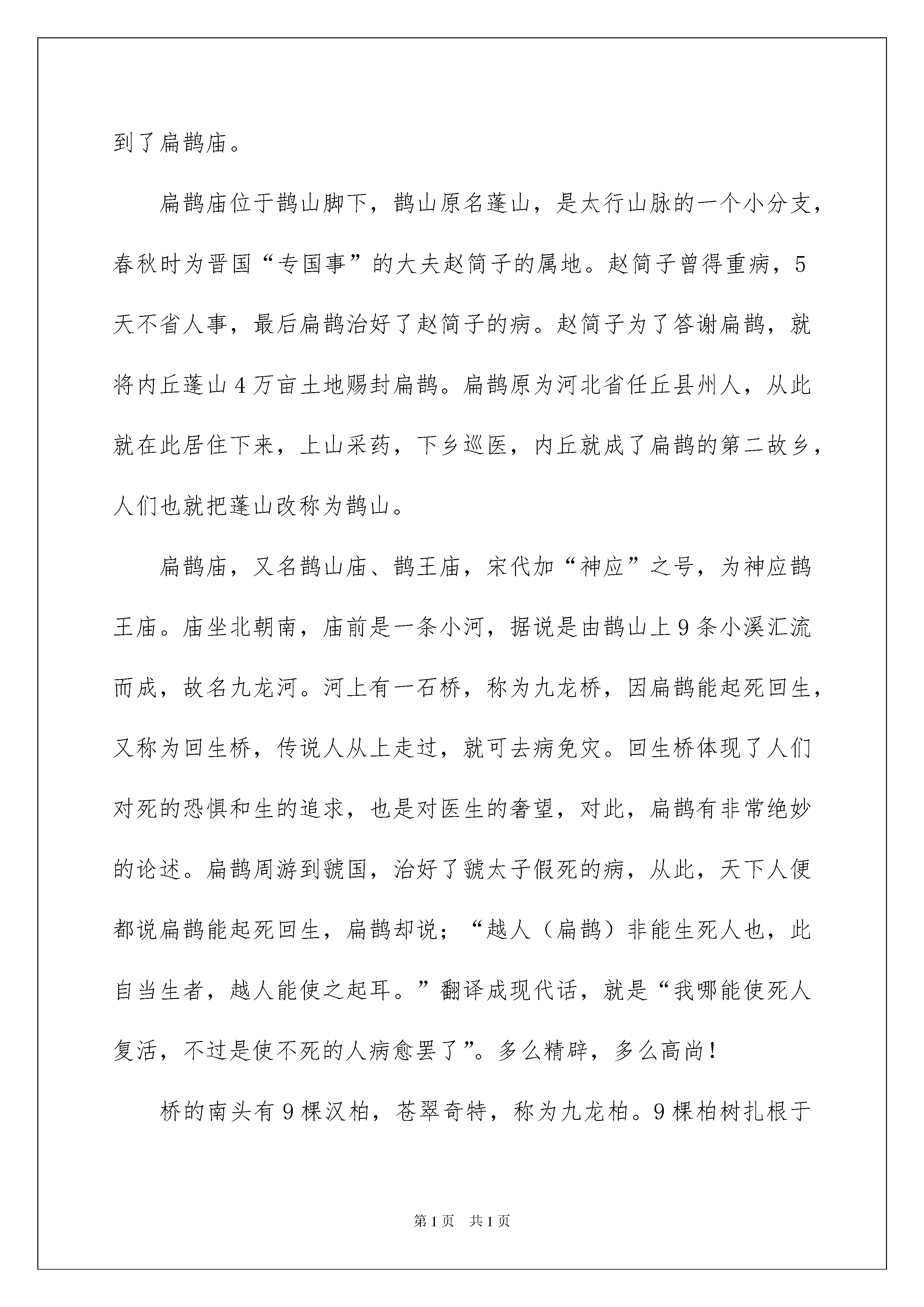 2022扁鹊庙导游词扁鹊庙导游词作为一位杰出的导游,总归要编写导游词,导游词具有极强的实用性,涉及的知识十分广泛。优秀的导游词都具备一些什么特点呢?以下是我收集整理的扁鹊庙导游词,希望能够帮助到大家。扁鹊庙导游词1扁鹊,是中国名医的标识,用现代话说,叫名医形象代言人。20xx年8月20日,国家邮政局发行一套“中国古代科学家”纪念邮票,共4枚,其中第一枚便是名医扁鹊。我自从学医以来,就有拜访扁鹊故里的迫切心愿,这样的机会总算来了。20xx年10月,我自驾车前往河北省内丘县拜访扁鹊庙。出北京,顺京珠高速公路南行,过保定、石家庄,就到了邢台市的内丘县。下高速,依内丘――昔阳的省际公路(河北省至山西省)向西北直行,约走20公里,就远远地看到了西边的巍巍太行山,而路边则有小河流过,河边柳树成荫,这就是柳林镇。过柳林,路边有“扁鹊庙”指示牌;下公路,顺指示牌沿乡间小道向正西山中行去,约行4公里,就到了扁鹊庙。扁鹊庙位于鹊山脚下,鹊山原名蓬山,是太行山脉的一个小分支,春秋时为晋国“专国事”的大夫赵简子的属地。赵简子曾得重病,5天不省人事,最后扁鹊治好了赵简子的病。赵简子为了答谢扁鹊,就将内丘蓬山4万亩土地赐封扁鹊。扁鹊原为河北省任丘县州人,从此就在此居住下来,上山采药,下乡巡医,内丘就成了扁鹊的第二故乡,人们也就把蓬山改称为鹊山。扁鹊庙,又名鹊山庙、鹊王庙,宋代加“神应”之号,为神应鹊王庙。庙坐北朝南,庙前是一条小河,据说是由鹊山上9条小溪汇流而成,故名九龙河。河上有一石桥,称为九龙桥,因扁鹊能起死回生,又称为回生桥,传说人从上走过,就可去病免灾。回生桥体现了人们对死的恐惧和生的追求,也是对医生的奢望,对此,扁鹊有非常绝妙的论述。扁鹊周游到虢国,治好了虢太子假死的病,从此,天下人便都说扁鹊能起死回生,扁鹊却说;“越人(扁鹊)非能生死人也,此自当生者,越人能使之起耳。”翻译成现代话,就是“我哪能使死人复活,不过是使不死的人病愈罢了”。多么精辟,多么高尚!桥的南头有9棵汉柏,苍翠奇特,称为九龙柏。9棵柏树扎根于石缝之中,与山石融为一体,其生长年代之久远,组合之巧妙,生境之奇特,国内罕见。《内丘县志》上对其描述有一首诗:“柏生山石石生柏,根生石山山作根,山石柏根成一体,石山不老柏长存。”柏树下有一块石刻,名为“药石”,为明代万历十二年(公元1583年)龙峰所题。“药”指的是中药,“石”指的是由砭石磨成的针,合起来代表扁鹊当年行医的两大法宝――中药与针灸。站在九龙桥上,向下一望,眼前是一片秀丽的山村,这就是“神头村”。神头村原名上焦村。当扁鹊行医到秦国以后,由于扁鹊医术高明,秦太医令李醯,自知技不如扁鹊,十分嫉妒,就派人刺杀了扁鹊。虢太子听到这一消息后,非常悲痛,就千方百计把扁鹊的头颅从秦国找回,葬在内丘鹊山,并立庙祭祀,从此,这个山村就改名为神头村。从九龙柏过回生桥,就到了扁鹊庙山门前。一进山门,庙内古柏参天,建筑错落,碑刻林立。正面就是扁鹊殿,殿内正中是扁鹊塑像,呈古代皇帝样,可能与扁鹊在宋代被封为“神应王”有关。扁鹊殿的两侧是扁鹊的十大弟子塑像,其中有虢太子,主管采药。墙上是扁鹊行医的壁画,逼真生动。殿的东厢,是碑廊,廊内陈列有众多石刻,并有出土的汉代“辟邪”等文物。扁鹊殿的后部,是一大片后土总司殿、玉皇殿等道教建筑,与扁鹊的医家身份不大协调。扁鹊作为一位著名医家,曾提出“病有六不治”观点,“信巫不信医,六不治也”。道教虽不能算巫,但总与医相差万里,把扁鹊庙融化在道教建筑群中,未免遗憾。只有紧挨扁鹊殿的东北角,修有药王孙思邈殿,算是一种宽慰。庙的西北部有一偏院,建有扁鹊墓。墓呈圆球形,墓前有一斑剥风化的石碑,上书“神应王扁鹊之墓”七个大字,为“大元国中统二年四月十五日立”。墓的正后方是一棵柽柳树,生长旺盛,据说为善男信女从别处移植而来,称为神树。仔细观察,周围山野确实没有柽柳树生长,这也真是一种奇事。柽柳本身是一种中药,称其为神树,也不为过。扁鹊墓的左后方,是一棵皂角树。墓的前面花园中,种有大量的金银花、鸡冠花等中药材,给人以扁鹊采药治病的许多联想。看看日头,太阳已经开始西落,因还要赶路,只好匆匆离开扁鹊庙。扁鹊庙导游词2说到扁鹊,人们脑中都会浮现那么几个词来形容他:悬壶济世,妙手回春,起死回生……这不我和爸爸妈妈在4月2日来到了内丘扁鹊庙。我们上了大巴车,窗外微风习习,阳光明媚,我们的`心情也舒畅了起来。经过一路奔波,我们终于到了扁鹊庙,下车之后经过一段路,我们就到了扁鹊庙的门口,门前有一座桥,我刚想问这是什么桥,不等我开口,解说员阿姨就开了口:“这座桥叫回生桥,在这上面走一圈能强身健