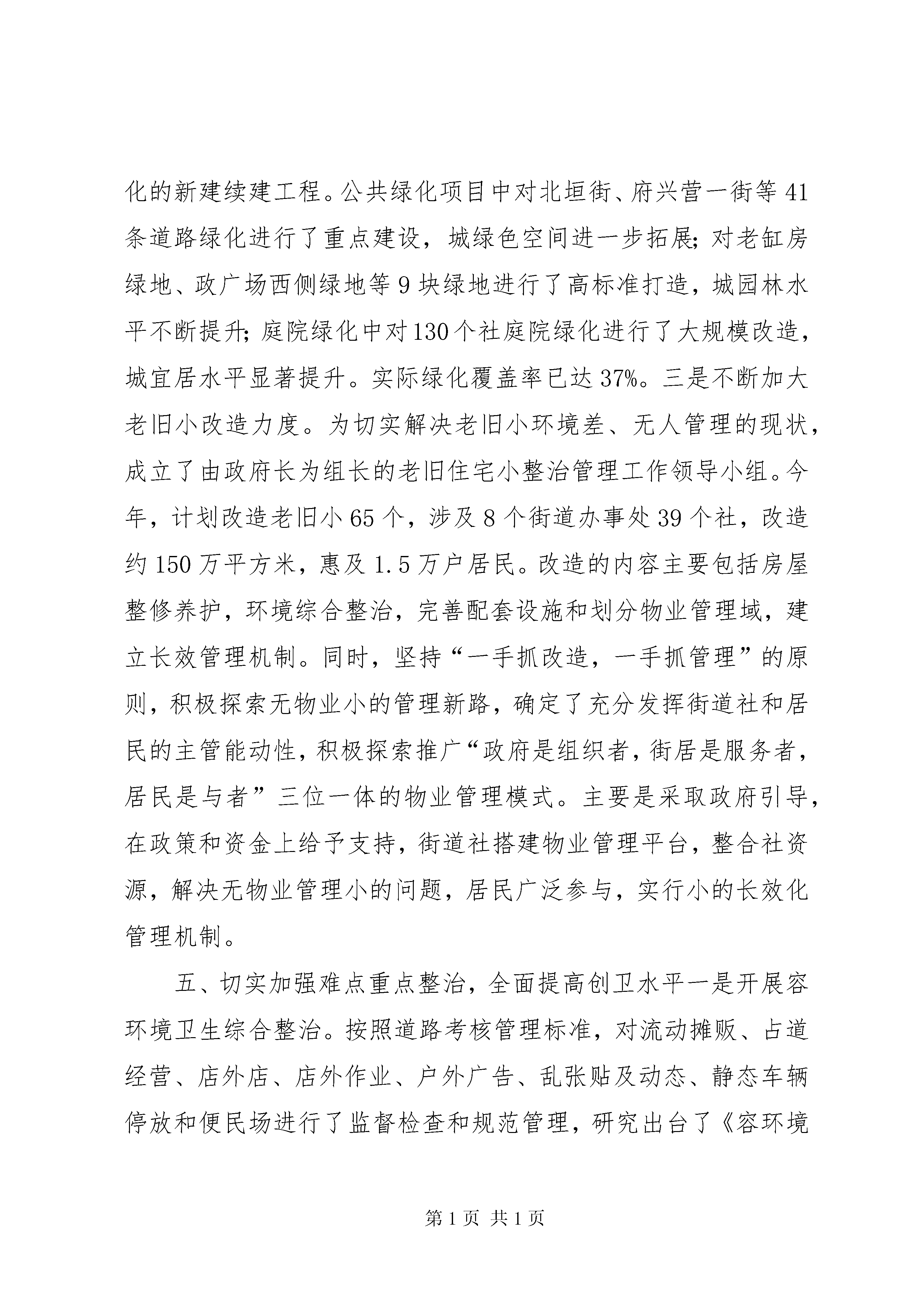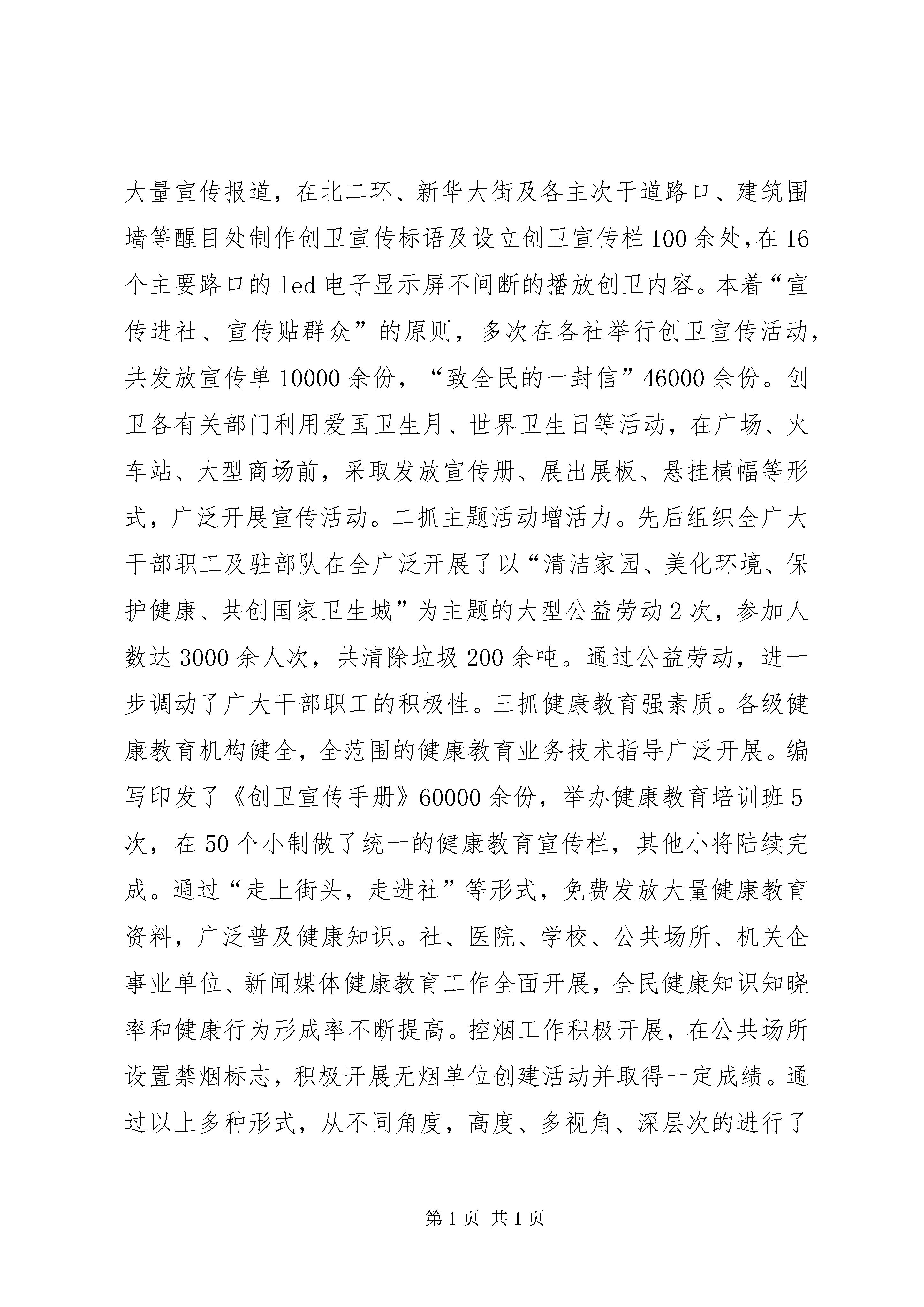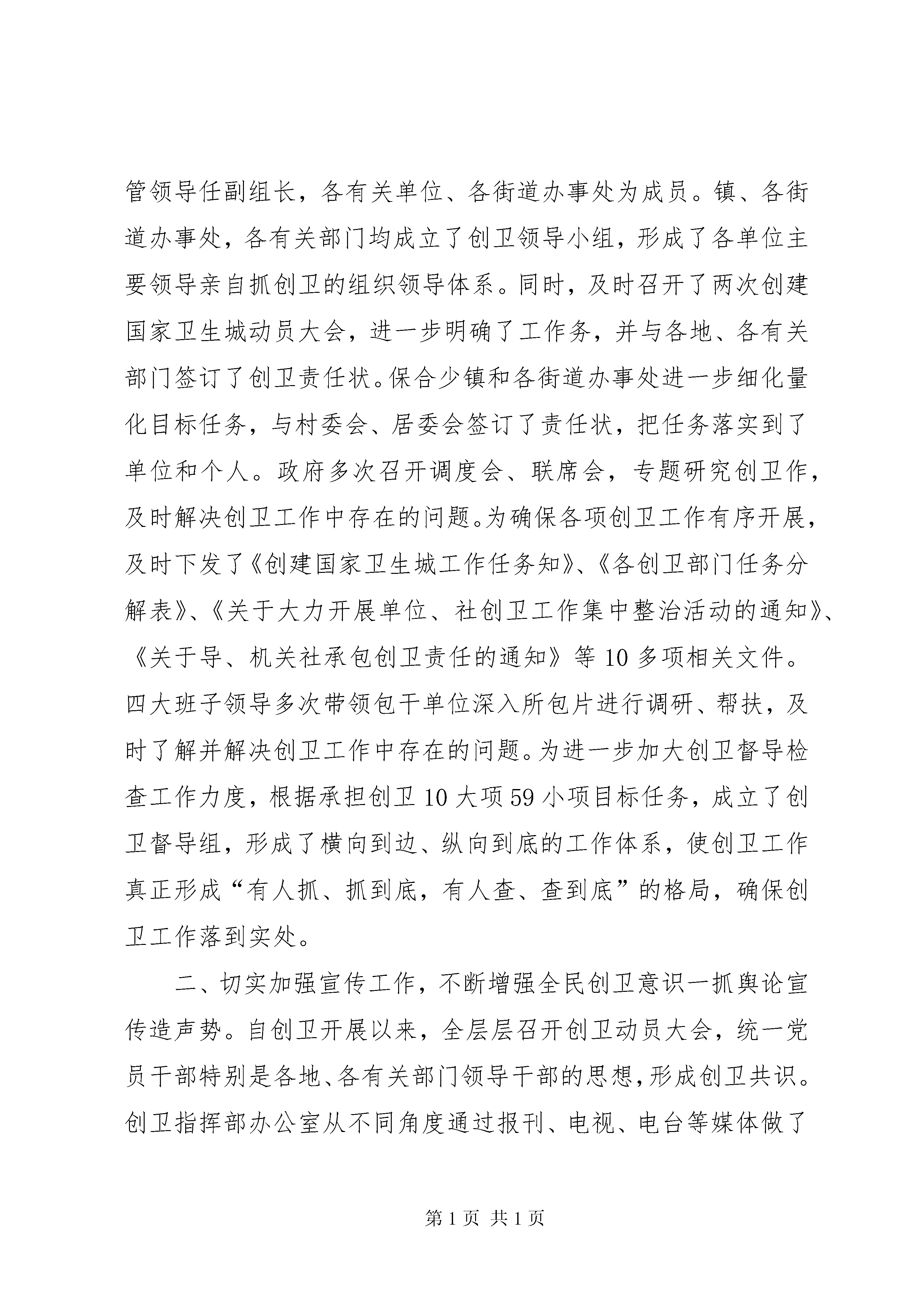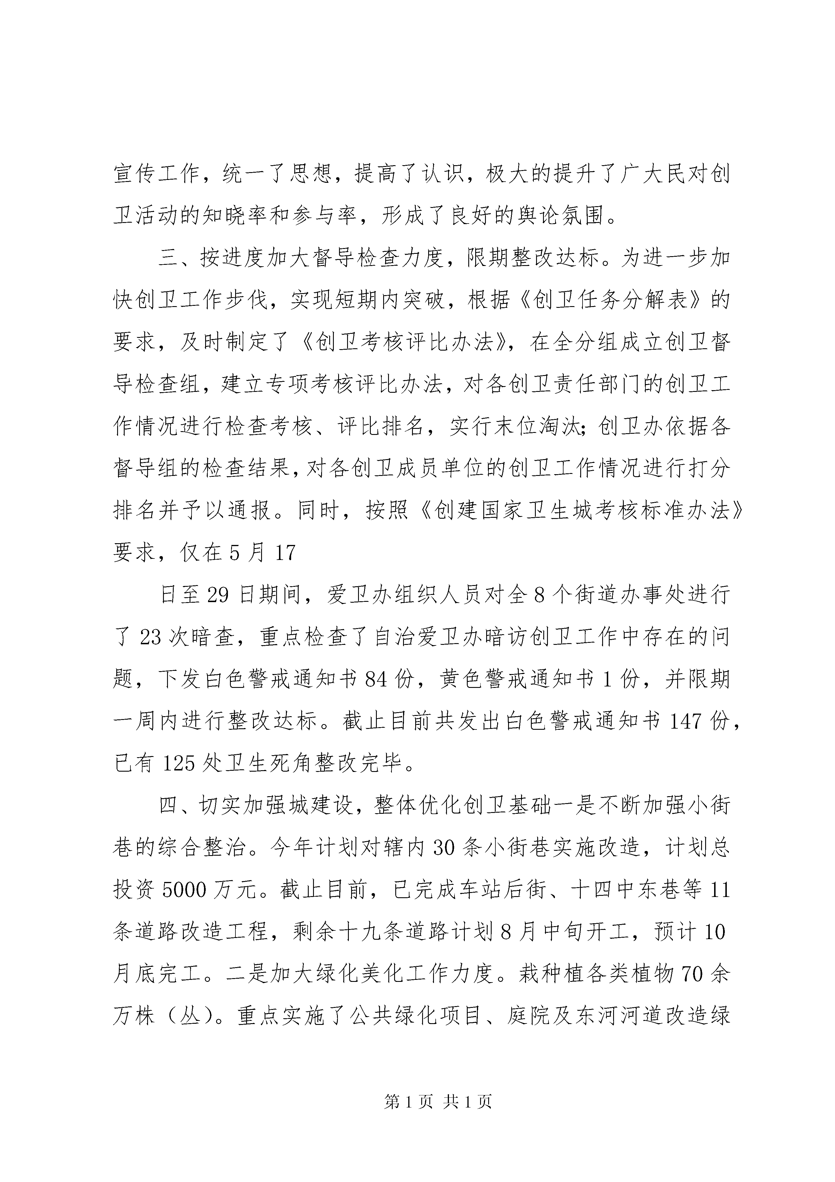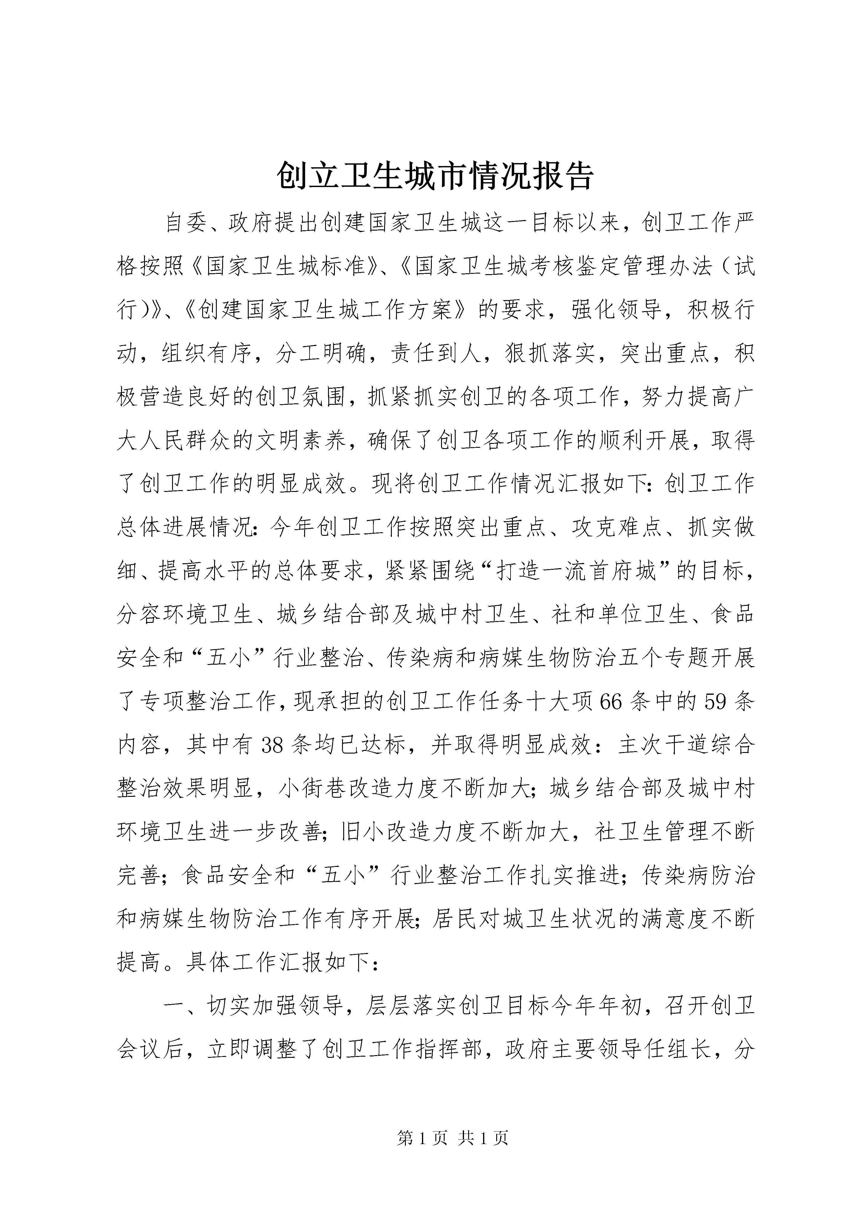 创立卫生城市情况报告自委、政府提出创建国家卫生城这一目标以来,创卫工作严格按照《国家卫生城标准》、《国家卫生城考核鉴定管理办法(试行)》、《创建国家卫生城工作方案》的要求,强化领导,积极行动,组织有序,分工明确,责任到人,狠抓落实,突出重点,积极营造良好的创卫氛围,抓紧抓实创卫的各项工作,努力提高广大人民群众的文明素养,确保了创卫各项工作的顺利开展,取得了创卫工作的明显成效。现将创卫工作情况汇报如下:创卫工作总体进展情况:今年创卫工作按照突出重点、攻克难点、抓实做细、提高水平的总体要求,紧紧围绕“打造一流首府城”的目标,分容环境卫生、城乡结合部及城中村卫生、社和单位卫生、食品安全和“五小”行业整治、传染病和病媒生物防治五个专题开展了专项整治工作,现承担的创卫工作任务十大项66条中的59条内容,其中有38条均已达标,并取得明显成效:主次干道综合整治效果明显,小街巷改造力度不断加大;城乡结合部及城中村环境卫生进一步改善;旧小改造力度不断加大,社卫生管理不断完善;食品安全和“五小”行业整治工作扎实推进;传染病防治和病媒生物防治工作有序开展;居民对城卫生状况的满意度不断提高。具体工作汇报如下:一、切实加强领导,层层落实创卫目标今年年初,召开创卫会议后,立即调整了创卫工作指挥部,政府主要领导任组长,分管领导任副组长,各有关单位、各街道办事处为成员。镇、各街道办事处,各有关部门均成立了创卫领导小组,形成了各单位主要领导亲自抓创卫的组织领导体系。同时,及时召开了两次创建国家卫生城动员大会,进一步明确了工作务,并与各地、各有关部门签订了创卫责任状。保合少镇和各街道办事处进一步细化量化目标任务,与村委会、居委会签订了责任状,把任务落实到了单位和个人。政府多次召开调度会、联席会,专题研究创卫作,及时解决创卫工作中存在的问题。为确保各项创卫工作有序开展,及时下发了《创建国家卫生城工作任务知》、《各创卫部门任务分解表》、《关于大力开展单位、社创卫工作集中整治活动的通知》、《关于导、机关社承包创卫责任的通知》等10多项相关文件。四大班子领导多次带领包干单位深入所包片进行调研、帮扶,及时了解并解决创卫工作中存在的问题。为进一步加大创卫督导检查工作力度,根据承担创卫10大项59小项目标任务,成立了创卫督导组,形成了横向到边、纵向到底的工作体系,使创卫工作真正形成“有人抓、抓到底,有人查、查到底”的格局,确保创卫工作落到实处。二、切实加强宣传工作,不断增强全民创卫意识一抓舆论宣传造声势。自创卫开展以来,全层层召开创卫动员大会,统一党员干部特别是各地、各有关部门领导干部的思想,形成创卫共识。创卫指挥部办公室从不同角度通过报刊、电视、电台等媒体做了大量宣传报道,在北二环、新华大街及各主次干道路口、建筑围墙等醒目处制作创卫宣传标语及设立创卫宣传栏100余处,在16个主要路口的led电子显示屏不间断的播放创卫内容。本着“宣传进社、宣传贴群众”的原则,多次在各社举行创卫宣传活动,共发放宣传单10000余份,“致全民的一封信”46000余份。创卫各有关部门利用爱国卫生月、世界卫生日等活动,在广场、火车站、大型商场前,采取发放宣传册、展出展板、悬挂横幅等形式,广泛开展宣传活动。二抓主题活动增活力。先后组织全广大干部职工及驻部队在全广泛开展了以“清洁家园、美化环境、保护健康、共创国家卫生城”为主题的大型公益劳动2次,参加人数达3000余人次,共清除垃圾200余吨。通过公益劳动,进一步调动了广大干部职工的积极性。三抓健康教育强素质。各级健康教育机构健全,全范围的健康教育业务技术指导广泛开展。编写印发了《创卫宣传手册》60000余份,举办健康教育培训班5次,在50个小制做了统一的健康教育宣传栏,其他小将陆续完成。通过“走上街头,走进社”等形式,免费发放大量健康教育资料,广泛普及健康知识。社、医院、学校、公共场所、机关企事业单位、新闻媒体健康教育工作全面开展,全民健康知识知晓率和健康行为形成率不断提高。控烟工作积极开展,在公共场所设置禁烟标志,积极开展无烟单位创建活动并取得一定成绩。通过以上多种形式,从不同角度,高度、多视角、深层次的进行了宣传工作,统一了思想,提高了认识,极大的提升了广大民对创卫活动的知晓率和参与率,形成了良好的舆论氛围。三、按进度加大督导检查力度,限期整改达标。为进一步加快创卫工作步伐,实现短期内突破,根据《创卫任务分解表》的要求,及时制定了《创卫考核评比办法》,在全分组成立创卫督导检查组,建立专项考核评比办法,对各创卫责任部门的创卫工作情况进行检查考核、评比排名,实行末位淘汰;创卫办依据各督导组的检查结果,对各创卫成员单位的创卫工作情况进行打分排名并予以通报。同时,按照《创建国家卫生城考核标准办法》要求,仅在5月17日至29日期间,