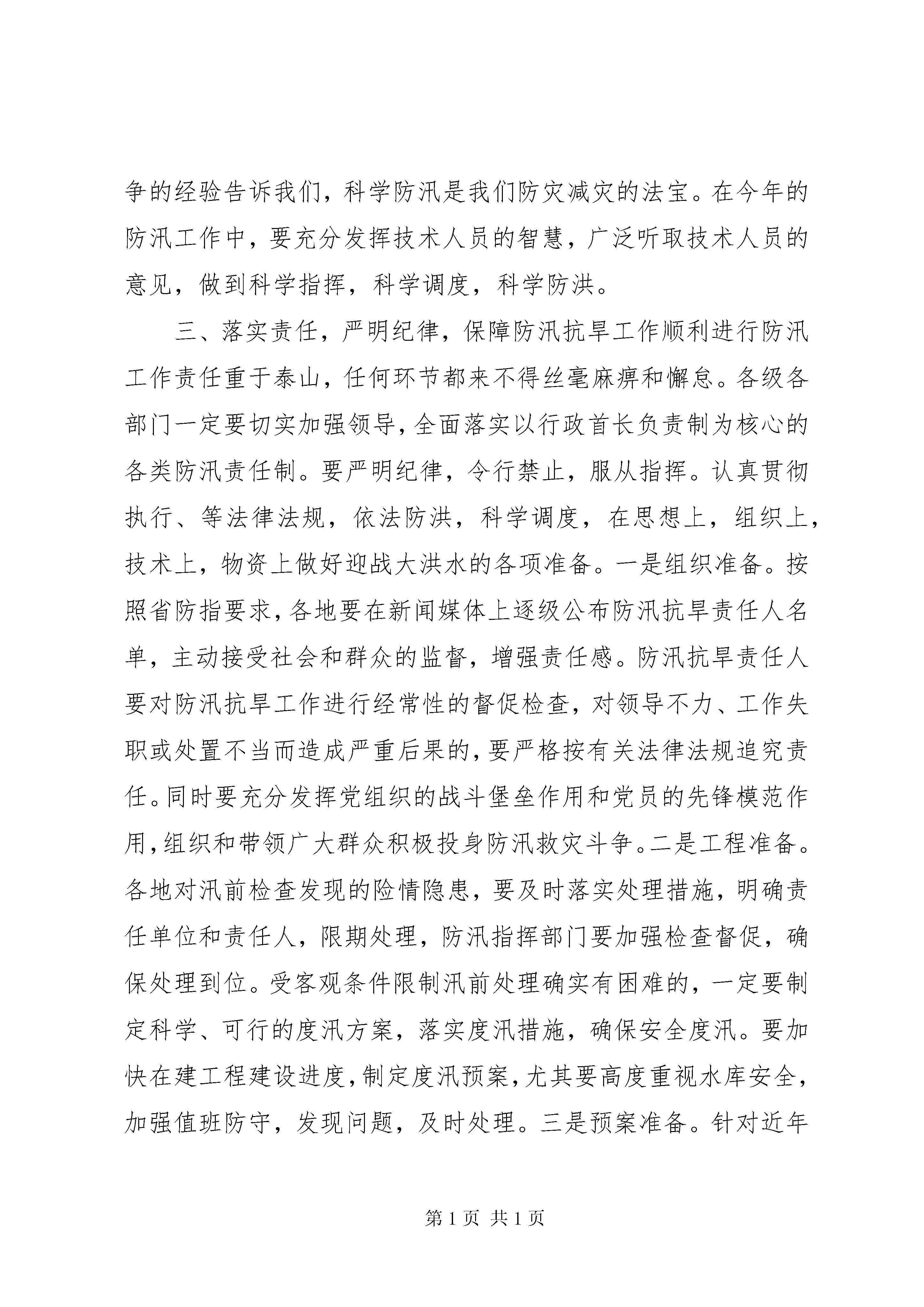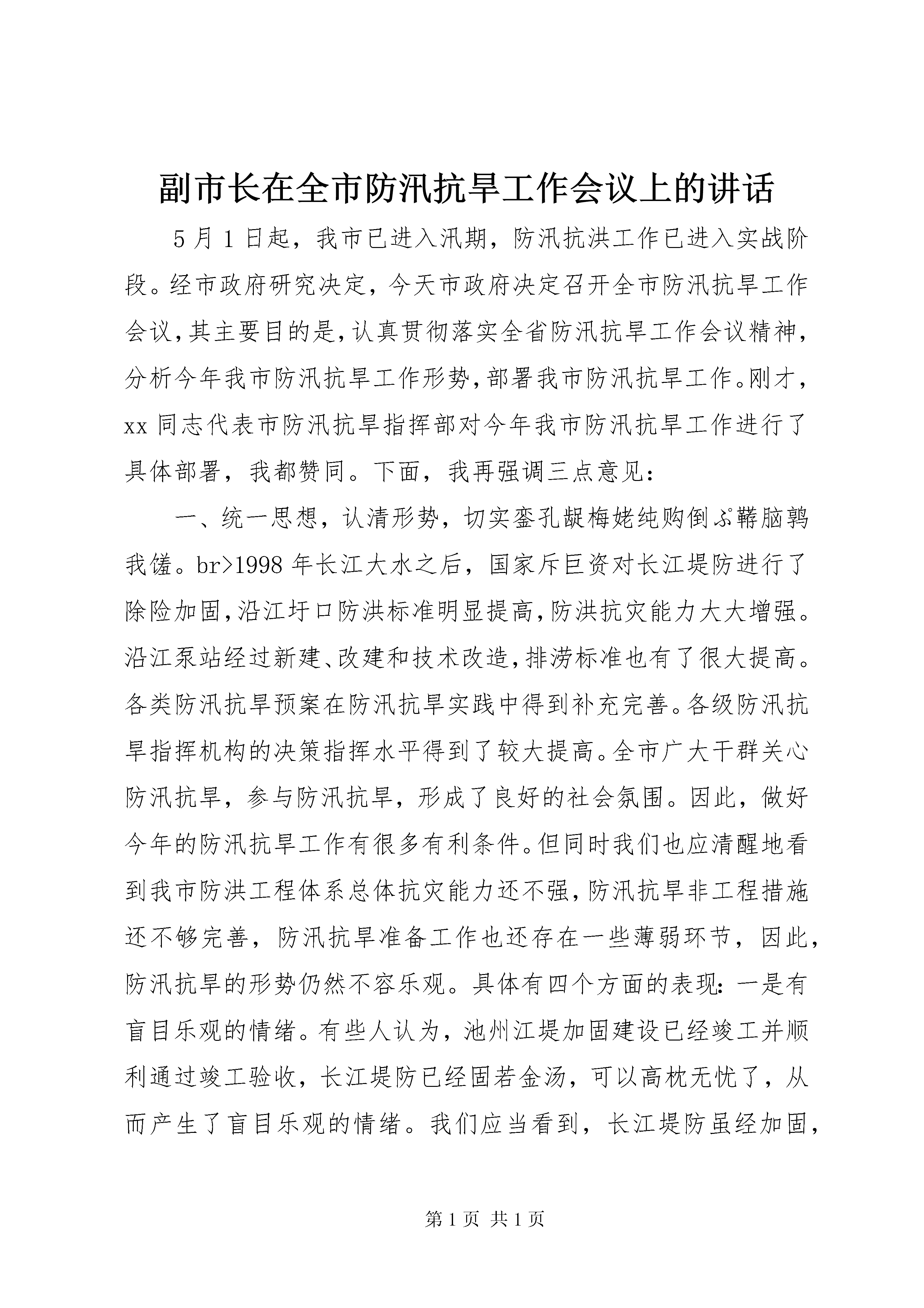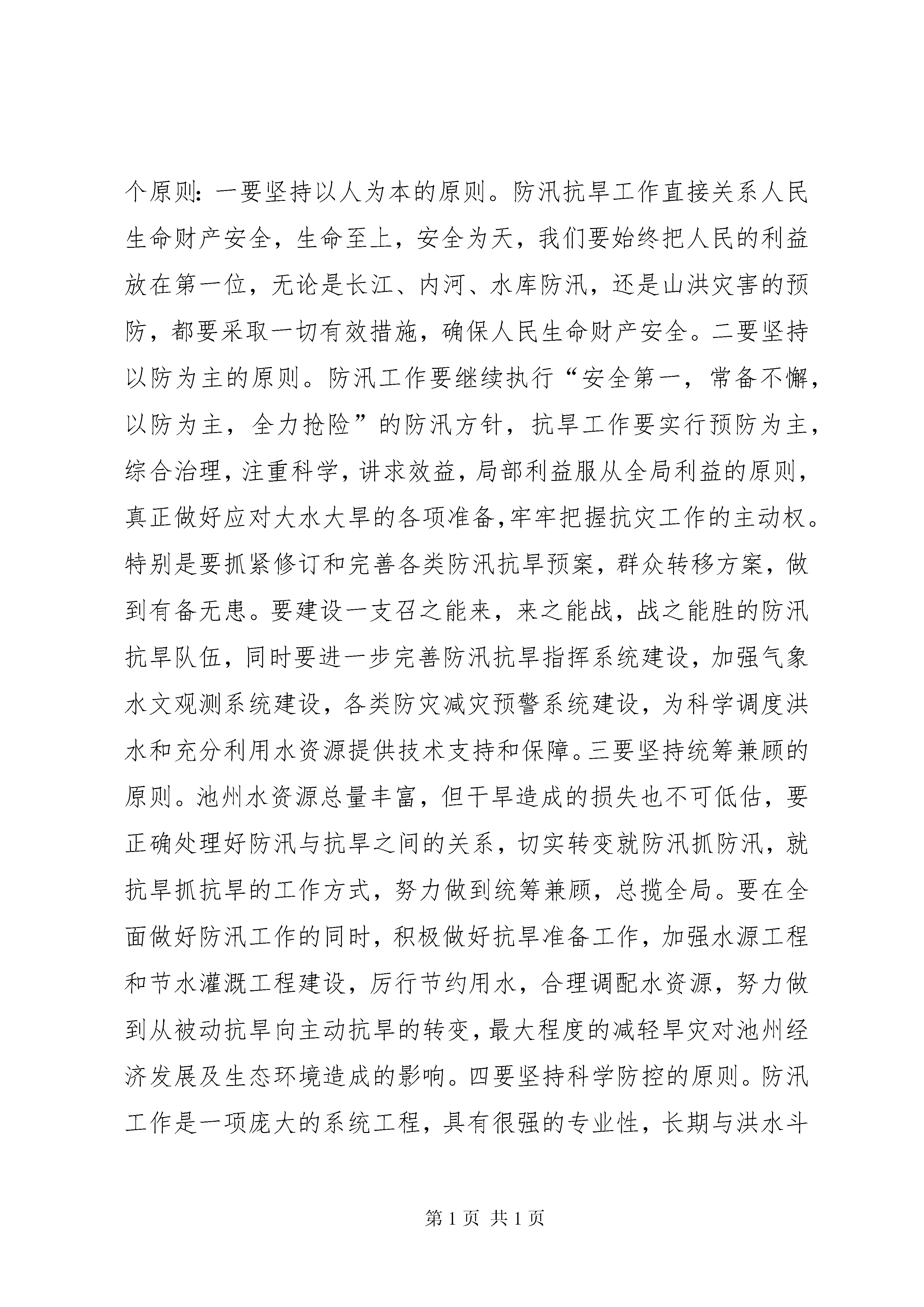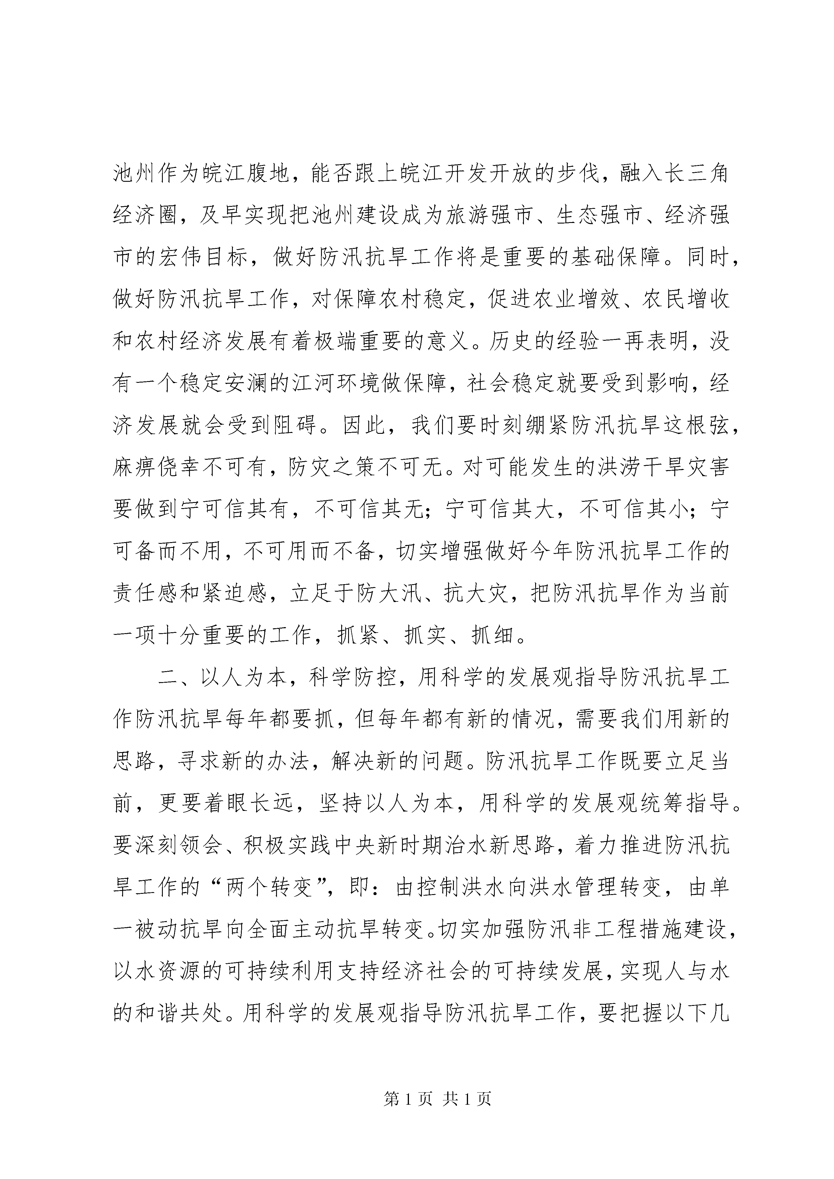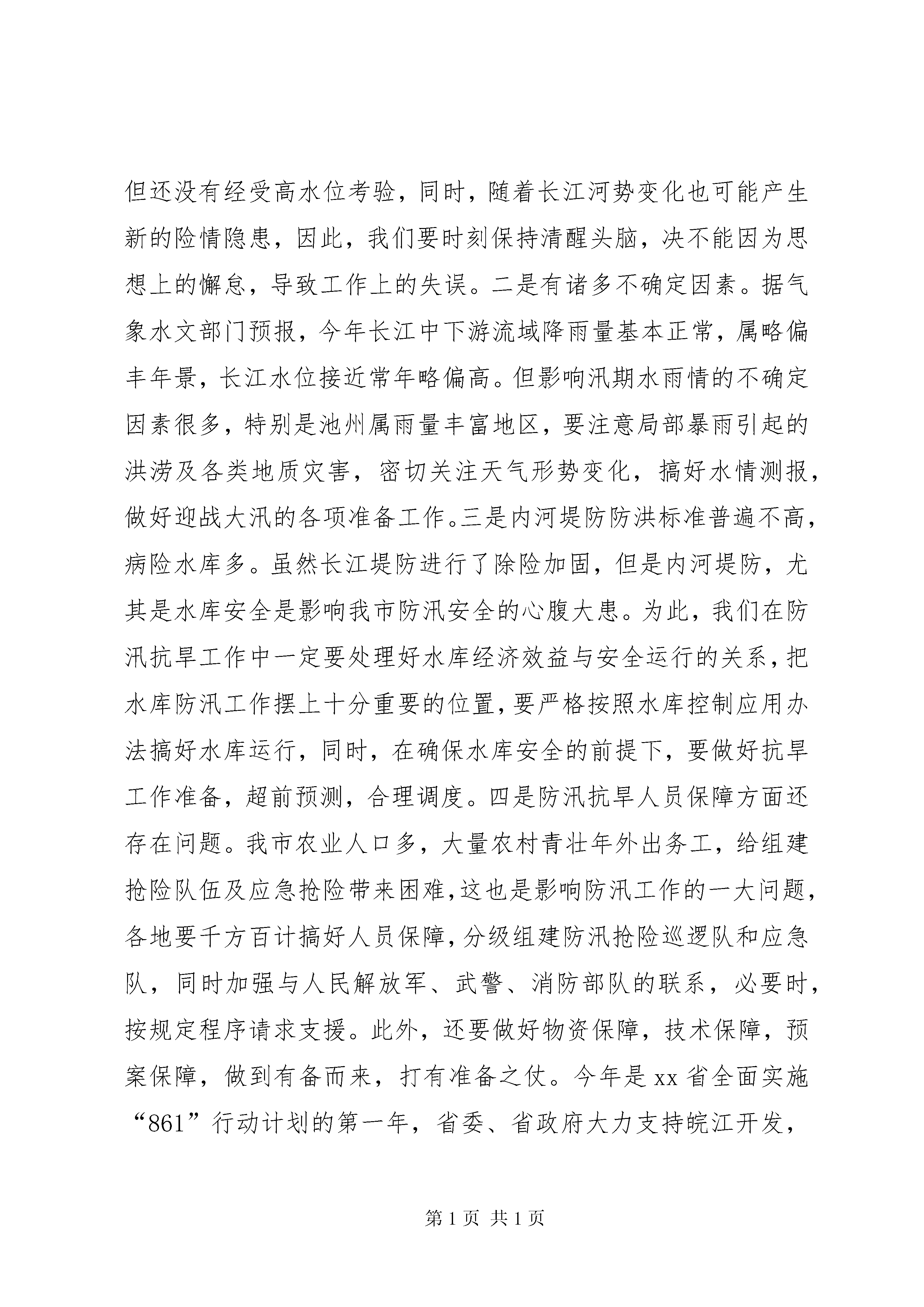 副市长在全市防汛抗旱工作会议上的讲话5月1日起,我市已进入汛期,防汛抗洪工作已进入实战阶段。经市政府研究决定,今天市政府决定召开全市防汛抗旱工作会议,其主要目的是,认真贯彻落实全省防汛抗旱工作会议精神,分析今年我市防汛抗旱工作形势,部署我市防汛抗旱工作。刚才,xx同志代表市防汛抗旱指挥部对今年我市防汛抗旱工作进行了具体部署,我都赞同。下面,我再强调三点意见:一、统一思想,认清形势,切实銮孔龊梅姥纯购倒ぷ鞯脑鹑我馐。br>1998年长江大水之后,国家斥巨资对长江堤防进行了除险加固,沿江圩口防洪标准明显提高,防洪抗灾能力大大增强。沿江泵站经过新建、改建和技术改造,排涝标准也有了很大提高。各类防汛抗旱预案在防汛抗旱实践中得到补充完善。各级防汛抗旱指挥机构的决策指挥水平得到了较大提高。全市广大干群关心防汛抗旱,参与防汛抗旱,形成了良好的社会氛围。因此,做好今年的防汛抗旱工作有很多有利条件。但同时我们也应清醒地看到我市防洪工程体系总体抗灾能力还不强,防汛抗旱非工程措施还不够完善,防汛抗旱准备工作也还存在一些薄弱环节,因此,防汛抗旱的形势仍然不容乐观。具体有四个方面的表现:一是有盲目乐观的情绪。有些人认为,池州江堤加固建设已经竣工并顺利通过竣工验收,长江堤防已经固若金汤,可以高枕无忧了,从而产生了盲目乐观的情绪。我们应当看到,长江堤防虽经加固,但还没有经受高水位考验,同时,随着长江河势变化也可能产生新的险情隐患,因此,我们要时刻保持清醒头脑,决不能因为思想上的懈怠,导致工作上的失误。二是有诸多不确定因素。据气象水文部门预报,今年长江中下游流域降雨量基本正常,属略偏丰年景,长江水位接近常年略偏高。但影响汛期水雨情的不确定因素很多,特别是池州属雨量丰富地区,要注意局部暴雨引起的洪涝及各类地质灾害,密切关注天气形势变化,搞好水情测报,做好迎战大汛的各项准备工作。三是内河堤防防洪标准普遍不高,病险水库多。虽然长江堤防进行了除险加固,但是内河堤防,尤其是水库安全是影响我市防汛安全的心腹大患。为此,我们在防汛抗旱工作中一定要处理好水库经济效益与安全运行的关系,把水库防汛工作摆上十分重要的位置,要严格按照水库控制应用办法搞好水库运行,同时,在确保水库安全的前提下,要做好抗旱工作准备,超前预测,合理调度。四是防汛抗旱人员保障方面还存在问题。我市农业人口多,大量农村青壮年外出务工,给组建抢险队伍及应急抢险带来困难,这也是影响防汛工作的一大问题,各地要千方百计搞好人员保障,分级组建防汛抢险巡逻队和应急队,同时加强与人民解放军、武警、消防部队的联系,必要时,按规定程序请求支援。此外,还要做好物资保障,技术保障,预案保障,做到有备而来,打有准备之仗。今年是xx省全面实施“861”行动计划的第一年,省委、省政府大力支持皖江开发,池州作为皖江腹地,能否跟上皖江开发开放的步伐,融入长三角经济圈,及早实现把池州建设成为旅游强市、生态强市、经济强市的宏伟目标,做好防汛抗旱工作将是重要的基础保障。同时,做好防汛抗旱工作,对保障农村稳定,促进农业增效、农民增收和农村经济发展有着极端重要的意义。历史的经验一再表明,没有一个稳定安澜的江河环境做保障,社会稳定就要受到影响,经济发展就会受到阻碍。因此,我们要时刻绷紧防汛抗旱这根弦,麻痹侥幸不可有,防灾之策不可无。对可能发生的洪涝干旱灾害要做到宁可信其有,不可信其无;宁可信其大,不可信其小;宁可备而不用,不可用而不备,切实增强做好今年防汛抗旱工作的责任感和紧迫感,立足于防大汛、抗大灾,把防汛抗旱作为当前一项十分重要的工作,抓紧、抓实、抓细。二、以人为本,科学防控,用科学的发展观指导防汛抗旱工作防汛抗旱每年都要抓,但每年都有新的情况,需要我们用新的思路,寻求新的办法,解决新的问题。防汛抗旱工作既要立足当前,更要着眼长远,坚持以人为本,用科学的发展观统筹指导。要深刻领会、积极实践中央新时期治水新思路,着力推进防汛抗旱工作的“两个转变”,即:由控制洪水向洪水管理转变,由单一被动抗旱向全面主动抗旱转变。切实加强防汛非工程措施建设,以水资源的可持续利用支持经济社会的可持续发展,实现人与水的和谐共处。用科学的发展观指导防汛抗旱工作,要把握以下几个原则:一要坚持以人为本的原则。防汛抗旱工作直接关系人民生命财产安全,生命至上,安全为天,我们要始终把人民的利益放在第一位,无论是长江、内河、水库防汛,还是山洪灾害的预防,都要采取一切有效措施,确保人民生命财产安全。二要坚持以防为主的原则。防汛工作要继续执行“安全第一,常备不懈,以防为主,全力抢险”的防汛方针,抗旱工作要实行预防为主,综合治理,注重科学,讲求效益,局部利益服从全局利益的原则,真正做好应对大水大旱的各项准备,牢牢把握抗灾工作的主动权。特别是要抓紧修订和完善各类防汛抗旱