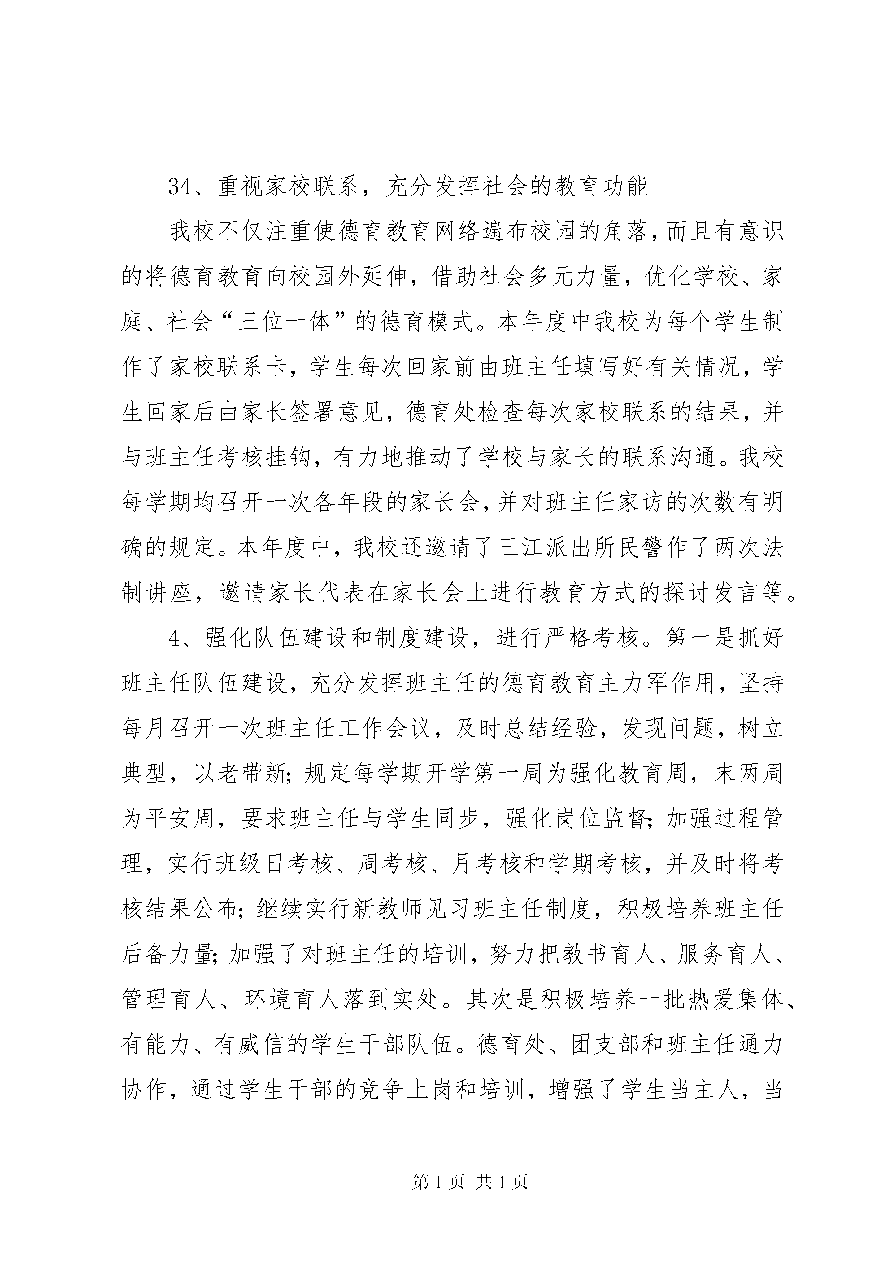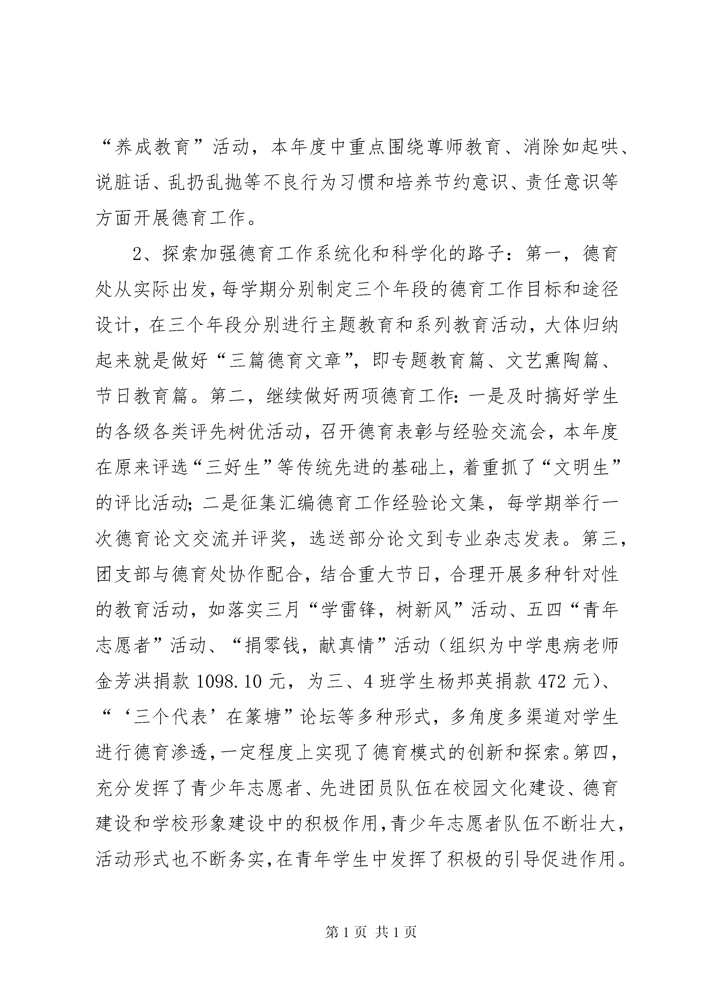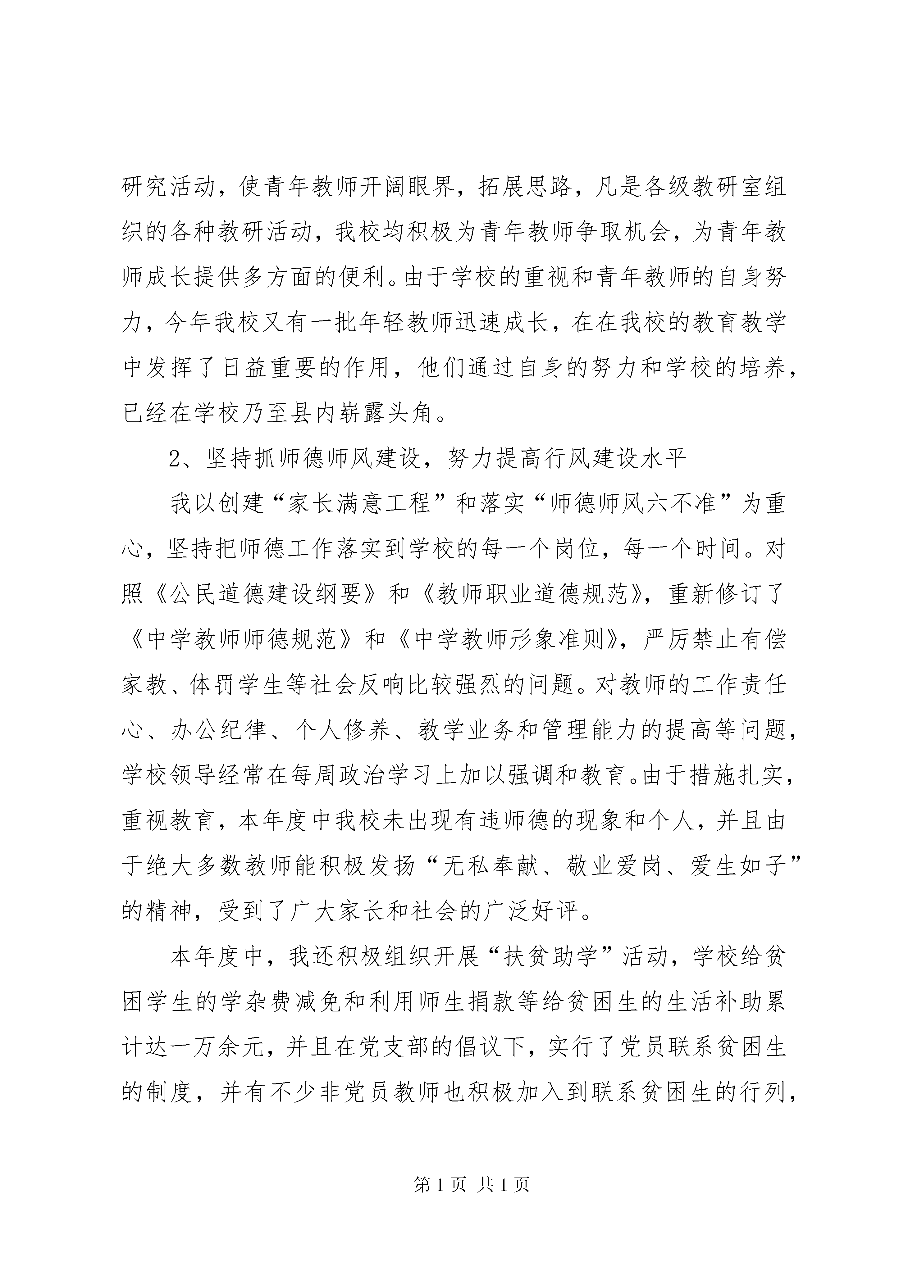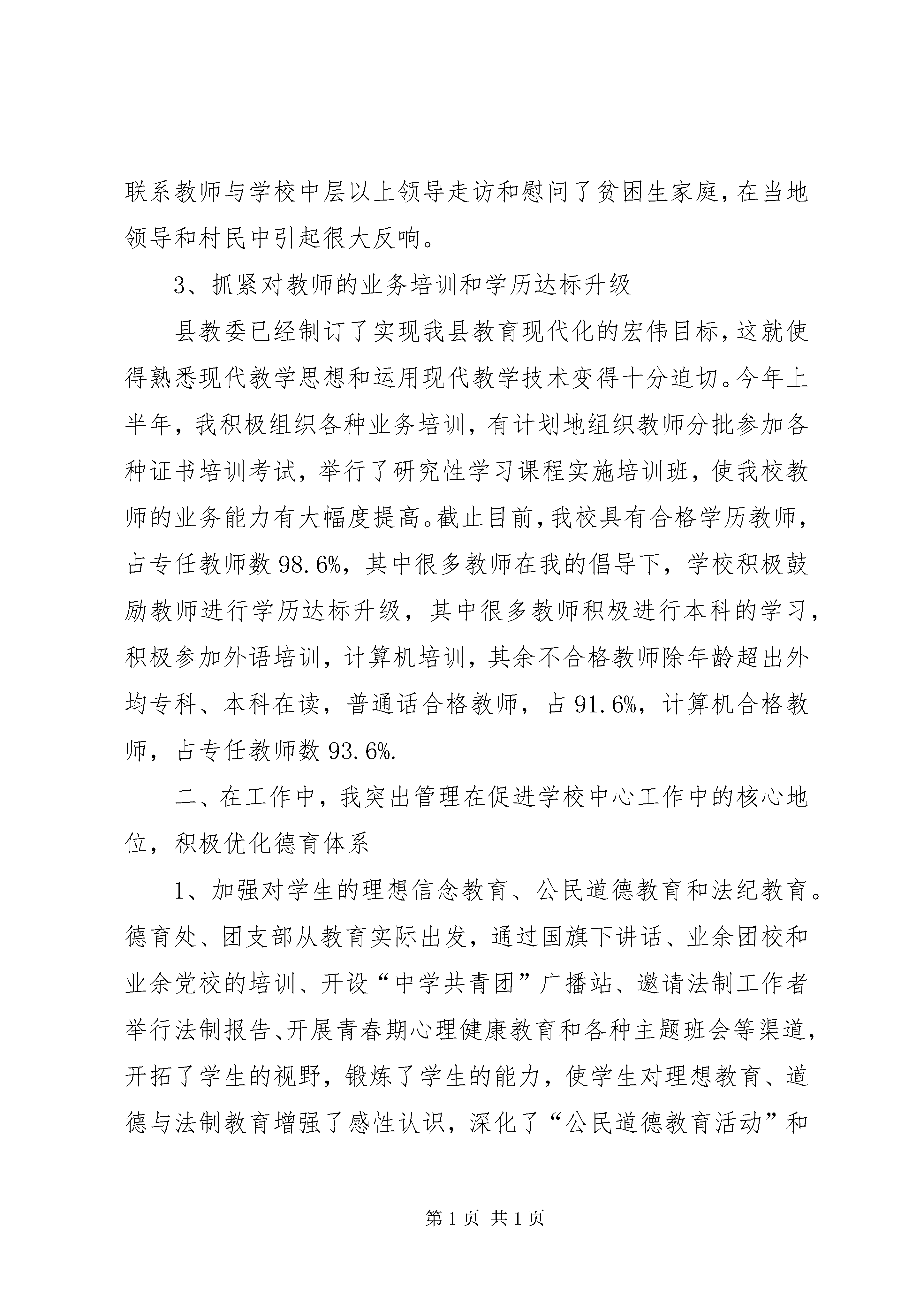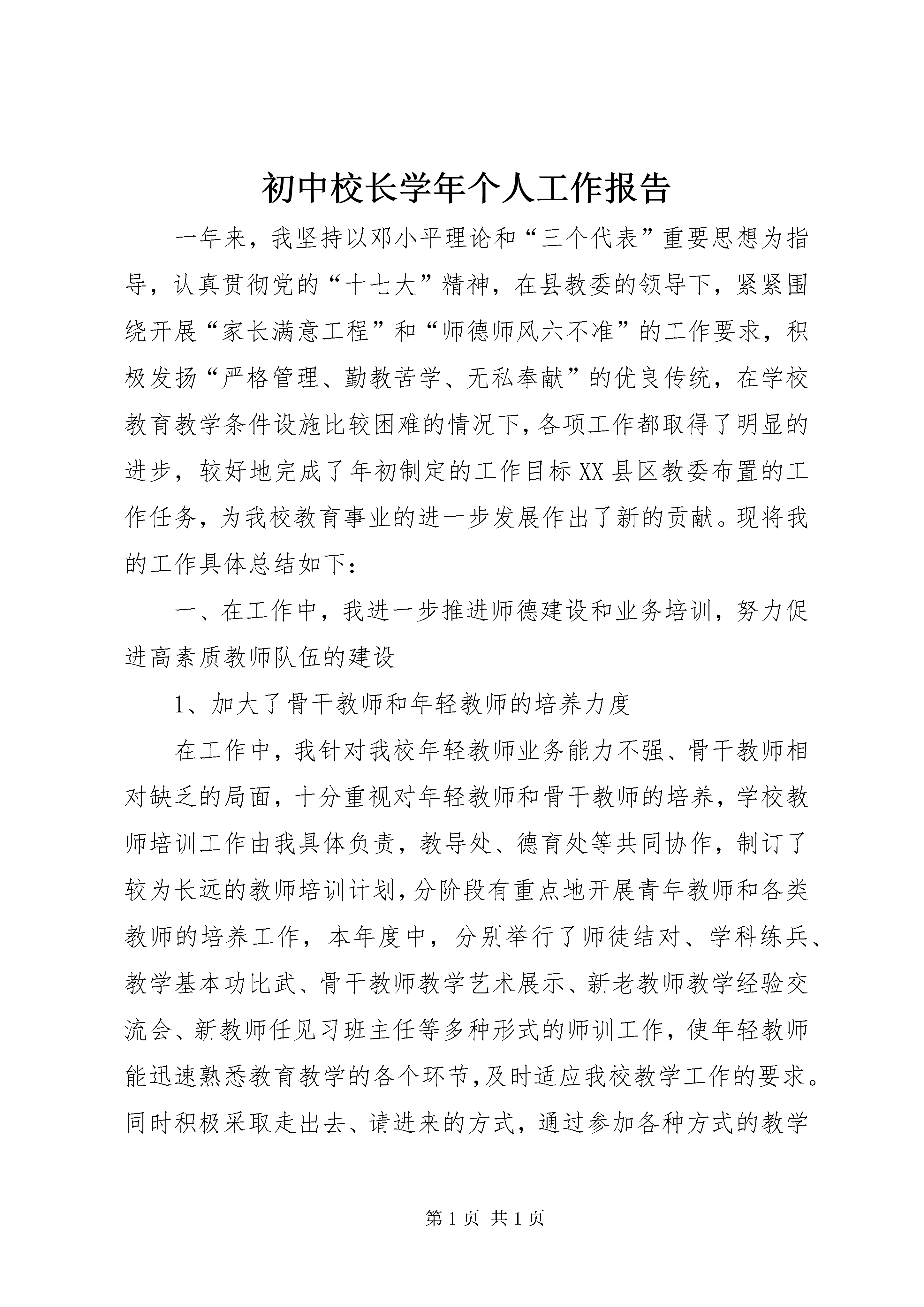 初中校长学年个人工作报告一年来,我坚持以邓小平理论和“三个代表”重要思想为指导,认真贯彻党的“十七大”精神,在县教委的领导下,紧紧围绕开展“家长满意工程”和“师德师风六不准”的工作要求,积极发扬“严格管理、勤教苦学、无私奉献”的优良传统,在学校教育教学条件设施比较困难的情况下,各项工作都取得了明显的进步,较好地完成了年初制定的工作目标XX县区教委布置的工作任务,为我校教育事业的进一步发展作出了新的贡献。现将我的工作具体总结如下:一、在工作中,我进一步推进师德建设和业务培训,努力促进高素质教师队伍的建设1、加大了骨干教师和年轻教师的培养力度在工作中,我针对我校年轻教师业务能力不强、骨干教师相对缺乏的局面,十分重视对年轻教师和骨干教师的培养,学校教师培训工作由我具体负责,教导处、德育处等共同协作,制订了较为长远的教师培训计划,分阶段有重点地开展青年教师和各类教师的培养工作,本年度中,分别举行了师徒结对、学科练兵、教学基本功比武、骨干教师教学艺术展示、新老教师教学经验交流会、新教师任见习班主任等多种形式的师训工作,使年轻教师能迅速熟悉教育教学的各个环节,及时适应我校教学工作的要求。同时积极采取走出去、请进来的方式,通过参加各种方式的教学研究活动,使青年教师开阔眼界,拓展思路,凡是各级教研室组织的各种教研活动,我校均积极为青年教师争取机会,为青年教师成长提供多方面的便利。由于学校的重视和青年教师的自身努力,今年我校又有一批年轻教师迅速成长,在在我校的教育教学中发挥了日益重要的作用,他们通过自身的努力和学校的培养,已经在学校乃至县内崭露头角。2、坚持抓师德师风建设,努力提高行风建设水平我以创建“家长满意工程”和落实“师德师风六不准”为重心,坚持把师德工作落实到学校的每一个岗位,每一个时间。对照《公民道德建设纲要》和《教师职业道德规范》,重新修订了《中学教师师德规范》和《中学教师形象准则》,严厉禁止有偿家教、体罚学生等社会反响比较强烈的问题。对教师的工作责任心、办公纪律、个人修养、教学业务和管理能力的提高等问题,学校领导经常在每周政治学习上加以强调和教育。由于措施扎实,重视教育,本年度中我校未出现有违师德的现象和个人,并且由于绝大多数教师能积极发扬“无私奉献、敬业爱岗、爱生如子”的精神,受到了广大家长和社会的广泛好评。本年度中,我还积极组织开展“扶贫助学”活动,学校给贫困学生的学杂费减免和利用师生捐款等给贫困生的生活补助累计达一万余元,并且在党支部的倡议下,实行了党员联系贫困生的制度,并有不少非党员教师也积极加入到联系贫困生的行列,联系教师与学校中层以上领导走访和慰问了贫困生家庭,在当地领导和村民中引起很大反响。3、抓紧对教师的业务培训和学历达标升级县教委已经制订了实现我县教育现代化的宏伟目标,这就使得熟悉现代教学思想和运用现代教学技术变得十分迫切。今年上半年,我积极组织各种业务培训,有计划地组织教师分批参加各种证书培训考试,举行了研究性学习课程实施培训班,使我校教师的业务能力有大幅度提高。截止目前,我校具有合格学历教师,占专任教师数98.6%,其中很多教师在我的倡导下,学校积极鼓励教师进行学历达标升级,其中很多教师积极进行本科的学习,积极参加外语培训,计算机培训,其余不合格教师除年龄超出外均专科、本科在读,普通话合格教师,占91.6%,计算机合格教师,占专任教师数93.6%.二、在工作中,我突出管理在促进学校中心工作中的核心地位,积极优化德育体系1、加强对学生的理想信念教育、公民道德教育和法纪教育。德育处、团支部从教育实际出发,通过国旗下讲话、业余团校和业余党校的培训、开设“中学共青团”广播站、邀请法制工作者举行法制报告、开展青春期心理健康教育和各种主题班会等渠道,开拓了学生的视野,锻炼了学生的能力,使学生对理想教育、道德与法制教育增强了感性认识,深化了“公民道德教育活动”和“养成教育”活动,本年度中重点围绕尊师教育、消除如起哄、说脏话、乱扔乱抛等不良行为习惯和培养节约意识、责任意识等方面开展德育工作。2、探索加强德育工作系统化和科学化的路子:第一,德育处从实际出发,每学期分别制定三个年段的德育工作目标和途径设计,在三个年段分别进行主题教育和系列教育活动,大体归纳起来就是做好“三篇德育文章”,即专题教育篇、文艺熏陶篇、节日教育篇。第二,继续做好两项德育工作:一是及时搞好学生的各级各类评先树优活动,召开德育表彰与经验交流会,本年度在原来评选“三好生”等传统先进的基础上,着重抓了“文明生”的评比活动;二是征集汇编德育工作经验论文集,每学期举行一次德育论文交流并评奖,选送部分论文到专业杂志发表。第三,团支部与德育处协作配合,结合重大节日,合理开展多种针对性的教育活动,如落实三月“学雷锋,树新风”活动、五四“青年志愿者