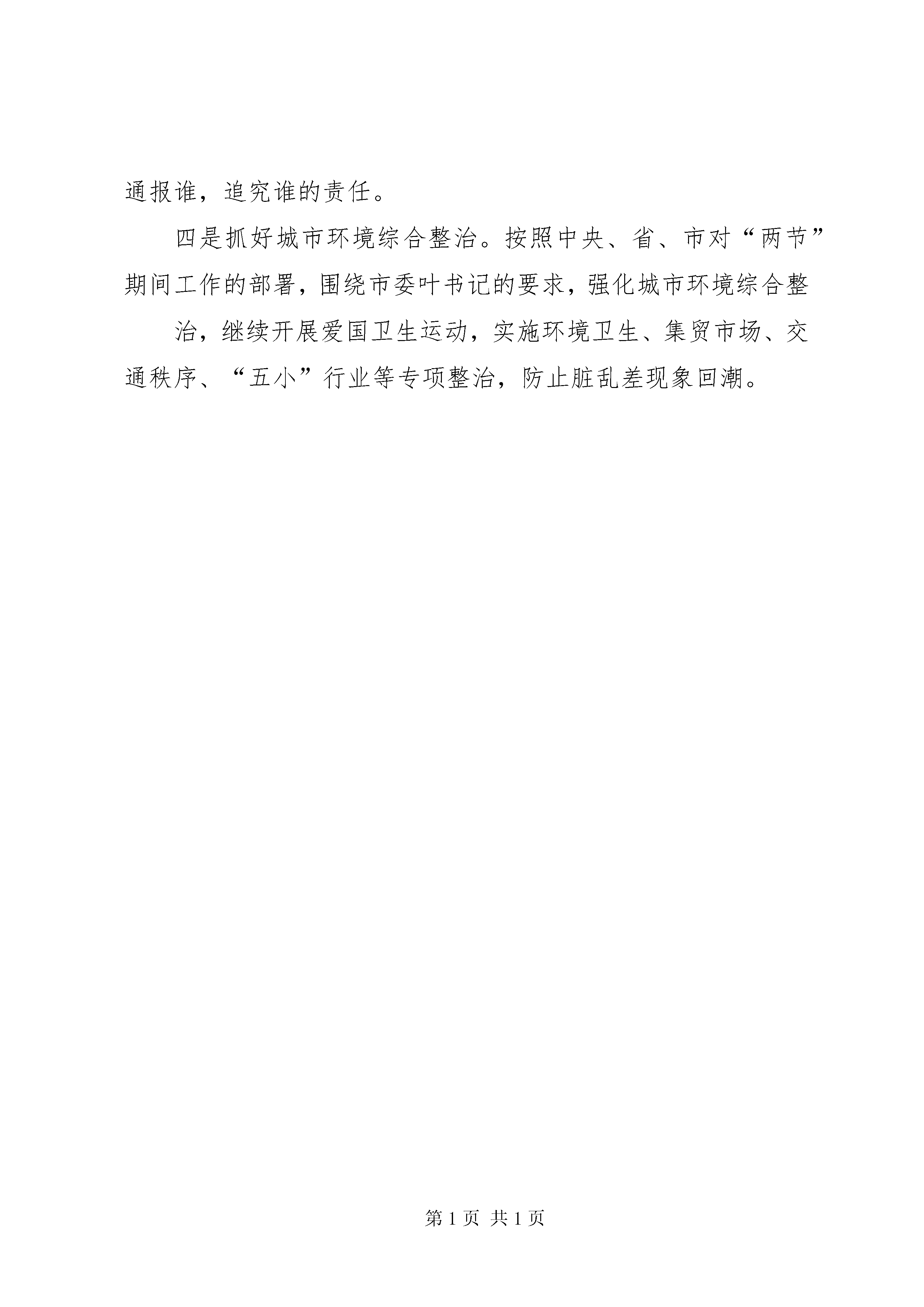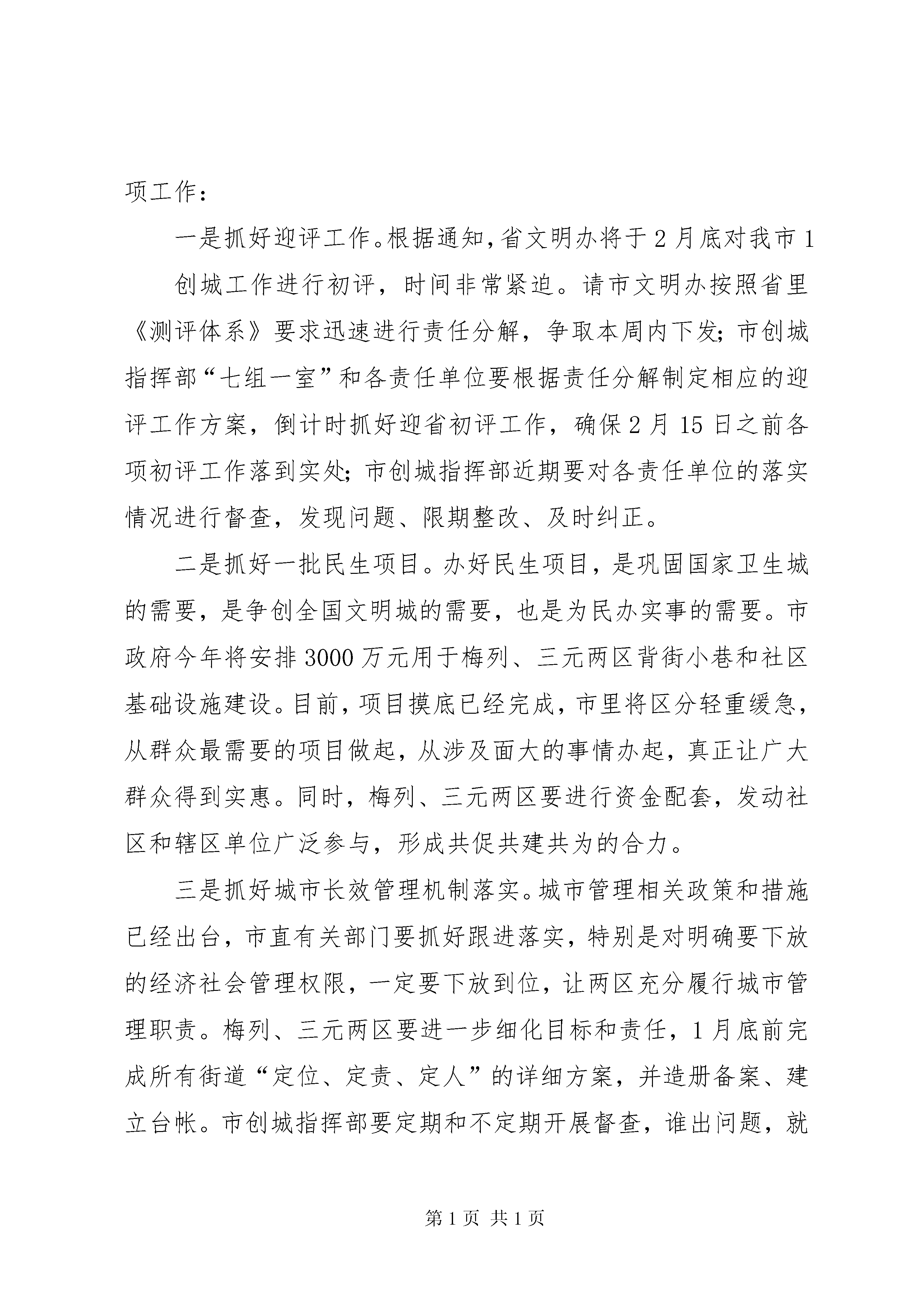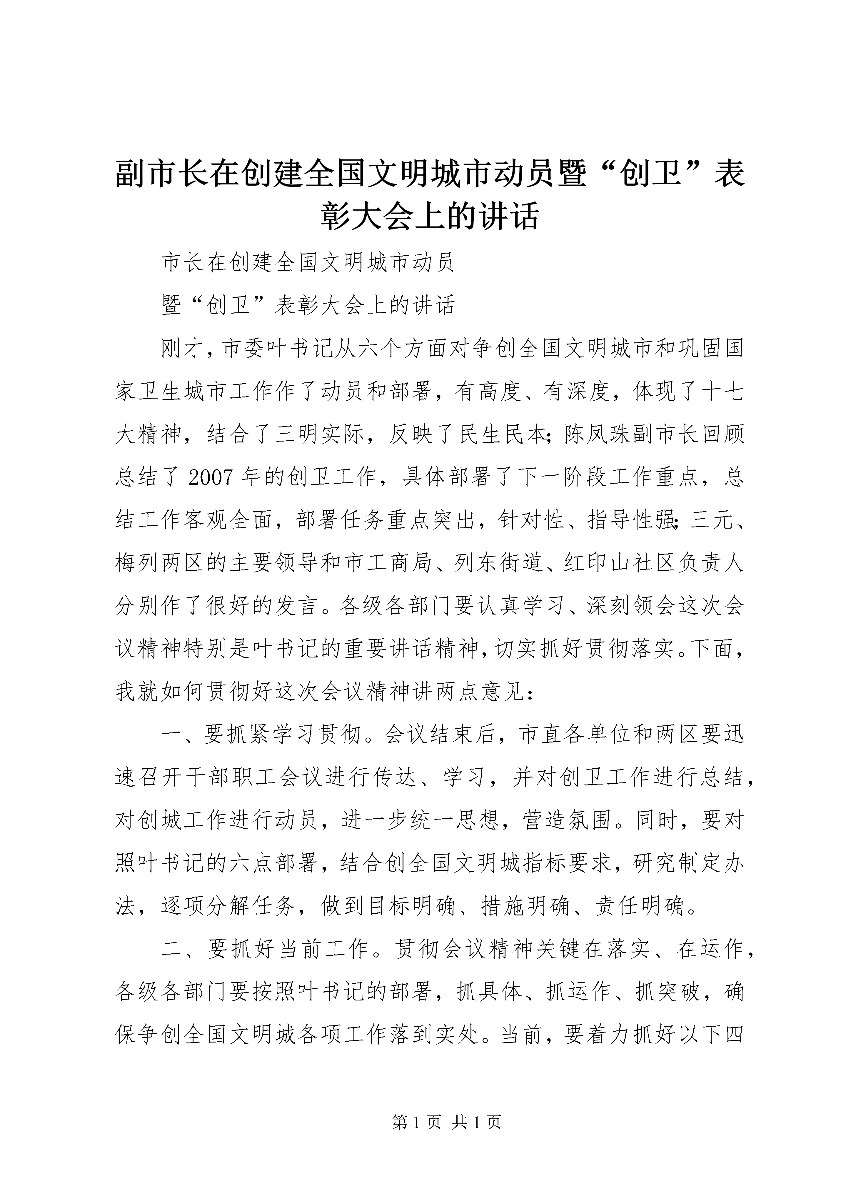 副市长在创建全国文明城市动员暨“创卫”表彰大会上的讲话市长在创建全国文明城市动员暨“创卫”表彰大会上的讲话刚才,市委叶书记从六个方面对争创全国文明城市和巩固国家卫生城市工作作了动员和部署,有高度、有深度,体现了十七大精神,结合了三明实际,反映了民生民本;陈凤珠副市长回顾总结了2007年的创卫工作,具体部署了下一阶段工作重点,总结工作客观全面,部署任务重点突出,针对性、指导性强;三元、梅列两区的主要领导和市工商局、列东街道、红印山社区负责人分别作了很好的发言。各级各部门要认真学习、深刻领会这次会议精神特别是叶书记的重要讲话精神,切实抓好贯彻落实。下面,我就如何贯彻好这次会议精神讲两点意见:一、要抓紧学习贯彻。会议结束后,市直各单位和两区要迅速召开干部职工会议进行传达、学习,并对创卫工作进行总结,对创城工作进行动员,进一步统一思想,营造氛围。同时,要对照叶书记的六点部署,结合创全国文明城指标要求,研究制定办法,逐项分解任务,做到目标明确、措施明确、责任明确。二、要抓好当前工作。贯彻会议精神关键在落实、在运作,各级各部门要按照叶书记的部署,抓具体、抓运作、抓突破,确保争创全国文明城各项工作落到实处。当前,要着力抓好以下四项工作:一是抓好迎评工作。根据通知,省文明办将于2月底对我市1创城工作进行初评,时间非常紧迫。请市文明办按照省里《测评体系》要求迅速进行责任分解,争取本周内下发;市创城指挥部“七组一室”和各责任单位要根据责任分解制定相应的迎评工作方案,倒计时抓好迎省初评工作,确保2月15日之前各项初评工作落到实处;市创城指挥部近期要对各责任单位的落实情况进行督查,发现问题、限期整改、及时纠正。二是抓好一批民生项目。办好民生项目,是巩固国家卫生城的需要,是争创全国文明城的需要,也是为民办实事的需要。市政府今年将安排3000万元用于梅列、三元两区背街小巷和社区基础设施建设。目前,项目摸底已经完成,市里将区分轻重缓急,从群众最需要的项目做起,从涉及面大的事情办起,真正让广大群众得到实惠。同时,梅列、三元两区要进行资金配套,发动社区和辖区单位广泛参与,形成共促共建共为的合力。三是抓好城市长效管理机制落实。城市管理相关政策和措施已经出台,市直有关部门要抓好跟进落实,特别是对明确要下放的经济社会管理权限,一定要下放到位,让两区充分履行城市管理职责。梅列、三元两区要进一步细化目标和责任,1月底前完成所有街道“定位、定责、定人”的详细方案,并造册备案、建立台帐。市创城指挥部要定期和不定期开展督查,谁出问题,就通报谁,追究谁的责任。四是抓好城市环境综合整治。按照中央、省、市对“两节”期间工作的部署,围绕市委叶书记的要求,强化城市环境综合整治,继续开展爱国卫生运动,实施环境卫生、集贸市场、交通秩序、“五小”行业等专项整治,防止脏乱差现象回潮。