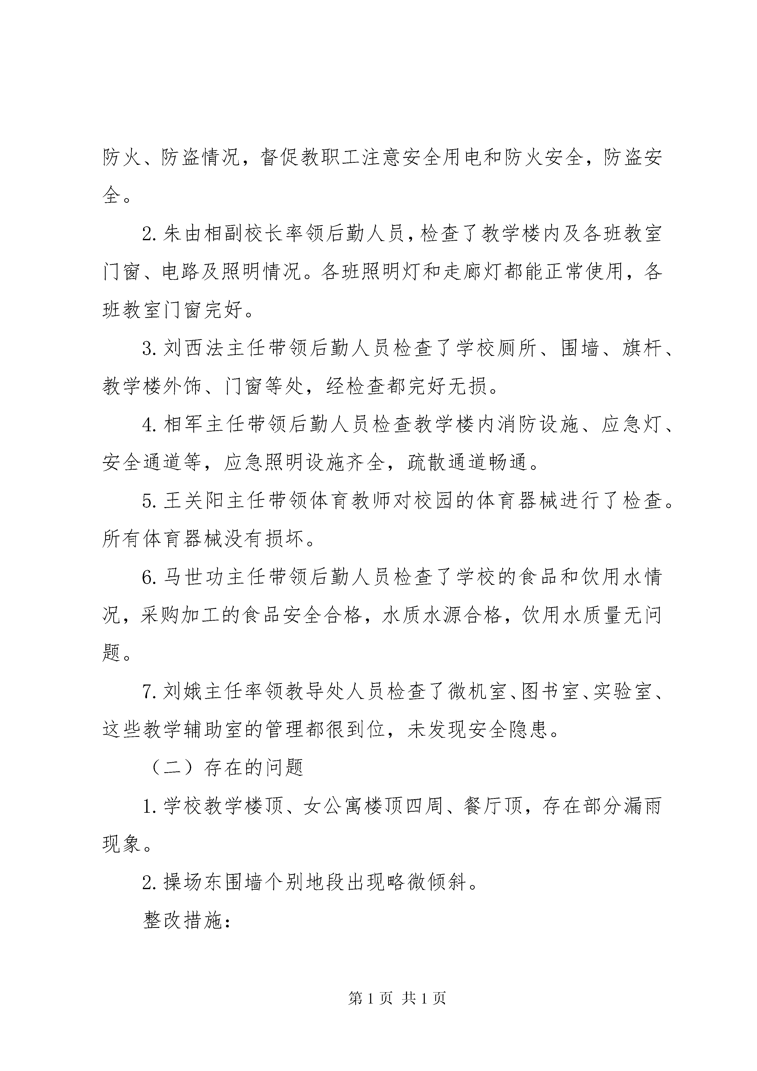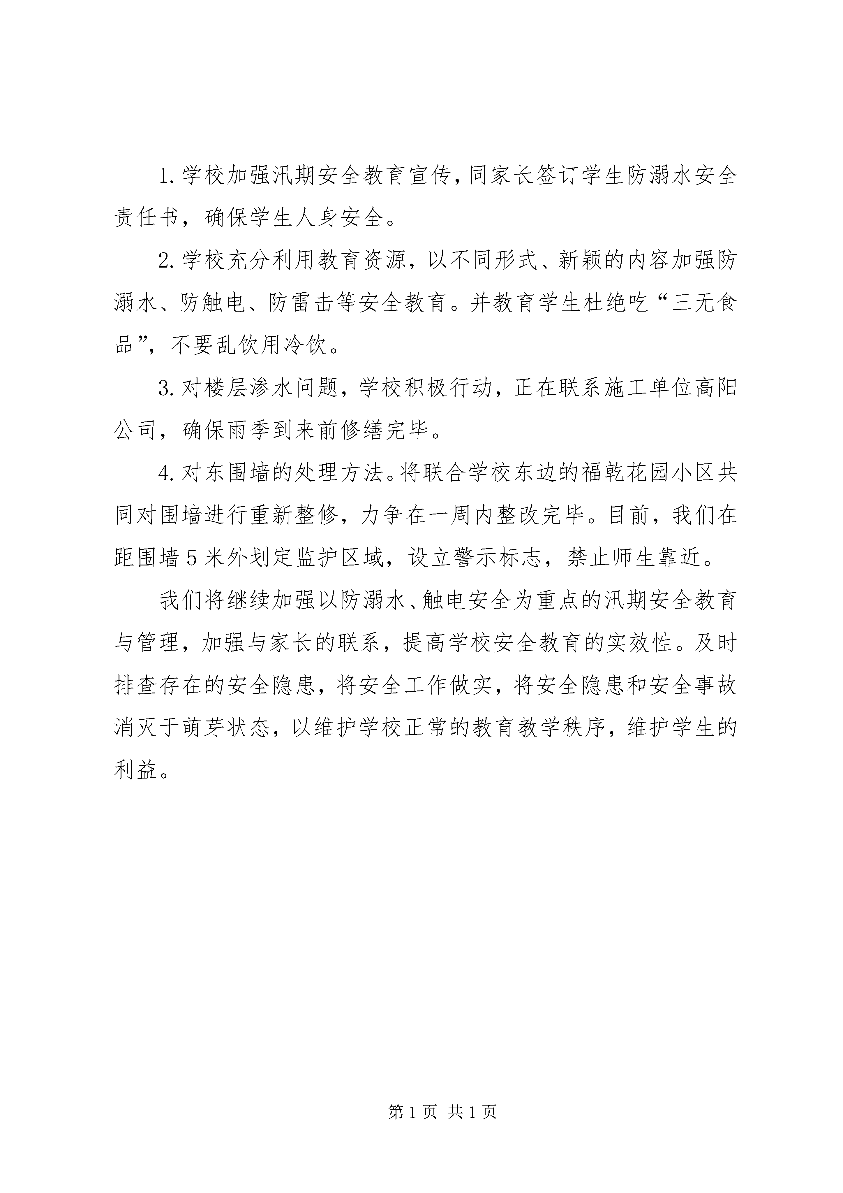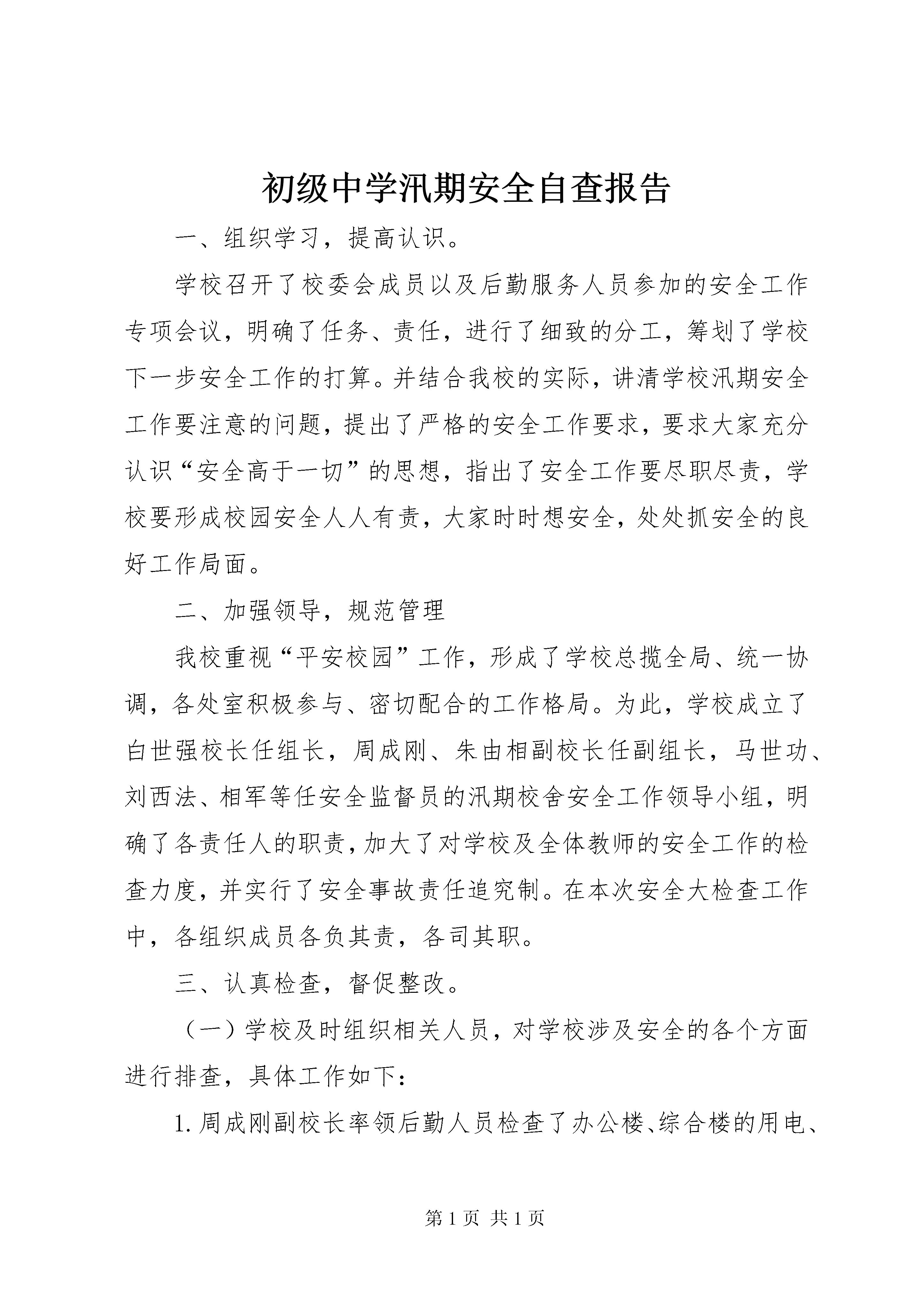 初级中学汛期安全自查报告一、组织学习,提高认识。学校召开了校委会成员以及后勤服务人员参加的安全工作专项会议,明确了任务、责任,进行了细致的分工,筹划了学校下一步安全工作的打算。并结合我校的实际,讲清学校汛期安全工作要注意的问题,提出了严格的安全工作要求,要求大家充分认识“安全高于一切”的思想,指出了安全工作要尽职尽责,学校要形成校园安全人人有责,大家时时想安全,处处抓安全的良好工作局面。二、加强领导,规范管理我校重视“平安校园”工作,形成了学校总揽全局、统一协调,各处室积极参与、密切配合的工作格局。为此,学校成立了白世强校长任组长,周成刚、朱由相副校长任副组长,马世功、刘西法、相军等任安全监督员的汛期校舍安全工作领导小组,明确了各责任人的职责,加大了对学校及全体教师的安全工作的检查力度,并实行了安全事故责任追究制。在本次安全大检查工作中,各组织成员各负其责,各司其职。三、认真检查,督促整改。(一)学校及时组织相关人员,对学校涉及安全的各个方面进行排查,具体工作如下:1.周成刚副校长率领后勤人员检查了办公楼、综合楼的用电、防火、防盗情况,督促教职工注意安全用电和防火安全,防盗安全。2.朱由相副校长率领后勤人员,检查了教学楼内及各班教室门窗、电路及照明情况。各班照明灯和走廊灯都能正常使用,各班教室门窗完好。3.刘西法主任带领后勤人员检查了学校厕所、围墙、旗杆、教学楼外饰、门窗等处,经检查都完好无损。4.相军主任带领后勤人员检查教学楼内消防设施、应急灯、安全通道等,应急照明设施齐全,疏散通道畅通。5.王关阳主任带领体育教师对校园的体育器械进行了检查。所有体育器械没有损坏。6.马世功主任带领后勤人员检查了学校的食品和饮用水情况,采购加工的食品安全合格,水质水源合格,饮用水质量无问题。7.刘娥主任率领教导处人员检查了微机室、图书室、实验室、这些教学辅助室的管理都很到位,未发现安全隐患。(二)存在的问题1.学校教学楼顶、女公寓楼顶四周、餐厅顶,存在部分漏雨现象。2.操场东围墙个别地段出现略微倾斜。整改措施:1.学校加强汛期安全教育宣传,同家长签订学生防溺水安全责任书,确保学生人身安全。2.学校充分利用教育资源,以不同形式、新颖的内容加强防溺水、防触电、防雷击等安全教育。并教育学生杜绝吃“三无食品”,不要乱饮用冷饮。3.对楼层渗水问题,学校积极行动,正在联系施工单位高阳公司,确保雨季到来前修缮完毕。4.对东围墙的处理方法。将联合学校东边的福乾花园小区共同对围墙进行重新整修,力争在一周内整改完毕。目前,我们在距围墙5米外划定监护区域,设立警示标志,禁止师生靠近。我们将继续加强以防溺水、触电安全为重点的汛期安全教育与管理,加强与家长的联系,提高学校安全教育的实效性。及时排查存在的安全隐患,将安全工作做实,将安全隐患和安全事故消灭于萌芽状态,以维护学校正常的教育教学秩序,维护学生的利益。