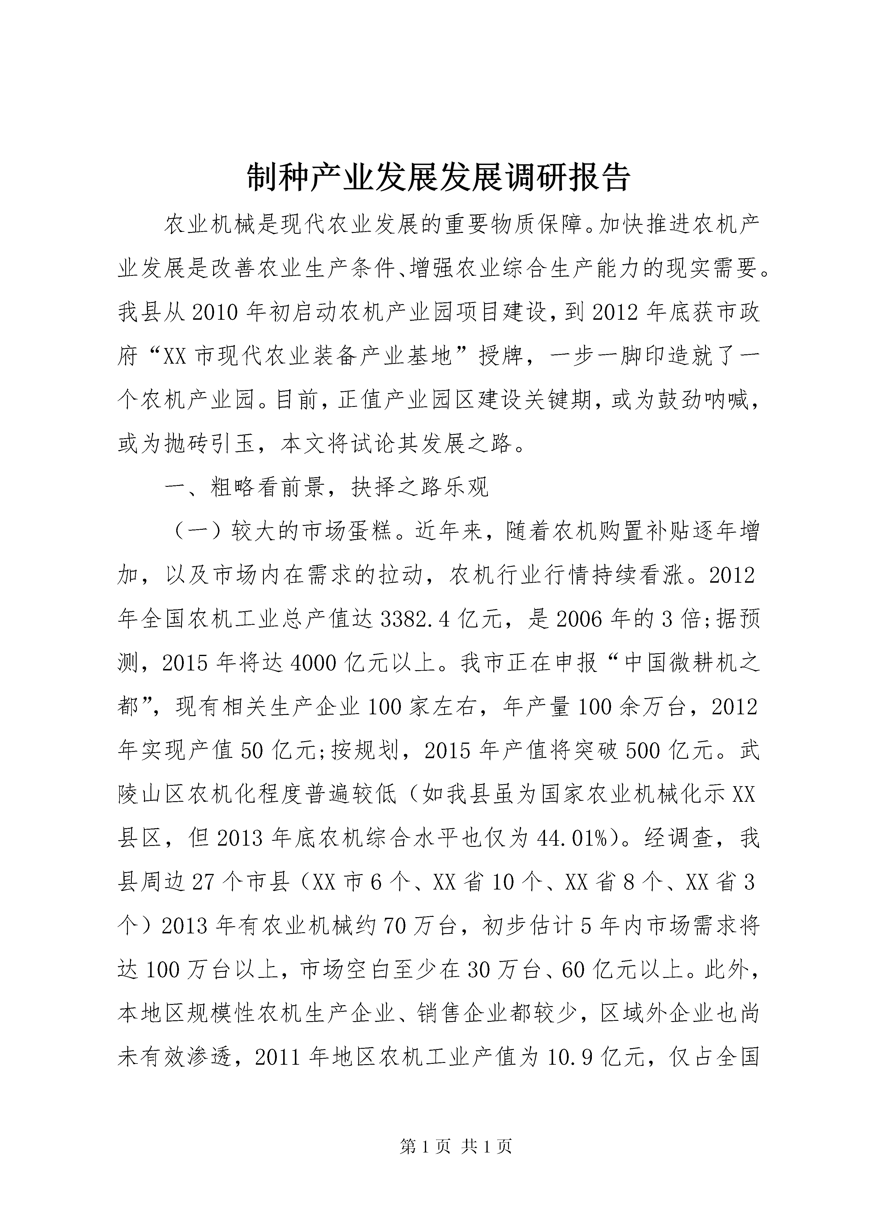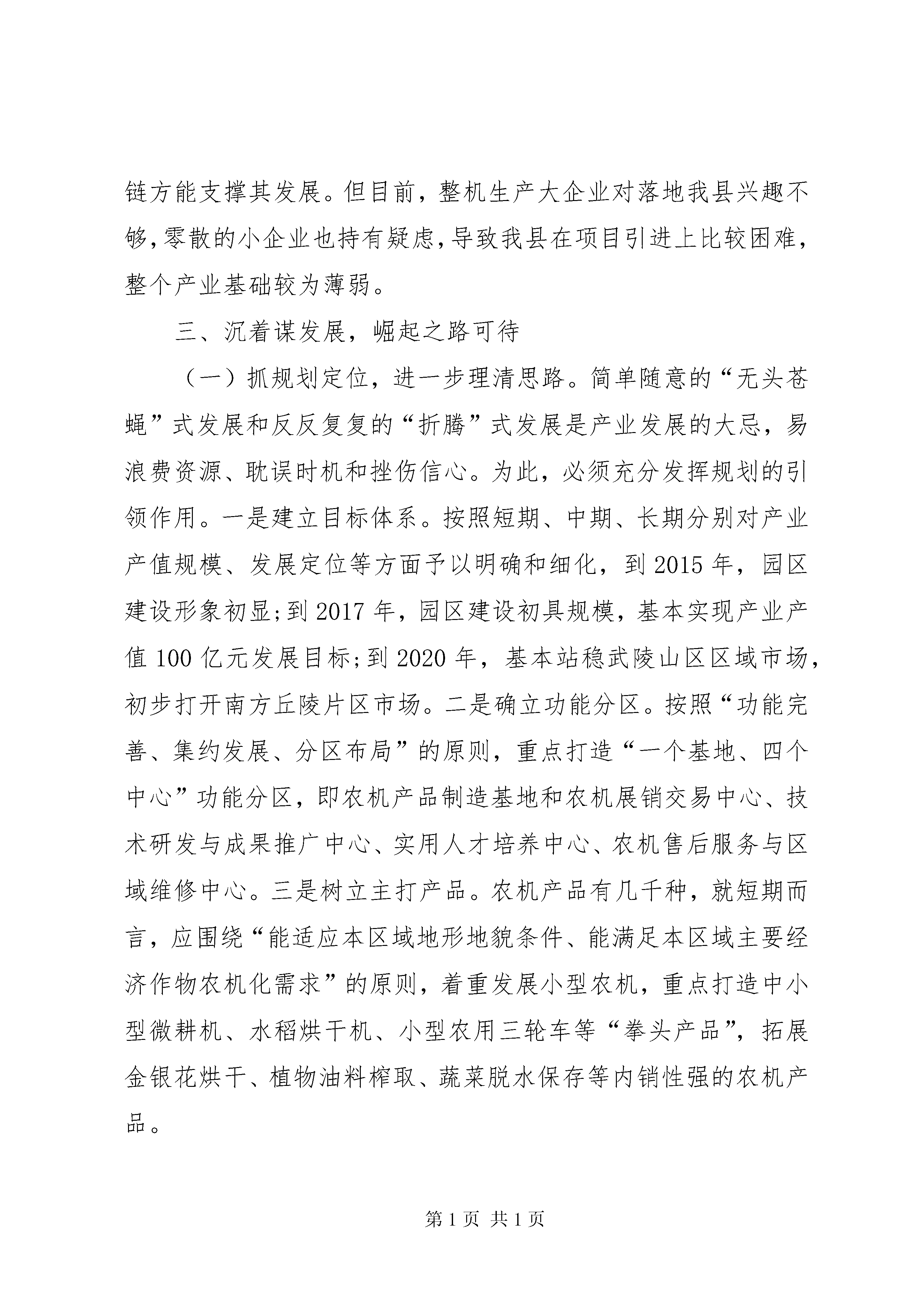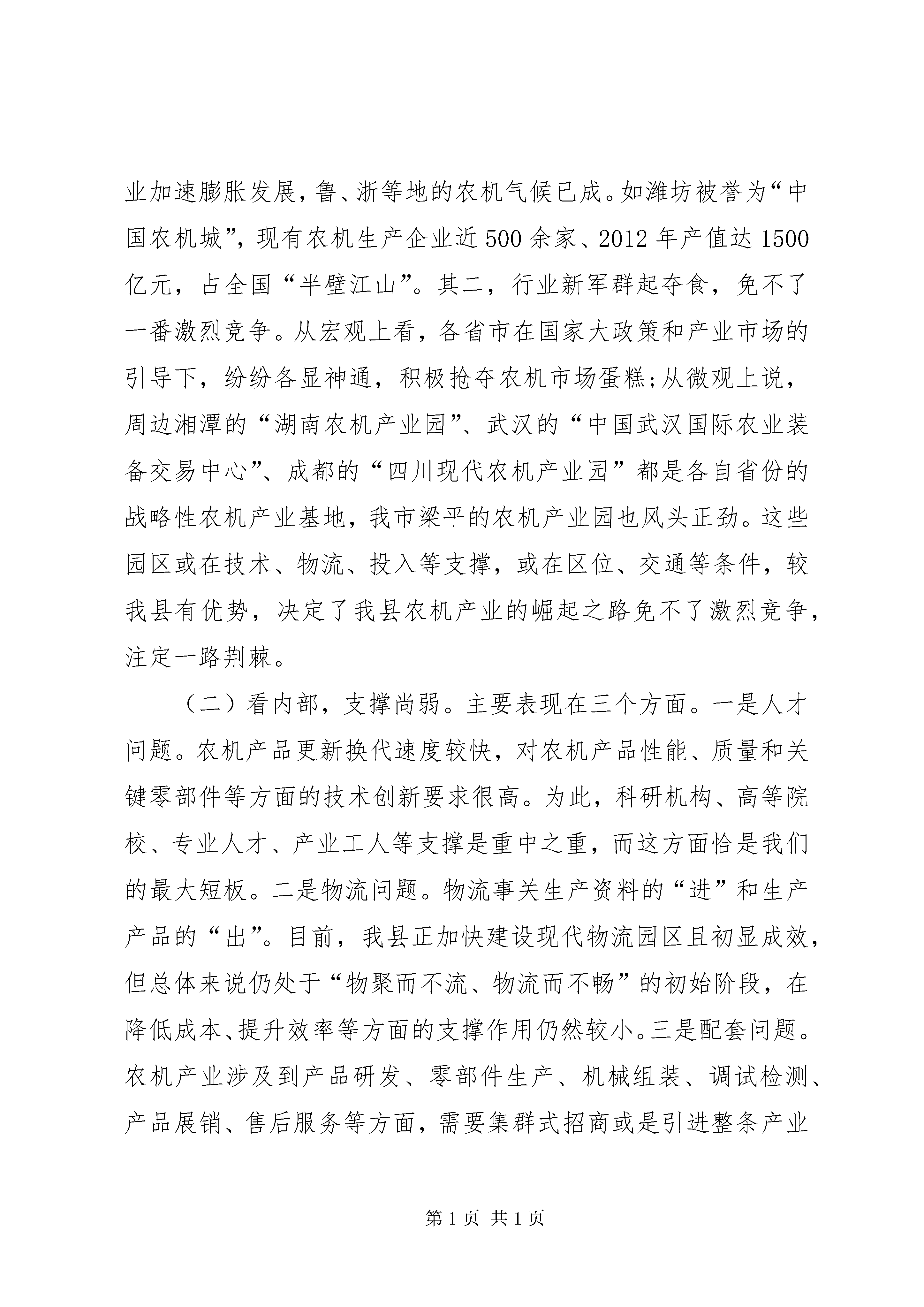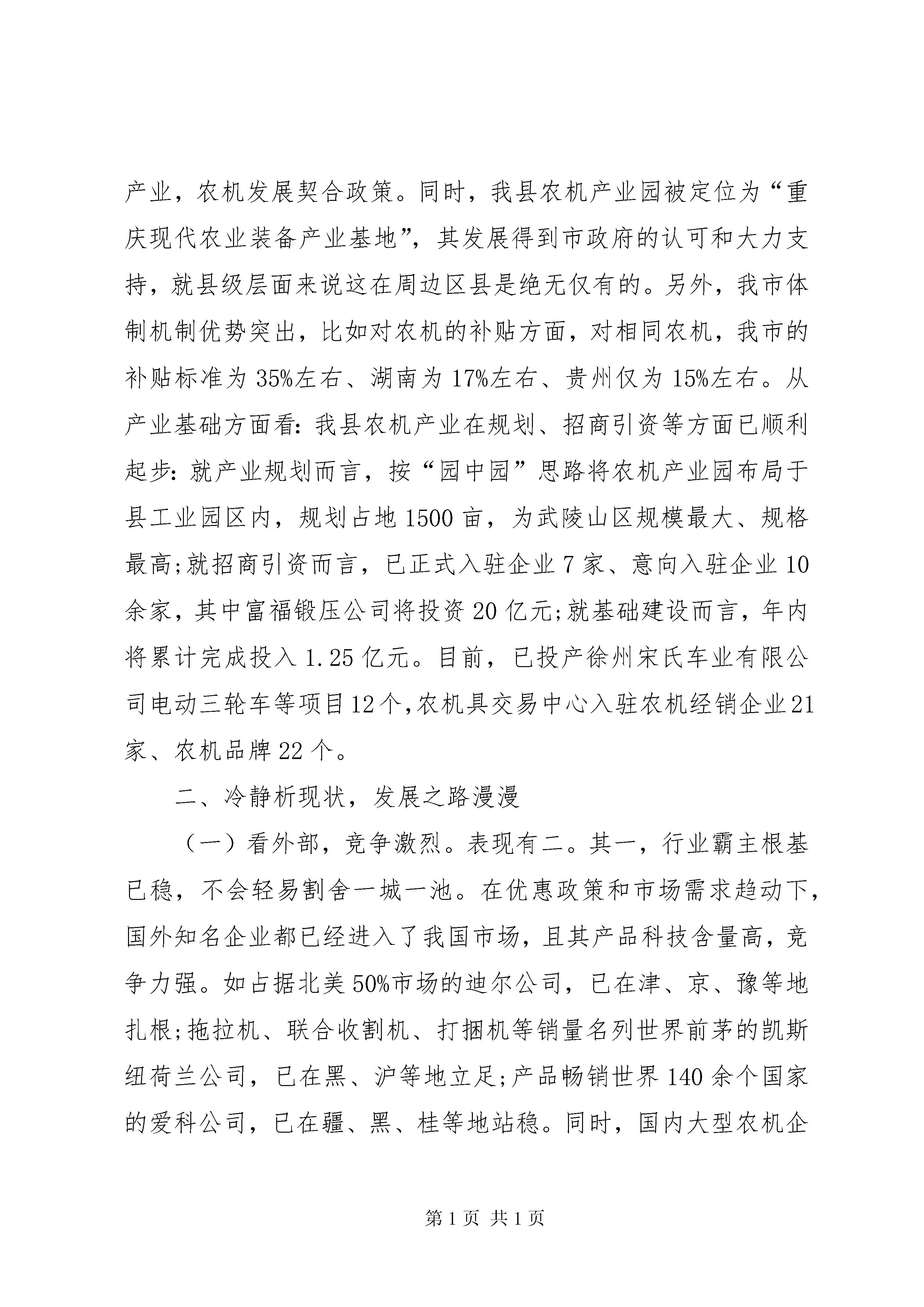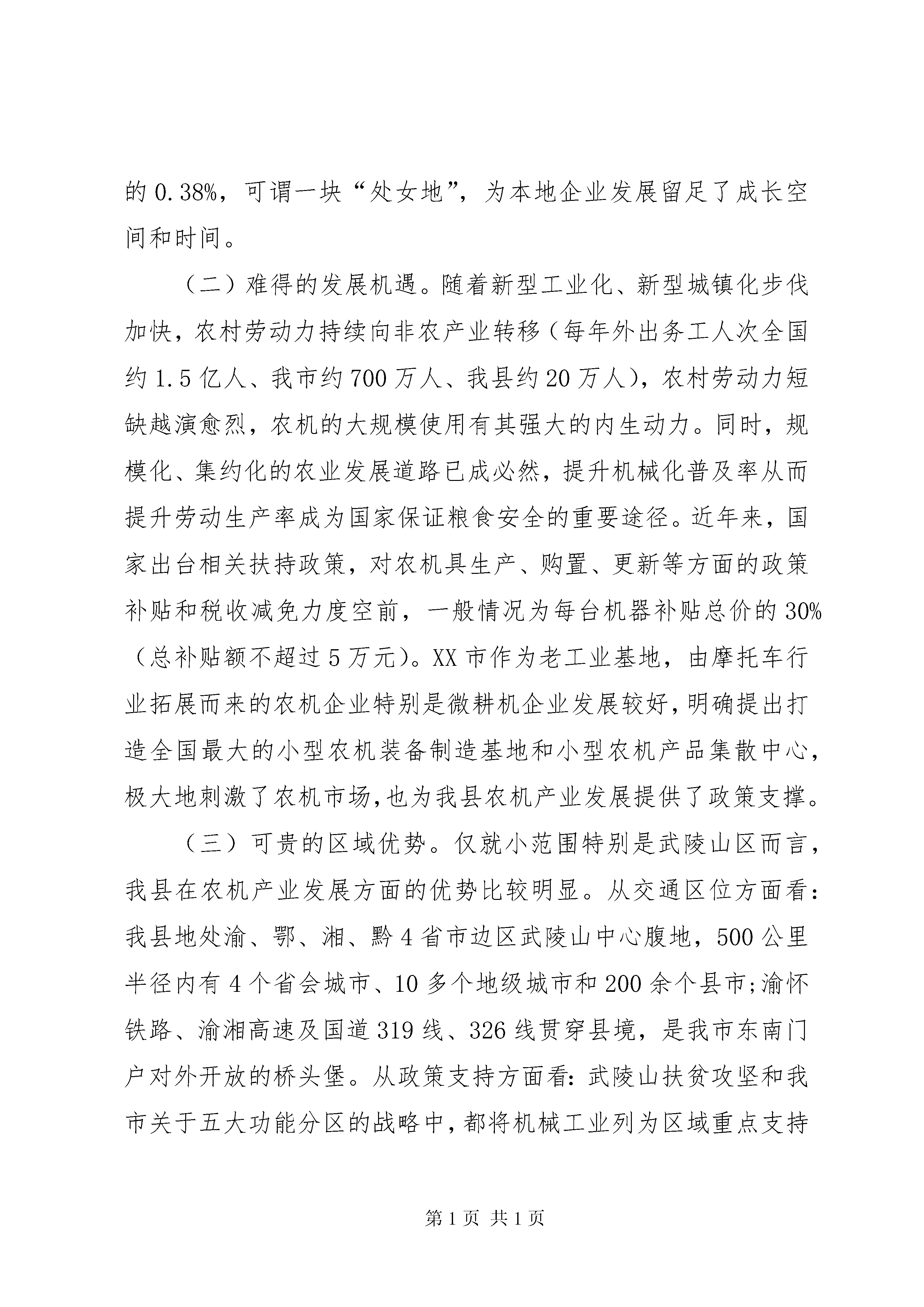 制种产业发展发展调研报告农业机械是现代农业发展的重要物质保障。加快推进农机产业发展是改善农业生产条件、增强农业综合生产能力的现实需要。我县从2010年初启动农机产业园项目建设,到2012年底获市政府“XX市现代农业装备产业基地”授牌,一步一脚印造就了一个农机产业园。目前,正值产业园区建设关键期,或为鼓劲呐喊,或为抛砖引玉,本文将试论其发展之路。一、粗略看前景,抉择之路乐观(一)较大的市场蛋糕。近年来,随着农机购置补贴逐年增加,以及市场内在需求的拉动,农机行业行情持续看涨。2012年全国农机工业总产值达3382.4亿元,是2006年的3倍;据预测,2015年将达4000亿元以上。我市正在申报“中国微耕机之都”,现有相关生产企业100家左右,年产量100余万台,2012年实现产值50亿元;按规划,2015年产值将突破500亿元。武陵山区农机化程度普遍较低(如我县虽为国家农业机械化示XX县区,但2013年底农机综合水平也仅为44.01%)。经调查,我县周边27个市县(XX市6个、XX省10个、XX省8个、XX省3个)2013年有农业机械约70万台,初步估计5年内市场需求将达100万台以上,市场空白至少在30万台、60亿元以上。此外,本地区规模性农机生产企业、销售企业都较少,区域外企业也尚未有效渗透,2011年地区农机工业产值为10.9亿元,仅占全国的0.38%,可谓一块“处女地”,为本地企业发展留足了成长空间和时间。(二)难得的发展机遇。随着新型工业化、新型城镇化步伐加快,农村劳动力持续向非农产业转移(每年外出务工人次全国约1.5亿人、我市约700万人、我县约20万人),农村劳动力短缺越演愈烈,农机的大规模使用有其强大的内生动力。同时,规模化、集约化的农业发展道路已成必然,提升机械化普及率从而提升劳动生产率成为国家保证粮食安全的重要途径。近年来,国家出台相关扶持政策,对农机具生产、购置、更新等方面的政策补贴和税收减免力度空前,一般情况为每台机器补贴总价的30%(总补贴额不超过5万元)。XX市作为老工业基地,由摩托车行业拓展而来的农机企业特别是微耕机企业发展较好,明确提出打造全国最大的小型农机装备制造基地和小型农机产品集散中心,极大地刺激了农机市场,也为我县农机产业发展提供了政策支撑。(三)可贵的区域优势。仅就小范围特别是武陵山区而言,我县在农机产业发展方面的优势比较明显。从交通区位方面看:我县地处渝、鄂、湘、黔4省市边区武陵山中心腹地,500公里半径内有4个省会城市、10多个地级城市和200余个县市;渝怀铁路、渝湘高速及国道319线、326线贯穿县境,是我市东南门户对外开放的桥头堡。从政策支持方面看:武陵山扶贫攻坚和我市关于五大功能分区的战略中,都将机械工业列为区域重点支持产业,农机发展契合政策。同时,我县农机产业园被定位为“重庆现代农业装备产业基地”,其发展得到市政府的认可和大力支持,就县级层面来说这在周边区县是绝无仅有的。另外,我市体制机制优势突出,比如对农机的补贴方面,对相同农机,我市的补贴标准为35%左右、湖南为17%左右、贵州仅为15%左右。从产业基础方面看:我县农机产业在规划、招商引资等方面已顺利起步:就产业规划而言,按“园中园”思路将农机产业园布局于县工业园区内,规划占地1500亩,为武陵山区规模最大、规格最高;就招商引资而言,已正式入驻企业7家、意向入驻企业10余家,其中富福锻压公司将投资20亿元;就基础建设而言,年内将累计完成投入1.25亿元。目前,已投产徐州宋氏车业有限公司电动三轮车等项目12个,农机具交易中心入驻农机经销企业21家、农机品牌22个。二、冷静析现状,发展之路漫漫(一)看外部,竞争激烈。表现有二。其一,行业霸主根基已稳,不会轻易割舍一城一池。在优惠政策和市场需求趋动下,国外知名企业都已经进入了我国市场,且其产品科技含量高,竞争力强。如占据北美50%市场的迪尔公司,已在津、京、豫等地扎根;拖拉机、联合收割机、打捆机等销量名列世界前茅的凯斯纽荷兰公司,已在黑、沪等地立足;产品畅销世界140余个国家的爱科公司,已在疆、黑、桂等地站稳。同时,国内大型农机企业加速膨胀发展,鲁、浙等地的农机气候已成。如潍坊被誉为“中国农机城”,现有农机生产企业近500余家、2012年产值达1500亿元,占全国“半壁江山”。其二,行业新军群起夺食,免不了一番激烈竞争。从宏观上看,各省市在国家大政策和产业市场的引导下,纷纷各显神通,积极抢夺农机市场蛋糕;从微观上说,周边湘潭的“湖南农机产业园”、武汉的“中国武汉国际农业装备交易中心”、成都的“四川现代农机产业园”都是各自省份的战略性农机产业基地,我市梁平的农机产业园也风头正劲。这些园区或在技术、物流、投入等支撑,或在区位、交通等条件,较我县有优势,决定了我