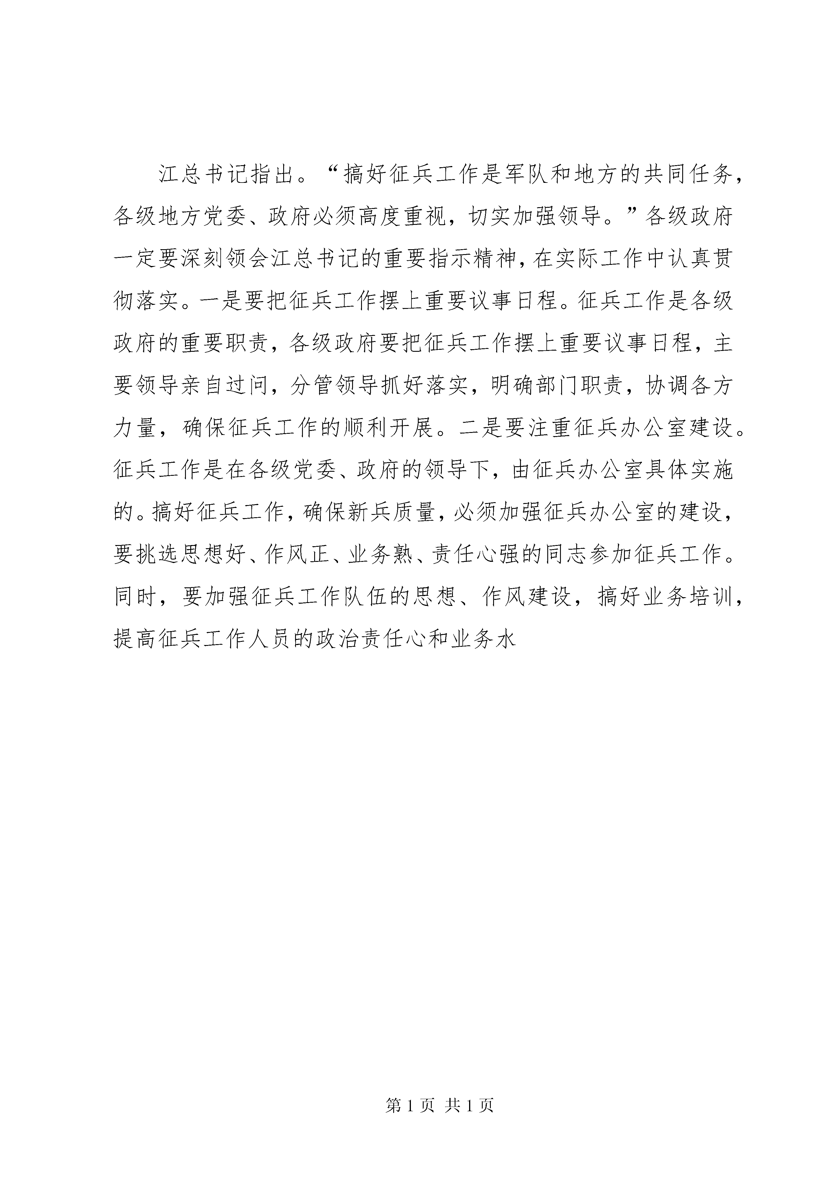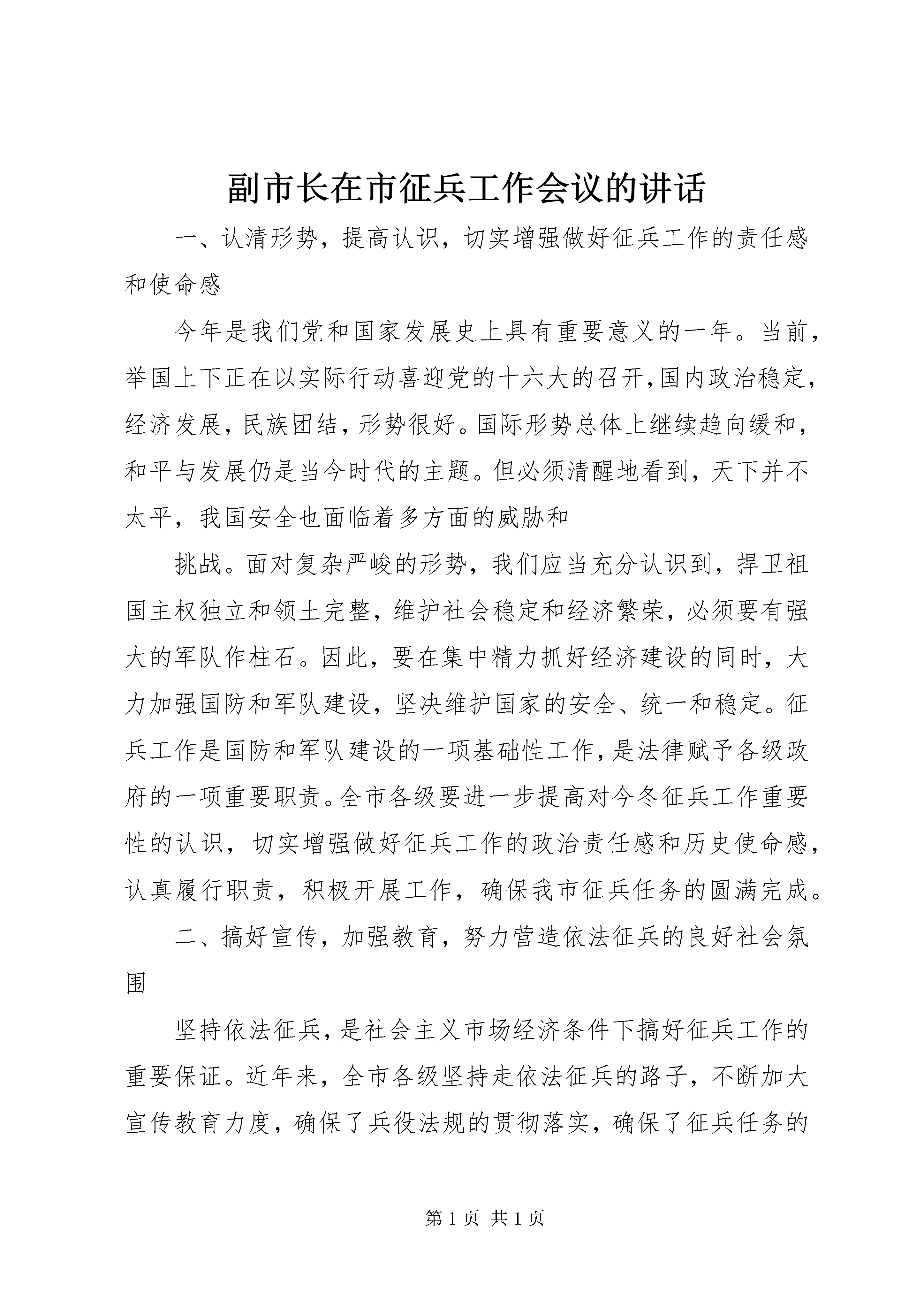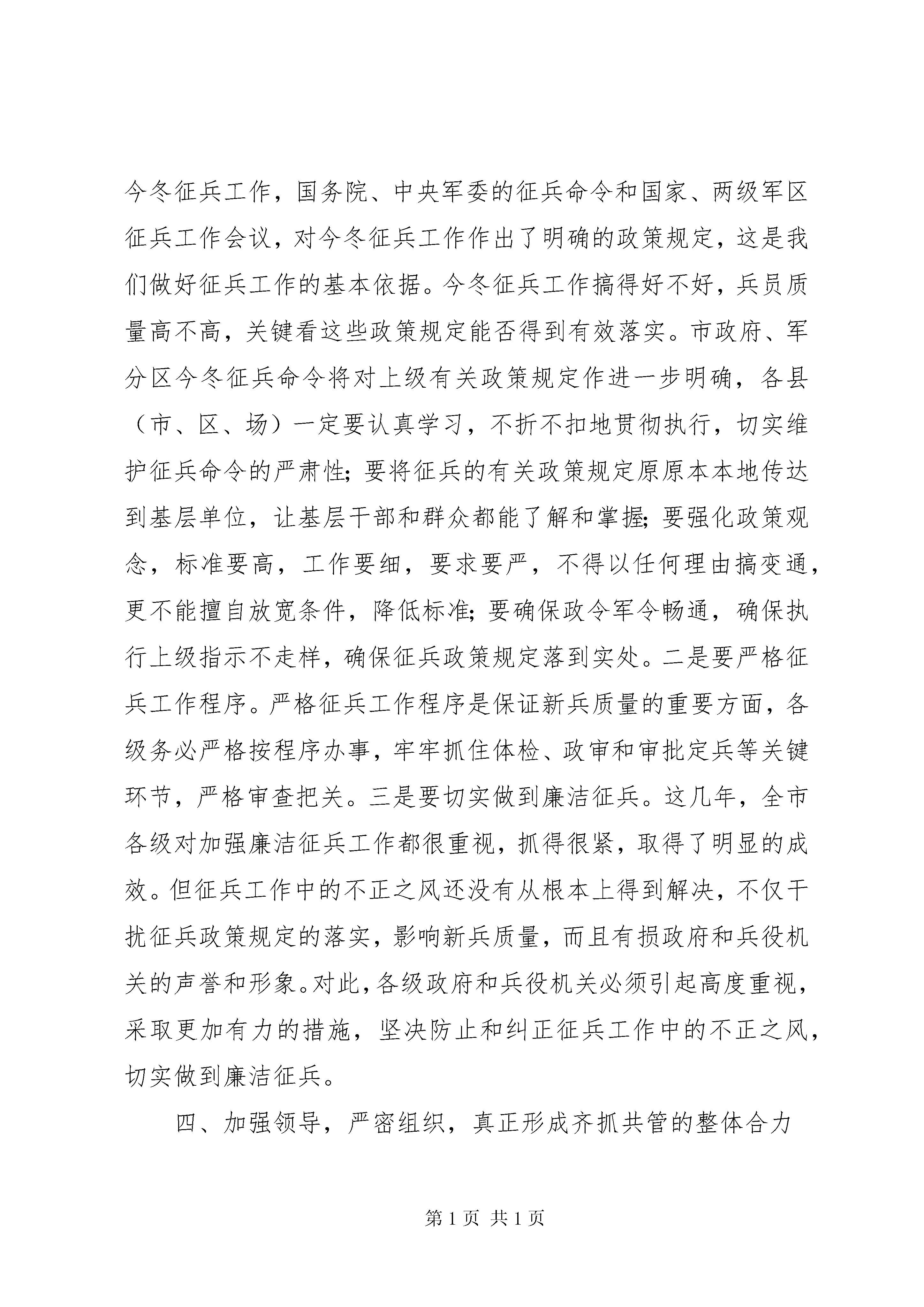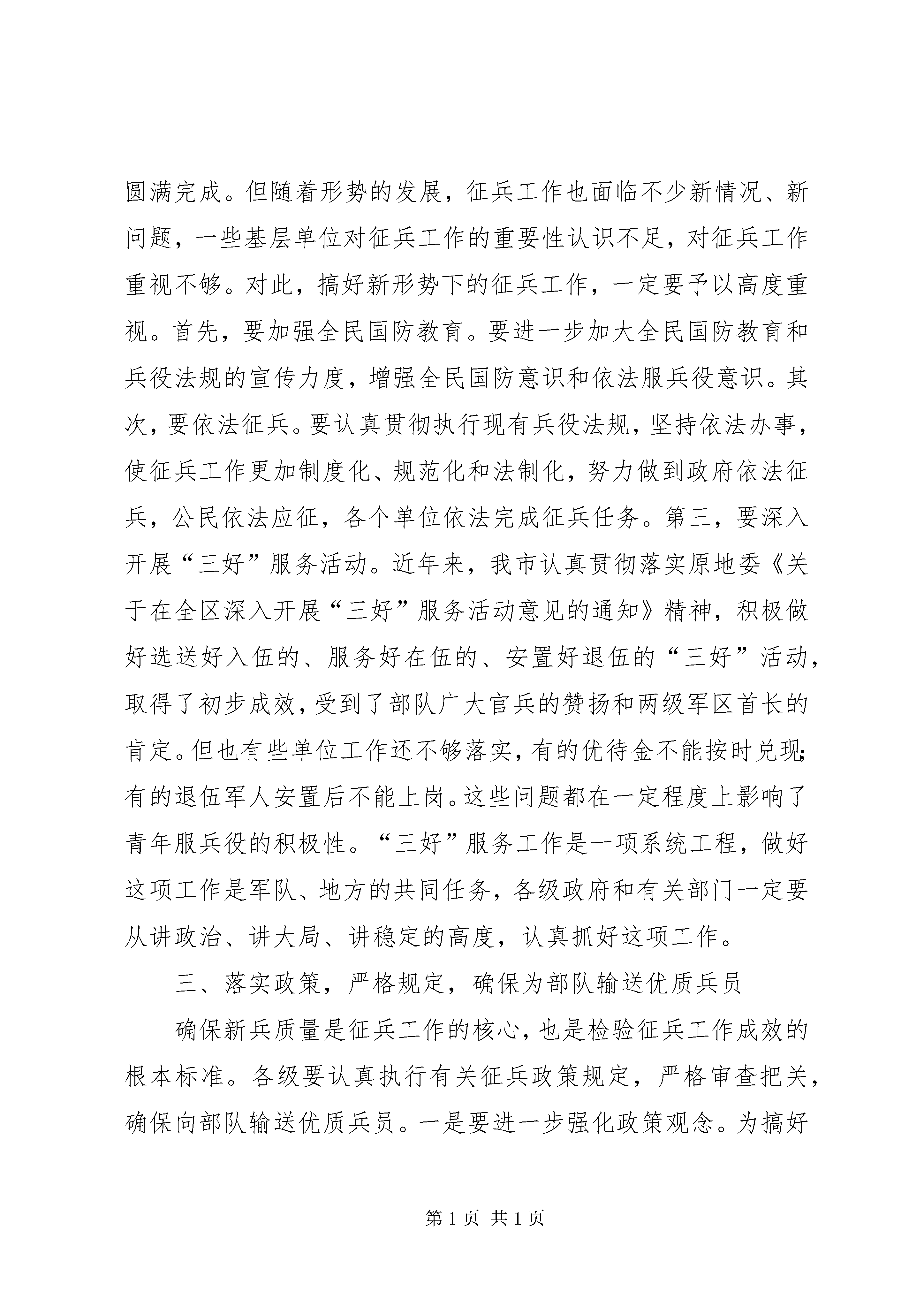 副市长在市征兵工作会议的讲话一、认清形势,提高认识,切实增强做好征兵工作的责任感和使命感今年是我们党和国家发展史上具有重要意义的一年。当前,举国上下正在以实际行动喜迎党的十六大的召开,国内政治稳定,经济发展,民族团结,形势很好。国际形势总体上继续趋向缓和,和平与发展仍是当今时代的主题。但必须清醒地看到,天下并不太平,我国安全也面临着多方面的威胁和挑战。面对复杂严峻的形势,我们应当充分认识到,捍卫祖国主权独立和领土完整,维护社会稳定和经济繁荣,必须要有强大的军队作柱石。因此,要在集中精力抓好经济建设的同时,大力加强国防和军队建设,坚决维护国家的安全、统一和稳定。征兵工作是国防和军队建设的一项基础性工作,是法律赋予各级政府的一项重要职责。全市各级要进一步提高对今冬征兵工作重要性的认识,切实增强做好征兵工作的政治责任感和历史使命感,认真履行职责,积极开展工作,确保我市征兵任务的圆满完成。二、搞好宣传,加强教育,努力营造依法征兵的良好社会氛围坚持依法征兵,是社会主义市场经济条件下搞好征兵工作的重要保证。近年来,全市各级坚持走依法征兵的路子,不断加大宣传教育力度,确保了兵役法规的贯彻落实,确保了征兵任务的圆满完成。但随着形势的发展,征兵工作也面临不少新情况、新问题,一些基层单位对征兵工作的重要性认识不足,对征兵工作重视不够。对此,搞好新形势下的征兵工作,一定要予以高度重视。首先,要加强全民国防教育。要进一步加大全民国防教育和兵役法规的宣传力度,增强全民国防意识和依法服兵役意识。其次,要依法征兵。要认真贯彻执行现有兵役法规,坚持依法办事,使征兵工作更加制度化、规范化和法制化,努力做到政府依法征兵,公民依法应征,各个单位依法完成征兵任务。第三,要深入开展“三好”服务活动。近年来,我市认真贯彻落实原地委《关于在全区深入开展“三好”服务活动意见的通知》精神,积极做好选送好入伍的、服务好在伍的、安置好退伍的“三好”活动,取得了初步成效,受到了部队广大官兵的赞扬和两级军区首长的肯定。但也有些单位工作还不够落实,有的优待金不能按时兑现;有的退伍军人安置后不能上岗。这些问题都在一定程度上影响了青年服兵役的积极性。“三好”服务工作是一项系统工程,做好这项工作是军队、地方的共同任务,各级政府和有关部门一定要从讲政治、讲大局、讲稳定的高度,认真抓好这项工作。三、落实政策,严格规定,确保为部队输送优质兵员确保新兵质量是征兵工作的核心,也是检验征兵工作成效的根本标准。各级要认真执行有关征兵政策规定,严格审查把关,确保向部队输送优质兵员。一是要进一步强化政策观念。为搞好今冬征兵工作,国务院、中央军委的征兵命令和国家、两级军区征兵工作会议,对今冬征兵工作作出了明确的政策规定,这是我们做好征兵工作的基本依据。今冬征兵工作搞得好不好,兵员质量高不高,关键看这些政策规定能否得到有效落实。市政府、军分区今冬征兵命令将对上级有关政策规定作进一步明确,各县(市、区、场)一定要认真学习,不折不扣地贯彻执行,切实维护征兵命令的严肃性;要将征兵的有关政策规定原原本本地传达到基层单位,让基层干部和群众都能了解和掌握;要强化政策观念,标准要高,工作要细,要求要严,不得以任何理由搞变通,更不能擅自放宽条件,降低标准;要确保政令军令畅通,确保执行上级指示不走样,确保征兵政策规定落到实处。二是要严格征兵工作程序。严格征兵工作程序是保证新兵质量的重要方面,各级务必严格按程序办事,牢牢抓住体检、政审和审批定兵等关键环节,严格审查把关。三是要切实做到廉洁征兵。这几年,全市各级对加强廉洁征兵工作都很重视,抓得很紧,取得了明显的成效。但征兵工作中的不正之风还没有从根本上得到解决,不仅干扰征兵政策规定的落实,影响新兵质量,而且有损政府和兵役机关的声誉和形象。对此,各级政府和兵役机关必须引起高度重视,采取更加有力的措施,坚决防止和纠正征兵工作中的不正之风,切实做到廉洁征兵。四、加强领导,严密组织,真正形成齐抓共管的整体合力江总书记指出。“搞好征兵工作是军队和地方的共同任务,各级地方党委、政府必须高度重视,切实加强领导。”各级政府一定要深刻领会江总书记的重要指示精神,在实际工作中认真贯彻落实。一是要把征兵工作摆上重要议事日程。征兵工作是各级政府的重要职责,各级政府要把征兵工作摆上重要议事日程,主要领导亲自过问,分管领导抓好落实,明确部门职责,协调各方力量,确保征兵工作的顺利开展。二是要注重征兵办公室建设。征兵工作是在各级党委、政府的领导下,由征兵办公室具体实施的。搞好征兵工作,确保新兵质量,必须加强征兵办公室的建设,要挑选思想好、作风正、业务熟、责任心强的同志参加征兵工作。同时,要加强征兵工作队伍的思想、作风建设,搞好业务培训,提高征兵工作人员的政治责任心和业务水