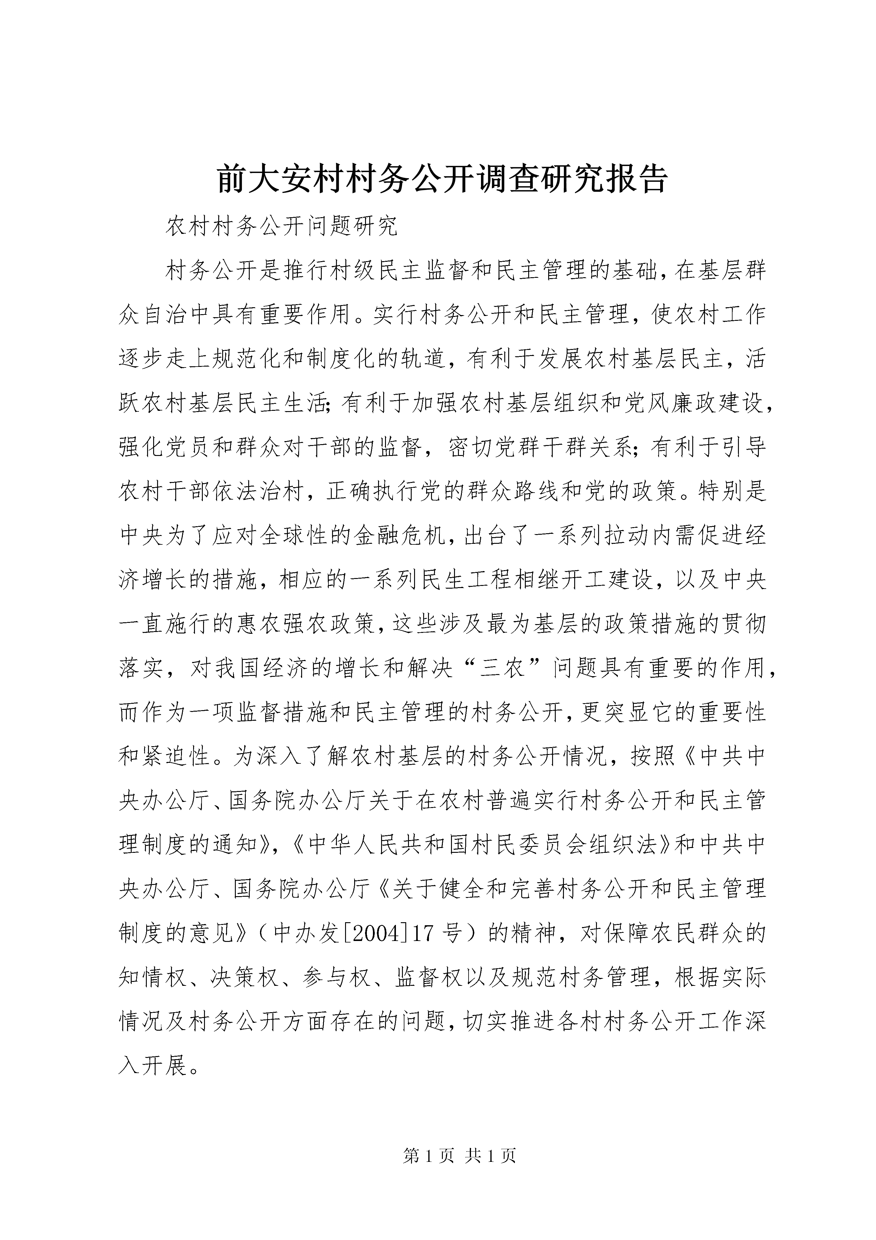 前大安村村务公开调查研究报告农村村务公开问题研究村务公开是推行村级民主监督和民主管理的基础,在基层群众自治中具有重要作用。实行村务公开和民主管理,使农村工作逐步走上规范化和制度化的轨道,有利于发展农村基层民主,活跃农村基层民主生活;有利于加强农村基层组织和党风廉政建设,强化党员和群众对干部的监督,密切党群干群关系;有利于引导农村干部依法治村,正确执行党的群众路线和党的政策。特别是中央为了应对全球性的金融危机,出台了一系列拉动内需促进经济增长的措施,相应的一系列民生工程相继开工建设,以及中央一直施行的惠农强农政策,这些涉及最为基层的政策措施的贯彻落实,对我国经济的增长和解决“三农”问题具有重要的作用,而作为一项监督措施和民主管理的村务公开,更突显它的重要性和紧迫性。为深入了解农村基层的村务公开情况,按照《中共中央办公厅、国务院办公厅关于在农村普遍实行村务公开和民主管理制度的通知》,《中华人民共和国村民委员会组织法》和中共中央办公厅、国务院办公厅《关于健全和完善村务公开和民主管理制度的意见》(中办发[2004]17号)的精神,对保障农民群众的知情权、决策权、参与权、监督权以及规范村务管理,根据实际情况及村务公开方面存在的问题,切实推进各村村务公开工作深入开展。一、村务公开工作中存在的问题1、敷衍应付,公开不规范。虽然所有行政村推行了村务公开,但从公开所要达到的目标要求来衡量看,仍然存在不够规范完备的地方:一是公开不及时。对项目、资金的公开,往往在项目结束资金耗尽后才公开;事前“计划不公开”,事中“操作不公开”,事完“决算不公开”,甚至是群众告状后或是举报后才草草公开;二是公开地点和形式太单一。几乎所有的村都只有村办公室附近的一个公开栏,有的村就此一个公开栏都不完整,现在的村都是在原有几个村的基础上合并的,管辖范围相对较大,对于不在公开栏附近的群众,很难有机会看到公开内容,加之公开形式多用粉笔书写,公开栏又没有防护措施,公开过程中仅仅是贴出去了、写出去了,有时还会出现还没等到群众看见就被撕掉擦掉了,公开走了过场;三是公开内容不完整。有些村公开的内容都是些不痛不痒的,而对群众比较关注的问题遮遮掩掩,不愿公开甚至不公开、半公开、避重就轻。2、疏于监督,机制不完善。目前存在四种情况,使少数村忽视村务公开工作,一是干部认为农村工作任务繁重,千头万绪,要抓的重点工作、中心任务多,村务公开也就是个形式;二是认为村里财务经常性收支项目单一,金额有限,甚至大多数月份为零收入与零开支;三是干部认为自己开支都比较规范;四是少数村干部在主观上没有村务公开意识,从而可以浑水摸鱼。一方面,一些村没有完善以“村民会议、村民代表会议、2村民理财小组”为主体内容的监督制度,有的村虽然有上述制度,但却是摆设,形同虚设,没有真正发挥应有的作用;另一方面,村务公开缺乏必要的制度保证,仅以会议安排部署进行操作,遇到上级领导检查时匆匆交帐,没有把公开作为一项长期工作来抓,缺乏制度约束。3、缺乏联系,衔接不紧密。目前,在推行村务公开中,村务公开的主体是村级干部和与村集体经济的有关对象,监督的主体应是广大村民,但目前二者之间还缺乏有机联系,互动性不够,存在两张皮的情况。4、忽视反馈,效果不明显。对有些事项的公开,只重公开的形式,而轻公开后的结果,有公开无落实,很少认真考虑公开后如何搜集群众的反馈意见,认为公开后就万事大吉。尤其是有些村对干部群众提出的意见建议以及举报的事项不能正确对待,该正确答复解释的不答复解释,该及时整改解决的不整改解决,埋下隐患,引发事态,激发矛盾。二、存在问题的原因分析1、基层干部认识不到位。部分村干部对村务公开工作的重要性认识不到位,片面地认为村务公开只是钱的事,认为村集体经济收入少甚至零收入,工资又由上级财政解决,没什么好公开,没有提高到村务公开是民主管理村务和密切干群关系的一项有效措施的这一高度。2、基层干部素质不到位。干部的职责是恪尽职守。而一些素质差的村干部,不仅不认真贯彻党的方针政策,反而借机优亲厚友,办事不公,从而隐瞒事实不予公开。一些村出现的在评定农村低保上严重不公的现象正说明这一点。3、群众参与、监督意识不到位。部分群众认为村务公开是干部们的事,与自已无关,或者对其存有困惑和疑虑,担心是做表面文章,解决不了实际问题,从而在思想上缺乏信心,缺乏起码的参与、监督意识,没有形成一种良性的互动。4、制度约束不到位。在管理考核村务公开工作上,镇虽制定了制度和考核办法,但施行却乏力,村级组织是一级自治组织,村务公开过程当中,对不按规定办理的,政府缺乏制约措施。三、做好村务公开工作的对策及建议1、深化宣传教育,解决认识不到位的问题。村务公开由于涉及面广、影响大、触动基层干部的自身利益较多,推行有一定的难度。因此,首先应抓住解决