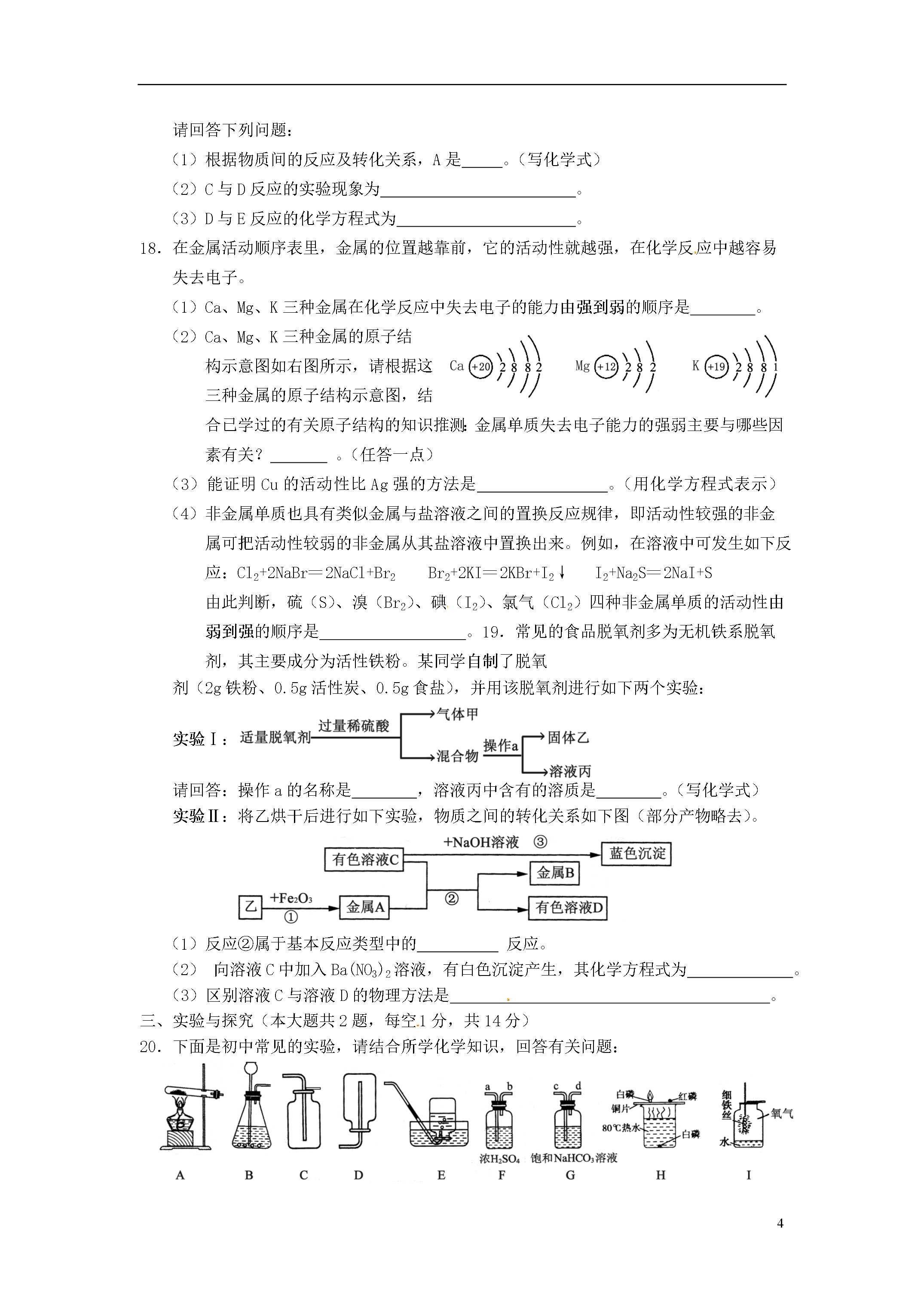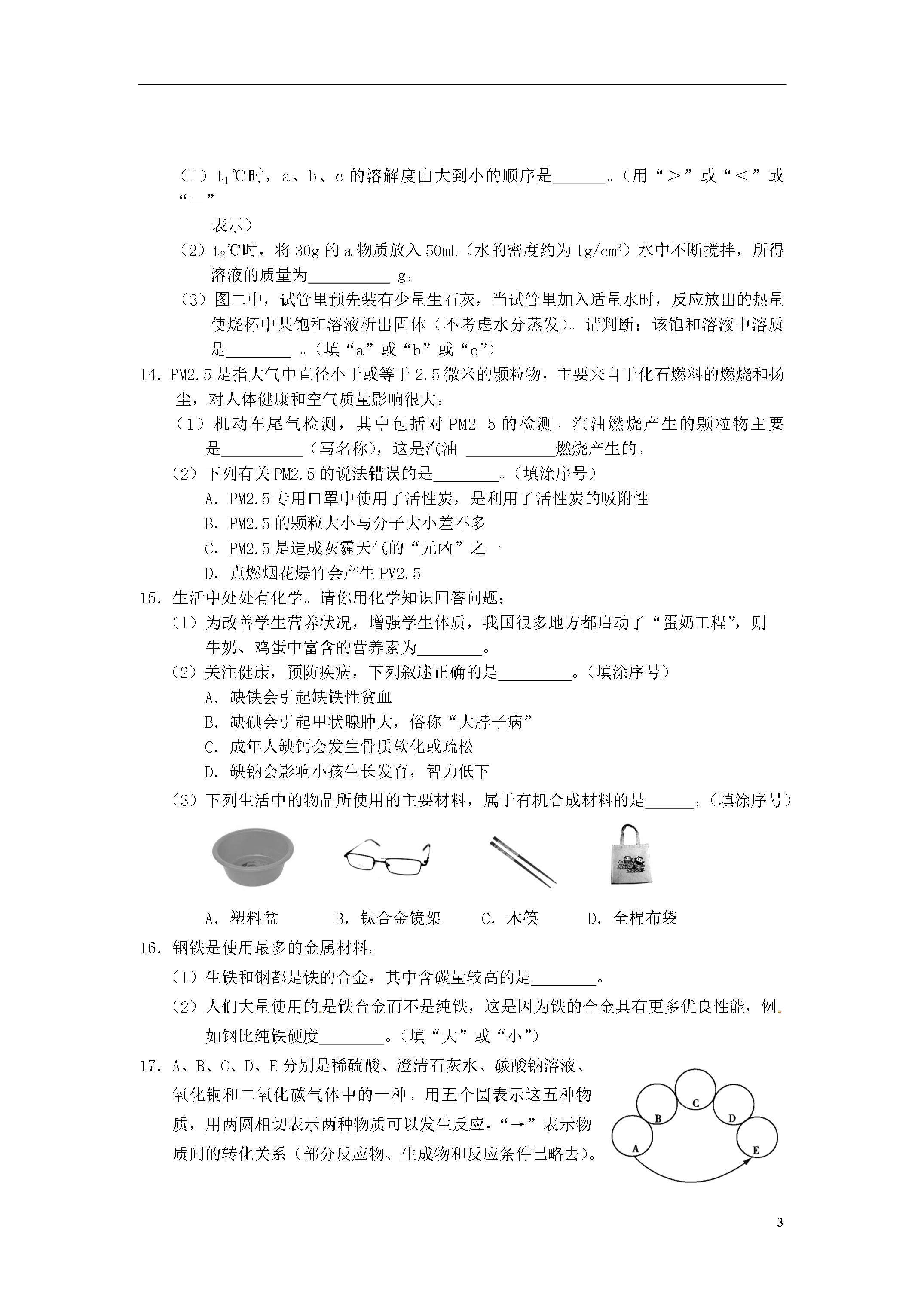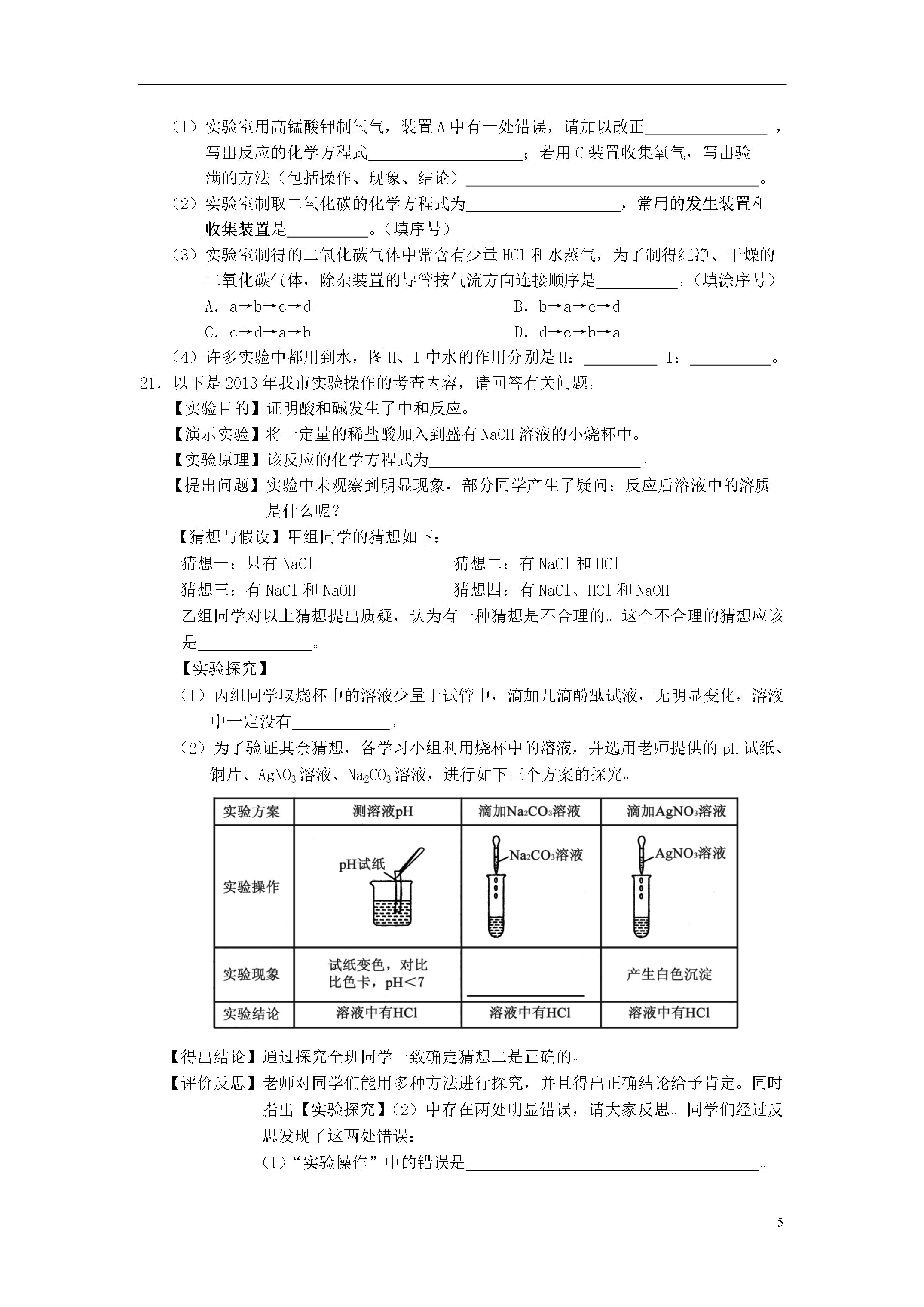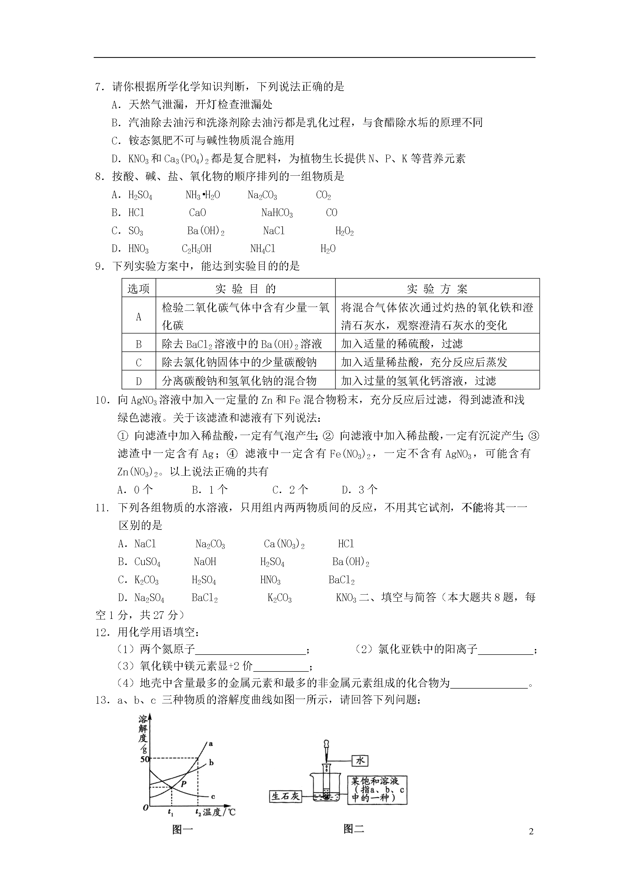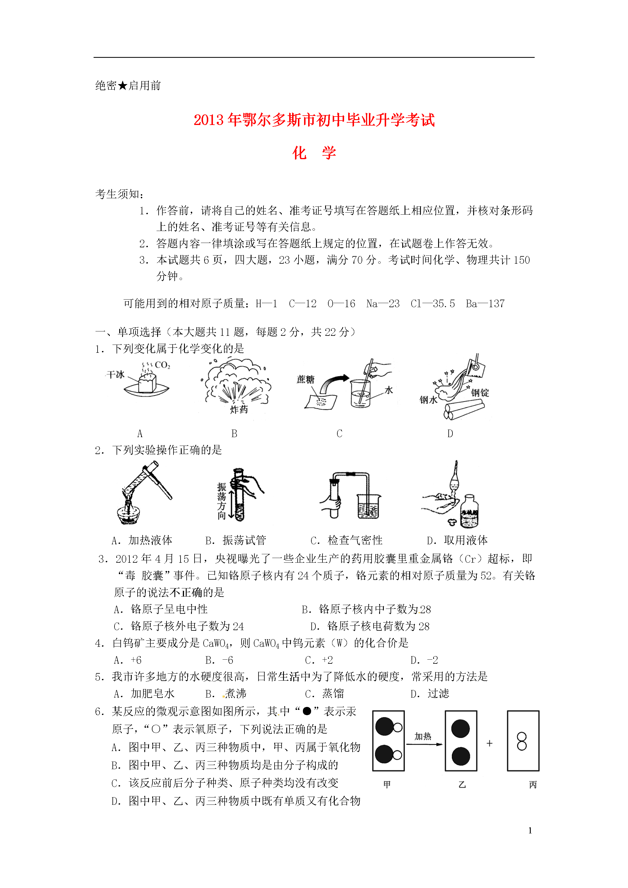 8绝密★启用前2013年鄂尔多斯市初中毕业升学考试化学考生须知:1.作答前,请将自己的姓名、准考证号填写在答题纸上相应位置,并核对条形码上的姓名、准考证号等有关信息。2.答题内容一律填涂或写在答题纸上规定的位置,在试题卷上作答无效。3.本试题,四大题,23小题,满分70分。考试时间化学、物理共计150分钟。可能用到的相对原子质量:H—1C—12O—16Na—23Cl—35.5Ba—137一、单项选择(本大题共11题,每题2分,共22分)1.下列变化属于化学变化的是ABCD2.下列实验操作正确的是A.加热液体B.振荡试管C.检查气密性D.取用液体3.2012年4月15日,央视曝光了一些企业生产的药用胶囊里重金属铬(Cr)超标,即“毒胶囊”事件。已知铬原子核内有24个质子,铬元素的相对原子质量为52。有关铬原子的说法不正确的是A.铬原子呈电中性B.铬原子核内中子数为28C.铬原子核外电子数为24D.铬原子核电荷数为284.白钨矿主要成分是CaWO4,则CaWO4中钨元素(W)的化合价是A.+6B.-6C.+2D.-25.我市许多地方的水硬度很高,日常生活中为了降低水的硬度,常采用的方法是A.加肥皂水B.煮沸C.蒸馏D.过滤6.某反应的微观示意图如图所示,其中“●”表示汞原子,“○”表示氧原子,下列说法正确的是A.图中甲、乙、丙三种物质中,甲、丙属于氧化物B.图中甲、乙、丙三种物质均是由分子构成的C.该反应前后分子种类、原子种类均没有改变D.图中甲、乙、丙三种物质中既有单质又有化合物7.请你根据所学化学知识判断,下列说法正确的是A.天然气泄漏,开灯检查泄漏处B.汽油除去油污和洗涤剂除去油污都是乳化过程,与食醋除水垢的原理不同C.铵态氮肥不可与碱性物质混合施用D.KNO3和Ca3(PO4)2都是复合肥料,为植物生长提供N、P、K等营养元素8.按酸、碱、盐、氧化物的顺序排列的一组物质是A.H2SO4NH3·H2ONa2CO3CO2B.HClCaONaHCO3COC.SO3Ba(OH)2NaClH2O2D.HNO3C2H5OHNH4ClH2O9.下列实验方案中,能达到实验目的的是选项实验目的实验方案A检验二氧化碳气体中含有少量一氧化碳将混合气体依次通过灼热的氧化铁和澄清石灰水,观察澄清石灰水的变化B除去BaCl2溶液中的Ba(OH)2溶液加入适量的稀硫酸,过滤C除去氯化钠固体中的少量碳酸钠加入适量稀盐酸,充分反应后蒸发D分离碳酸钠和氢氧化钠的混合物加入过量的氢氧化钙溶液,过滤10.向AgNO3溶液中加入一定量的Zn和Fe混合物粉末,充分反应后过滤,得到滤渣和浅绿色滤液。关于该滤渣和滤液有下列说法:①向滤渣中加入稀盐酸,一定有气泡产生;②向滤液中加入稀盐酸,一定有沉淀产生;③滤渣中一定含有Ag;④滤液中一定含有Fe(NO3)2,一定不含有AgNO3,可能含有Zn(NO3)2。以上说法正确的共有A.0个B.1个C.2个D.3个11.下列各组物质的水溶液,只用组内两两物质间的反应,不用其它试剂,不能将其一一区别的是A.NaClNa2CO3Ca(NO3)2HClB.CuSO4NaOHH2SO4Ba(OH)2C.K2CO3H2SO4HNO3BaCl2D.Na2SO4BaCl2K2CO3KNO3二、填空与简答(本大题共8题,每空1分,共27分)12.用化学用语填空:(1)两个氮原子;(2)氯化亚铁中的阳离子;(3)氧化镁中镁元素显+2价;(4)地壳中含量最多的金属元素和最多的非金属元素组成的化合物为。13.a、b、c三种物质的溶解度曲线如图一所示,请回答下列问题:(1)t1℃时,a、b、c的溶解度由大到小的顺序是。(用“>”或“<”或“=”表示)(2)t2℃时,将30g的a物质放入50mL(水的密度约为1g/cm3)水中不断搅拌,所得溶液的质量为g。(3)图二中,试管里预先装有少量生石灰,当试管里加入适量水时,反应放出的热量使烧杯中某饱和溶液析出固体(不考虑水分蒸发)。请判断:该饱和溶液中溶质是。(填“a”或“b”或“c”)14.PM2.5是指大气中直径小于或等于2.5微米的颗粒物,主要来自于化石燃料的燃烧和扬尘,对人体健康和空气质量影响很大。(1)机动车尾气检测,其中包括对PM2.5的检测。汽油燃烧产生的颗粒物主要是(写名称),这是汽油燃烧产生的。(2)下列有关PM2.5的说法错误的是。(填涂序号)A.PM2.5专用口罩中使用了活性炭,是利用了活性炭的吸附性B.PM2.5的颗粒大小与分子大小差不多C.PM2.5是造成灰霾天气的“元凶”之一D.点燃烟花爆竹会产生PM2.515.生活中处处有化学。请你用化学知识回答问题:(1)为改善学生营养状况,增强学生体质,我国很多地方都启动了“蛋奶工程”,则牛奶、鸡蛋中富含的营养素为。(2)关注健康,预防疾病,下列