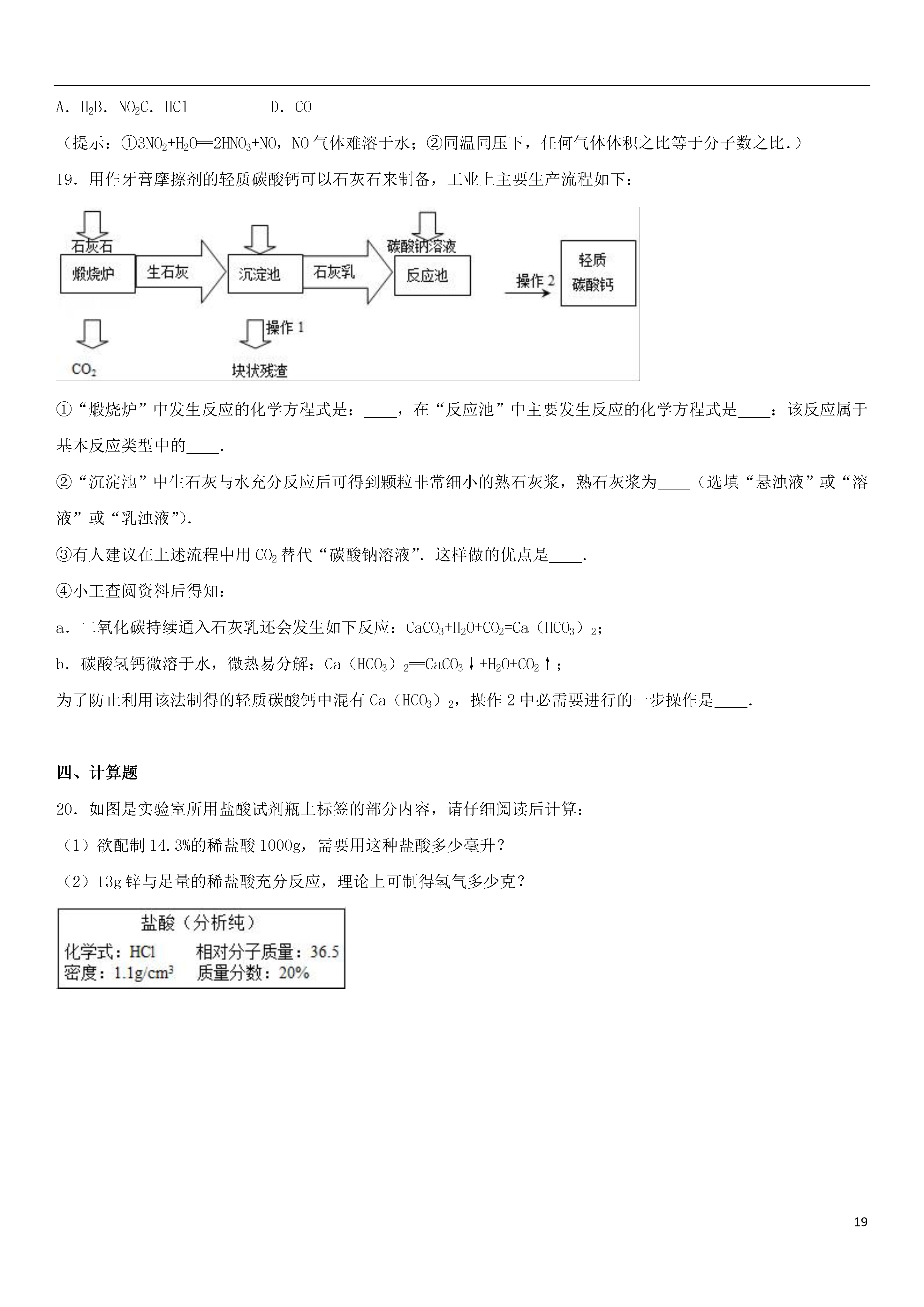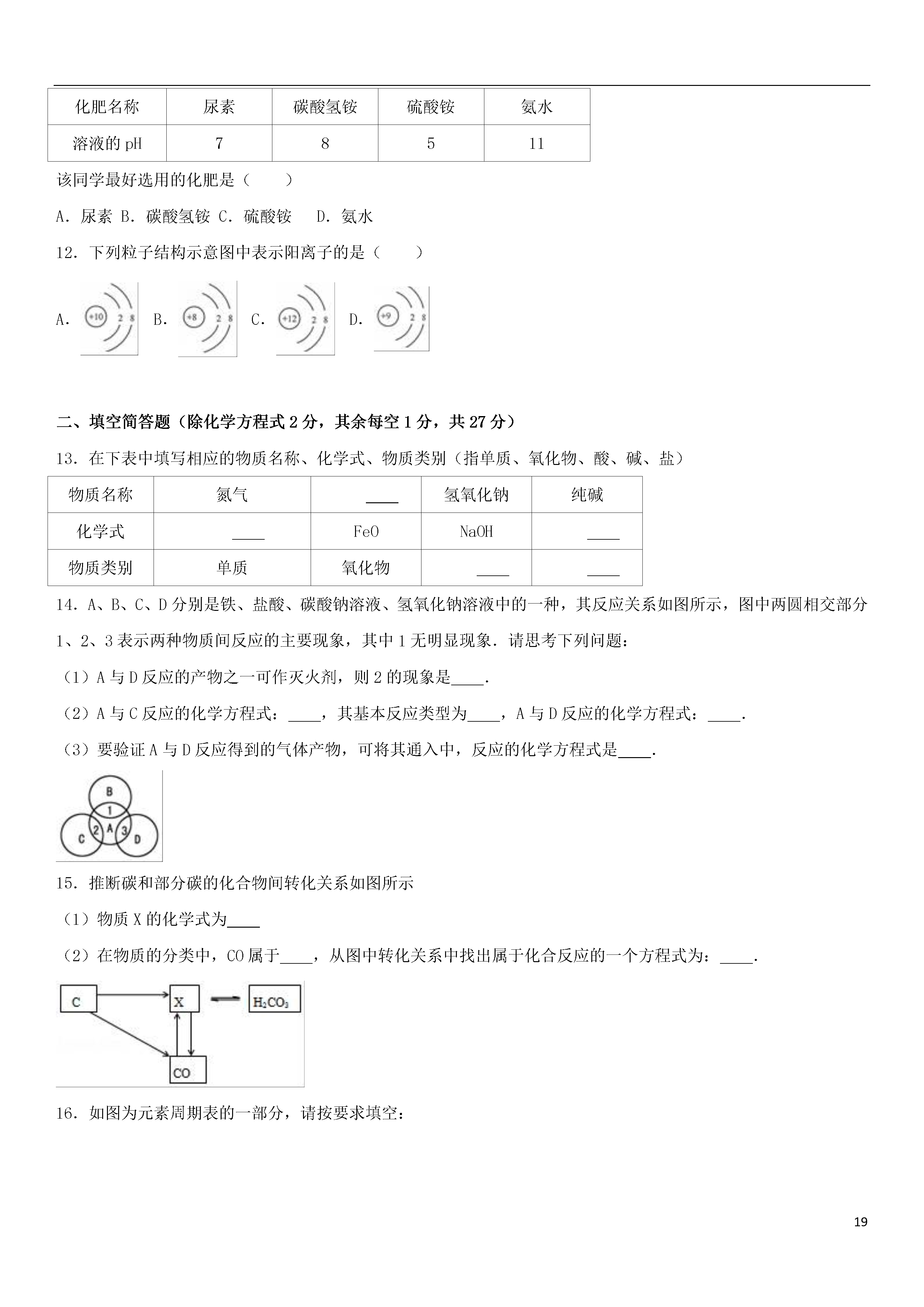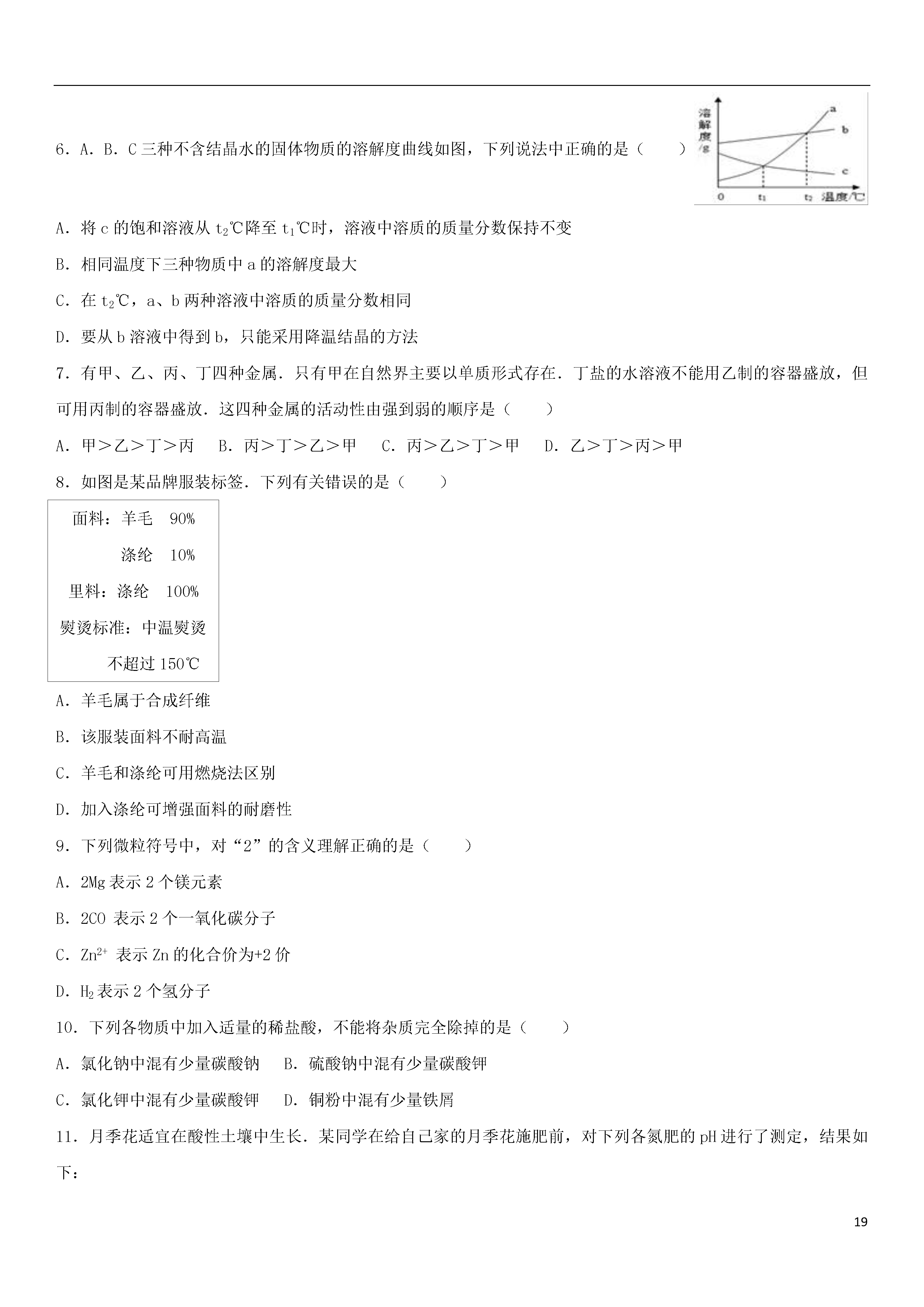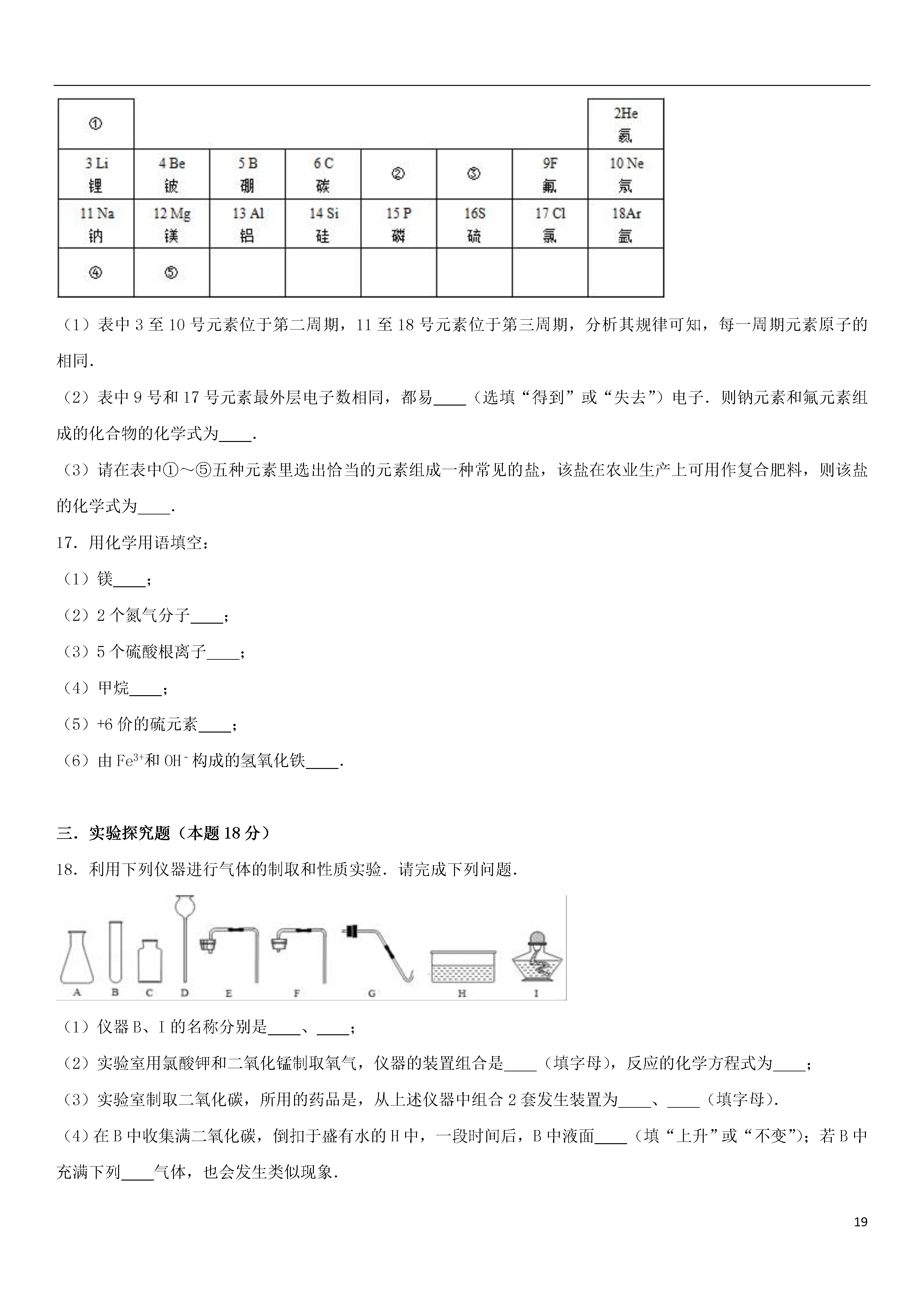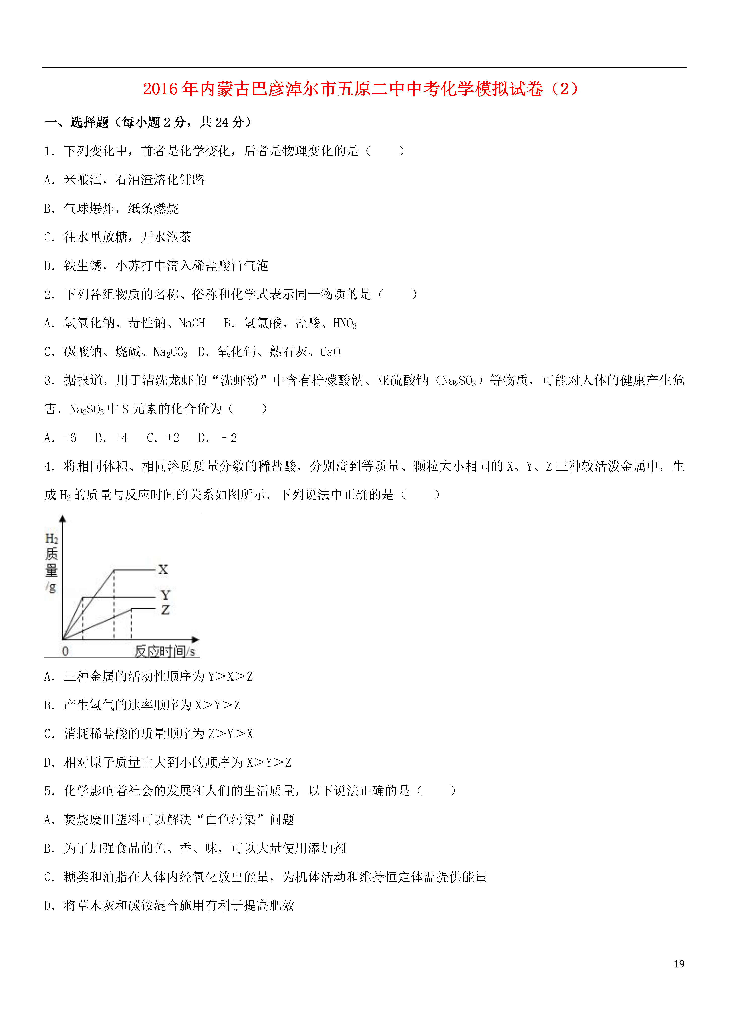 192016年内蒙古巴彦淖尔市五原二中中考化学模拟试卷(2)一、选择题(每小题2分,共24分)1.下列变化中,前者是化学变化,后者是物理变化的是()A.米酿酒,石油渣熔化铺路B.气球爆炸,纸条燃烧C.往水里放糖,开水泡茶D.铁生锈,小苏打中滴入稀盐酸冒气泡2.下列各组物质的名称、俗称和化学式表示同一物质的是()A.氢氧化钠、苛性钠、NaOHB.氢氯酸、盐酸、HNO3C.碳酸钠、烧碱、Na2CO3D.氧化钙、熟石灰、CaO3.据报道,用于清洗龙虾的“洗虾粉”中含有柠檬酸钠、亚硫酸钠(Na2SO3)等物质,可能对人体的健康产生危害.Na2SO3中S元素的化合价为()A.+6B.+4C.+2D.﹣24.将相同体积、相同溶质质量分数的稀盐酸,分别滴到等质量、颗粒大小相同的X、Y、Z三种较活泼金属中,生成H2的质量与反应时间的关系如图所示.下列说法中正确的是()A.三种金属的活动性顺序为Y>X>ZB.产生氢气的速率顺序为X>Y>ZC.消耗稀盐酸的质量顺序为Z>Y>XD.相对原子质量由大到小的顺序为X>Y>Z5.化学影响着社会的发展和人们的生活质量,以下说法正确的是()A.焚烧废旧塑料可以解决“白色污染”问题B.为了加强食品的色、香、味,可以大量使用添加剂C.糖类和油脂在人体内经氧化放出能量,为机体活动和维持恒定体温提供能量D.将草木灰和碳铵混合施用有利于提高肥效6.A.B.C三种不含结晶水的固体物质的溶解度曲线如图,下列说法中正确的是()A.将c的饱和溶液从t2℃降至t1℃时,溶液中溶质的质量分数保持不变B.相同温度下三种物质中a的溶解度最大C.在t2℃,a、b两种溶液中溶质的质量分数相同D.要从b溶液中得到b,只能采用降温结晶的方法7.有甲、乙、丙、丁四种金属.只有甲在自然界主要以单质形式存在.丁盐的水溶液不能用乙制的容器盛放,但可用丙制的容器盛放.这四种金属的活动性由强到弱的顺序是()A.甲>乙>丁>丙B.丙>丁>乙>甲C.丙>乙>丁>甲D.乙>丁>丙>甲8.如图是某品牌服装标签.下列有关错误的是()面料:羊毛90%涤纶10%里料:涤纶100%熨烫标准:中温熨烫不超过150℃A.羊毛属于合成纤维B.该服装面料不耐高温C.羊毛和涤纶可用燃烧法区别D.加入涤纶可增强面料的耐磨性9.下列微粒符号中,对“2”的含义理解正确的是()A.2Mg表示2个镁元素B.2CO表示2个一氧化碳分子C.Zn2+表示Zn的化合价为+2价D.H2表示2个氢分子10.下列各物质中加入适量的稀盐酸,不能将杂质完全除掉的是()A.氯化钠中混有少量碳酸钠B.硫酸钠中混有少量碳酸钾C.氯化钾中混有少量碳酸钾D.铜粉中混有少量铁屑11.月季花适宜在酸性土壤中生长.某同学在给自己家的月季花施肥前,对下列各氮肥的pH进行了测定,结果如下:化肥名称尿素碳酸氢铵硫酸铵氨水溶液的pH78511该同学最好选用的化肥是()A.尿素B.碳酸氢铵C.硫酸铵D.氨水12.下列粒子结构示意图中表示阳离子的是()A.B.C.D.二、填空简答题(除化学方程式2分,其余每空1分,共27分)13.在下表中填写相应的物质名称、化学式、物质类别(指单质、氧化物、酸、碱、盐)物质名称氮气氢氧化钠纯碱化学式FeONaOH物质类别单质氧化物14.A、B、C、D分别是铁、盐酸、碳酸钠溶液、氢氧化钠溶液中的一种,其反应关系如图所示,图中两圆相交部分1、2、3表示两种物质间反应的主要现象,其中1无明显现象.请思考下列问题:(1)A与D反应的产物之一可作灭火剂,则2的现象是.(2)A与C反应的化学方程式:,其基本反应类型为,A与D反应的化学方程式:.(3)要验证A与D反应得到的气体产物,可将其通入中,反应的化学方程式是.15.推断碳和部分碳的化合物间转化关系如图所示(1)物质X的化学式为(2)在物质的分类中,CO属于,从图中转化关系中找出属于化合反应的一个方程式为:.16.如图为元素周期表的一部分,请按要求填空:(1)表中3至10号元素位于第二周期,11至18号元素位于第三周期,分析其规律可知,每一周期元素原子的相同.(2)表中9号和17号元素最外层电子数相同,都易(选填“得到”或“失去”)电子.则钠元素和氟元素组成的化合物的化学式为.(3)请在表中①~⑤五种元素里选出恰当的元素组成一种常见的盐,该盐在农业生产上可用作复合肥料,则该盐的化学式为.17.用化学用语填空:(1)镁;(2)2个氮气分子;(3)5个硫酸根离子;(4)甲烷;(5)+6价的硫元素;(6)由Fe3+和OH﹣构成的氢氧化铁.三.实验探究题(本题18分)18.利用下列仪器进行气体的制取