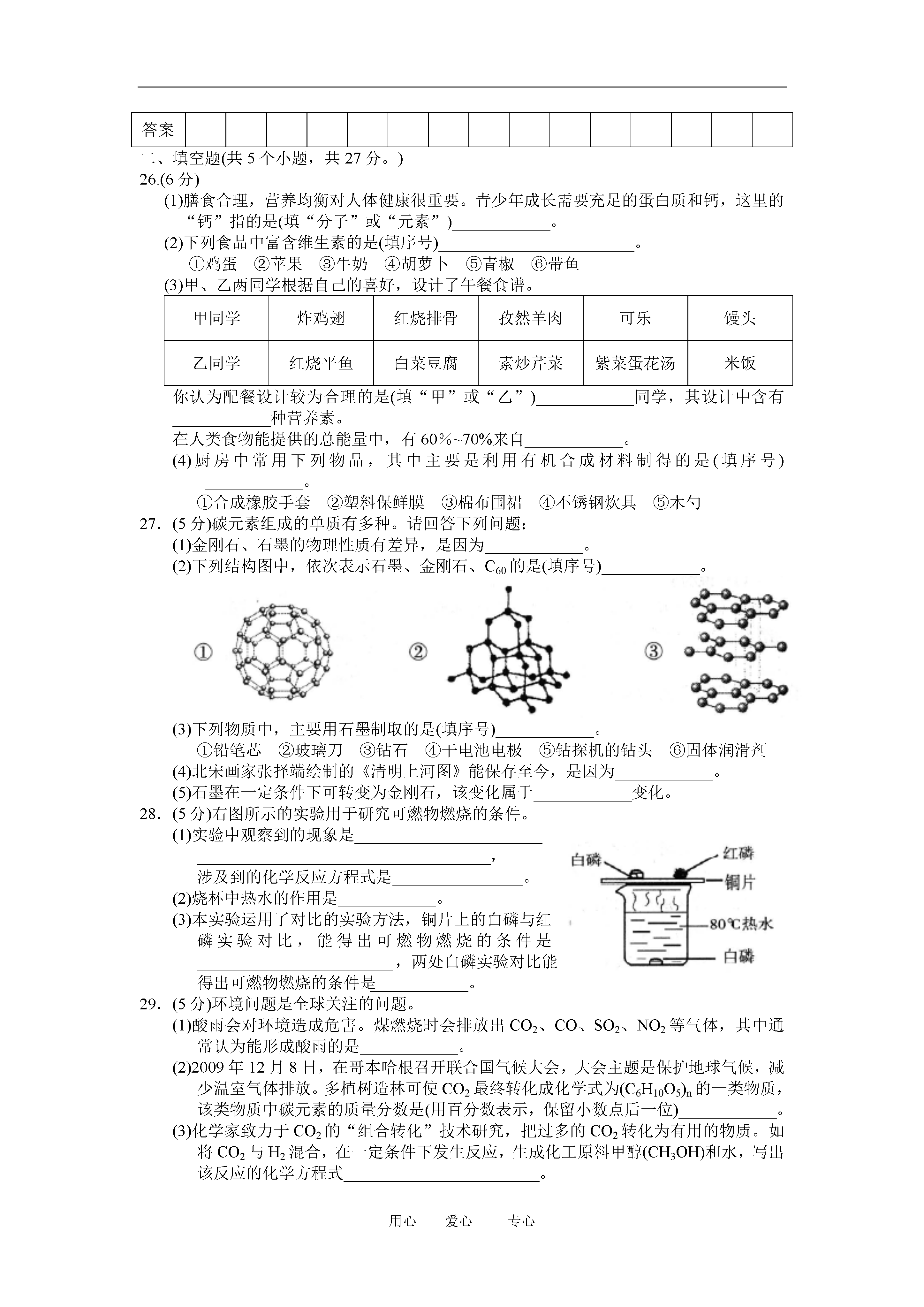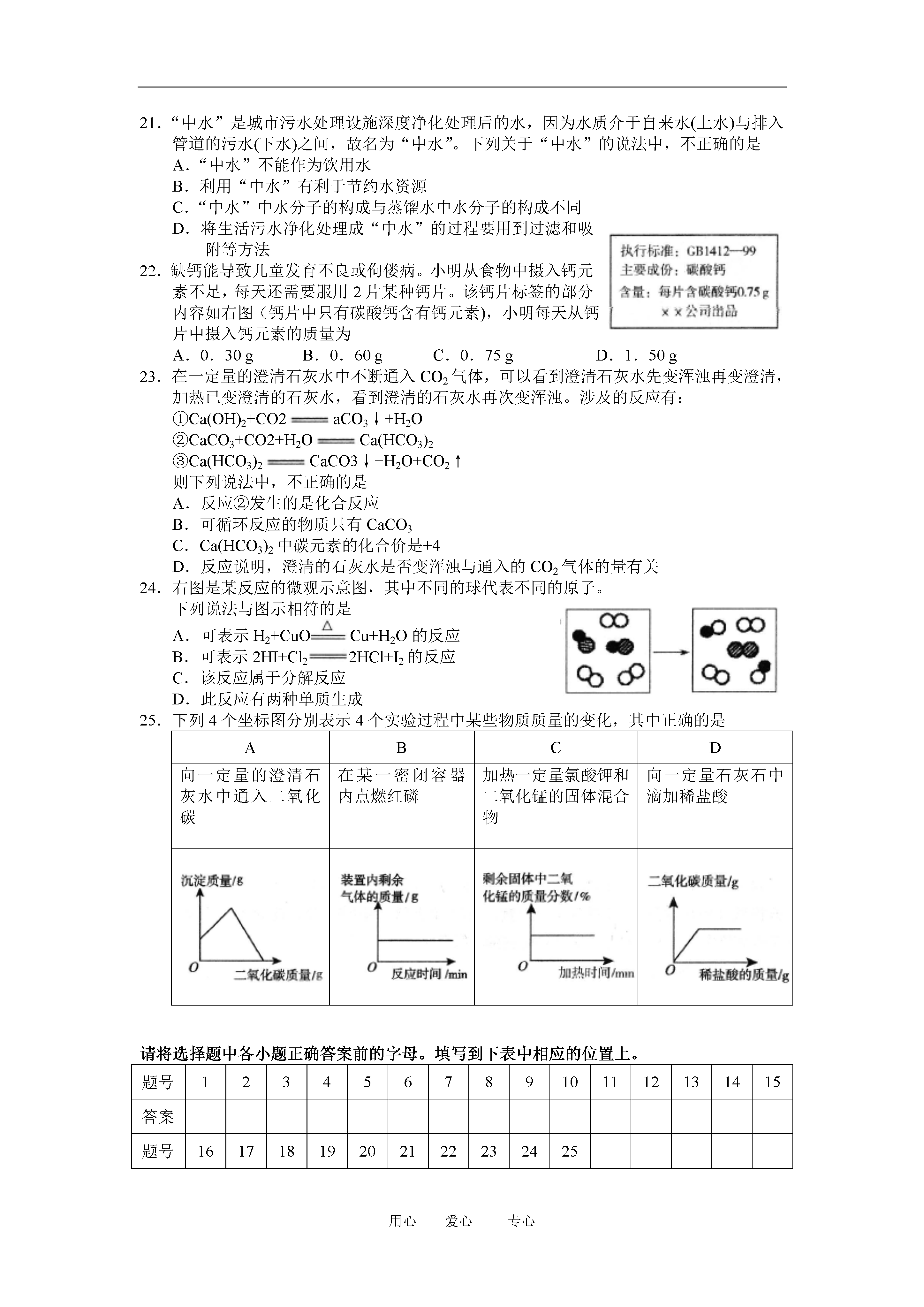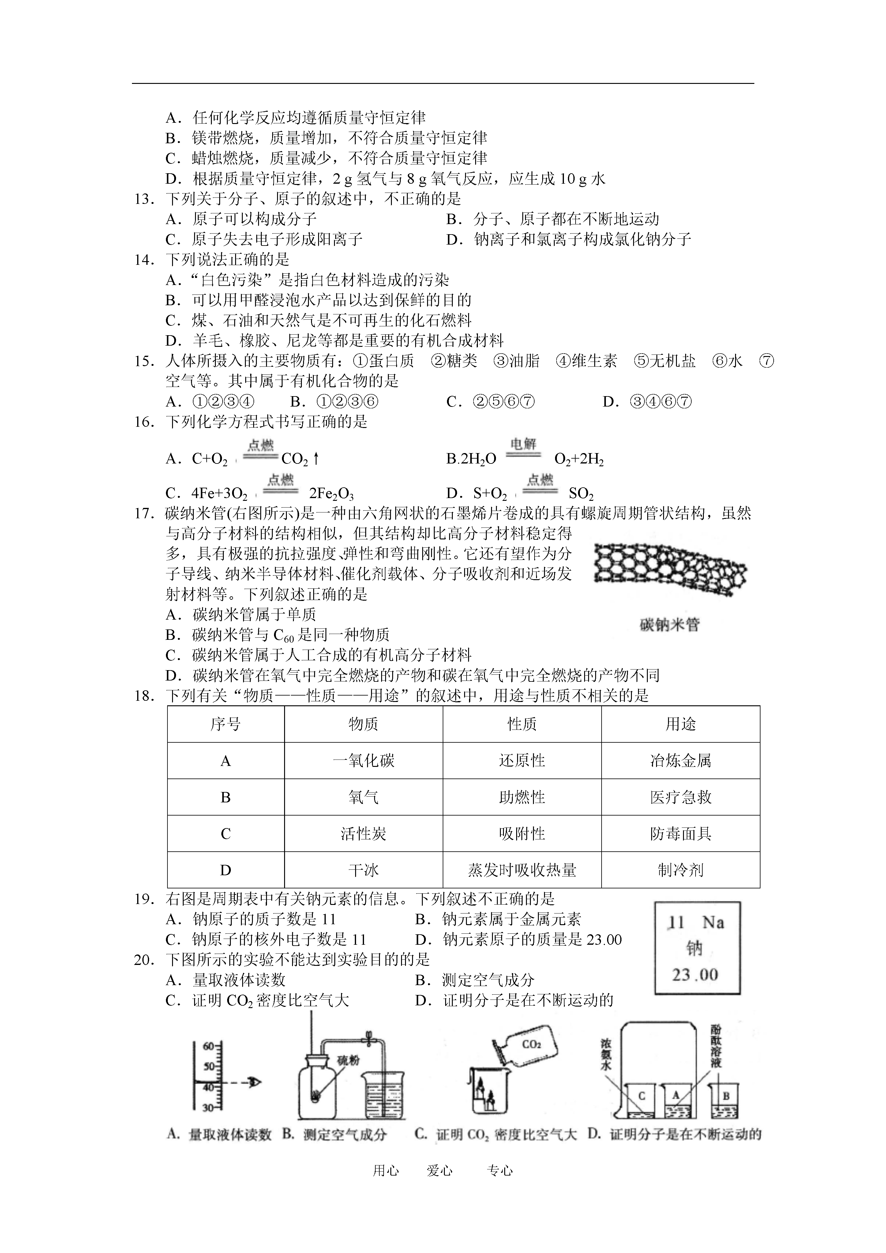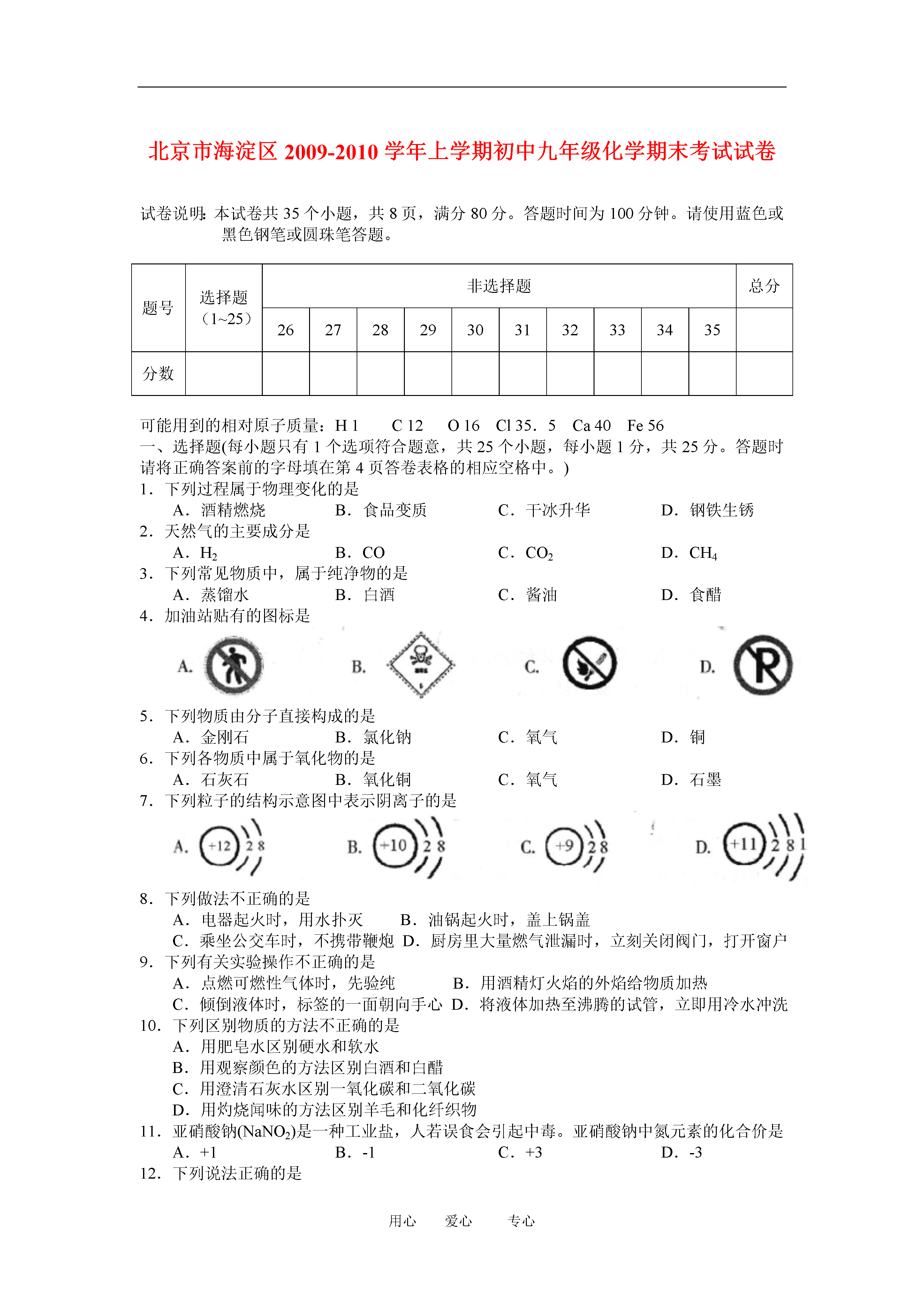 用心爱心专心北京市海淀区2009-2010学年上学期初中九年级化学期末考试试卷试卷说明:本试卷共35个小题,,满分80分。答题时间为100分钟。请使用蓝色或黑色钢笔或圆珠笔答题。题号选择题(1~25)非选择题总分26272829303132333435分数可能用到的相对原子质量:H1C12O16Cl35.5Ca40Fe56一、选择题(每小题只有1个选项符合题意,共25个小题,每小题1分,共25分。答题时请将正确答案前的字母填在答卷表格的相应空格中。)1.下列过程属于物理变化的是A.酒精燃烧B.食品变质C.干冰升华D.钢铁生锈2.天然气的主要成分是A.H2B.COC.CO2D.CH43.下列常见物质中,属于纯净物的是A.蒸馏水B.白酒C.酱油D.食醋4.加油站贴有的图标是5.下列物质由分子直接构成的是A.金刚石B.氯化钠C.氧气D.铜6.下列各物质中属于氧化物的是A.石灰石B.氧化铜C.氧气D.石墨7.下列粒子的结构示意图中表示阴离子的是8.下列做法不正确的是A.电器起火时,用水扑灭B.油锅起火时,盖上锅盖C.乘坐公交车时,不携带鞭炮D.厨房里大量燃气泄漏时,立刻关闭阀门,打开窗户9.下列有关实验操作不正确的是A.点燃可燃性气体时,先验纯B.用酒精灯火焰的外焰给物质加热C.倾倒液体时,标签的一面朝向手心D.将液体加热至沸腾的试管,立即用冷水冲洗10.下列区别物质的方法不正确的是A.用肥皂水区别硬水和软水B.用观察颜色的方法区别白酒和白醋C.用澄清石灰水区别一氧化碳和二氧化碳D.用灼烧闻味的方法区别羊毛和化纤织物11.亚硝酸钠(NaNO2)是一种工业盐,人若误食会引起中毒。亚硝酸钠中氮元素的化合价是A.+1B.-1C.+3D.-312.下列说法正确的是A.任何化学反应均遵循质量守恒定律B.镁带燃烧,质量增加,不符合质量守恒定律C.蜡烛燃烧,质量减少,不符合质量守恒定律D.根据质量守恒定律,2g氢气与8g氧气反应,应生成10g水13.下列关于分子、原子的叙述中,不正确的是A.原子可以构成分子B.分子、原子都在不断地运动C.原子失去电子形成阳离子D.钠离子和氯离子构成氯化钠分子14.下列说法正确的是A.“白色污染”是指白色材料造成的污染B.可以用甲醛浸泡水产品以达到保鲜的目的C.煤、石油和天然气是不可再生的化石燃料D.羊毛、橡胶、尼龙等都是重要的有机合成材料15.人体所摄入的主要物质有:①蛋白质②糖类③油脂④维生素⑤无机盐⑥水⑦空气等。其中属于有机化合物的是A.①②③④B.①②③⑥C.②⑤⑥⑦D.③④⑥⑦16.下列化学方程式书写正确的是A.C+O2CO2↑B.2H2OO2+2H2C.4Fe+3O22Fe2O3D.S+O2SO217.碳纳米管(右图所示)是一种由六角网状的石墨烯片卷成的具有螺旋周期管状结构,虽然与高分子材料的结构相似,但其结构却比高分子材料稳定得多,具有极强的抗拉强度、弹性和弯曲刚性。它还有望作为分子导线、纳米半导体材料、催化剂载体、分子吸收剂和近场发射材料等。下列叙述正确的是A.碳纳米管属于单质B.碳纳米管与C60是同一种物质C.碳纳米管属于人工合成的有机高分子材料D.碳纳米管在氧气中完全燃烧的产物和碳在氧气中完全燃烧的产物不同18.下列有关“物质——性质——用途”的叙述中,用途与性质不相关的是序号物质性质用途A一氧化碳还原性冶炼金属B氧气助燃性医疗急救C活性炭吸附性防毒面具D干冰蒸发时吸收热量制冷剂19.右图是周期表中有关钠元素的信息。下列叙述不正确的是A.钠原子的质子数是11B.钠元素属于金属元素C.钠原子的核外电子数是11D.钠元素原子的质量是23.0020.下图所示的实验不能达到实验目的的是A.量取液体读数B.测定空气成分C.证明CO2密度比空气大D.证明分子是在不断运动的21.“中水”是城市污水处理设施深度净化处理后的水,因为水质介于自来水(上水)与排入管道的污水(下水)之间,故名为“中水”。下列关于“中水”的说法中,不正确的是A.“中水”不能作为饮用水B.利用“中水”有利于节约水资源C.“中水”中水分子的构成与蒸馏水中水分子的构成不同D.将生活污水净化处理成“中水”的过程要用到过滤和吸附等方法22.缺钙能导致儿童发育不良或佝偻病。小明从食物中摄入钙元素不足,每天还需要服用2片某种钙片。该钙片标签的部分内容如右图(钙片中只有碳酸钙含有钙元素),小明每天从钙片中摄入钙元素的质量为A.0.30gB.0.60gC.0.75gD.1.50g23.在一定量的澄清石灰水中不断通入CO2气体,可以看到澄清石灰水先变浑浊再变澄清,加热已变澄清的石灰水,