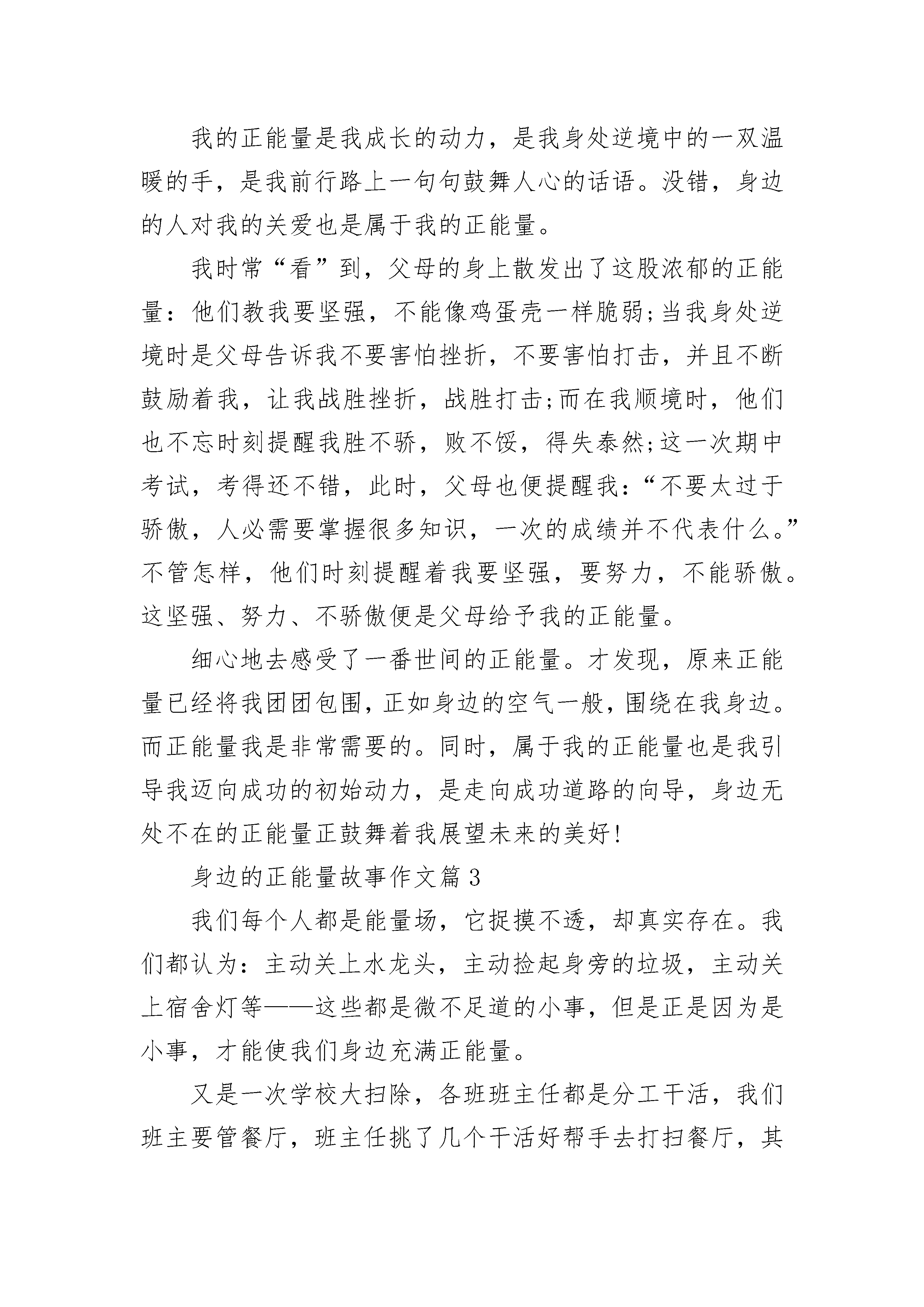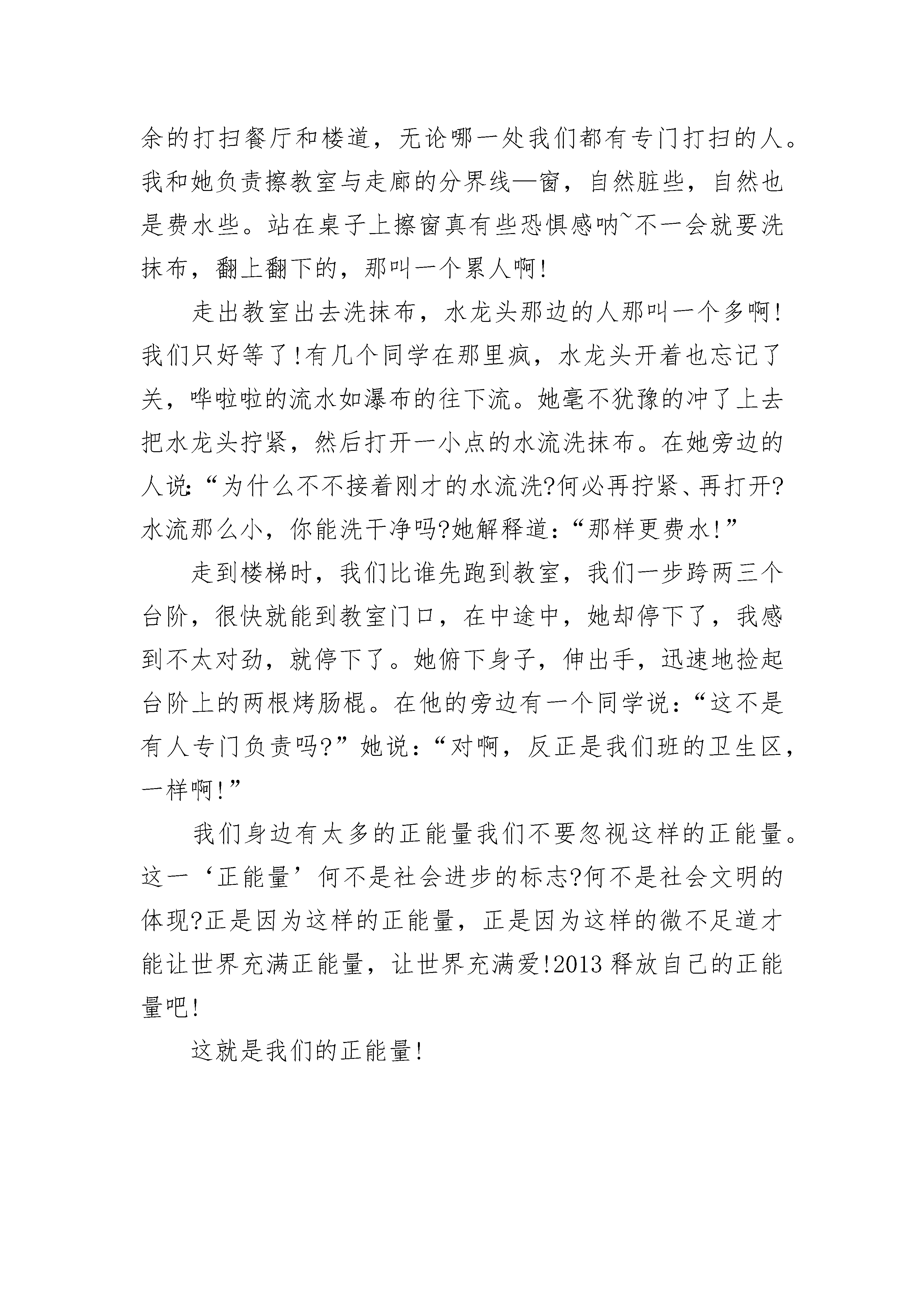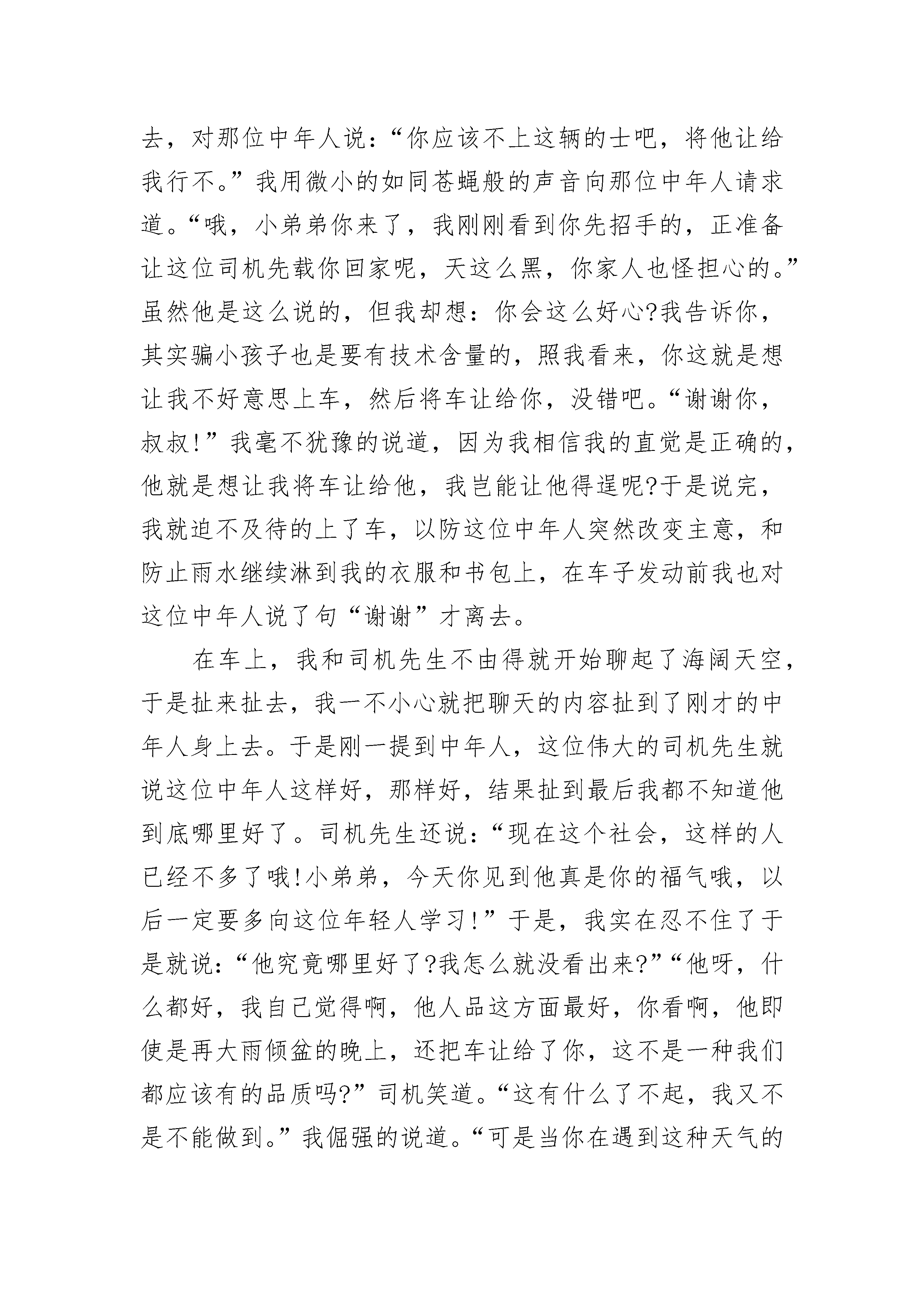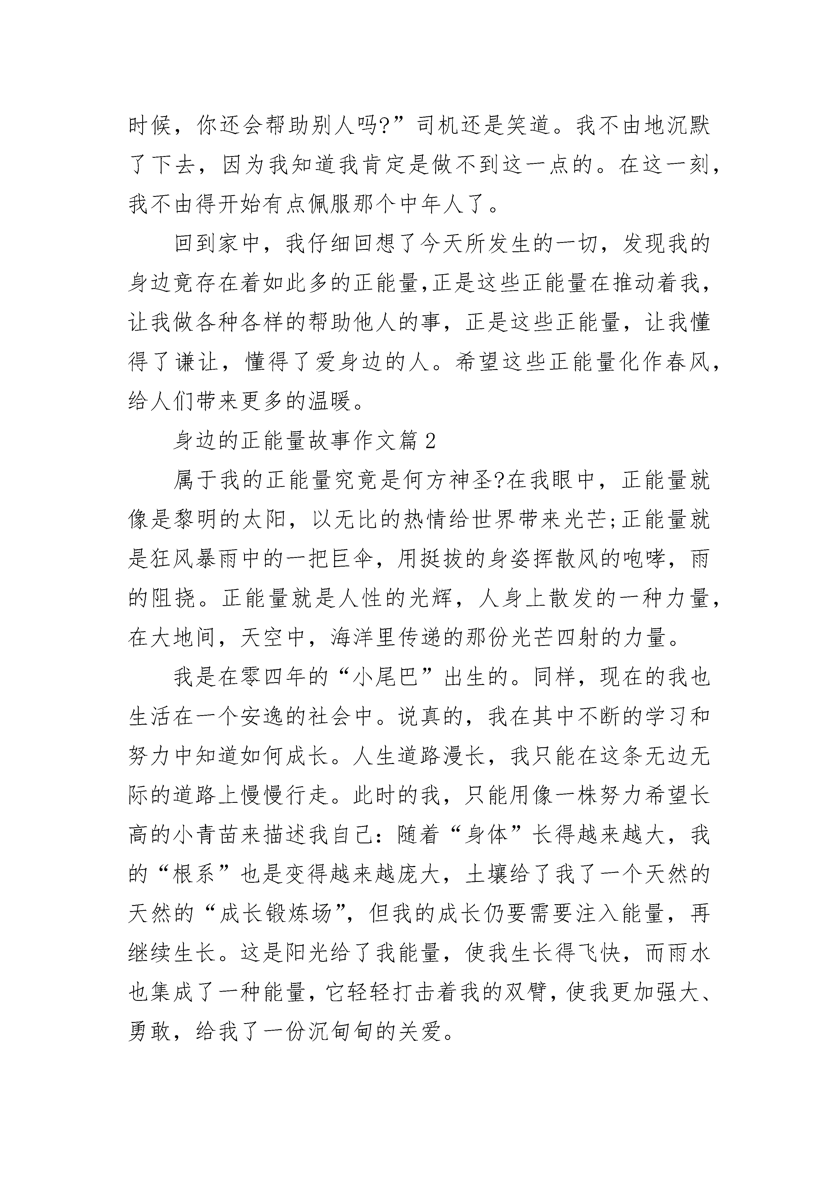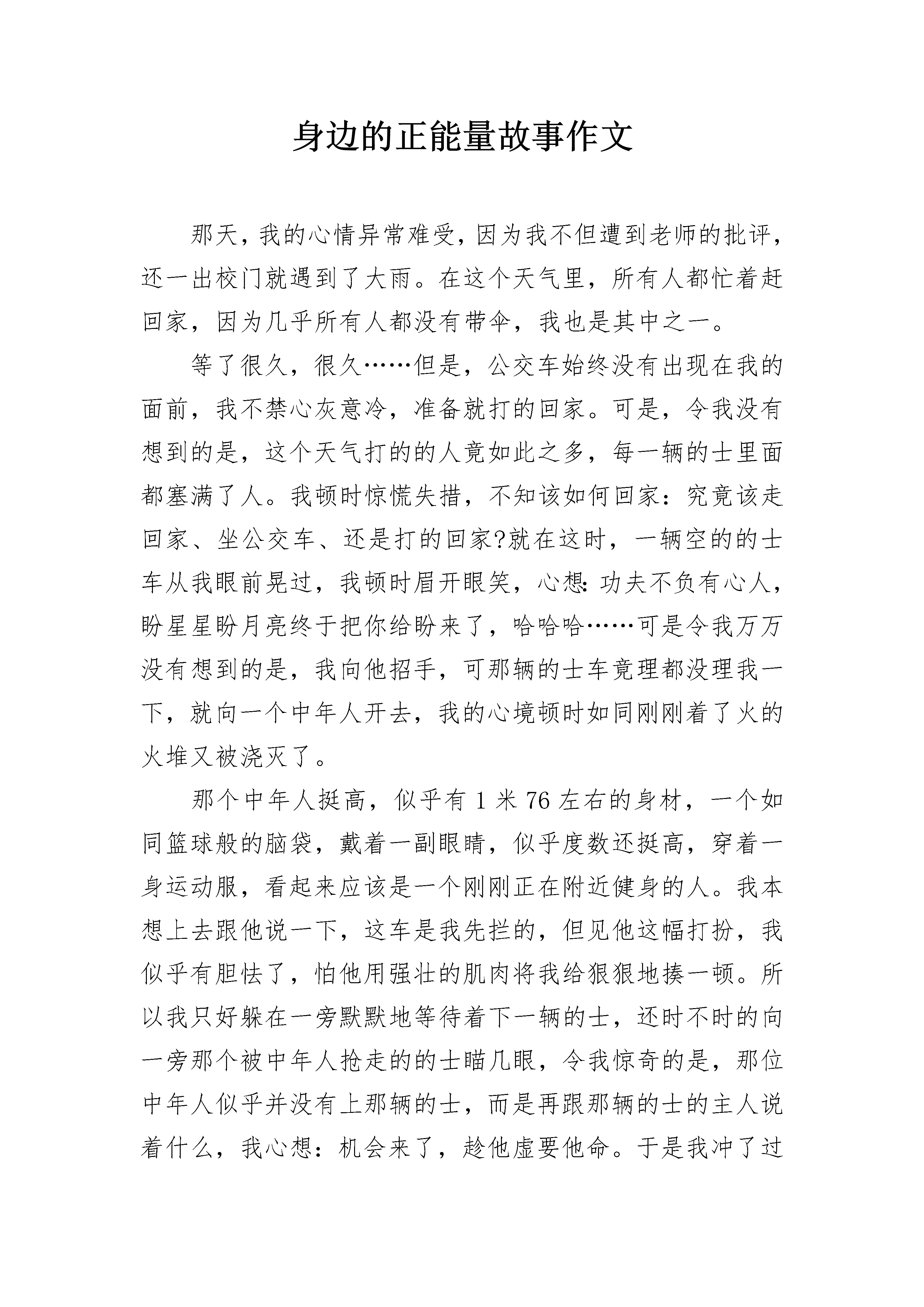 身边的正能量故事作文那天,我的心情异常难受,因为我不但遭到老师的批评,还一出校门就遇到了大雨。在这个天气里,所有人都忙着赶回家,因为几乎所有人都没有带伞,我也是其中之一。等了很久,很久……但是,公交车始终没有出现在我的面前,我不禁心灰意冷,准备就打的回家。可是,令我没有想到的是,这个天气打的的人竟如此之多,每一辆的士里面都塞满了人。我顿时惊慌失措,不知该如何回家:究竟该走回家、坐公交车、还是打的回家?就在这时,一辆空的的士车从我眼前晃过,我顿时眉开眼笑,心想:功夫不负有心人,盼星星盼月亮终于把你给盼来了,哈哈哈……可是令我万万没有想到的是,我向他招手,可那辆的士车竟理都没理我一下,就向一个中年人开去,我的心境顿时如同刚刚着了火的火堆又被浇灭了。那个中年人挺高,似乎有1米76左右的身材,一个如同篮球般的脑袋,戴着一副眼睛,似乎度数还挺高,穿着一身运动服,看起来应该是一个刚刚正在附近健身的人。我本想上去跟他说一下,这车是我先拦的,但见他这幅打扮,我似乎有胆怯了,怕他用强壮的肌肉将我给狠狠地揍一顿。所以我只好躲在一旁默默地等待着下一辆的士,还时不时的向一旁那个被中年人抢走的的士瞄几眼,令我惊奇的是,那位中年人似乎并没有上那辆的士,而是再跟那辆的士的主人说着什么,我心想:机会来了,趁他虚要他命。于是我冲了过去,对那位中年人说:“你应该不上这辆的士吧,将他让给我行不。”我用微小的如同苍蝇般的声音向那位中年人请求道。“哦,小弟弟你来了,我刚刚看到你先招手的,正准备让这位司机先载你回家呢,天这么黑,你家人也怪担心的。”虽然他是这么说的,但我却想:你会这么好心?我告诉你,其实骗小孩子也是要有技术含量的,照我看来,你这就是想让我不好意思上车,然后将车让给你,没错吧。“谢谢你,叔叔!”我毫不犹豫的说道,因为我相信我的直觉是正确的,他就是想让我将车让给他,我岂能让他得逞呢?于是说完,我就迫不及待的上了车,以防这位中年人突然改变主意,和防止雨水继续淋到我的衣服和书包上,在车子发动前我也对这位中年人说了句“谢谢”才离去。在车上,我和司机先生不由得就开始聊起了海阔天空,于是扯来扯去,我一不小心就把聊天的内容扯到了刚才的中年人身上去。于是刚一提到中年人,这位伟大的司机先生就说这位中年人这样好,那样好,结果扯到最后我都不知道他到底哪里好了。司机先生还说:“现在这个社会,这样的人已经不多了哦!小弟弟,今天你见到他真是你的福气哦,以后一定要多向这位年轻人学习!”于是,我实在忍不住了于是就说:“他究竟哪里好了?我怎么就没看出来?”“他呀,什么都好,我自己觉得啊,他人品这方面最好,你看啊,他即使是再大雨倾盆的晚上,还把车让给了你,这不是一种我们都应该有的品质吗?”司机笑道。“这有什么了不起,我又不是不能做到。”我倔强的说道。“可是当你在遇到这种天气的时候,你还会帮助别人吗?”司机还是笑道。我不由地沉默了下去,因为我知道我肯定是做不到这一点的。在这一刻,我不由得开始有点佩服那个中年人了。回到家中,我仔细回想了今天所发生的一切,发现我的身边竟存在着如此多的正能量,正是这些正能量在推动着我,让我做各种各样的帮助他人的事,正是这些正能量,让我懂得了谦让,懂得了爱身边的人。希望这些正能量化作春风,给人们带来更多的温暖。身边的正能量故事作文篇2属于我的正能量究竟是何方神圣?在我眼中,正能量就像是黎明的太阳,以无比的热情给世界带来光芒;正能量就是狂风暴雨中的一把巨伞,用挺拔的身姿挥散风的咆哮,雨的阻挠。正能量就是人性的光辉,人身上散发的一种力量,在大地间,天空中,海洋里传递的那份光芒四射的力量。我是在零四年的“小尾巴”出生的。同样,现在的我也生活在一个安逸的社会中。说真的,我在其中不断的学习和努力中知道如何成长。人生道路漫长,我只能在这条无边无际的道路上慢慢行走。此时的我,只能用像一株努力希望长高的小青苗来描述我自己:随着“身体”长得越来越大,我的“根系”也是变得越来越庞大,土壤给了我了一个天然的天然的“成长锻炼场”,但我的成长仍要需要注入能量,再继续生长。这是阳光给了我能量,使我生长得飞快,而雨水也集成了一种能量,它轻轻打击着我的双臂,使我更加强大、勇敢,给我了一份沉甸甸的关爱。我的正能量是我成长的动力,是我身处逆境中的一双温暖的手,是我前行路上一句句鼓舞人心的话语。没错,身边的人对我的关爱也是属于我的正能量。我时常“看”到,父母的身上散发出了这股浓郁的正能量:他们教我要坚强,不能像鸡蛋壳一样脆弱;当我身处逆境时是父母告诉我不要害怕挫折,不要害怕打击,并且不断鼓励着我,让我战胜挫折,战胜打击;而在我顺境时,他们也不忘时刻提醒我胜不骄,败不馁,得失泰然;这一次期中考试,考得还不错,此时,父母也便提醒我:“不要太过于骄傲,人必需要掌握很多知识,一次的成绩并不代表什么。”不管怎样