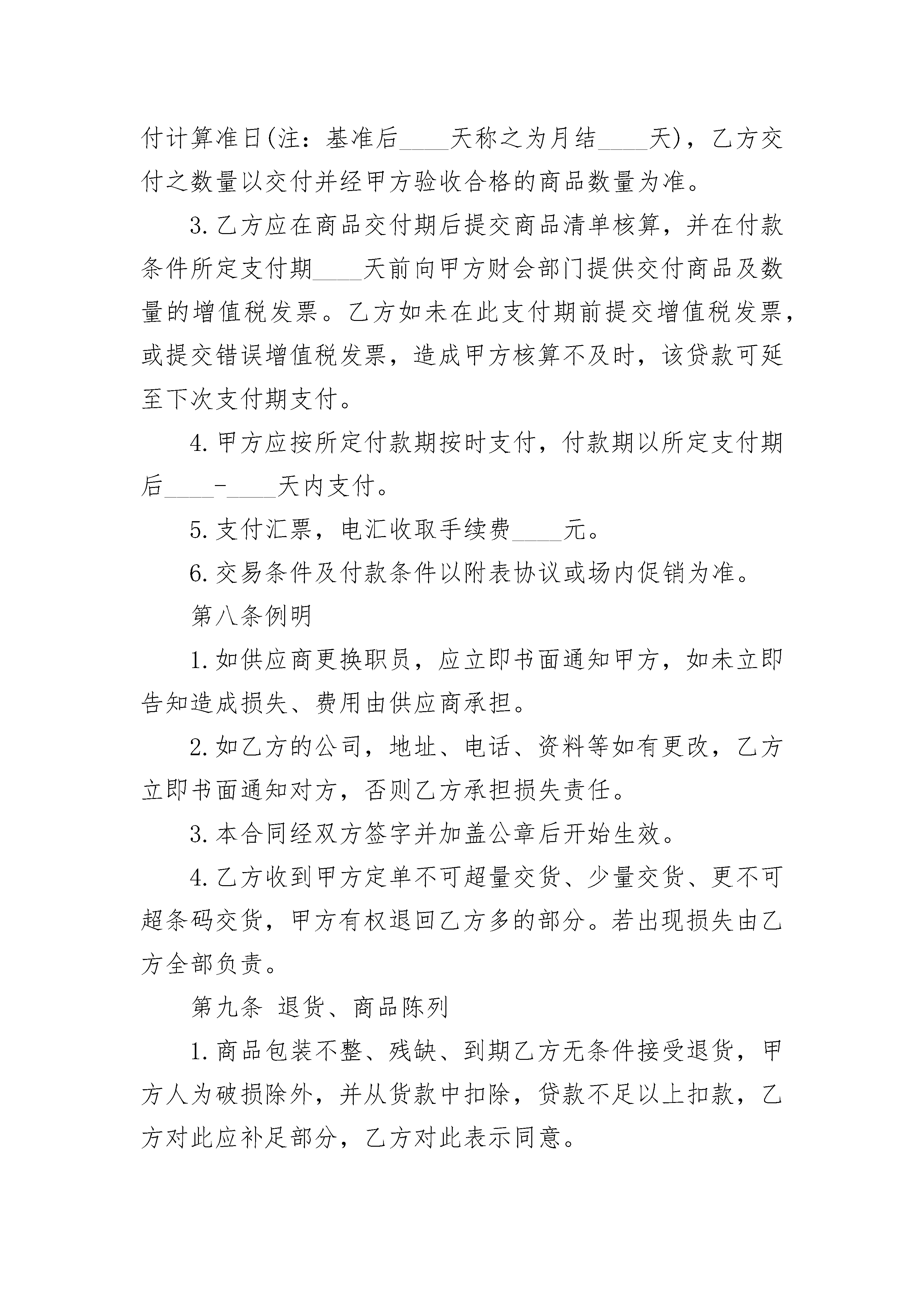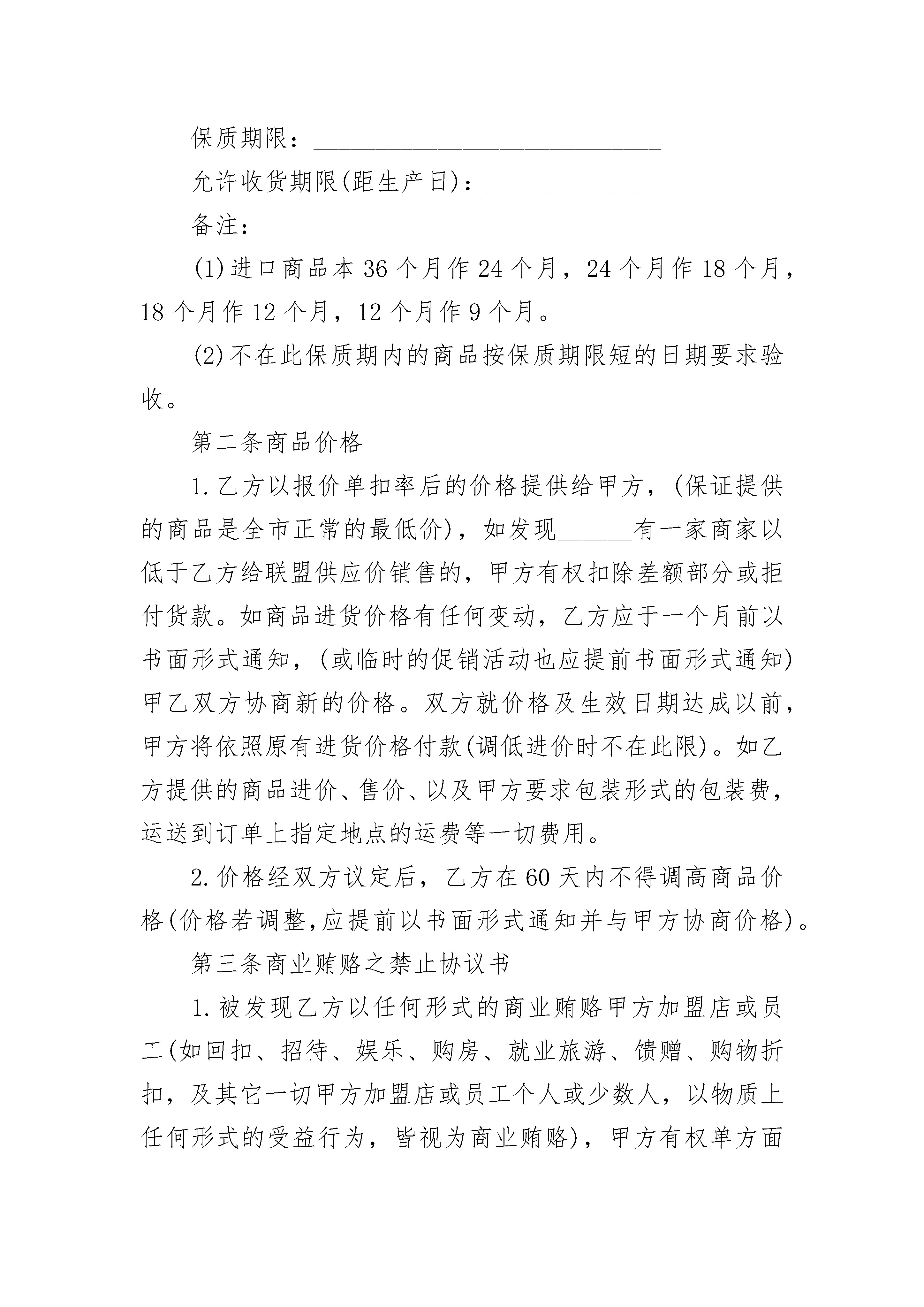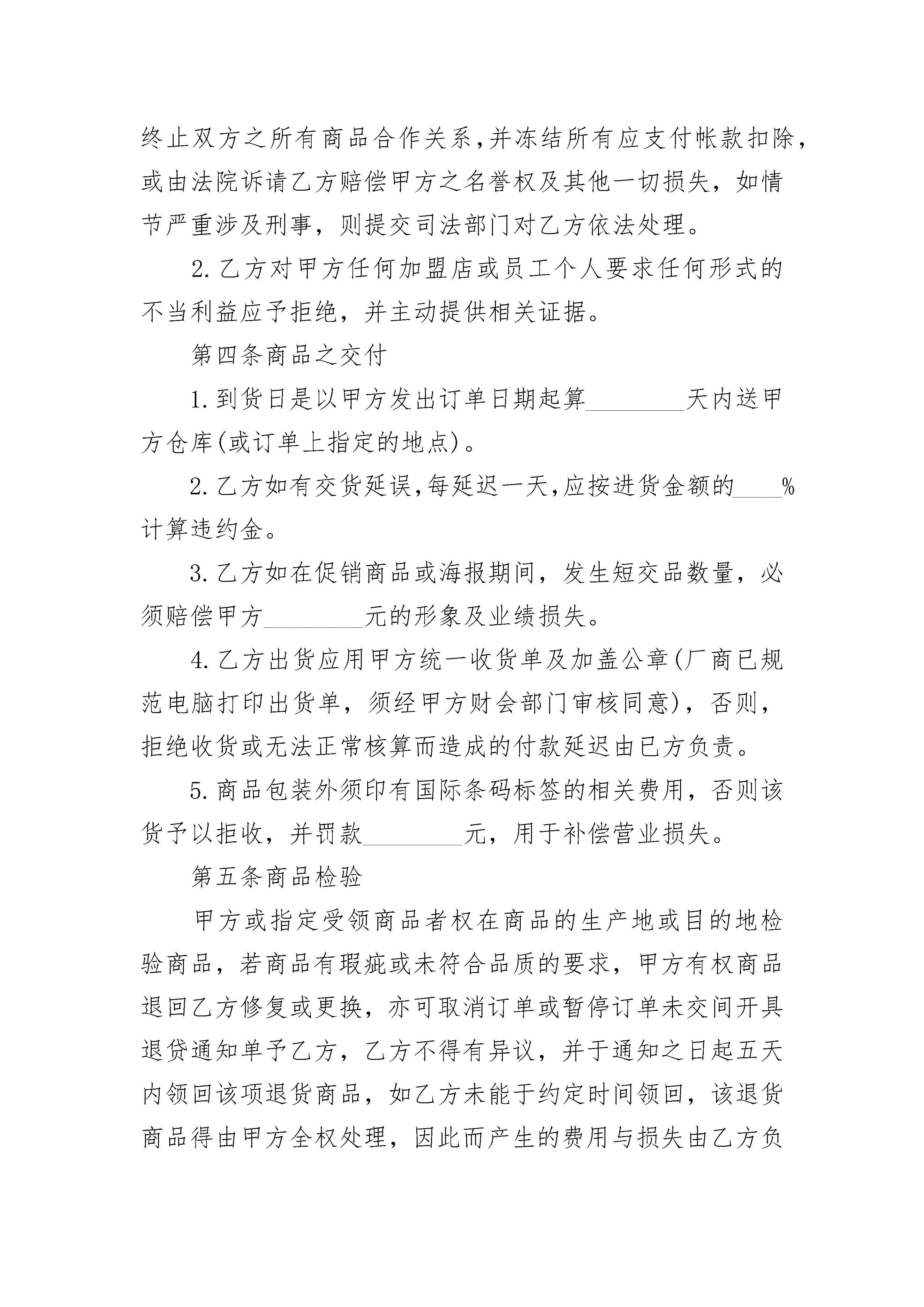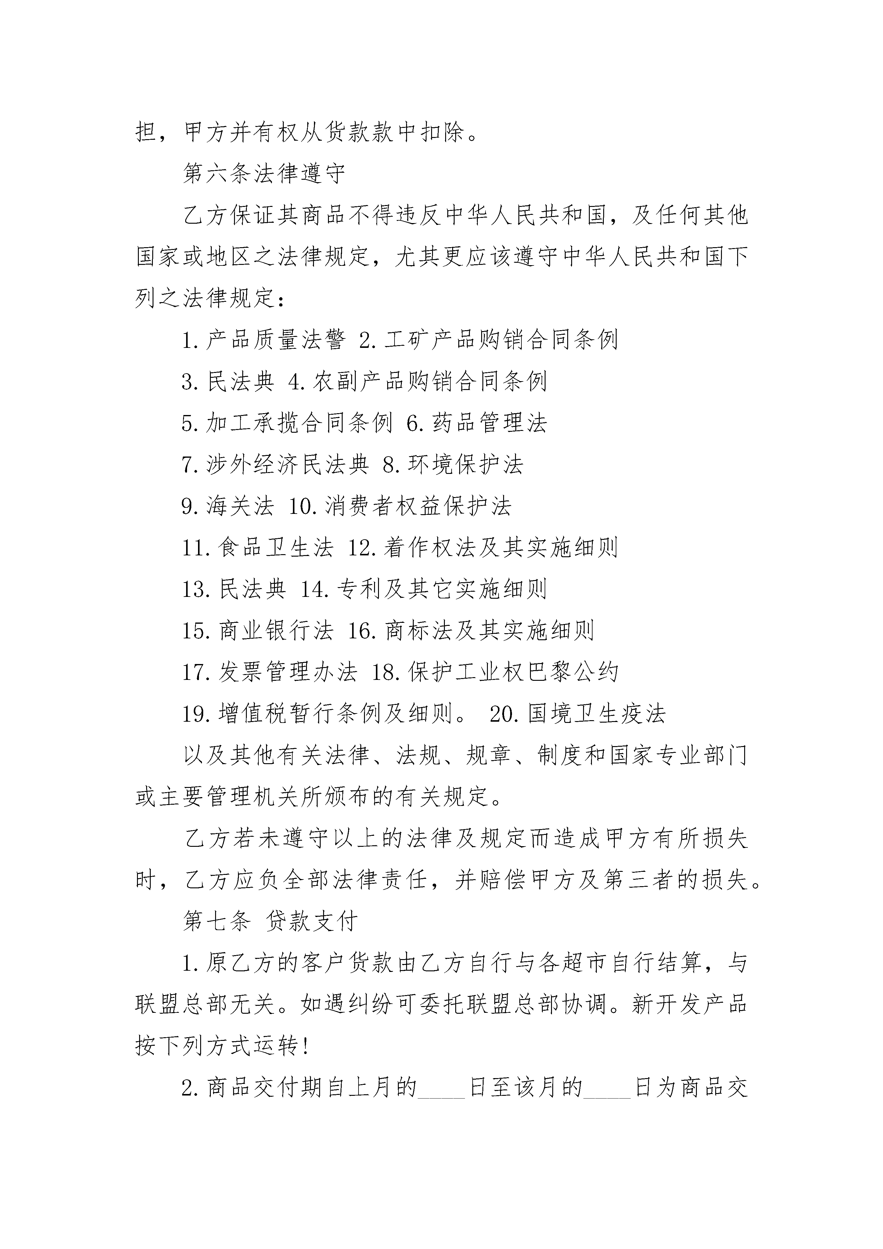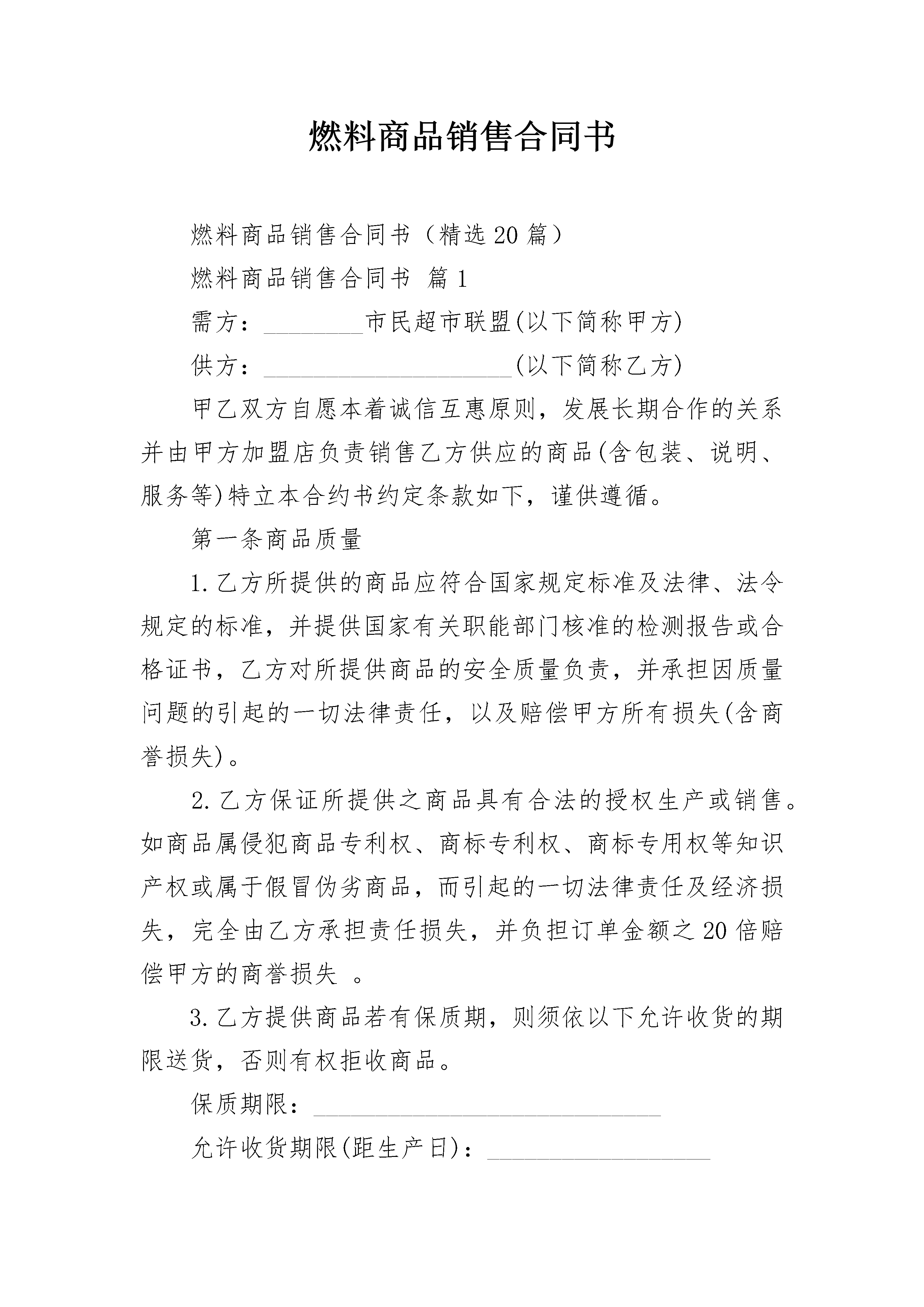 燃料商品销售合同书燃料商品销售合同书(精选20篇)燃料商品销售合同书篇1需方:________市民超市联盟(以下简称甲方)供方:____________________(以下简称乙方)甲乙双方自愿本着诚信互惠原则,发展长期合作的关系并由甲方加盟店负责销售乙方供应的商品(含包装、说明、服务等)特立本合约书约定条款如下,谨供遵循。第一条商品质量1.乙方所提供的商品应符合国家规定标准及法律、法令规定的标准,并提供国家有关职能部门核准的检测报告或合格证书,乙方对所提供商品的安全质量负责,并承担因质量问题的引起的一切法律责任,以及赔偿甲方所有损失(含商誉损失)。2.乙方保证所提供之商品具有合法的授权生产或销售。如商品属侵犯商品专利权、商标专利权、商标专用权等知识产权或属于假冒伪劣商品,而引起的一切法律责任及经济损失,完全由乙方承担责任损失,并负担订单金额之20倍赔偿甲方的商誉损失。3.乙方提供商品若有保质期,则须依以下允许收货的期限送货,否则有权拒收商品。保质期限:____________________________允许收货期限(距生产日):__________________保质期限:____________________________允许收货期限(距生产日):__________________备注:(1)进口商品本36个月作24个月,24个月作18个月,18个月作12个月,12个月作9个月。(2)不在此保质期内的商品按保质期限短的日期要求验收。第二条商品价格1.乙方以报价单扣率后的价格提供给甲方,(保证提供的商品是全市正常的最低价),如发现______有一家商家以低于乙方给联盟供应价销售的,甲方有权扣除差额部分或拒付货款。如商品进货价格有任何变动,乙方应于一个月前以书面形式通知,(或临时的促销活动也应提前书面形式通知)甲乙双方协商新的价格。双方就价格及生效日期达成以前,甲方将依照原有进货价格付款(调低进价时不在此限)。如乙方提供的商品进价、售价、以及甲方要求包装形式的包装费,运送到订单上指定地点的运费等一切费用。2.价格经双方议定后,乙方在60天内不得调高商品价格(价格若调整,应提前以书面形式通知并与甲方协商价格)。第三条商业贿赂之禁止协议书1.被发现乙方以任何形式的商业贿赂甲方加盟店或员工(如回扣、招待、娱乐、购房、就业旅游、馈赠、购物折扣,及其它一切甲方加盟店或员工个人或少数人,以物质上任何形式的受益行为,皆视为商业贿赂),甲方有权单方面终止双方之所有商品合作关系,并冻结所有应支付帐款扣除,或由法院诉请乙方赔偿甲方之名誉权及其他一切损失,如情节严重涉及刑事,则提交司法部门对乙方依法处理。2.乙方对甲方任何加盟店或员工个人要求任何形式的不当利益应予拒绝,并主动提供相关证据。第四条商品之交付1.到货日是以甲方发出订单日期起算________天内送甲方仓库(或订单上指定的地点)。2.乙方如有交货延误,每延迟一天,应按进货金额的____%计算违约金。3.乙方如在促销商品或海报期间,发生短交品数量,必须赔偿甲方________元的形象及业绩损失。4.乙方出货应用甲方统一收货单及加盖公章(厂商已规范电脑打印出货单,须经甲方财会部门审核同意),否则,拒绝收货或无法正常核算而造成的付款延迟由已方负责。5.商品包装外须印有国际条码标签的相关费用,否则该货予以拒收,并罚款________元,用于补偿营业损失。第五条商品检验甲方或指定受领商品者权在商品的生产地或目的地检验商品,若商品有瑕疵或未符合品质的要求,甲方有权商品退回乙方修复或更换,亦可取消订单或暂停订单未交间开具退贷通知单予乙方,乙方不得有异议,并于通知之日起五天内领回该项退货商品,如乙方未能于约定时间领回,该退货商品得由甲方全权处理,因此而产生的费用与损失由乙方负担,甲方并有权从货款款中扣除。第六条法律遵守乙方保证其商品不得违反中华人民共和国,及任何其他国家或地区之法律规定,尤其更应该遵守中华人民共和国下列之法律规定:1.产品质量法警2.工矿产品购销合同条例3.民法典4.农副产品购销合同条例5.加工承揽合同条例6.药品管理法7.涉外经济民法典8.环境保护法9.海关法10.消费者权益保护法11.食品卫生法12.着作权法及其实施细则13.民法典14.专利及其它实施细则15.商业银行法16.商标法及其实施细则17.发票管理办法18.保护工业权巴黎公约19.增值税暂行条例及细则。20.国境卫生疫法以及其他有关法律、法规、规章、制度和国家专业部门或主要管理机关所颁布的有关规定。乙方若未遵守以上的法律及规定而造成甲方有所损失时,乙方应负全部法律责任,并赔偿甲方及第三者的损失。第七条贷款支付1.原乙方的客户货款由乙方自行与各超市自行结算,与联盟总部无关。如遇纠纷可委托联盟总部协调。新开发产
