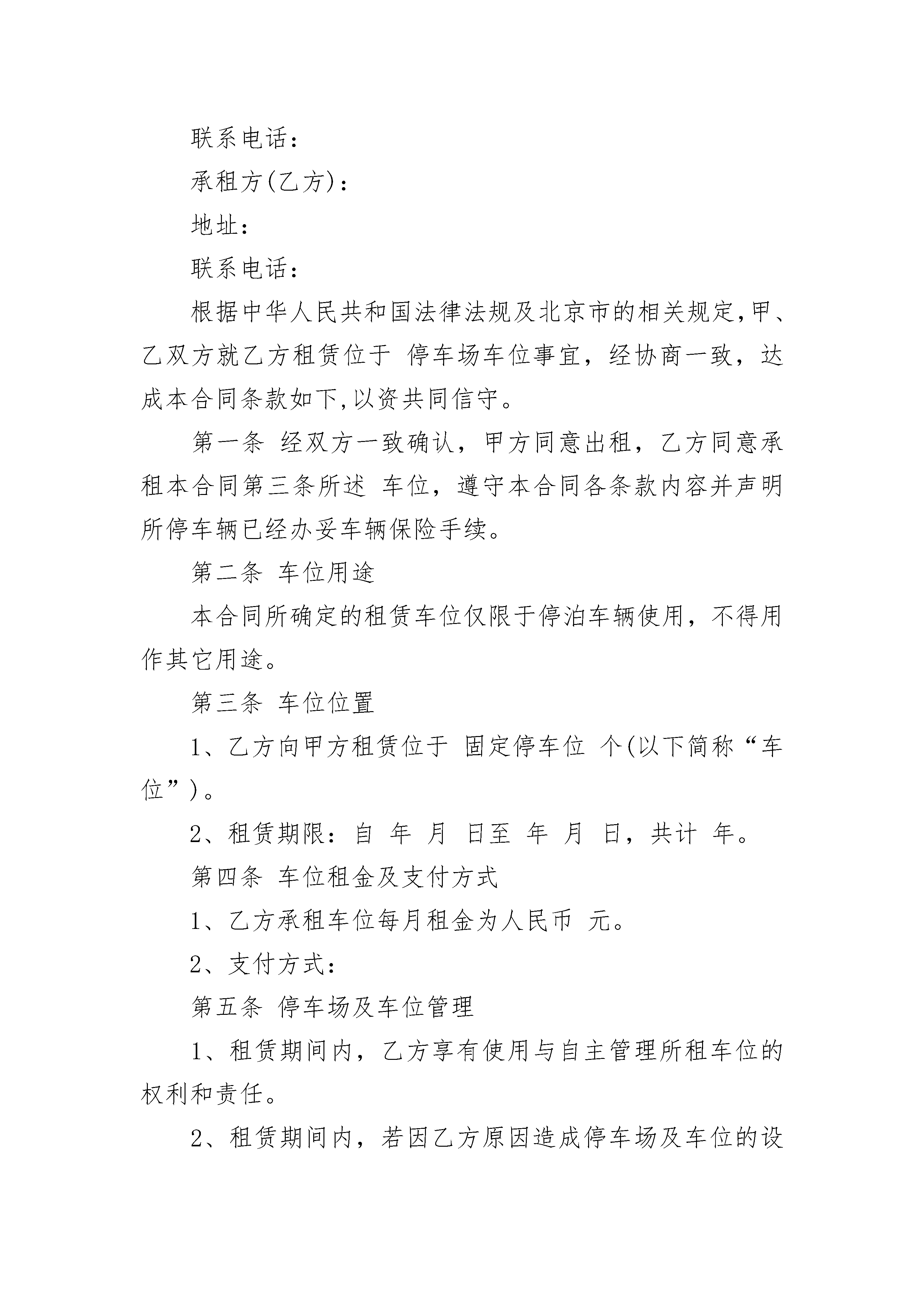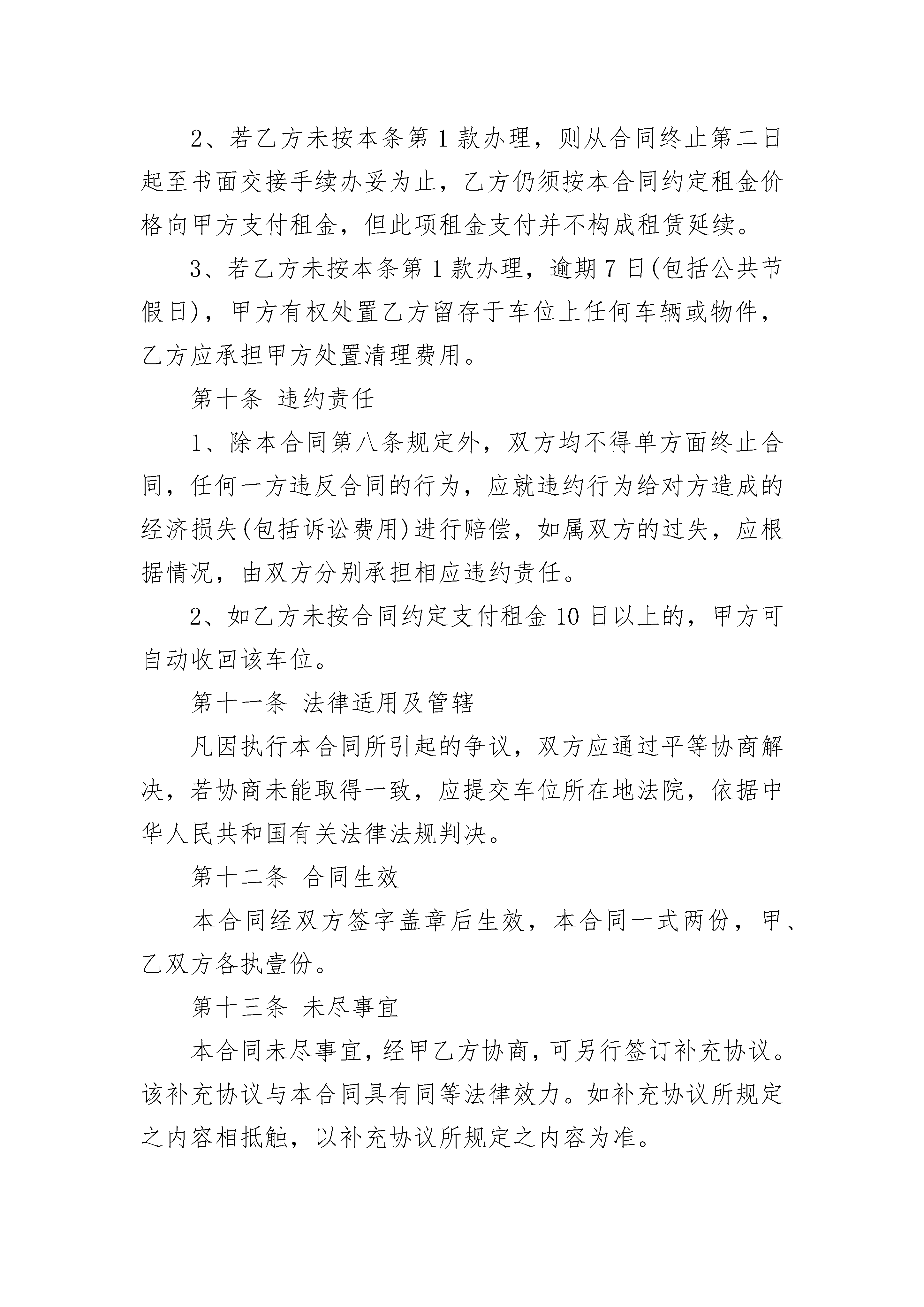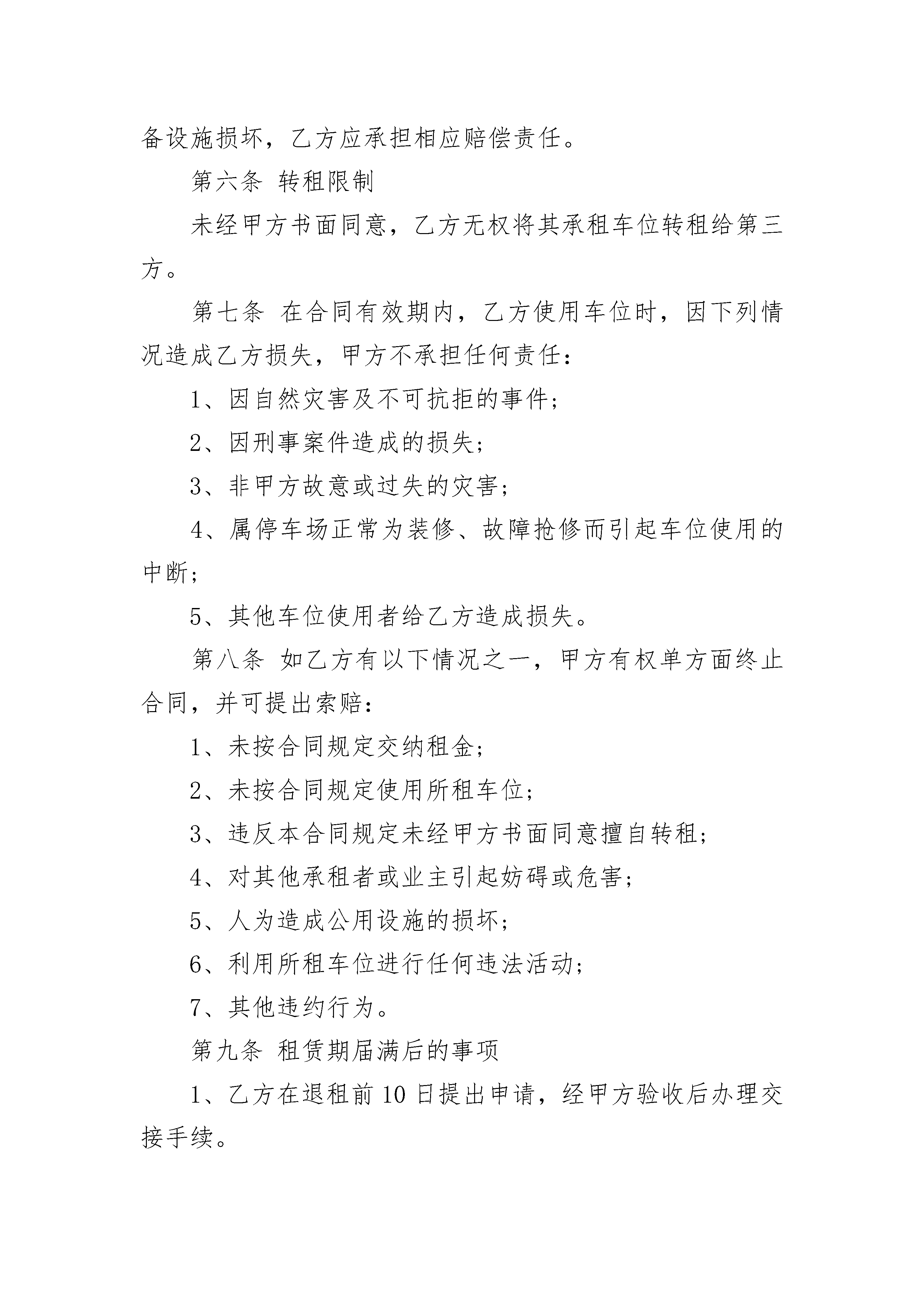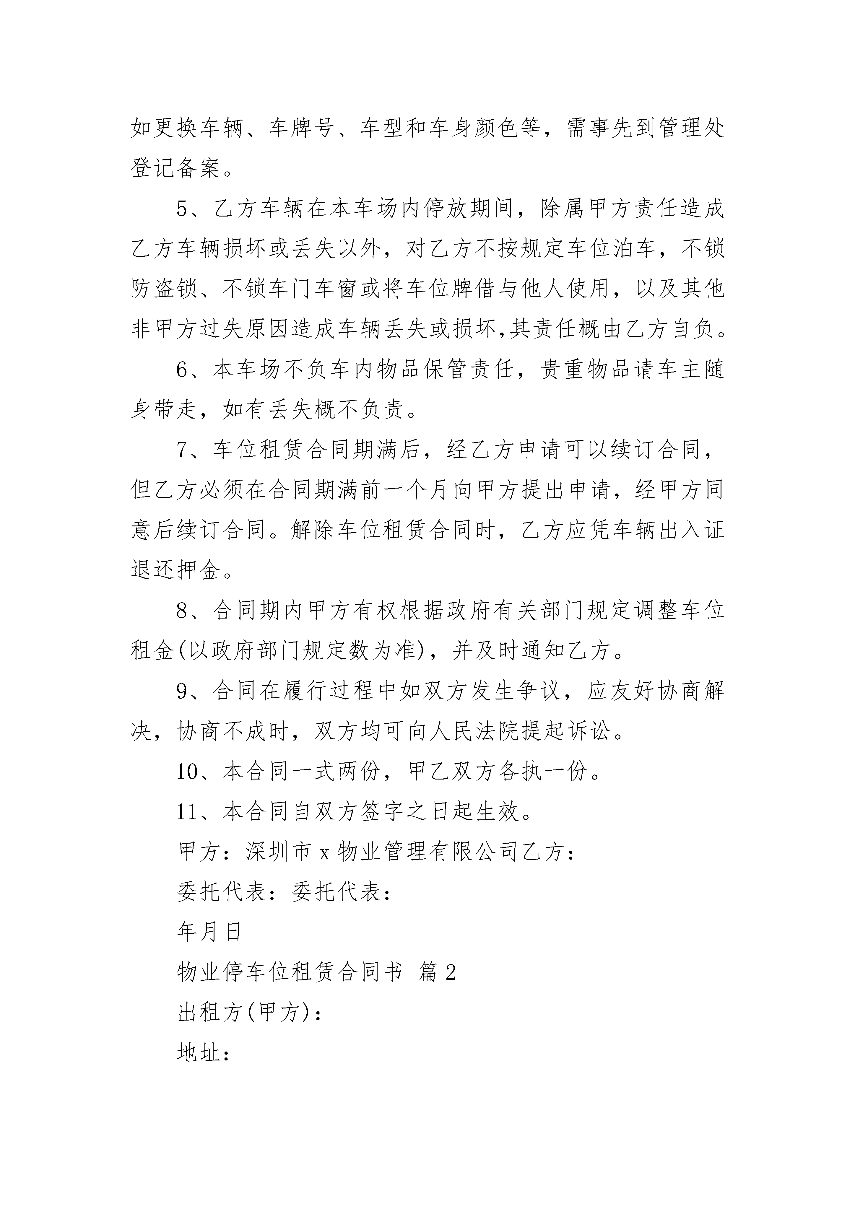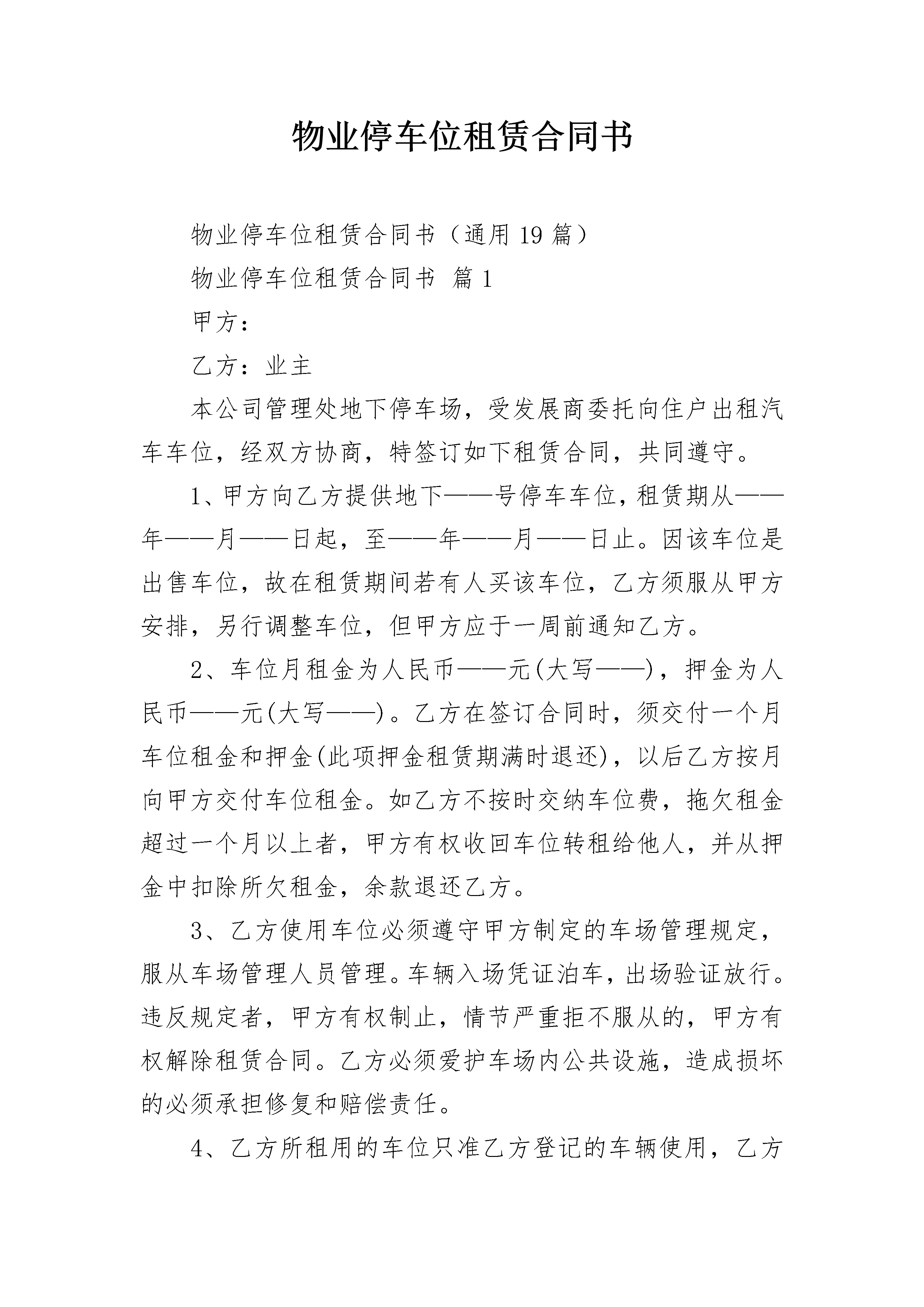 物业停车位租赁合同书物业停车位租赁合同书(通用19篇)物业停车位租赁合同书篇1甲方:乙方:业主本公司管理处地下停车场,受发展商委托向住户出租汽车车位,经双方协商,特签订如下租赁合同,共同遵守。1、甲方向乙方提供地下——号停车车位,租赁期从——年——月——日起,至——年——月——日止。因该车位是出售车位,故在租赁期间若有人买该车位,乙方须服从甲方安排,另行调整车位,但甲方应于一周前通知乙方。2、车位月租金为人民币——元(大写——),押金为人民币——元(大写——)。乙方在签订合同时,须交付一个月车位租金和押金(此项押金租赁期满时退还),以后乙方按月向甲方交付车位租金。如乙方不按时交纳车位费,拖欠租金超过一个月以上者,甲方有权收回车位转租给他人,并从押金中扣除所欠租金,余款退还乙方。3、乙方使用车位必须遵守甲方制定的车场管理规定,服从车场管理人员管理。车辆入场凭证泊车,出场验证放行。违反规定者,甲方有权制止,情节严重拒不服从的,甲方有权解除租赁合同。乙方必须爱护车场内公共设施,造成损坏的必须承担修复和赔偿责任。4、乙方所租用的车位只准乙方登记的车辆使用,乙方如更换车辆、车牌号、车型和车身颜色等,需事先到管理处登记备案。5、乙方车辆在本车场内停放期间,除属甲方责任造成乙方车辆损坏或丢失以外,对乙方不按规定车位泊车,不锁防盗锁、不锁车门车窗或将车位牌借与他人使用,以及其他非甲方过失原因造成车辆丢失或损坏,其责任概由乙方自负。6、本车场不负车内物品保管责任,贵重物品请车主随身带走,如有丢失概不负责。7、车位租赁合同期满后,经乙方申请可以续订合同,但乙方必须在合同期满前一个月向甲方提出申请,经甲方同意后续订合同。解除车位租赁合同时,乙方应凭车辆出入证退还押金。8、合同期内甲方有权根据政府有关部门规定调整车位租金(以政府部门规定数为准),并及时通知乙方。9、合同在履行过程中如双方发生争议,应友好协商解决,协商不成时,双方均可向人民法院提起诉讼。10、本合同一式两份,甲乙双方各执一份。11、本合同自双方签字之日起生效。甲方:深圳市x物业管理有限公司乙方:委托代表:委托代表:年月日物业停车位租赁合同书篇2出租方(甲方):地址:联系电话:承租方(乙方):地址:联系电话:根据中华人民共和国法律法规及北京市的相关规定,甲、乙双方就乙方租赁位于停车场车位事宜,经协商一致,达成本合同条款如下,以资共同信守。第一条经双方一致确认,甲方同意出租,乙方同意承租本合同第三条所述车位,遵守本合同各条款内容并声明所停车辆已经办妥车辆保险手续。第二条车位用途本合同所确定的租赁车位仅限于停泊车辆使用,不得用作其它用途。第三条车位位置1、乙方向甲方租赁位于固定停车位个(以下简称“车位”)。2、租赁期限:自年月日至年月日,共计年。第四条车位租金及支付方式1、乙方承租车位每月租金为人民币元。2、支付方式:第五条停车场及车位管理1、租赁期间内,乙方享有使用与自主管理所租车位的权利和责任。2、租赁期间内,若因乙方原因造成停车场及车位的设备设施损坏,乙方应承担相应赔偿责任。第六条转租限制未经甲方书面同意,乙方无权将其承租车位转租给第三方。第七条在合同有效期内,乙方使用车位时,因下列情况造成乙方损失,甲方不承担任何责任:1、因自然灾害及不可抗拒的事件;2、因刑事案件造成的损失;3、非甲方故意或过失的灾害;4、属停车场正常为装修、故障抢修而引起车位使用的中断;5、其他车位使用者给乙方造成损失。第八条如乙方有以下情况之一,甲方有权单方面终止合同,并可提出索赔:1、未按合同规定交纳租金;2、未按合同规定使用所租车位;3、违反本合同规定未经甲方书面同意擅自转租;4、对其他承租者或业主引起妨碍或危害;5、人为造成公用设施的损坏;6、利用所租车位进行任何违法活动;7、其他违约行为。第九条租赁期届满后的事项1、乙方在退租前10日提出申请,经甲方验收后办理交接手续。2、若乙方未按本条第1款办理,则从合同终止第二日起至书面交接手续办妥为止,乙方仍须按本合同约定租金价格向甲方支付租金,但此项租金支付并不构成租赁延续。3、若乙方未按本条第1款办理,逾期7日(包括公共节假日),甲方有权处置乙方留存于车位上任何车辆或物件,乙方应承担甲方处置清理费用。第十条违约责任1、除本合同第八条规定外,双方均不得单方面终止合同,任何一方违反合同的行为,应就违约行为给对方造成的经济损失(包括诉讼费用)进行赔偿,如属双方的过失,应根据情况,由双方分别承担相应违约责任。2、如乙方未按合同约定支付租金10日以上的,甲方可自动收回该车位。第十一条法律适用及管辖凡因执行本合同所引起的争议,双方应通过平等协商解决,若协商未能取得一致,应提交车位所在地法院,依据中华人民共和国有关法律法规判决。第十二条合同生效本合同经双方签字盖章后生效,