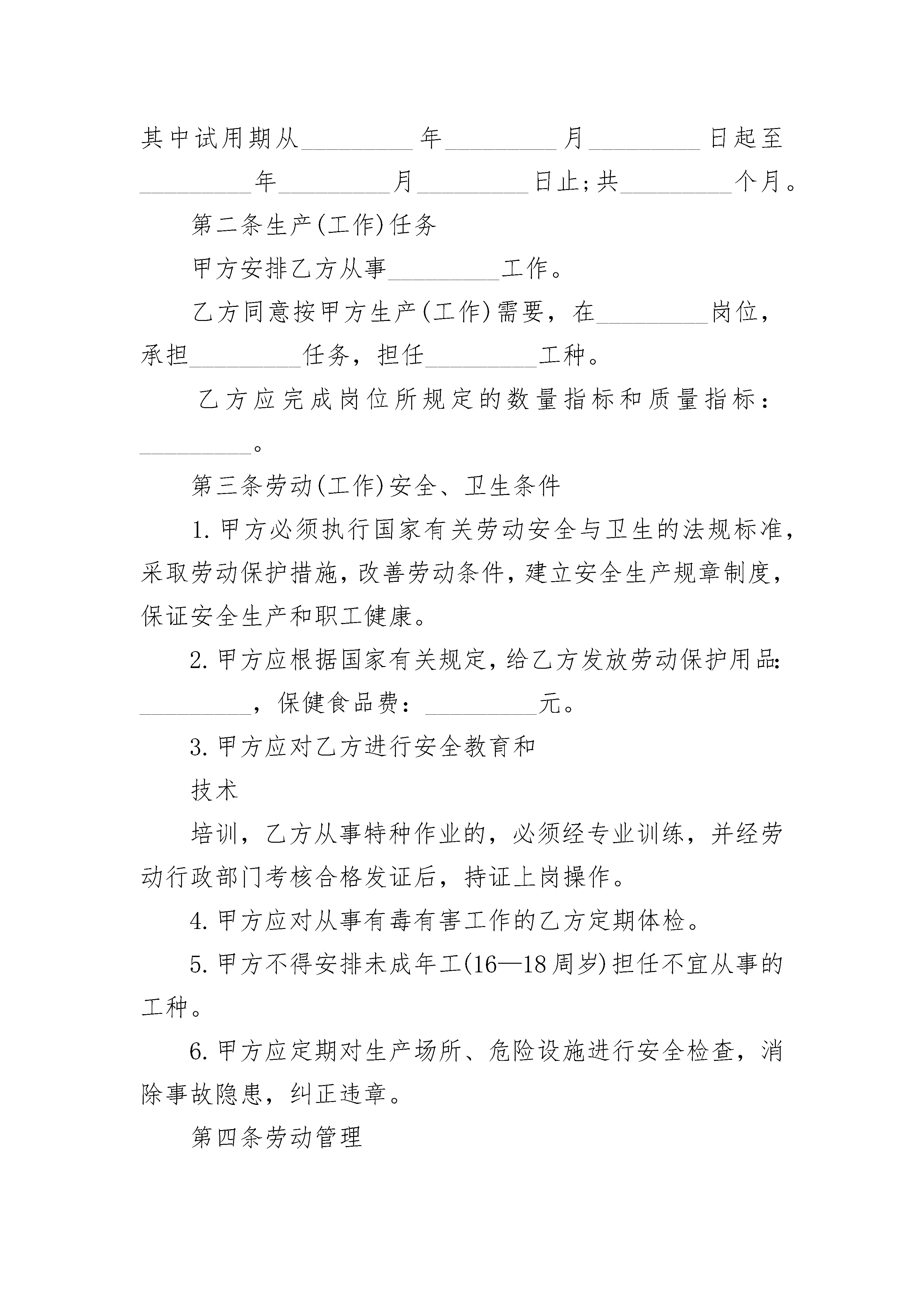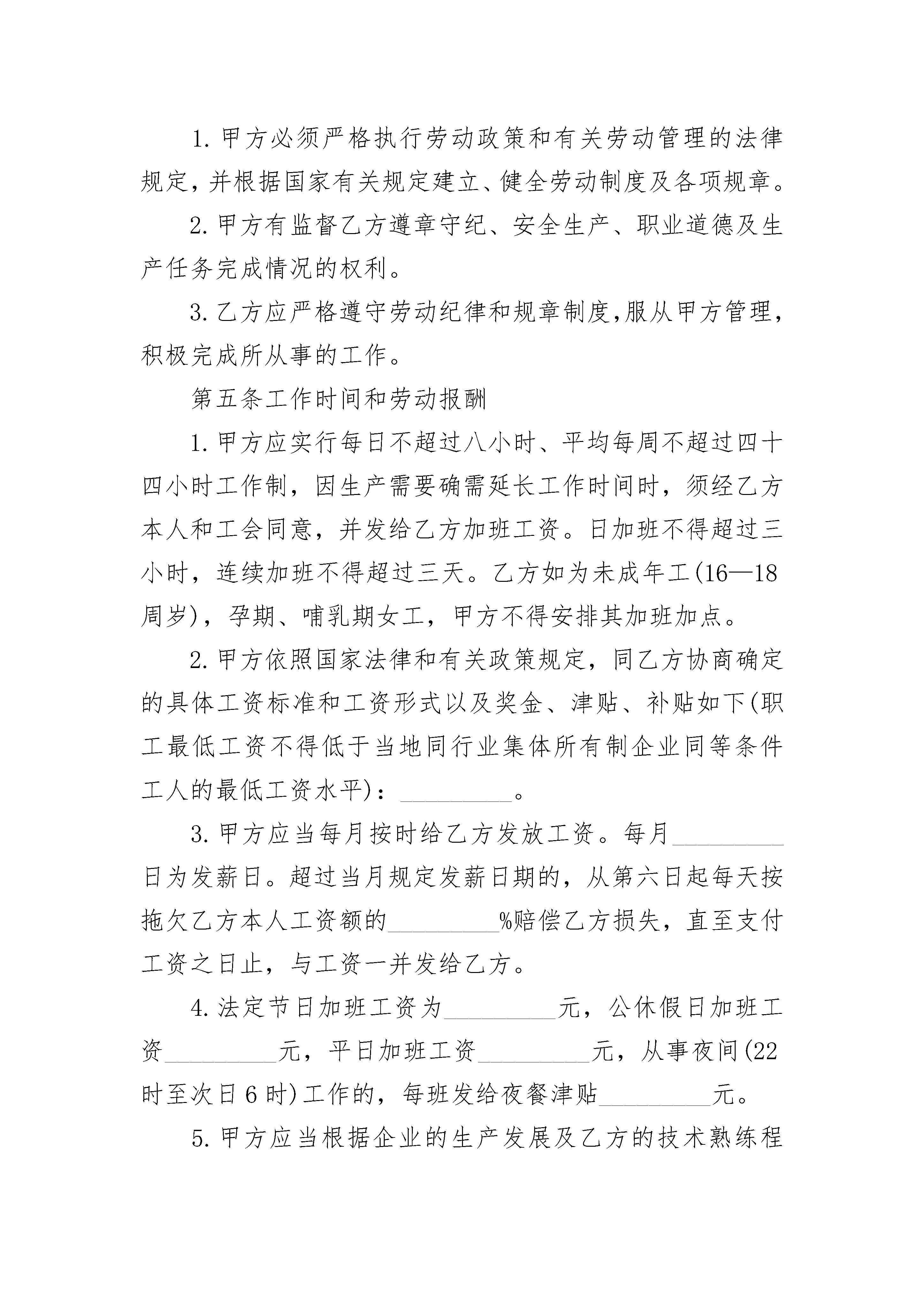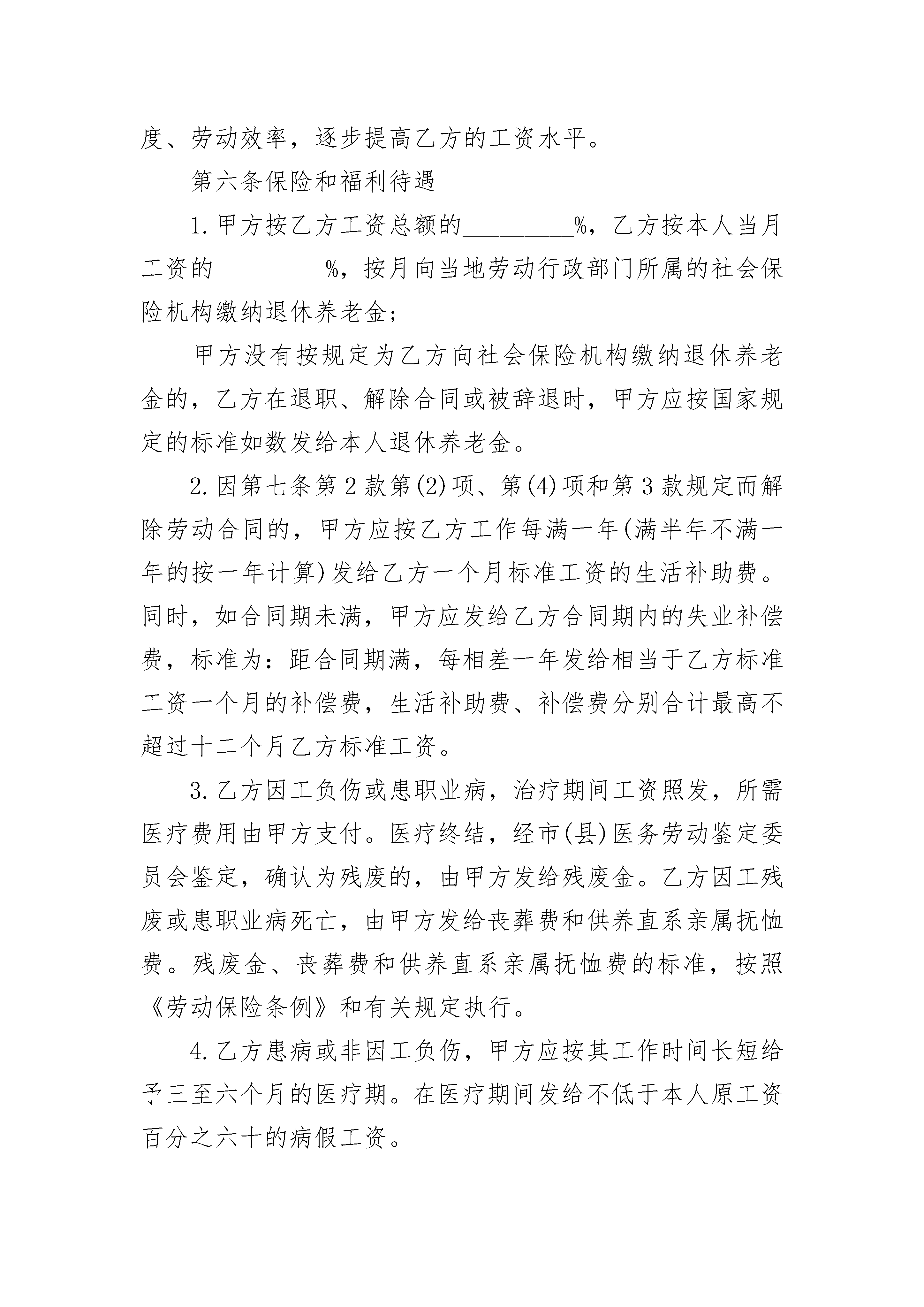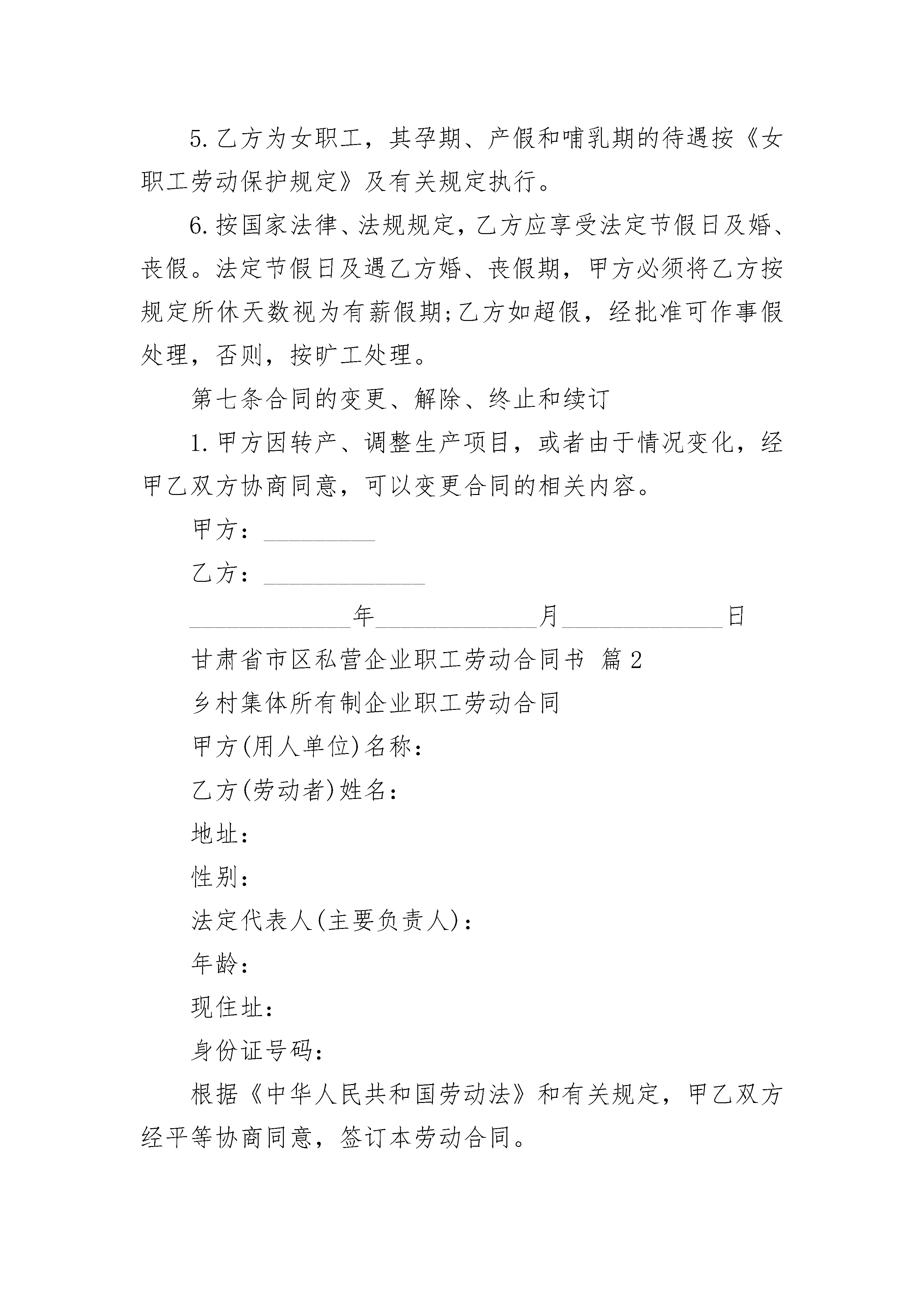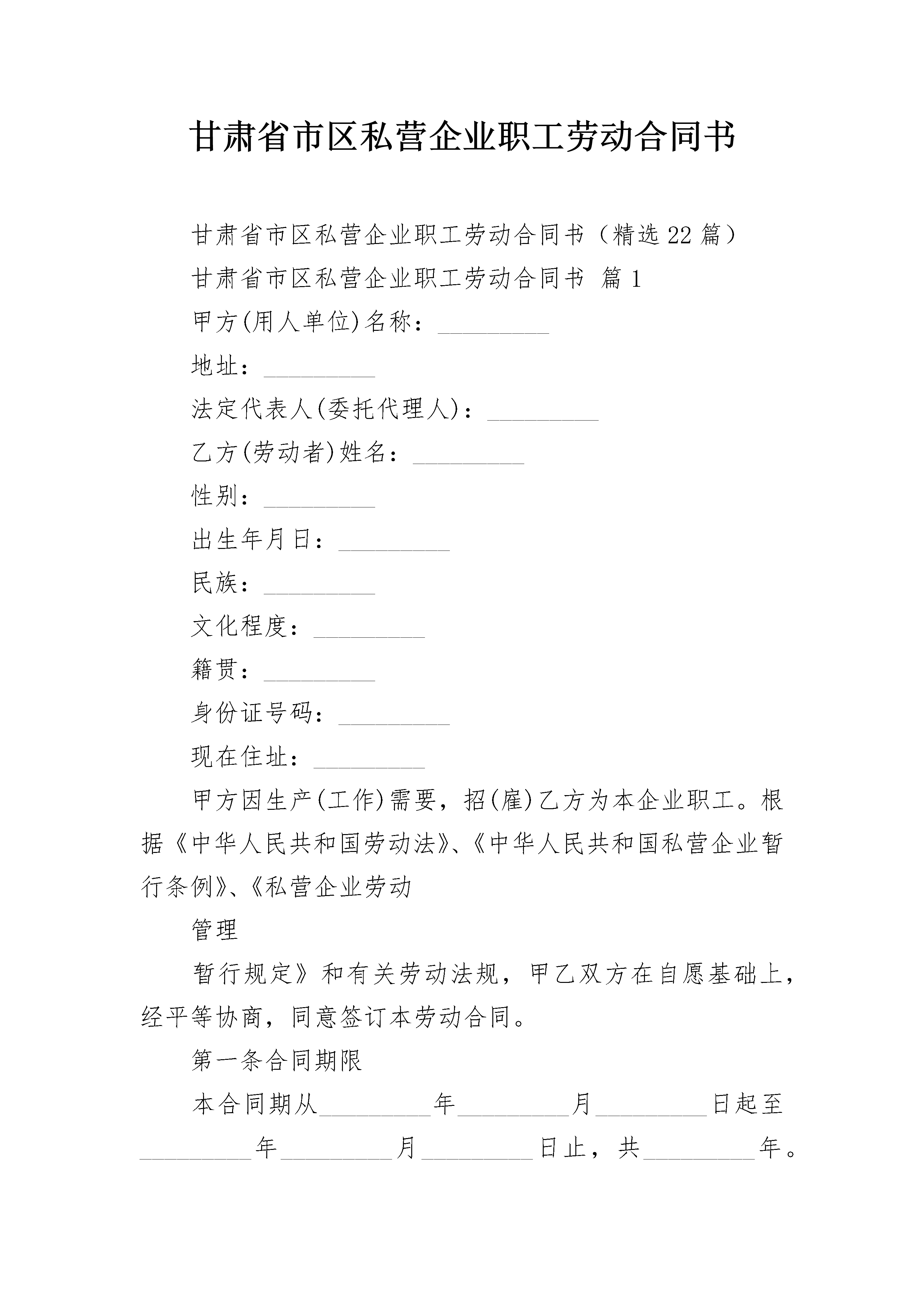 甘肃省市区私营企业职工劳动合同书甘肃省市区私营企业职工劳动合同书(精选22篇)甘肃省市区私营企业职工劳动合同书篇1甲方(用人单位)名称:_________地址:_________法定代表人(委托代理人):_________乙方(劳动者)姓名:_________性别:_________出生年月日:_________民族:_________文化程度:_________籍贯:_________身份证号码:_________现在住址:_________甲方因生产(工作)需要,招(雇)乙方为本企业职工。根据《中华人民共和国劳动法》、《中华人民共和国私营企业暂行条例》、《私营企业劳动管理暂行规定》和有关劳动法规,甲乙双方在自愿基础上,经平等协商,同意签订本劳动合同。第一条合同期限本合同期从_________年_________月_________日起至_________年_________月_________日止,共_________年。其中试用期从_________年_________月_________日起至_________年_________月_________日止;共_________个月。第二条生产(工作)任务甲方安排乙方从事_________工作。乙方同意按甲方生产(工作)需要,在_________岗位,承担_________任务,担任_________工种。乙方应完成岗位所规定的数量指标和质量指标:_________。第三条劳动(工作)安全、卫生条件1.甲方必须执行国家有关劳动安全与卫生的法规标准,采取劳动保护措施,改善劳动条件,建立安全生产规章制度,保证安全生产和职工健康。2.甲方应根据国家有关规定,给乙方发放劳动保护用品:_________,保健食品费:_________元。3.甲方应对乙方进行安全教育和技术培训,乙方从事特种作业的,必须经专业训练,并经劳动行政部门考核合格发证后,持证上岗操作。4.甲方应对从事有毒有害工作的乙方定期体检。5.甲方不得安排未成年工(16—18周岁)担任不宜从事的工种。6.甲方应定期对生产场所、危险设施进行安全检查,消除事故隐患,纠正违章。第四条劳动管理1.甲方必须严格执行劳动政策和有关劳动管理的法律规定,并根据国家有关规定建立、健全劳动制度及各项规章。2.甲方有监督乙方遵章守纪、安全生产、职业道德及生产任务完成情况的权利。3.乙方应严格遵守劳动纪律和规章制度,服从甲方管理,积极完成所从事的工作。第五条工作时间和劳动报酬1.甲方应实行每日不超过八小时、平均每周不超过四十四小时工作制,因生产需要确需延长工作时间时,须经乙方本人和工会同意,并发给乙方加班工资。日加班不得超过三小时,连续加班不得超过三天。乙方如为未成年工(16—18周岁),孕期、哺乳期女工,甲方不得安排其加班加点。2.甲方依照国家法律和有关政策规定,同乙方协商确定的具体工资标准和工资形式以及奖金、津贴、补贴如下(职工最低工资不得低于当地同行业集体所有制企业同等条件工人的最低工资水平):_________。3.甲方应当每月按时给乙方发放工资。每月_________日为发薪日。超过当月规定发薪日期的,从第六日起每天按拖欠乙方本人工资额的_________%赔偿乙方损失,直至支付工资之日止,与工资一并发给乙方。4.法定节日加班工资为_________元,公休假日加班工资_________元,平日加班工资_________元,从事夜间(22时至次日6时)工作的,每班发给夜餐津贴_________元。5.甲方应当根据企业的生产发展及乙方的技术熟练程度、劳动效率,逐步提高乙方的工资水平。第六条保险和福利待遇1.甲方按乙方工资总额的_________%,乙方按本人当月工资的_________%,按月向当地劳动行政部门所属的社会保险机构缴纳退休养老金;甲方没有按规定为乙方向社会保险机构缴纳退休养老金的,乙方在退职、解除合同或被辞退时,甲方应按国家规定的标准如数发给本人退休养老金。2.因第七条第2款第(2)项、第(4)项和第3款规定而解除劳动合同的,甲方应按乙方工作每满一年(满半年不满一年的按一年计算)发给乙方一个月标准工资的生活补助费。同时,如合同期未满,甲方应发给乙方合同期内的失业补偿费,标准为:距合同期满,每相差一年发给相当于乙方标准工资一个月的补偿费,生活补助费、补偿费分别合计最高不超过十二个月乙方标准工资。3.乙方因工负伤或患职业病,治疗期间工资照发,所需医疗费用由甲方支付。医疗终结,经市(县)医务劳动鉴定委员会鉴定,确认为残废的,由甲方发给残废金。乙方因工残废或患职业病死亡,由甲方发给丧葬费和供养直系亲属抚恤费。残废金、丧葬费和供养直系亲属抚恤费的标准,按照《劳动保险条例》和有关规定执行。4.乙方患病或非因工负伤,甲方应按其工作时