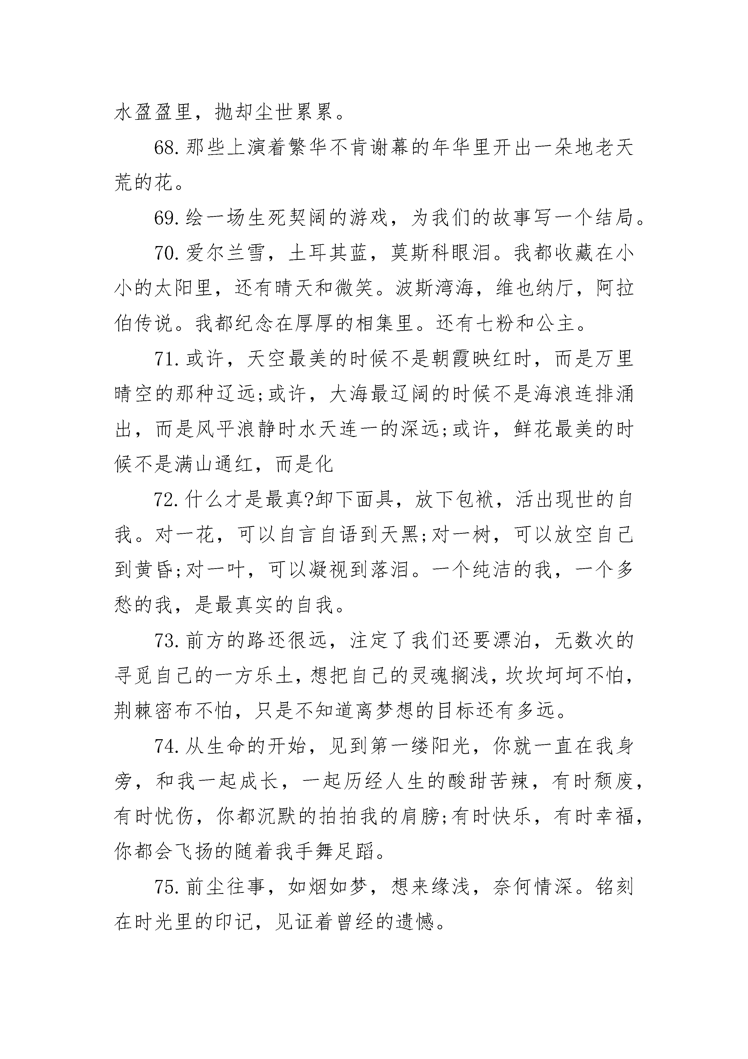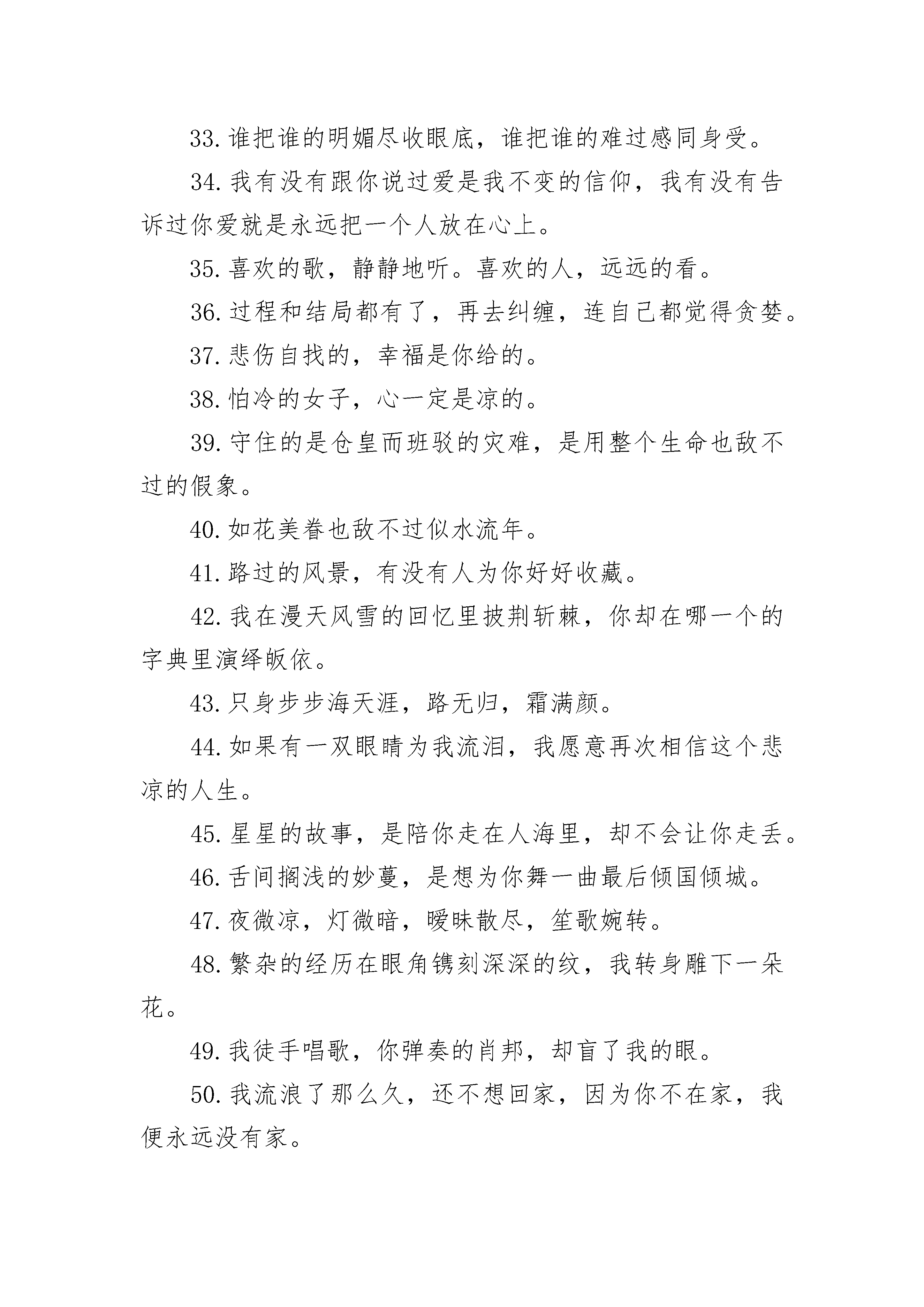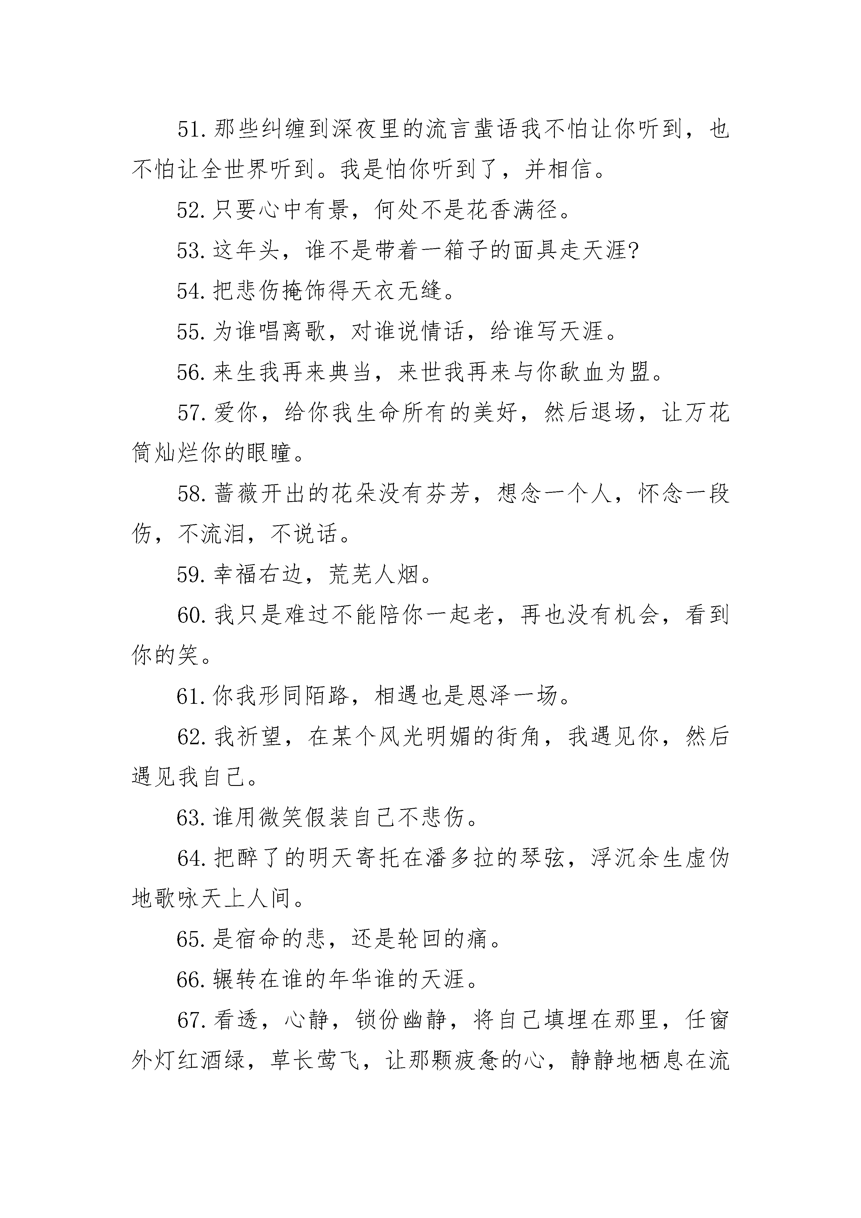 很文艺的爱情名言:最后还不是埋下一座城,关了所有灯2.你掌心华丽的情色线条,纠结进了谁的城池里欢声笑语。3.用一千年的时间去爱你,再用一万年的时间去忘记。4.当掉的浅色寂语,你开了一家收购店,等来了遗忘的海角天光。5.女巫亲吻过的咒语破天而来,浇湿的誓言漉漉退场,我坐在海上补一张网,你伏在海底披星戴月的歌唱。6.你是谁朝思暮想的笔尖少年,在绝城的荒途里辗转成歌。7.那首关于我们的歌,你把结局唱给了谁听。8.埋下一座城,关了所有灯。9.你的夕阳,我的容颜,谁的三分之一年。10.摇曳在笔尖的舞姿,是聚光灯下最浓烈的一抹艳红。11.我目送沿海的日落,紧抱一个醉生梦死的枕头,游不出回忆却学不会放手,怎么走。12.用一根火柴烧一座蜃楼,借这场大雨让自己逃走。13.躲在万劫不复的街头,微笑参透覆水难收。14.谁眼角朱红的泪痣成全了你的繁华一世,你金戈铁马的江山赠与谁一场石破惊天的空欢喜。15.下一世的情歌,把词交由你填,看看你仍旧是谁高高在上的王。16.等一个人,还是等一个故事。17.泅渡一个世界,共一场生死。18.把爱写成兵临城下的不朽传奇,那么,你会不会不辞冰雪披荆斩棘地奔赴而来。19.把我们的故事刻在被风化的山墙上,路人看到的时候哭了。20.橱窗里盛放的琳琅满目,是阜盛而过的年华栩栩生辉。21.那首情歌有关风月,却无关你我。22.戏子入画,一生天涯。23.寂寞这么多,在承受的有几个。24.始终在做着重复的两件事,爱他以及守护。25.嘘,我的伤才刚刚睡着。26.只为他放弃一座城池,在天光大亮的时候,奔赴一场或生或死的未知。27.我想看一场盛大的流行陨落的过程,我要一直不停许愿,许到沧海桑田瞬息万变直到靠近你微笑淡晴的脸。28.错过的年华在北漠开出斑斓的紫薇花,却荒芜了轮回的春夏。29.你走过多少条街,会想起多少次我呢。30.一再的隐忍,一再的退让,却换来了盛宴上的谎言。31.曾听人说,回忆是一座桥,却是通向寂寞的牢。32.我把所有的伤心走一遍,最伤心的是你不在终点。我把所有的绝望走一遍,最绝望的是你还在起点。33.谁把谁的明媚尽收眼底,谁把谁的难过感同身受。34.我有没有跟你说过爱是我不变的信仰,我有没有告诉过你爱就是永远把一个人放在心上。35.喜欢的歌,静静地听。喜欢的人,远远的看。36.过程和结局都有了,再去纠缠,连自己都觉得贪婪。37.悲伤自找的,幸福是你给的。38.怕冷的女子,心一定是凉的。39.守住的是仓皇而班驳的灾难,是用整个生命也敌不过的假象。40.如花美眷也敌不过似水流年。41.路过的风景,有没有人为你好好收藏。42.我在漫天风雪的回忆里披荆斩棘,你却在哪一个的字典里演绎皈依。43.只身步步海天涯,路无归,霜满颜。44.如果有一双眼睛为我流泪,我愿意再次相信这个悲凉的人生。45.星星的故事,是陪你走在人海里,却不会让你走丢。46.舌间搁浅的妙蔓,是想为你舞一曲最后倾国倾城。47.夜微凉,灯微暗,暧昧散尽,笙歌婉转。48.繁杂的经历在眼角镌刻深深的纹,我转身雕下一朵花。49.我徒手唱歌,你弹奏的肖邦,却盲了我的眼。50.我流浪了那么久,还不想回家,因为你不在家,我便永远没有家。51.那些纠缠到深夜里的流言蜚语我不怕让你听到,也不怕让全世界听到。我是怕你听到了,并相信。52.只要心中有景,何处不是花香满径。53.这年头,谁不是带着一箱子的面具走天涯?54.把悲伤掩饰得天衣无缝。55.为谁唱离歌,对谁说情话,给谁写天涯。56.来生我再来典当,来世我再来与你歃血为盟。57.爱你,给你我生命所有的美好,然后退场,让万花筒灿烂你的眼瞳。58.蔷薇开出的花朵没有芬芳,想念一个人,怀念一段伤,不流泪,不说话。59.幸福右边,荒芜人烟。60.我只是难过不能陪你一起老,再也没有机会,看到你的笑。61.你我形同陌路,相遇也是恩泽一场。62.我祈望,在某个风光明媚的街角,我遇见你,然后遇见我自己。63.谁用微笑假装自己不悲伤。64.把醉了的明天寄托在潘多拉的琴弦,浮沉余生虚伪地歌咏天上人间。65.是宿命的悲,还是轮回的痛。66.辗转在谁的年华谁的天涯。67.看透,心静,锁份幽静,将自己填埋在那里,任窗外灯红酒绿,草长莺飞,让那颗疲惫的心,静静地栖息在流水盈盈里,抛却尘世累累。68.那些上演着繁华不肯谢幕的年华里开出一朵地老天荒的花。69.绘一场生死契阔的游戏,为我们的故事写一个结局。70.爱尔兰雪,土耳其蓝,莫斯科眼泪。我都收藏在小小的太阳里,还有晴天和微笑。波斯湾海,维也纳厅,阿拉伯传说。我都纪念在厚厚的相集里。还有七粉和公主。71.或许,天空最美的时候不是朝霞映红时,而是万里晴空的那种辽远;或许,大海最辽阔的时候不是海浪连排涌出,而是风平浪静时水天连一的深远;或许,鲜花最美的时候不是满山通红,而是化72.什么才是最真?卸下面具,放下包