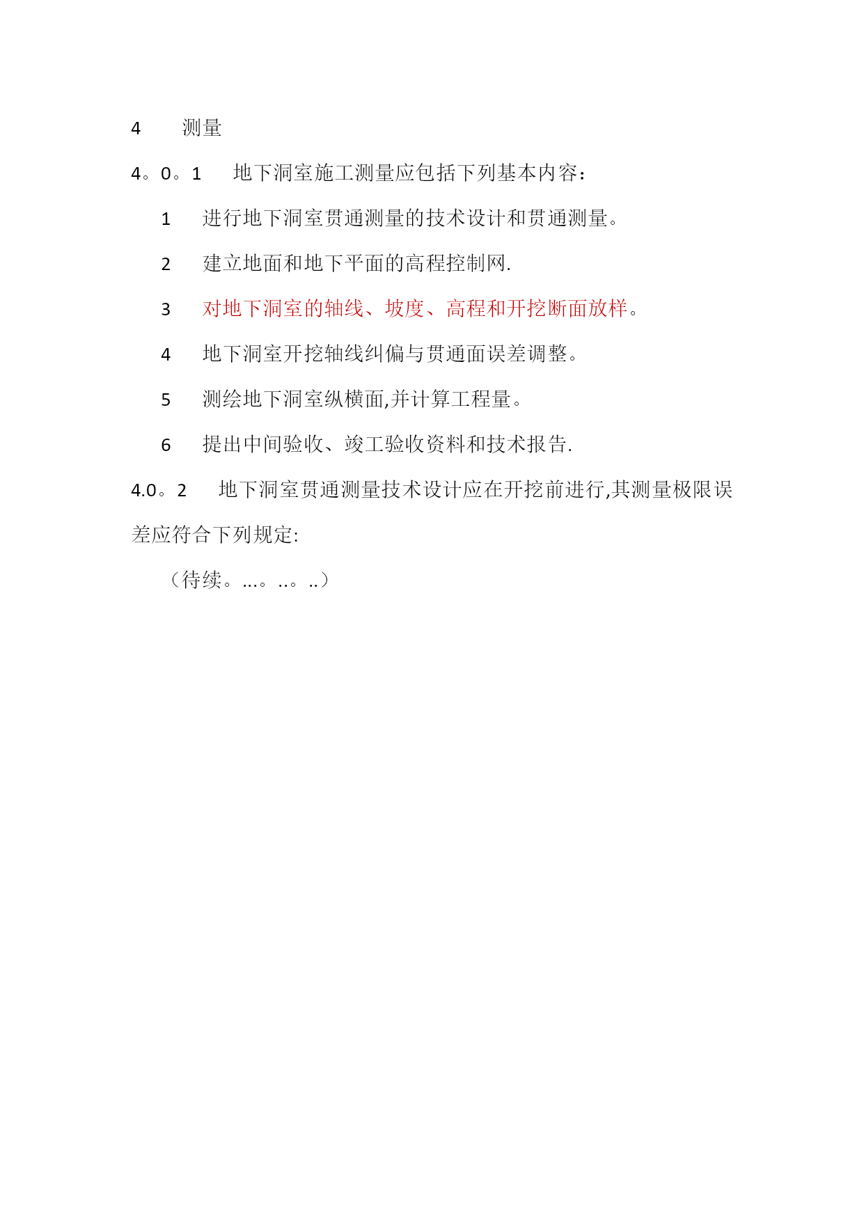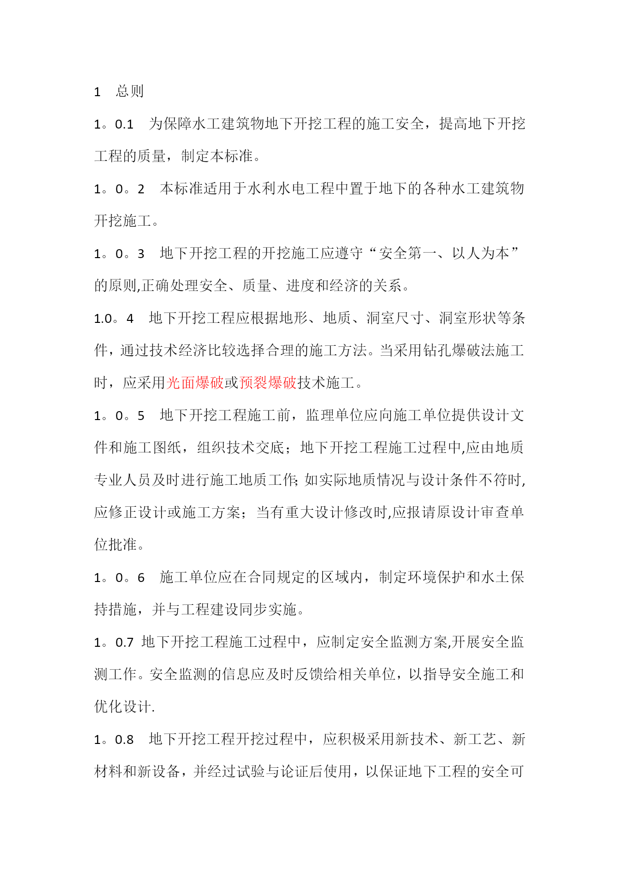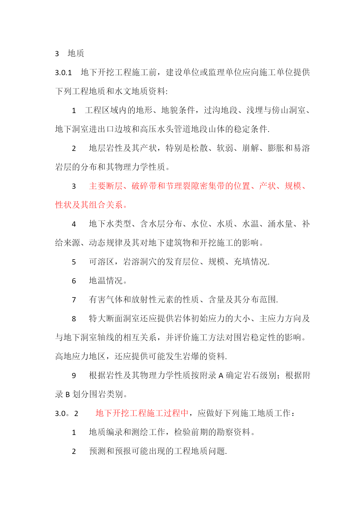 1总则 1。0.1为保障水工建筑物地下开挖工程的施工安全,提高地下开挖工程的质量,制定本标准。 1。0。2本标准适用于水利水电工程中置于地下的各种水工建筑物开挖施工。 1。0。3地下开挖工程的开挖施工应遵守“安全第一、以人为本”的原则,正确处理安全、质量、进度和经济的关系。 1.0。4地下开挖工程应根据地形、地质、洞室尺寸、洞室形状等条件,通过技术经济比较选择合理的施工方法。当采用钻孔爆破法施工时,应采用光面爆破或预裂爆破技术施工。 1。0。5地下开挖工程施工前,监理单位应向施工单位提供设计文件和施工图纸,组织技术交底;地下开挖工程施工过程中,应由地质专业人员及时进行施工地质工作;如实际地质情况与设计条件不符时,应修正设计或施工方案;当有重大设计修改时,应报请原设计审查单位批准。 1。0。6施工单位应在合同规定的区域内,制定环境保护和水土保持措施,并与工程建设同步实施。 1。0.7地下开挖工程施工过程中,应制定安全监测方案,开展安全监测工作。安全监测的信息应及时反馈给相关单位,以指导安全施工和优化设计. 1。0.8地下开挖工程开挖过程中,应积极采用新技术、新工艺、新材料和新设备,并经过试验与论证后使用,以保证地下工程的安全可靠、技术先进、经济合理。 1。0。9地下开挖工程施工,除应遵守本标准规定外,尚应遵守国家和水利行业现行有关标准的规定。3地质 3.0.1地下开挖工程施工前,建设单位或监理单位应向施工单位提供下列工程地质和水文地质资料: 1工程区域内的地形、地貌条件,过沟地段、浅埋与傍山洞室、地下洞室进出口边坡和高压水头管道地段山体的稳定条件. 2地层岩性及其产状,特别是松散、软弱、崩解、膨胀和易溶岩层的分布和其物理力学性质。 3主要断层、破碎带和节理裂隙密集带的位置、产状、规模、性状及其组合关系。 4地下水类型、含水层分布、水位、水质、水温、涌水量、补给来源、动态规律及其对地下建筑物和开挖施工的影响。 5可溶区,岩溶洞穴的发育层位、规模、充填情况. 6地温情况。 7有害气体和放射性元素的性质、含量及其分布范围. 8特大断面洞室还应提供岩体初始应力的大小、主应力方向及与地下洞室轴线的相互关系,并评价施工方法对围岩稳定性的影响。高地应力地区,还应提供可能发生岩爆的资料. 9根据岩性及其物理力学性质按附录A确定岩石级别;根据附录B划分围岩类别。 3.0。2地下开挖工程施工过程中,应做好下列施工地质工作: 1地质编录和测绘工作,检验前期的勘察资料。 2预测和预报可能出现的工程地质问题. 3对不良工程地质问题开展专项研究,并提出处理措施。 4开展安全监测工作,及时分析监测资料,进行围岩稳定性预报。 3。0。3施工单位应根据地质条件和设计要求制定开挖和支护方案,经监理单位审批后实施. 3.0。4地下开挖工程施工期间,若围岩条件和原勘察结果有较大变化,建设单位应委托勘察单位进行补充勘察,必要时还应进行专门的试验研究工作,复核原定的地质参数。施工单位应根据新的复核结果,调整施工方案,并报监理单位核准。 3。0。5施工单位应根据实际施工情况,进行地质预报,并根据预报制定安全施工预案。必要时,监理单位可组织相关单位对安全施工预案进行审查。 3.0。6当地下开挖工程施工过程中,出现异常地质变化是,施工单位应做好记录,施工地质人员应进行详尽的地质测绘与编录,监理单位应及时组织设计、施工等单位共同商定处理措施。4测量 4。0。1地下洞室施工测量应包括下列基本内容: 1进行地下洞室贯通测量的技术设计和贯通测量。 2建立地面和地下平面的高程控制网. 3对地下洞室的轴线、坡度、高程和开挖断面放样。 4地下洞室开挖轴线纠偏与贯通面误差调整。 5测绘地下洞室纵横面,并计算工程量。 6提出中间验收、竣工验收资料和技术报告. 4.0。2地下洞室贯通测量技术设计应在开挖前进行,其测量极限误差应符合下列规定: (待续。...。..。..)5开挖 5.1一般规定 5。1.1地下开挖工程开工前,施工单位应编制地下开挖工程施工组织设计,报监理单位审查批准,监理单位发布开工令后方可开始开挖施工。 5。1.2地下开挖工程施工组织设计应包括下列内容: 1工程概况 2施工总布置 3施工方法 4施工进度计划 5施工资源配置 6安全和质量保证措施 7施工期安全监测方案及其布置 8环境保护和水土保持 5.1.3地下洞室规模可根据地下洞室开挖尺寸和断面大小,划分为: 1特小断面:面积(指设计开挖面积,下同)小于10㎡或跨度小于3。0m。 2小断面:面积为10~30㎡或跨度为3。0~5.5m。 3中断面:面积为30~60㎡或跨度为5.5~7。5m。 4大断面:面积为60~120㎡或跨度为7。5~12。0m。 5特大断面:面积大于120㎡或跨度大于12.0m. 5.1。4地下洞室按照倾角(洞